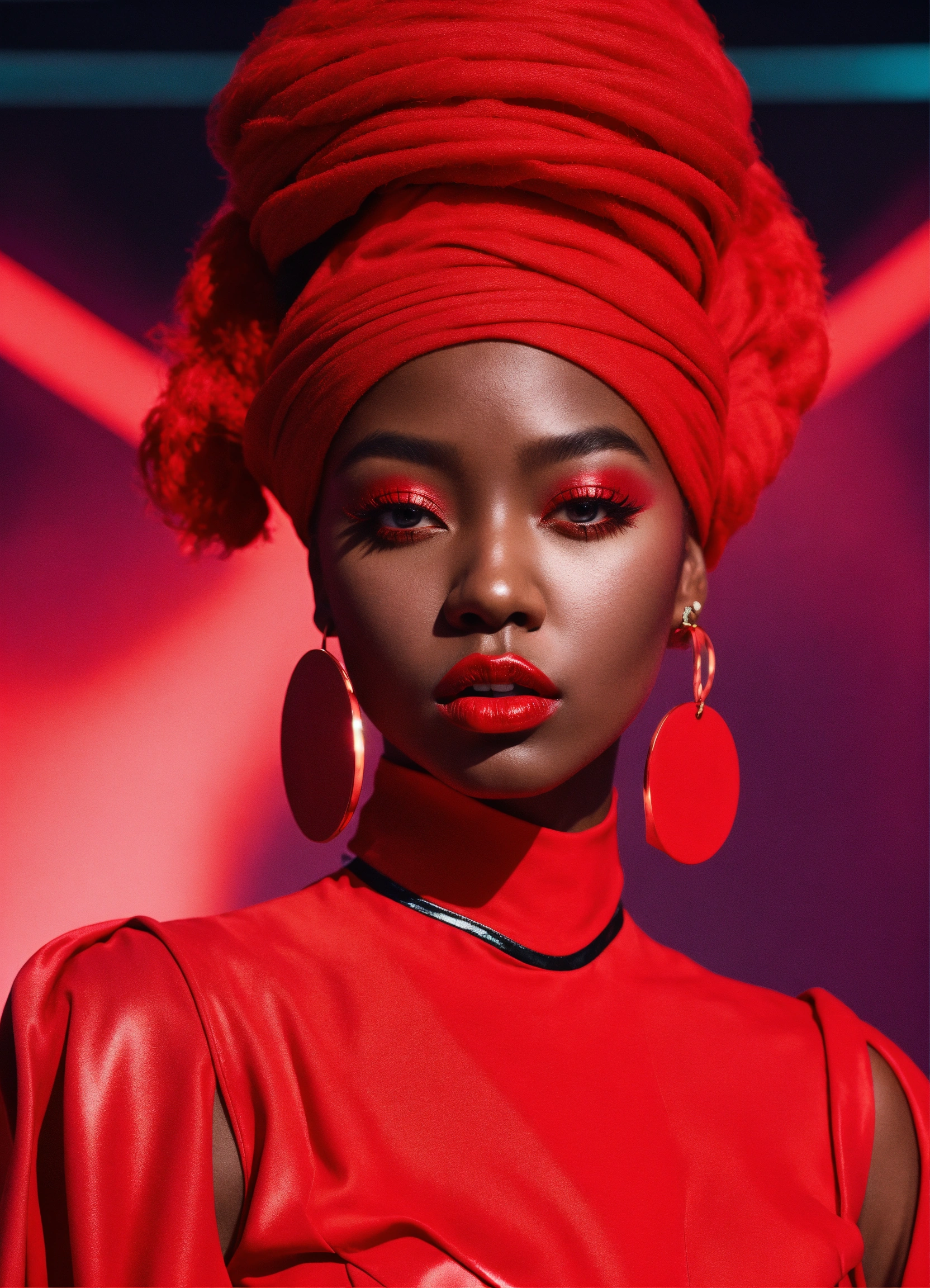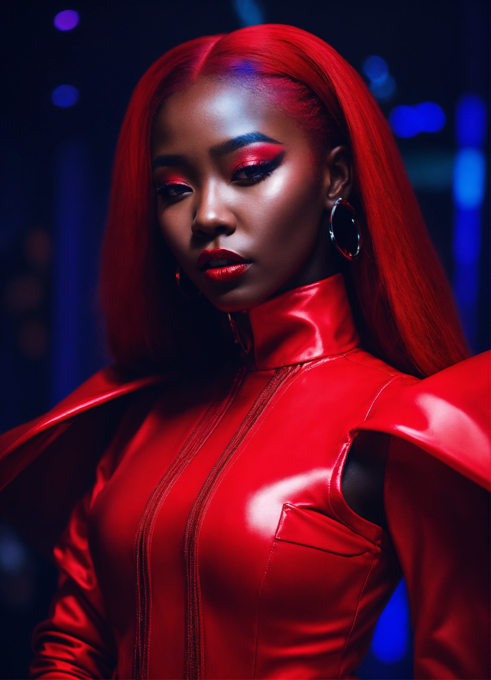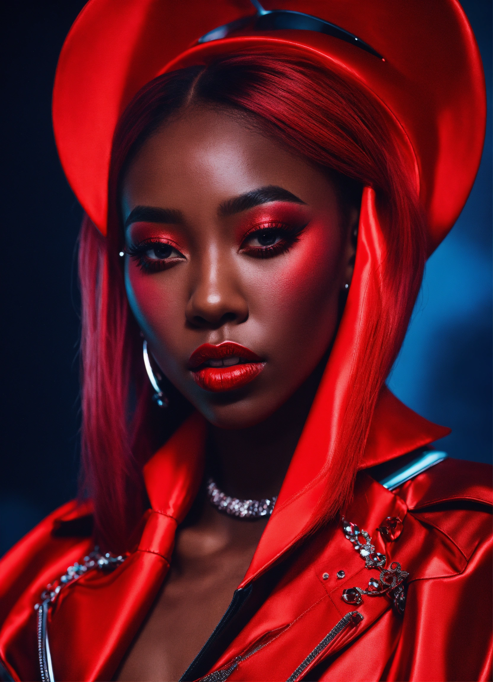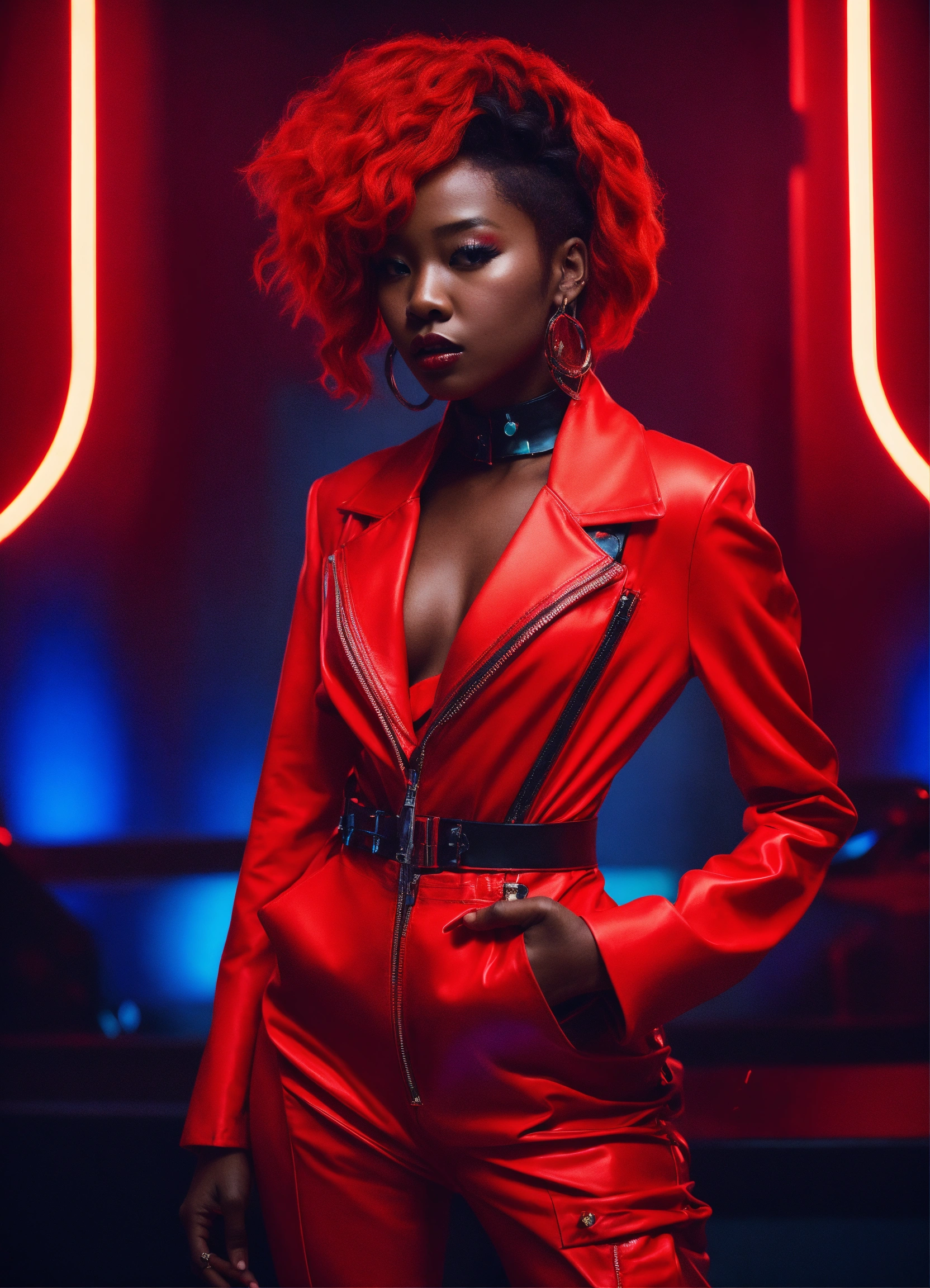 A dark skin black female kpop idol in a all red sleek futuristic outfit, clean makeup with oversized red hair, with depth of field, fantastical edgy and regal themed outfit, captured in vivid colors, embodying the essence of fantasy, minimalist