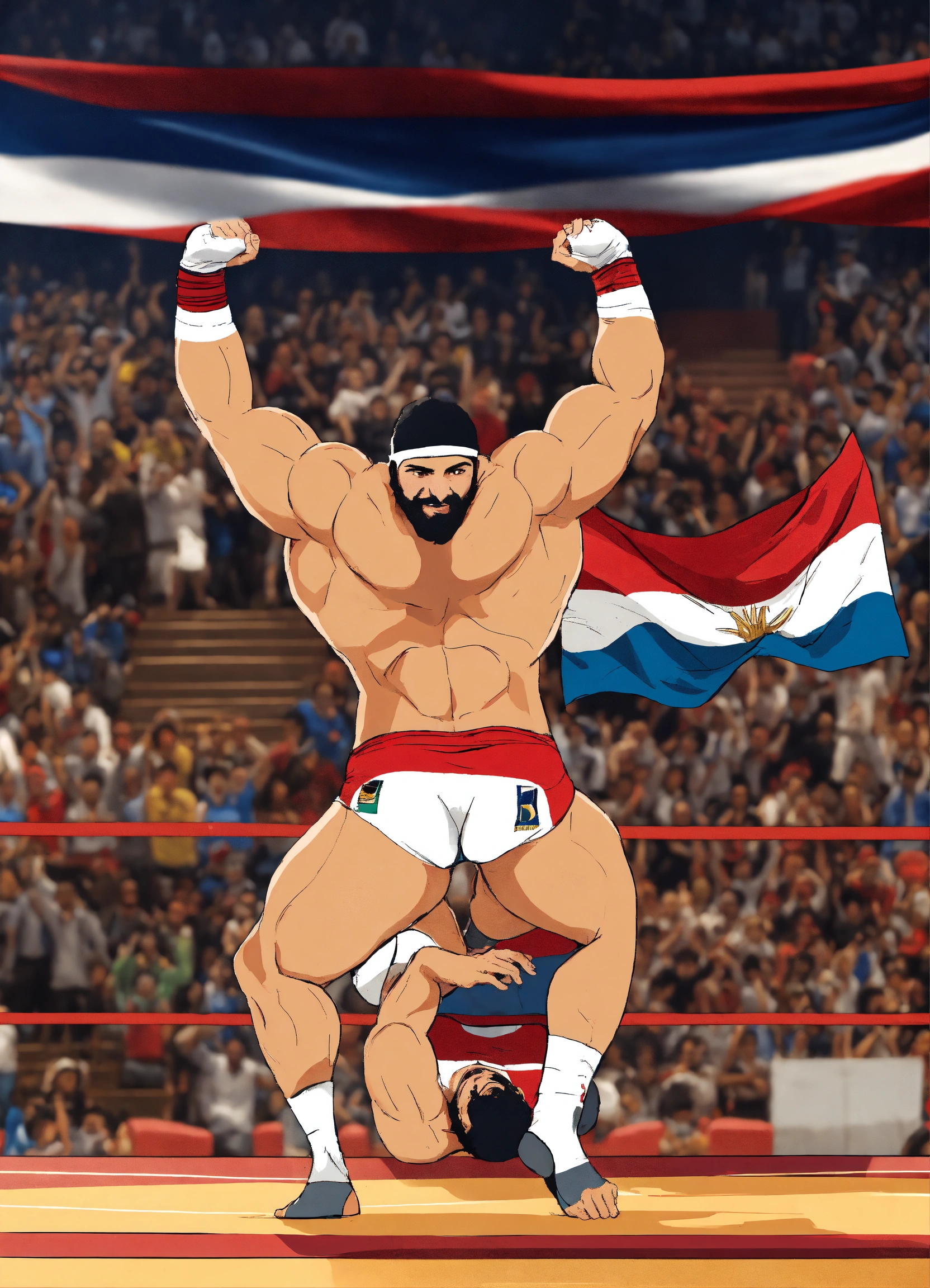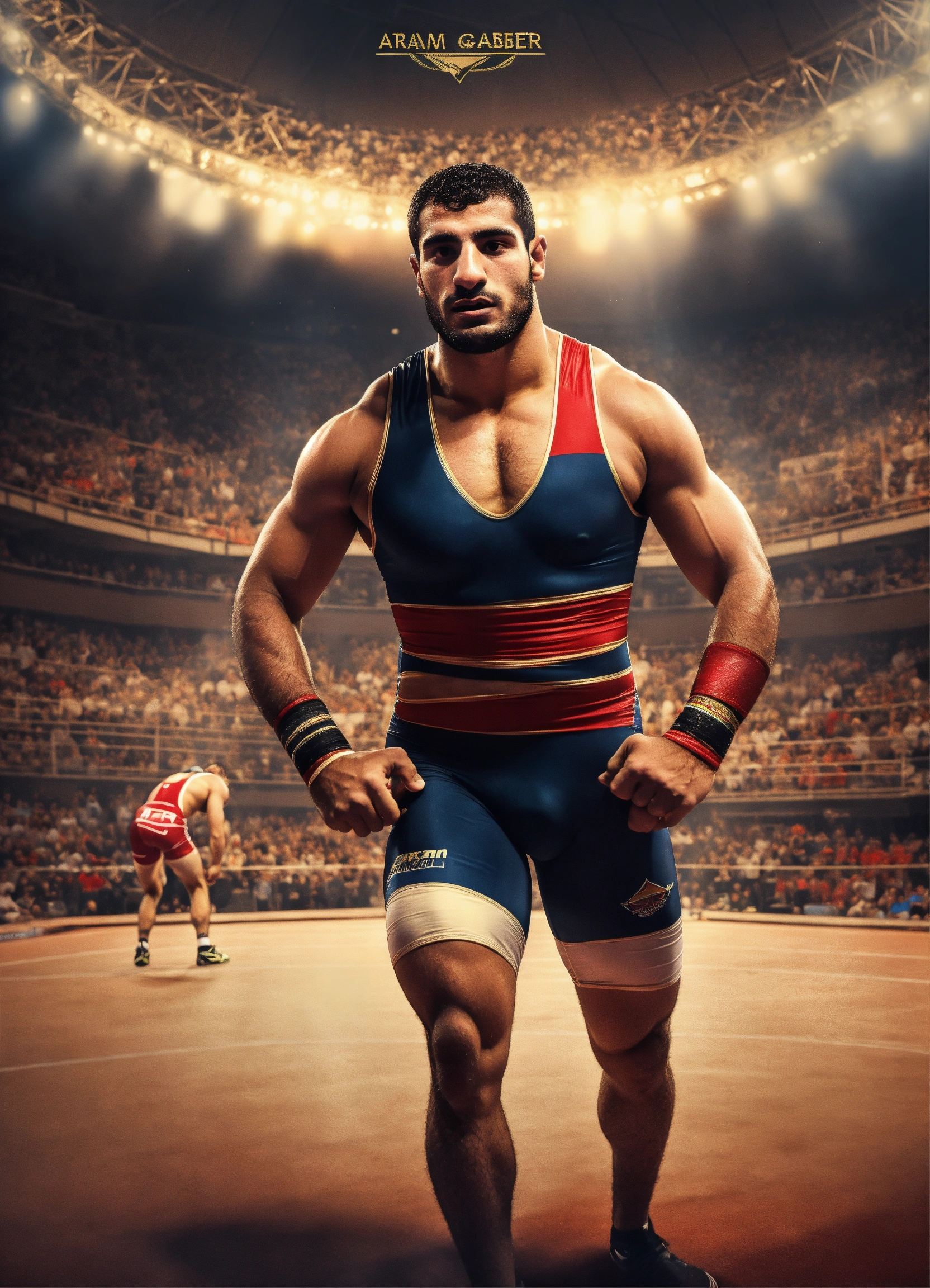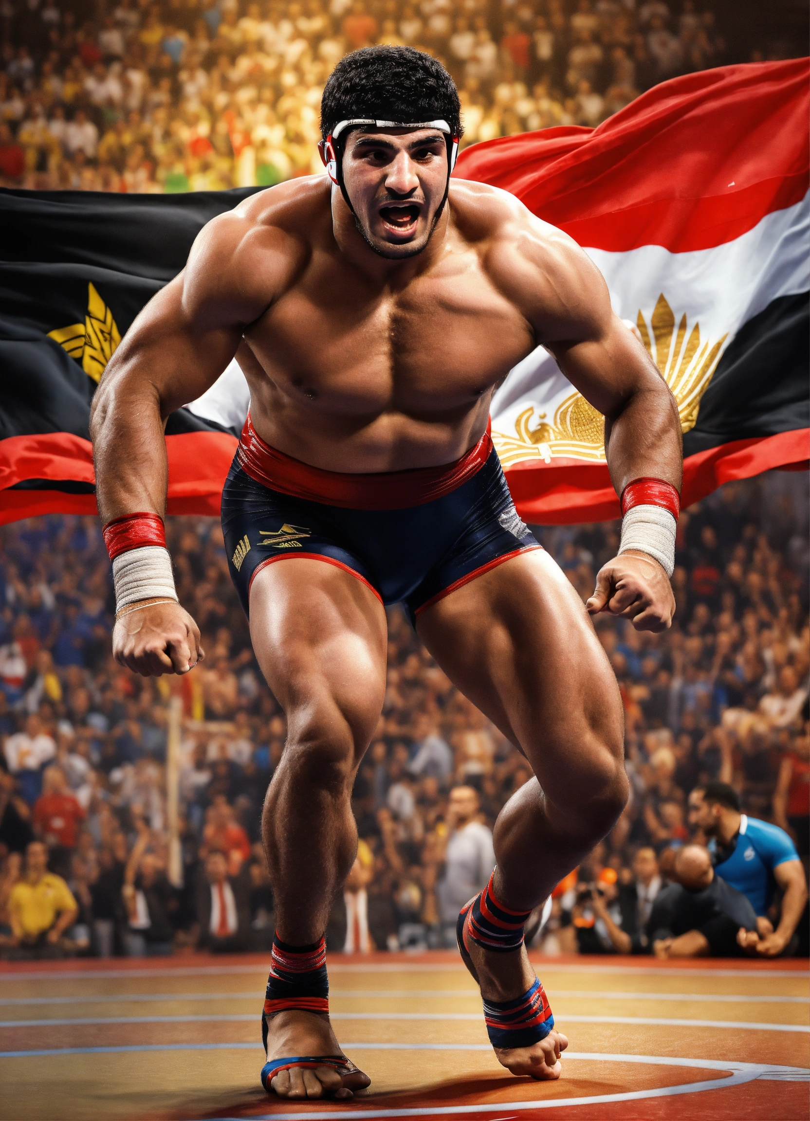 A visual that represents the renowned egyptian athlete karam gaber winning the world championship in greco-roman wrestling