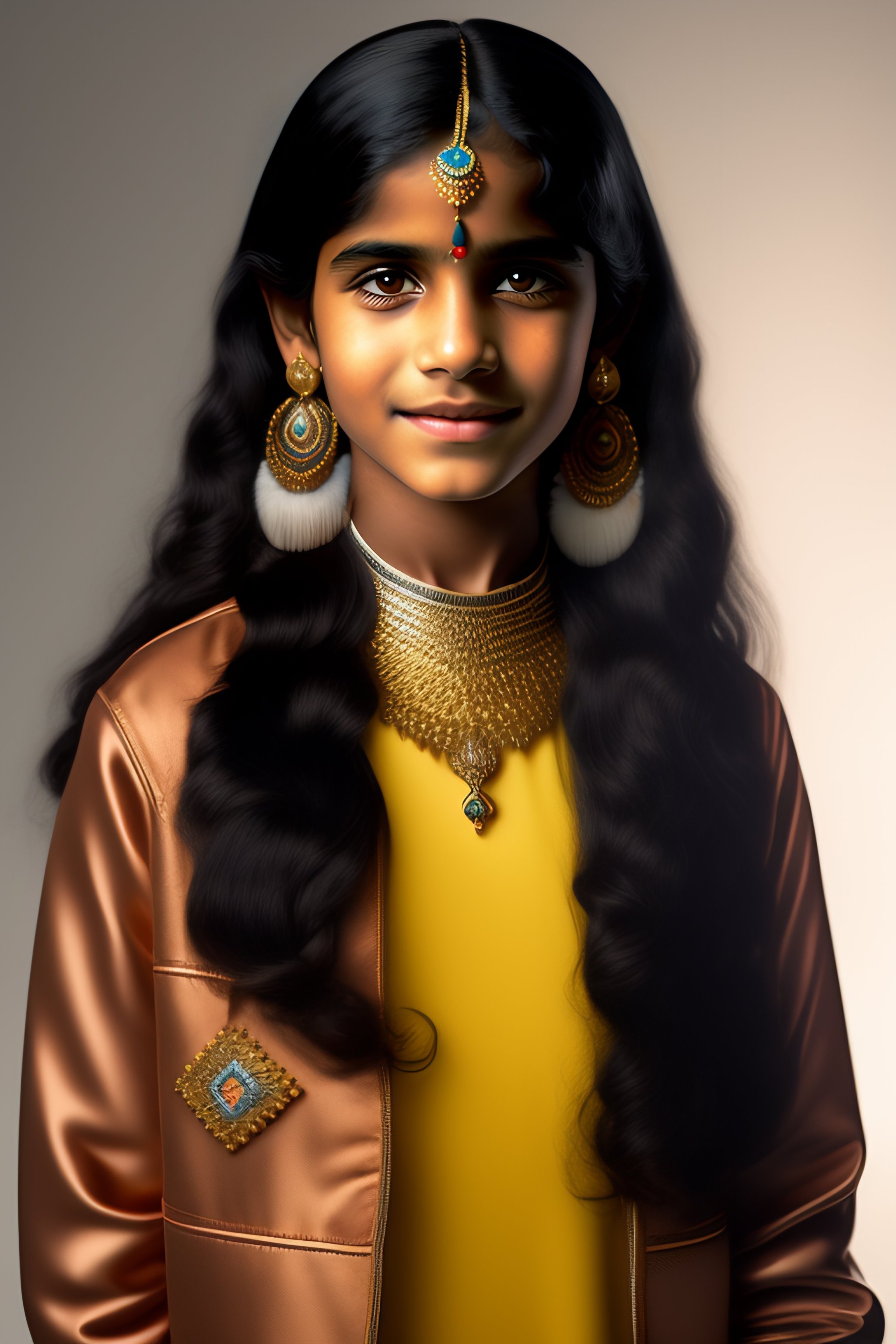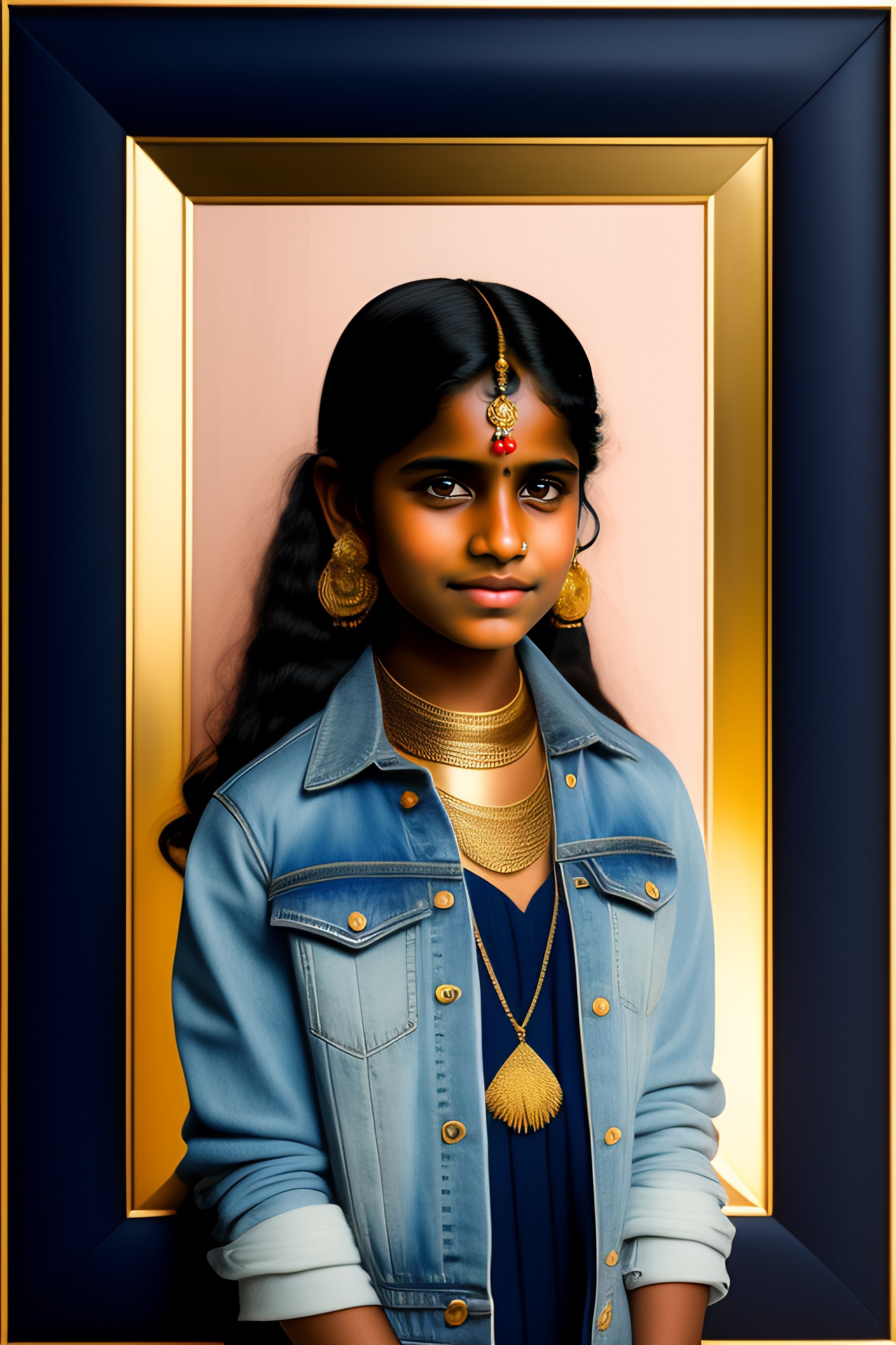 Portrait of a 12 year old indian girl with black flowing hair, brown eyes, a denim jacket, gold choker, silver hoops