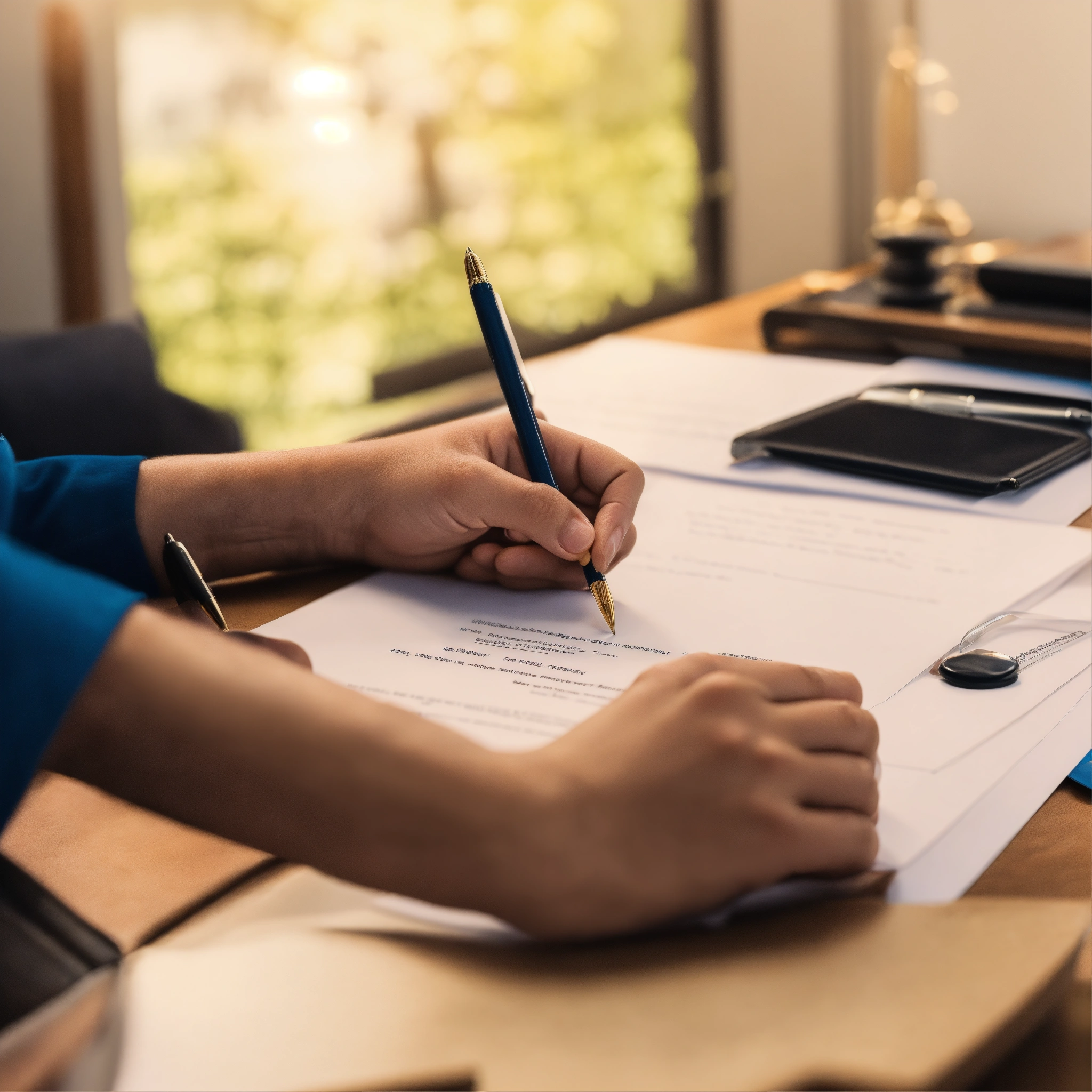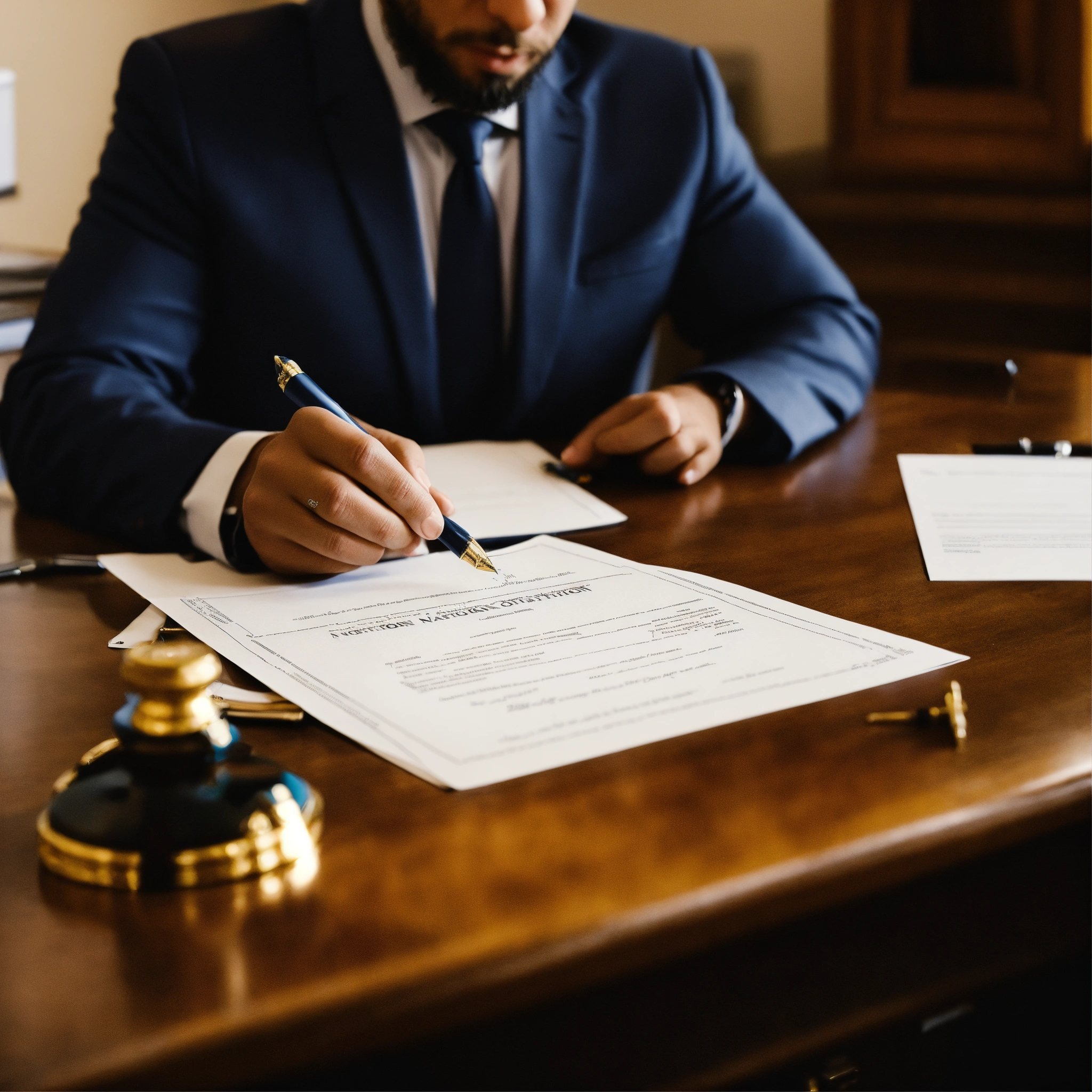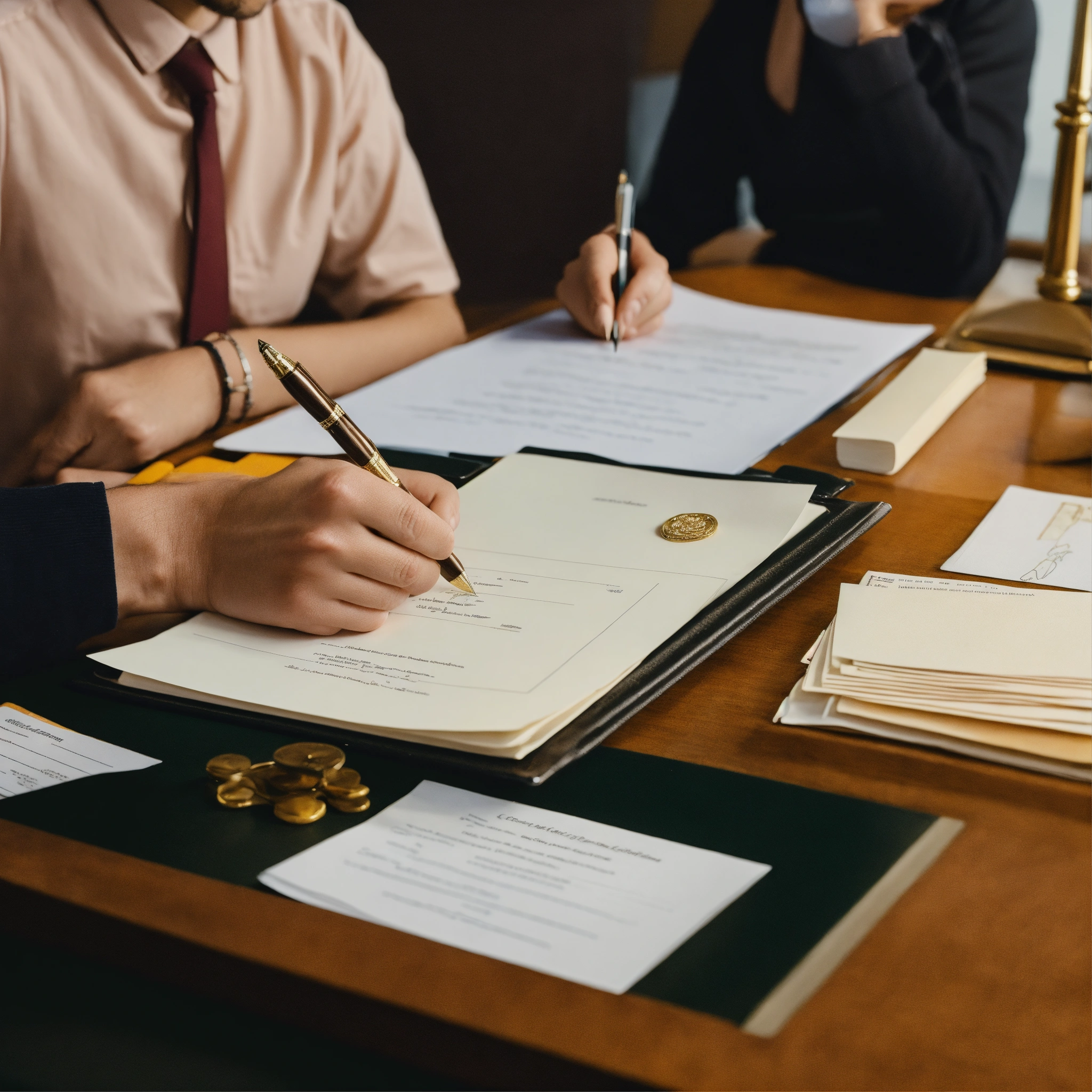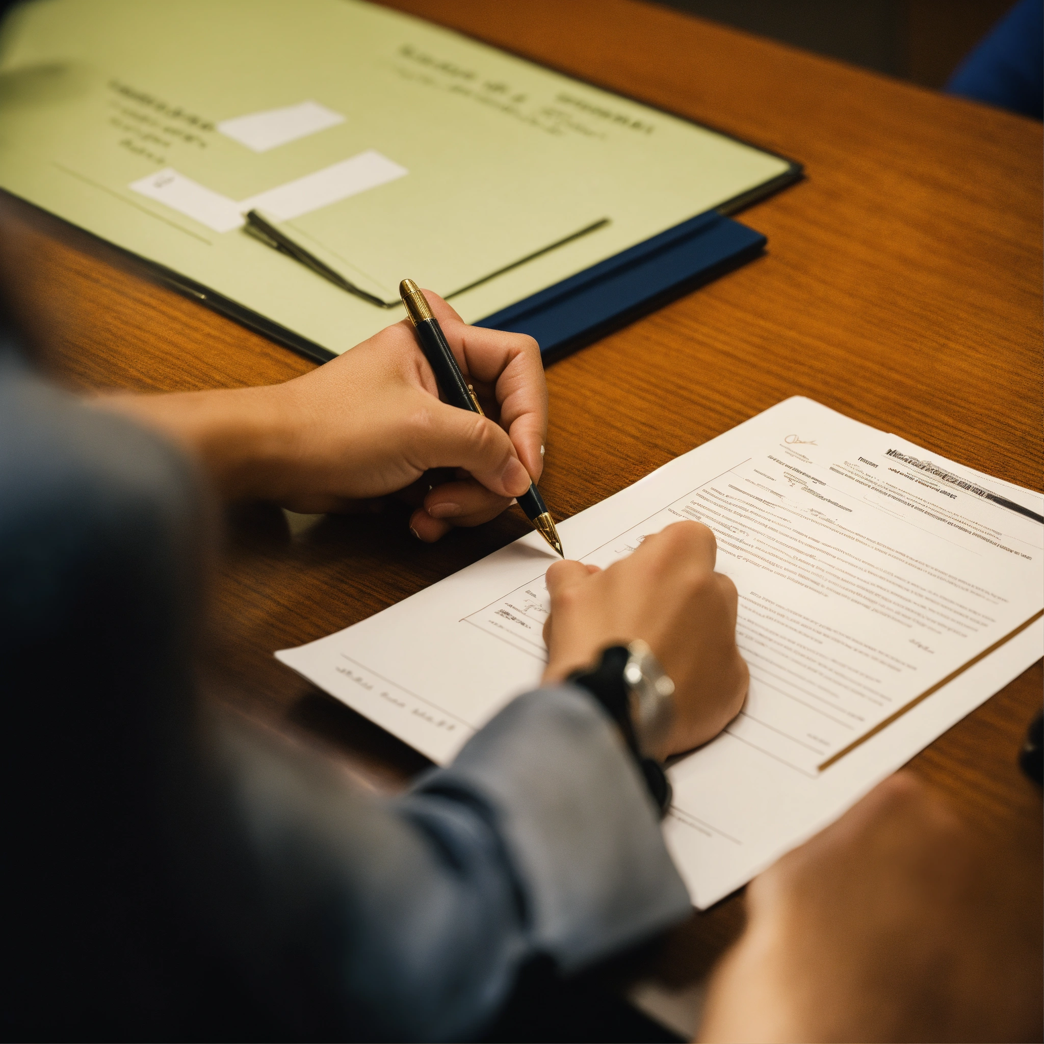 A photo of a person getting a notarization, the person is sitting at a desk with a notary public, the notary public is signing a document