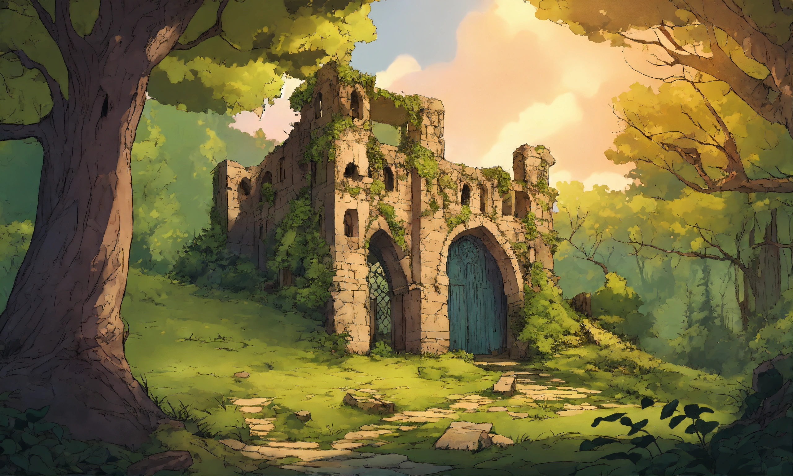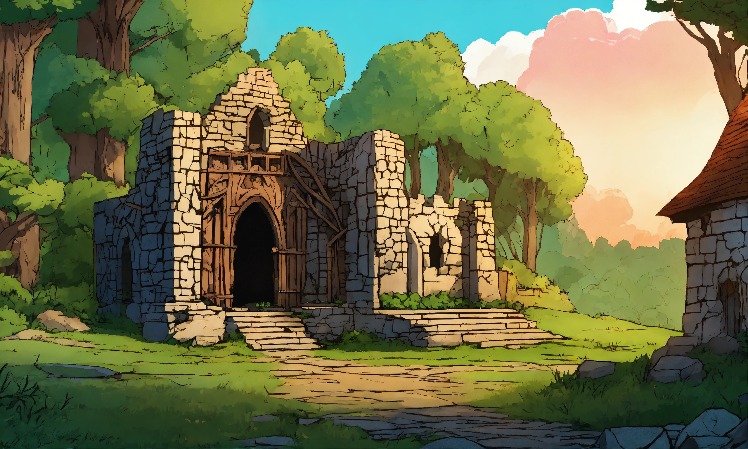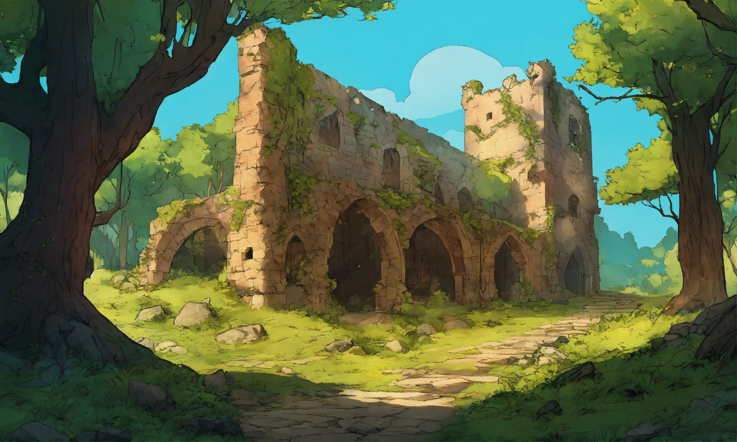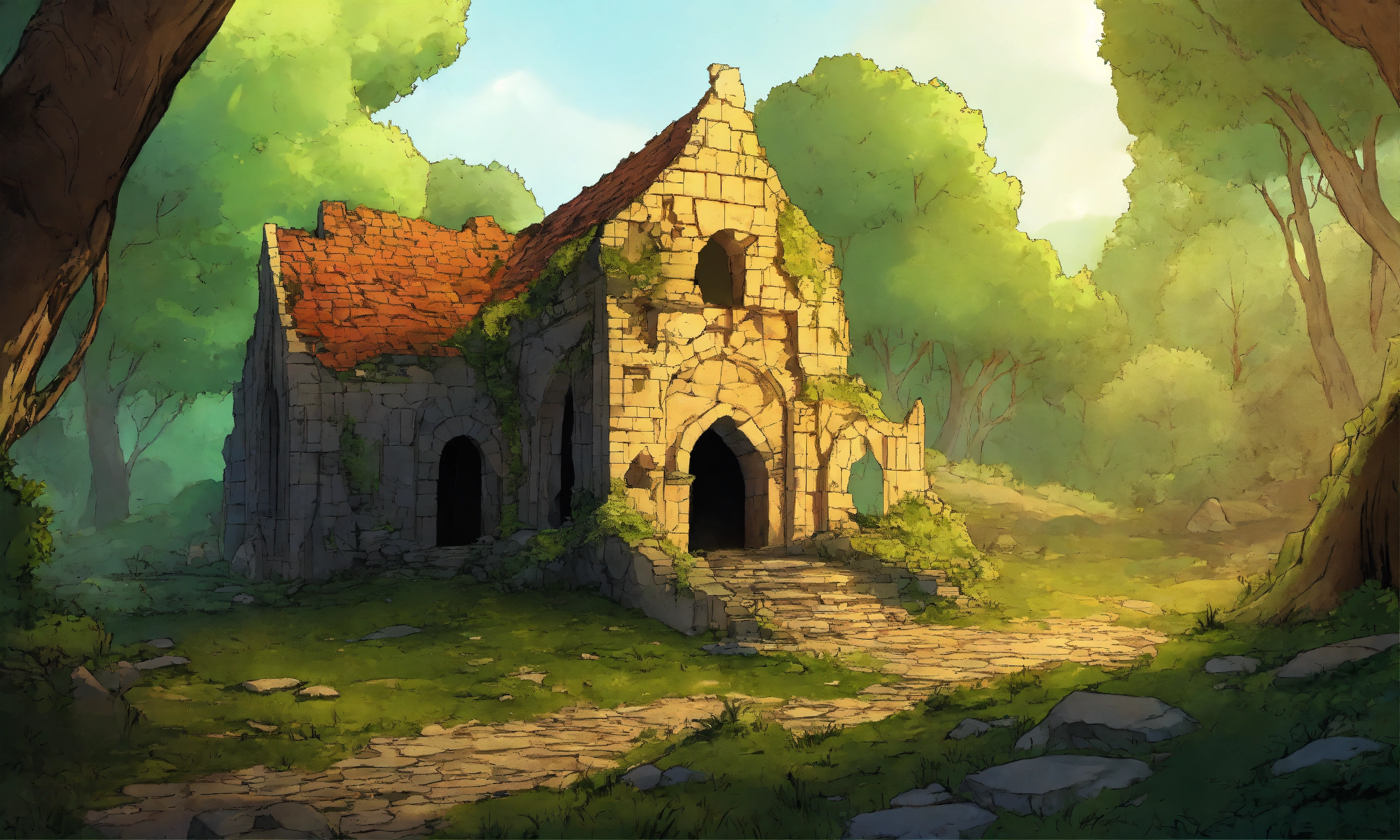 A ruin in an enchanted forest in a medieval setting in a comic style