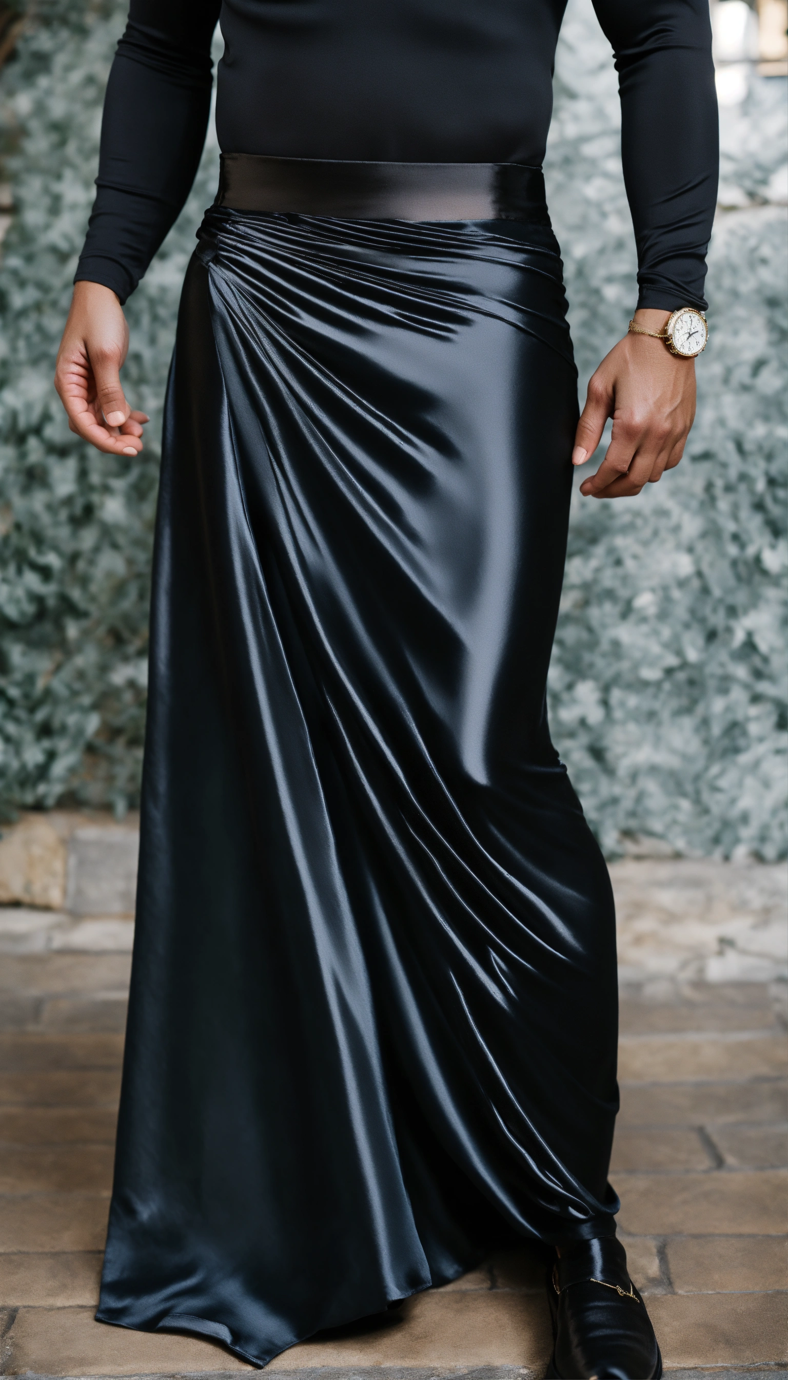 Close up of long black shiny satin pencil maxi skirt worn by olive-skinned muscular man with godlike body. clingy, figure-hugging, pulled tight skirt. view from waist down. close up.