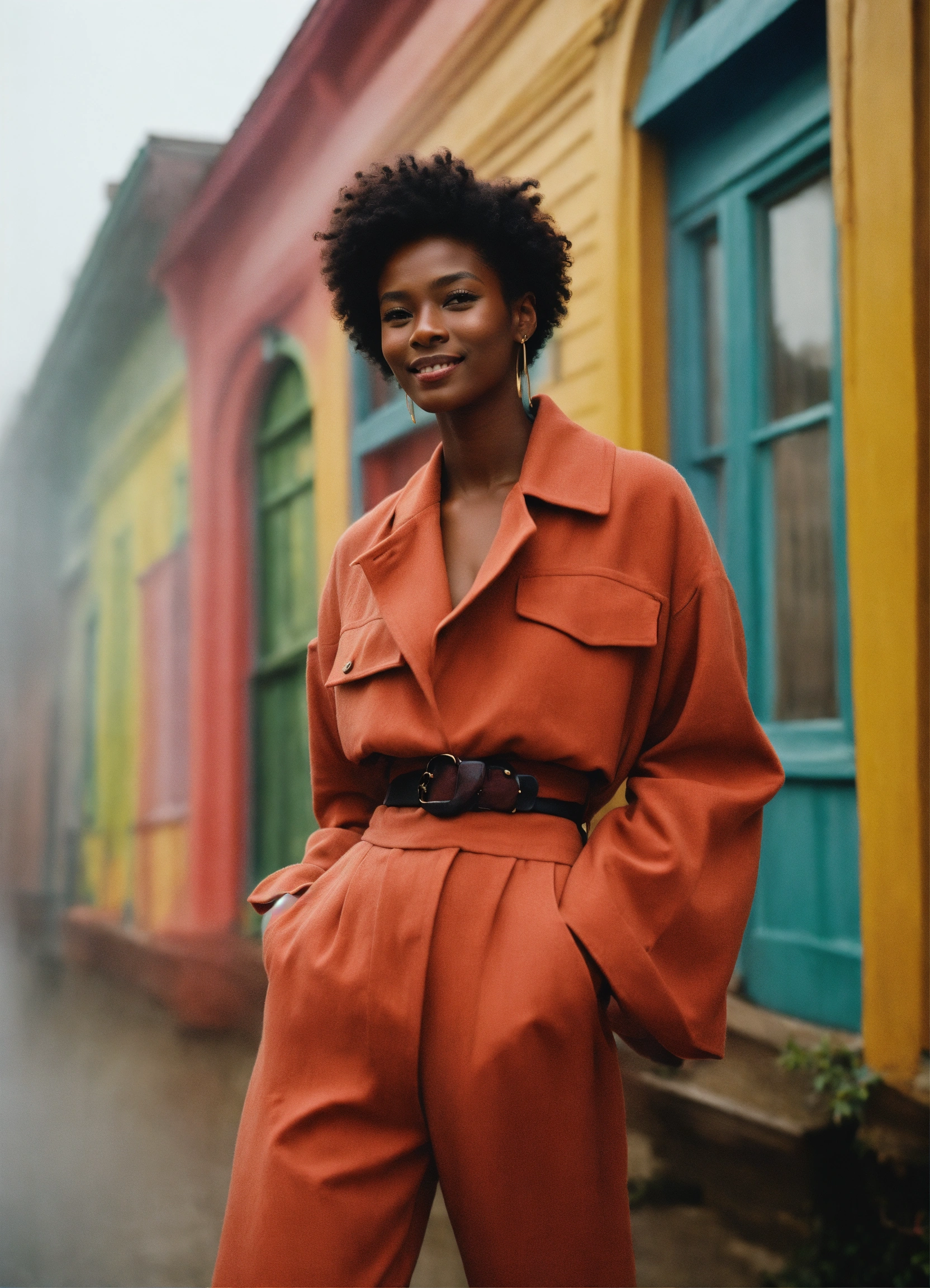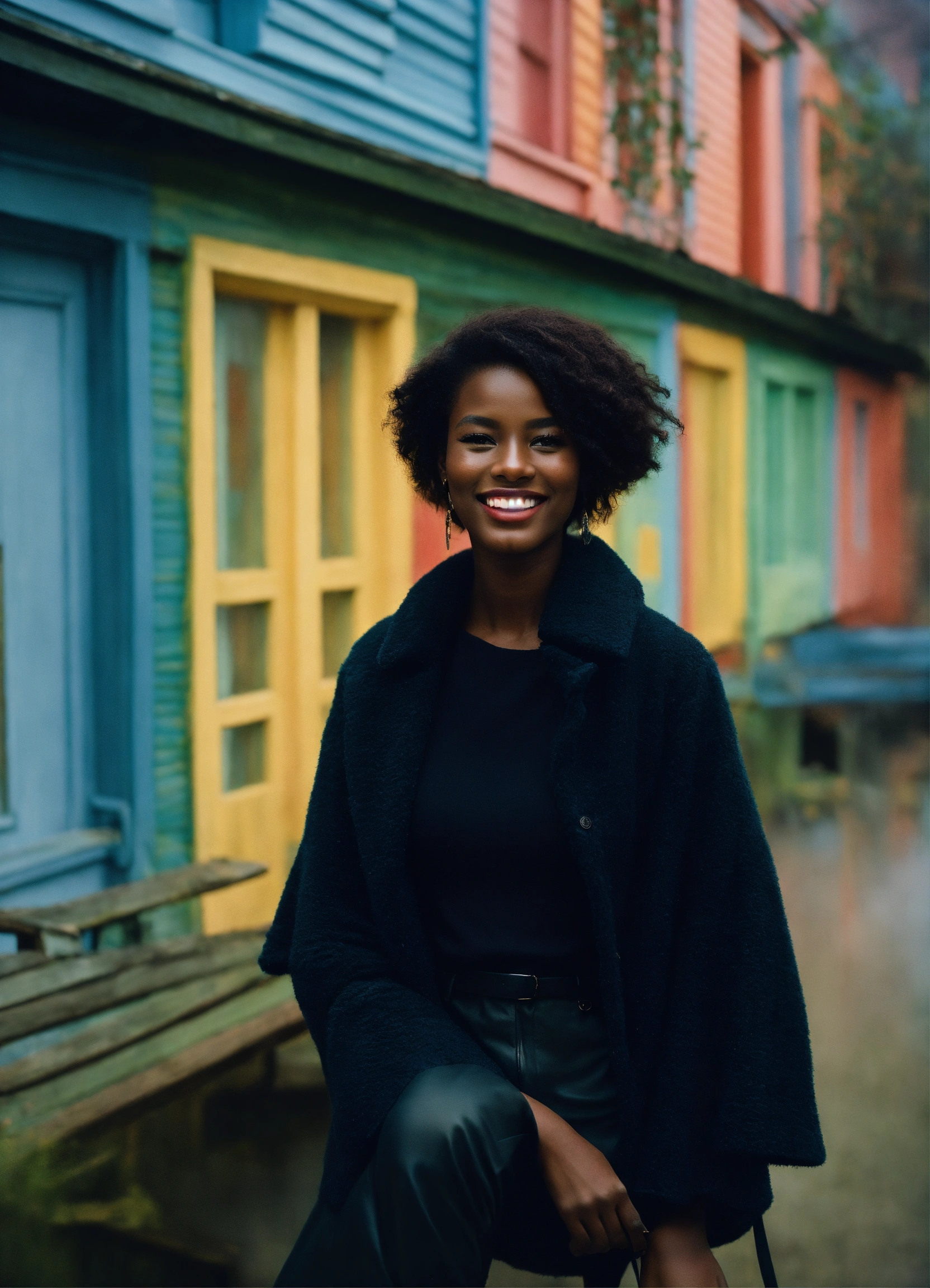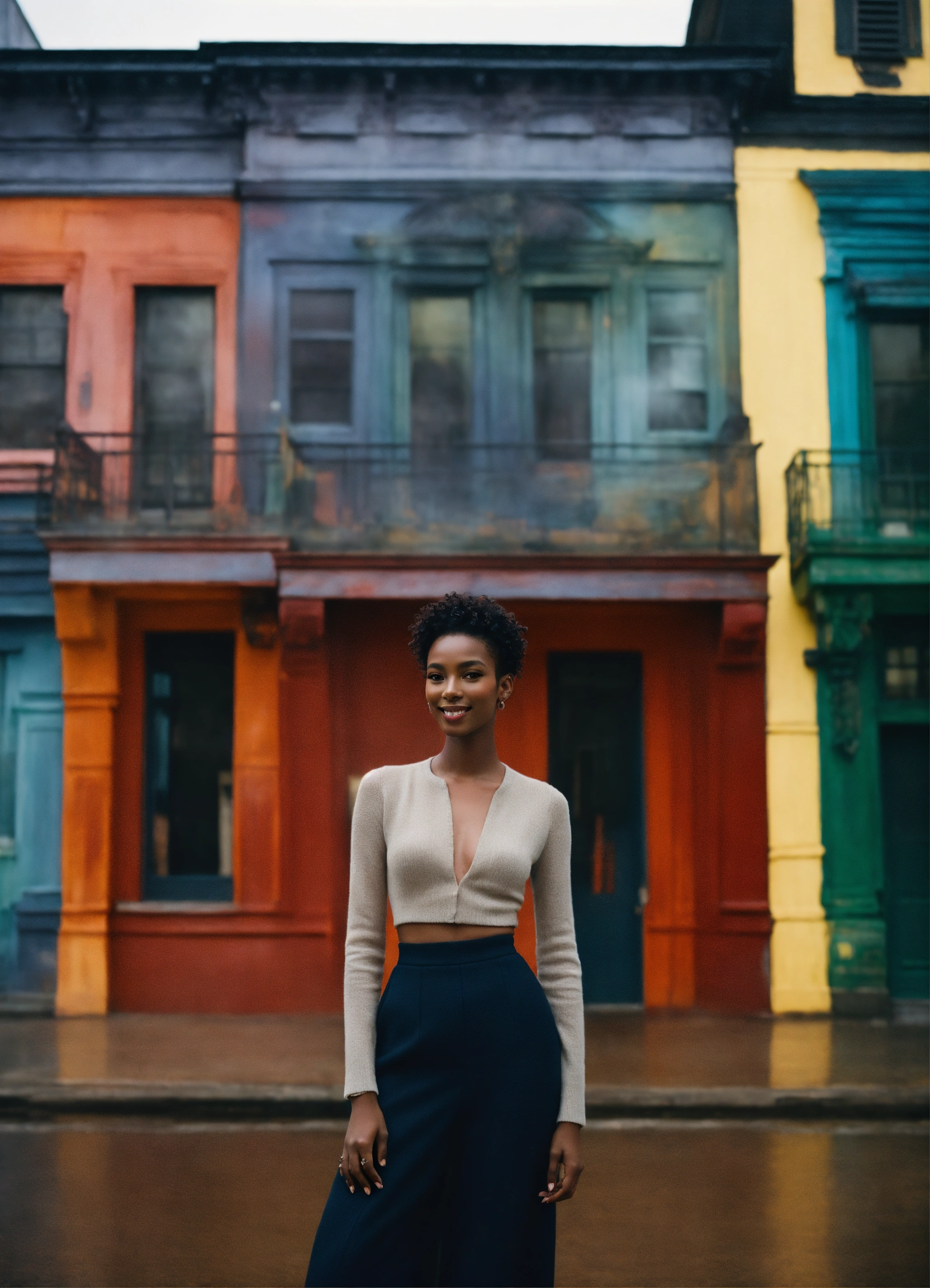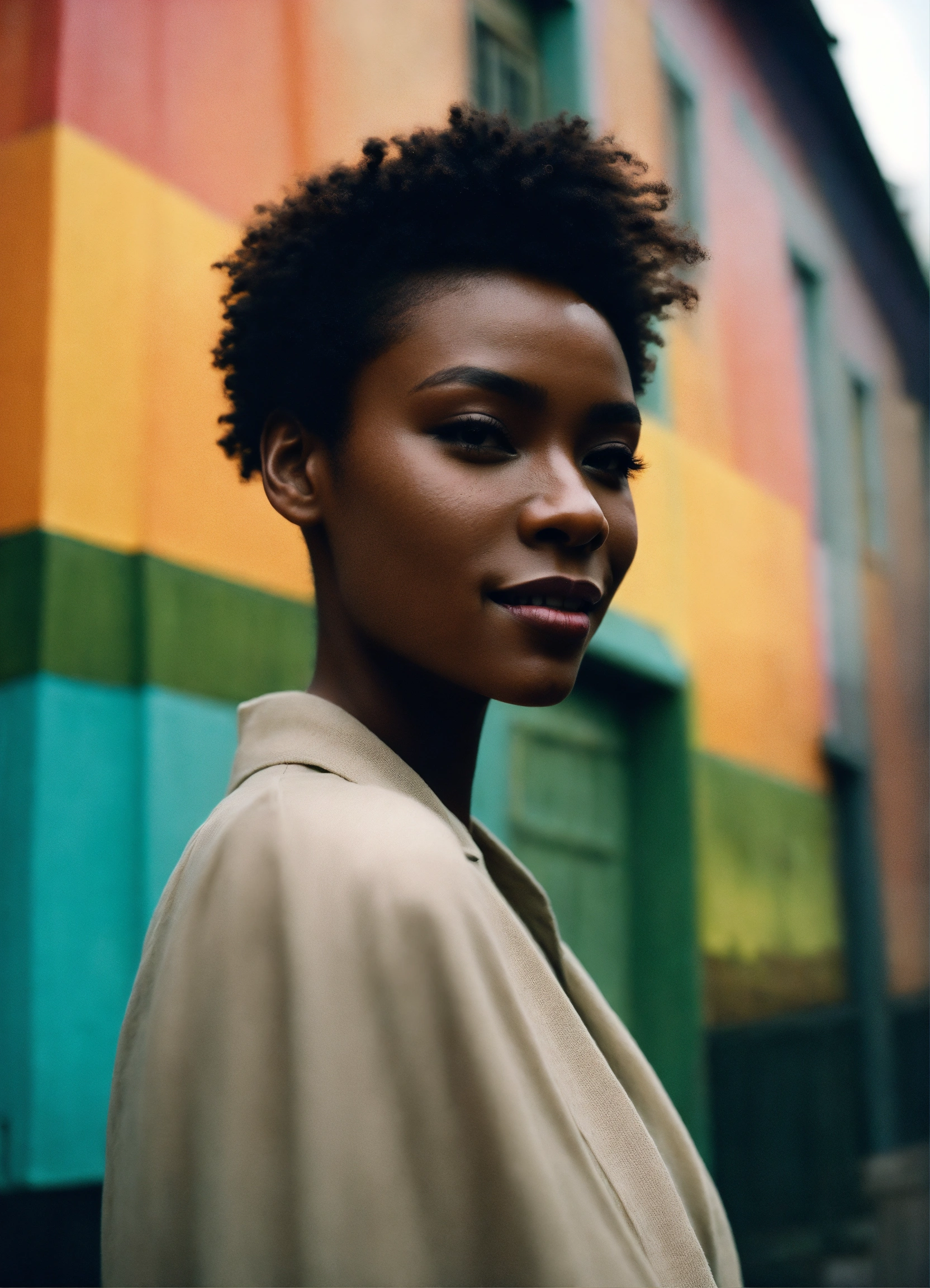 Portrait of beautiful fashion black model with short hair, ethereal dreamy foggy, photoshoot by annie leibovitz, editorial fashion magazine photoshoot, fashion poses, in front of colorful building architecture. kinfolk magazine. film grain. a big smile