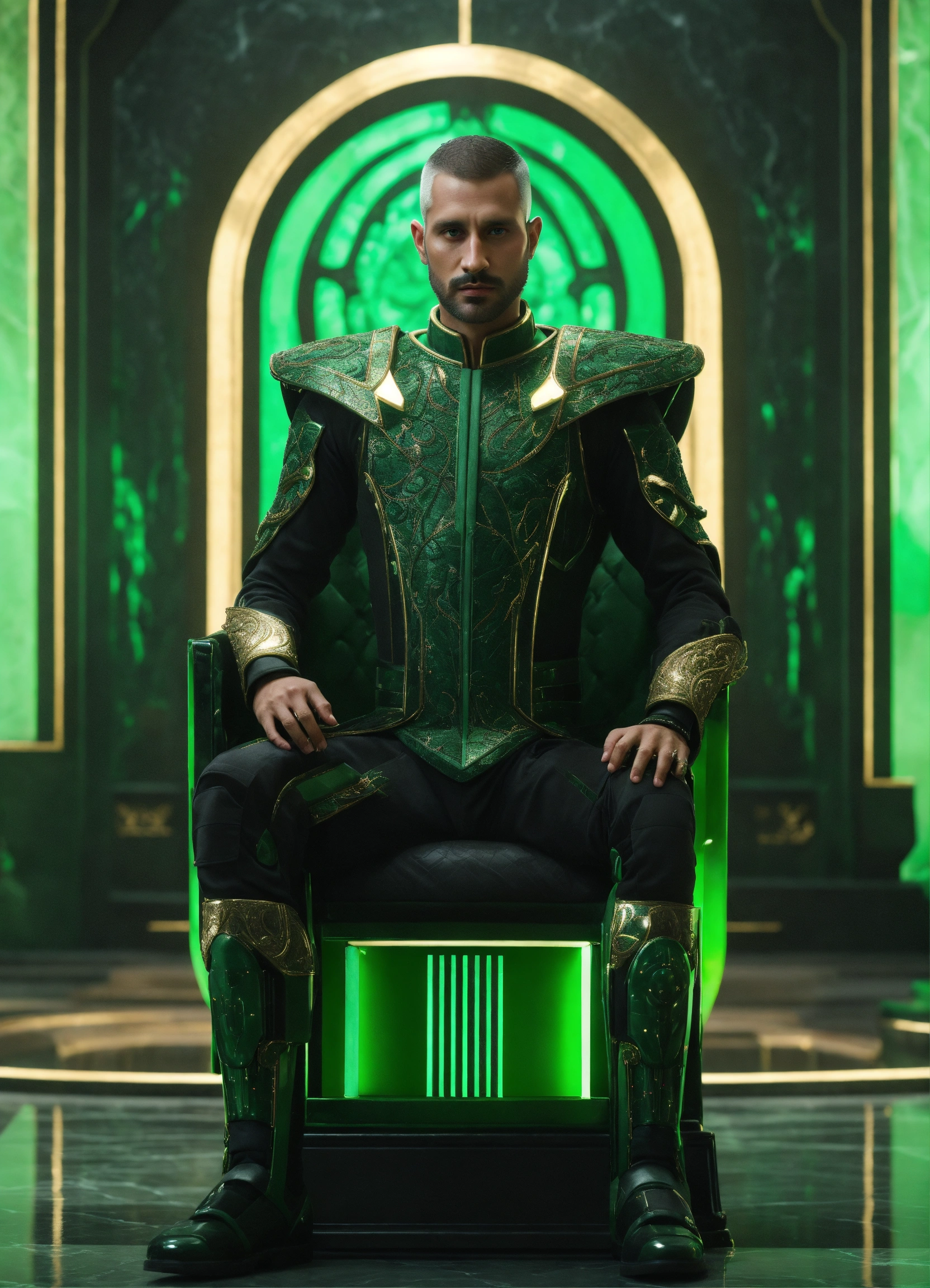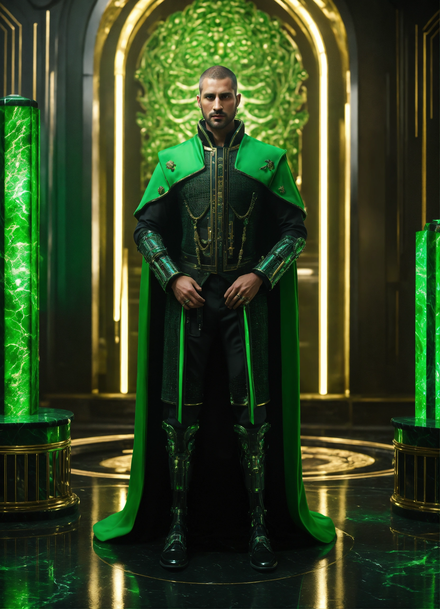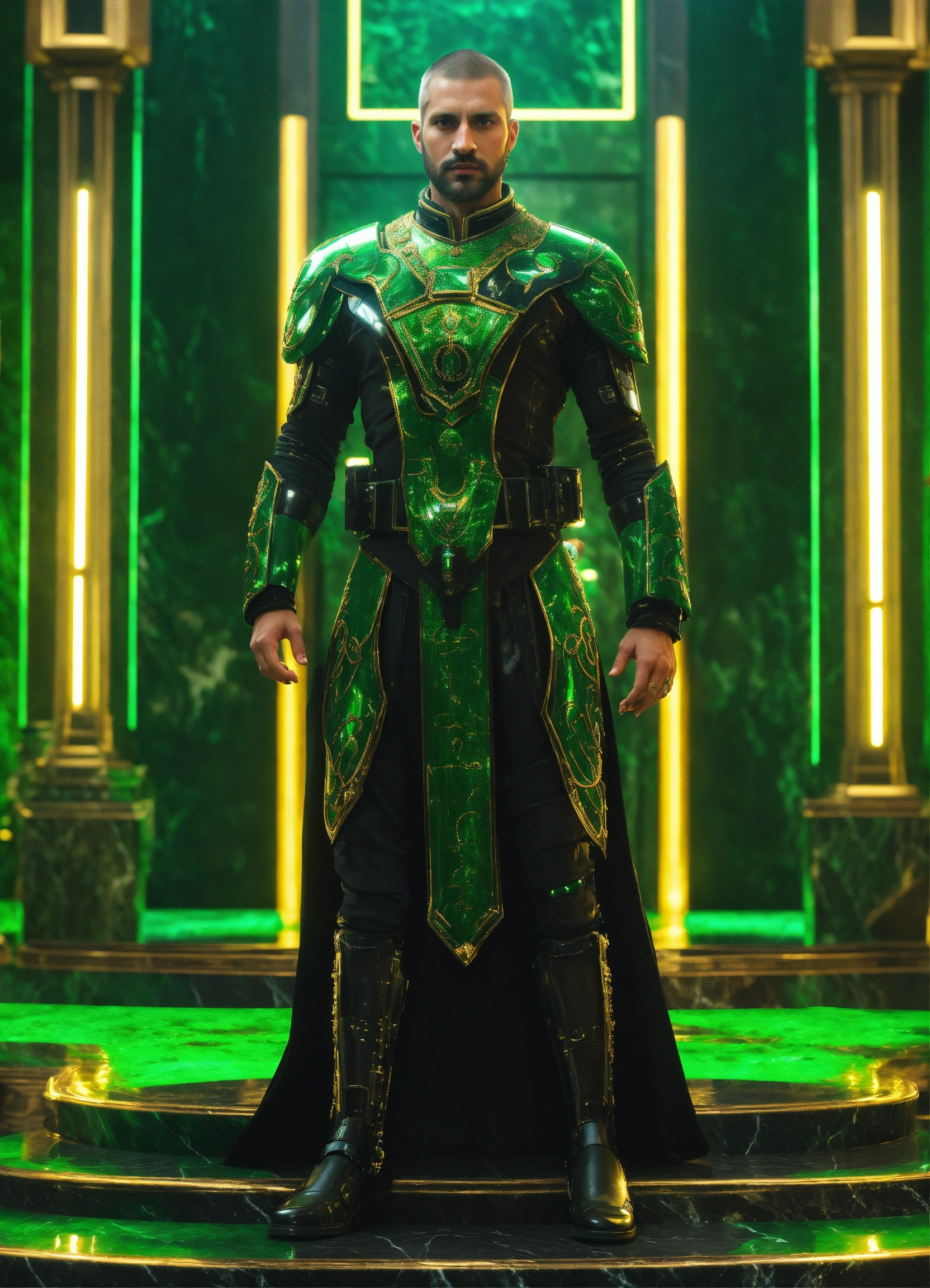 Full body image of a royal man wearing a black and green cybernetic uniform, sci fi, fair skinned, futuristic aristocrat standing in a black marble and jade throne room, turkish face, 34 years old, stoic, buzz cut, royalty, male, handsome, green eyes, unreal engine, 8k