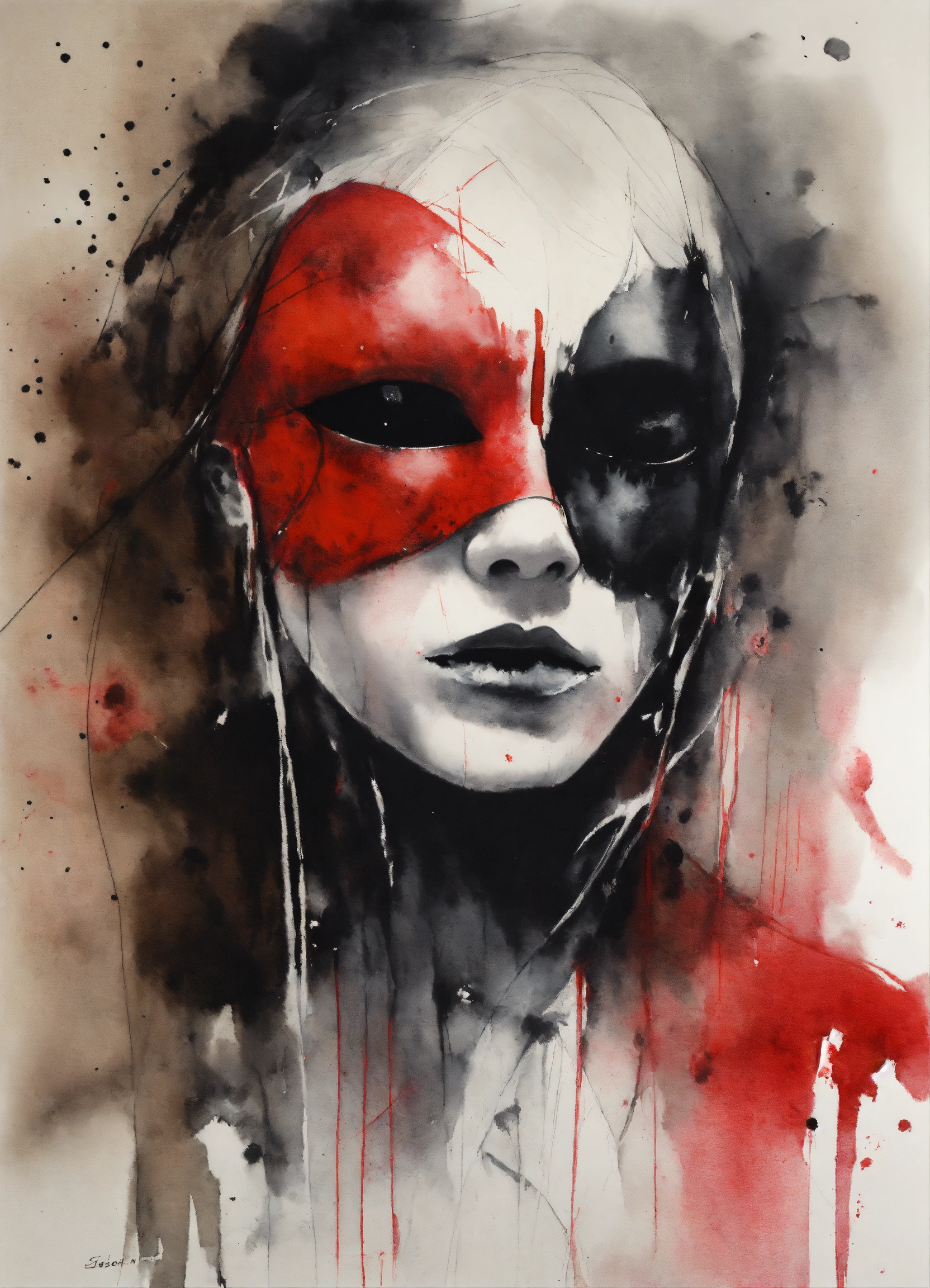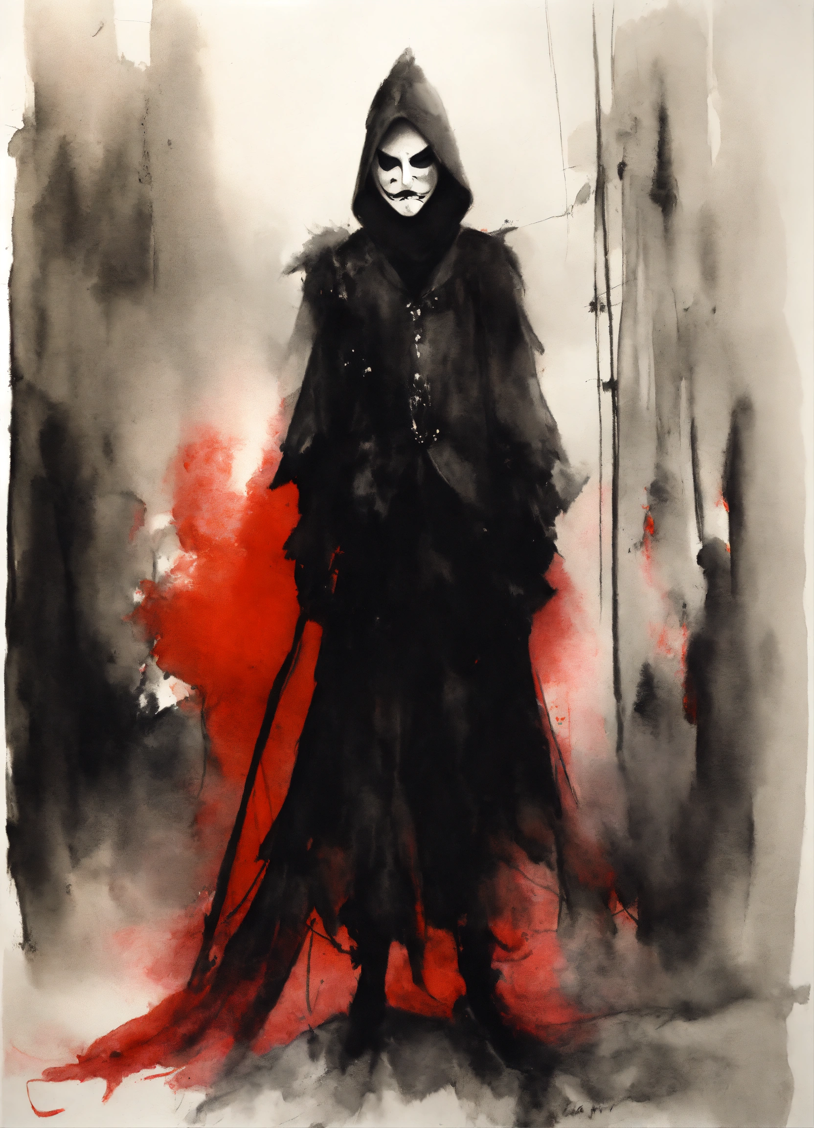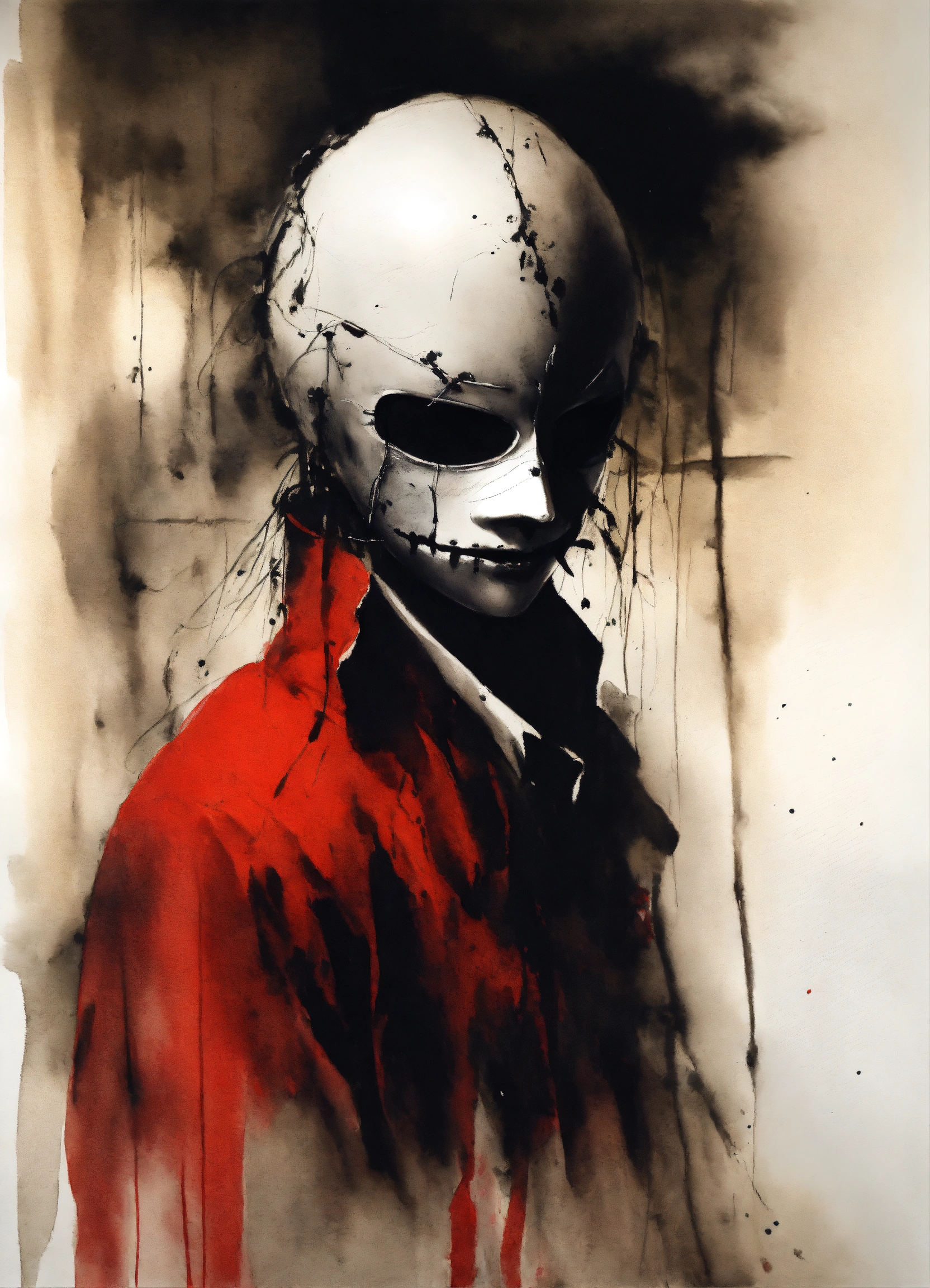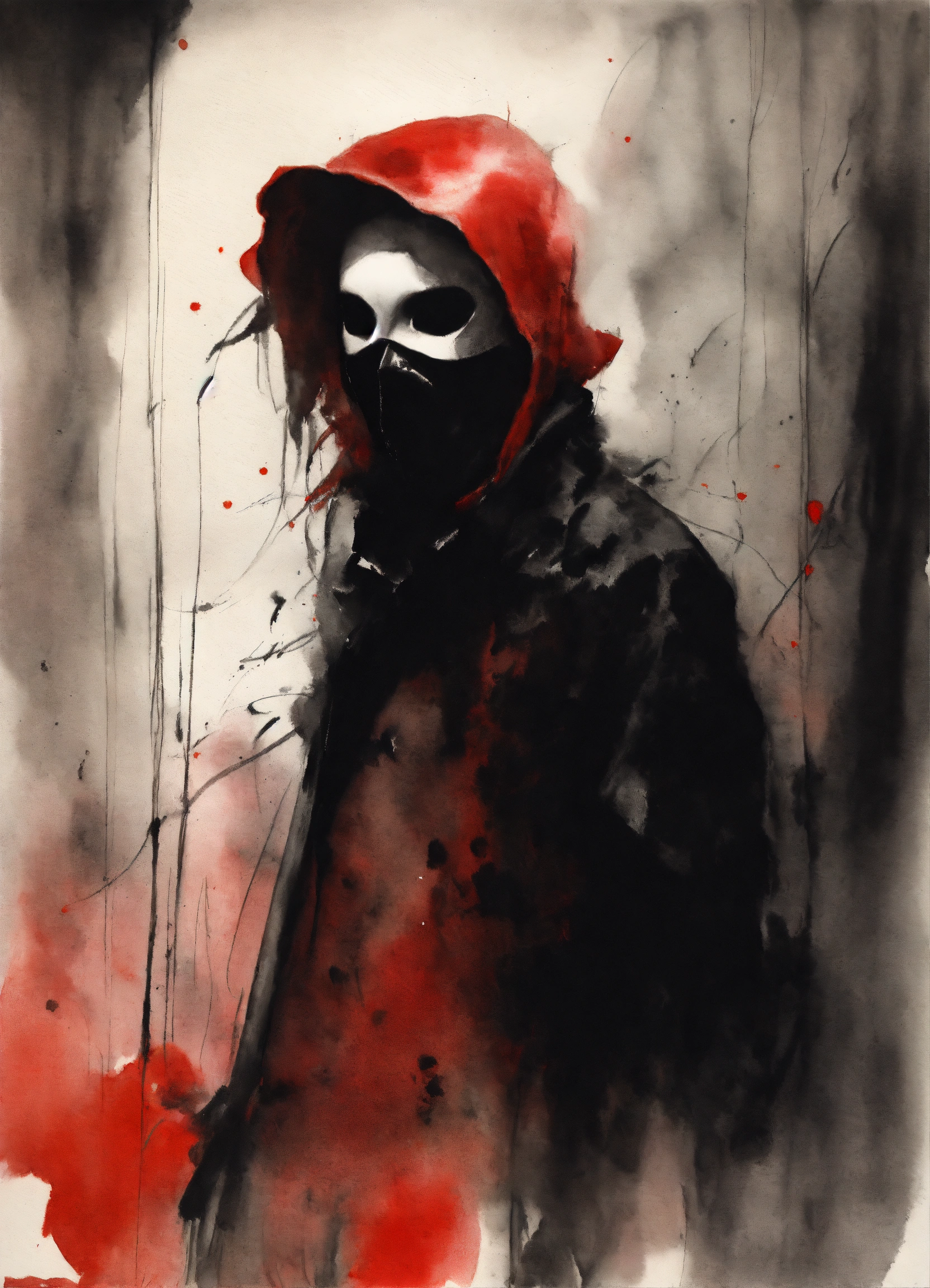 Stephen gammell style, dessin, aquarelle, aquarelles, noir et blanc et rouge, de marais, de sombres créatures, dégoulinan, character with a black mask