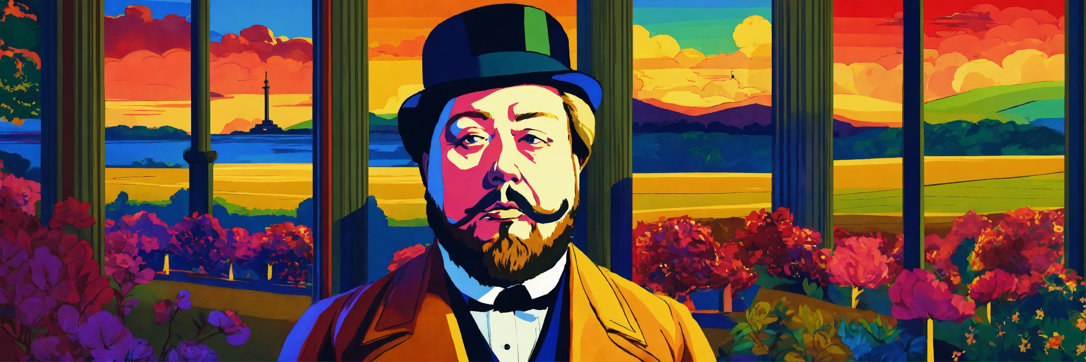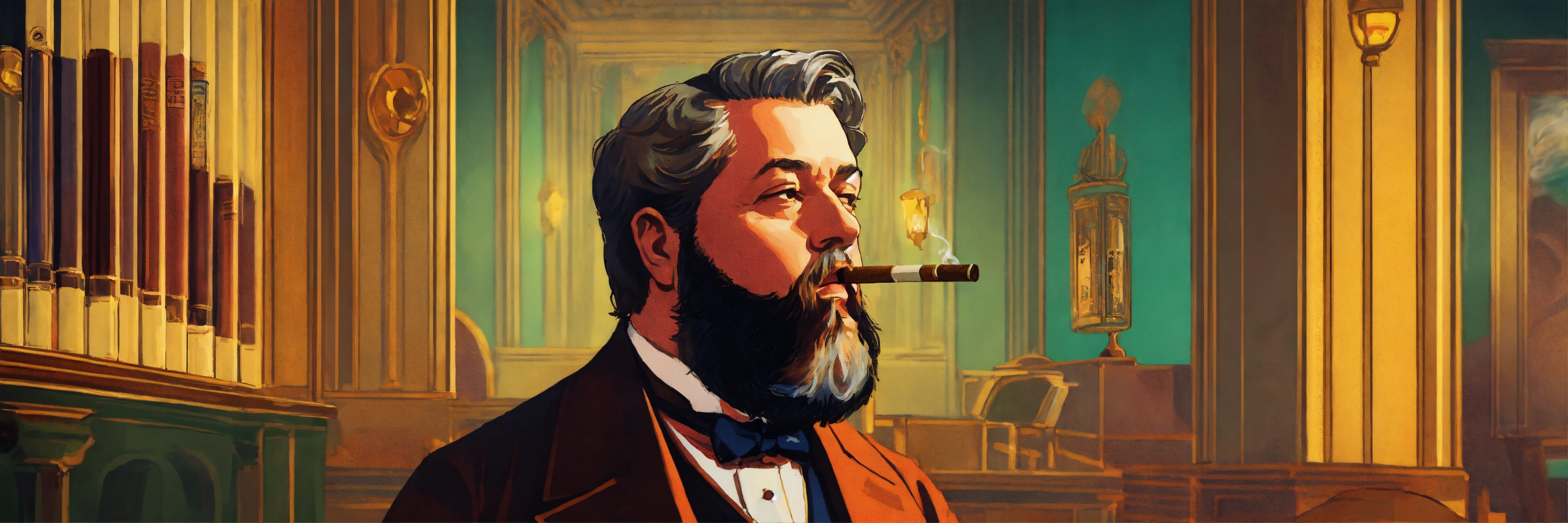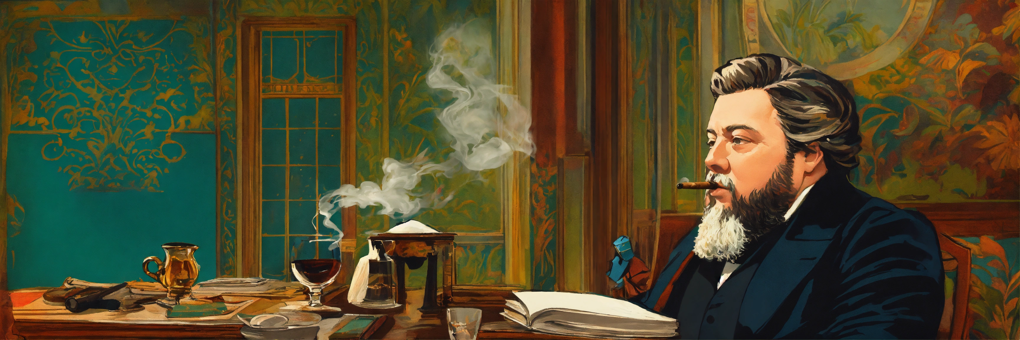 Charles spurgeon, colorful illustration. he's depicted as in his most famous and memorable photo smoking his cigar and making a lot of smoke. medium shot, seen from a far.