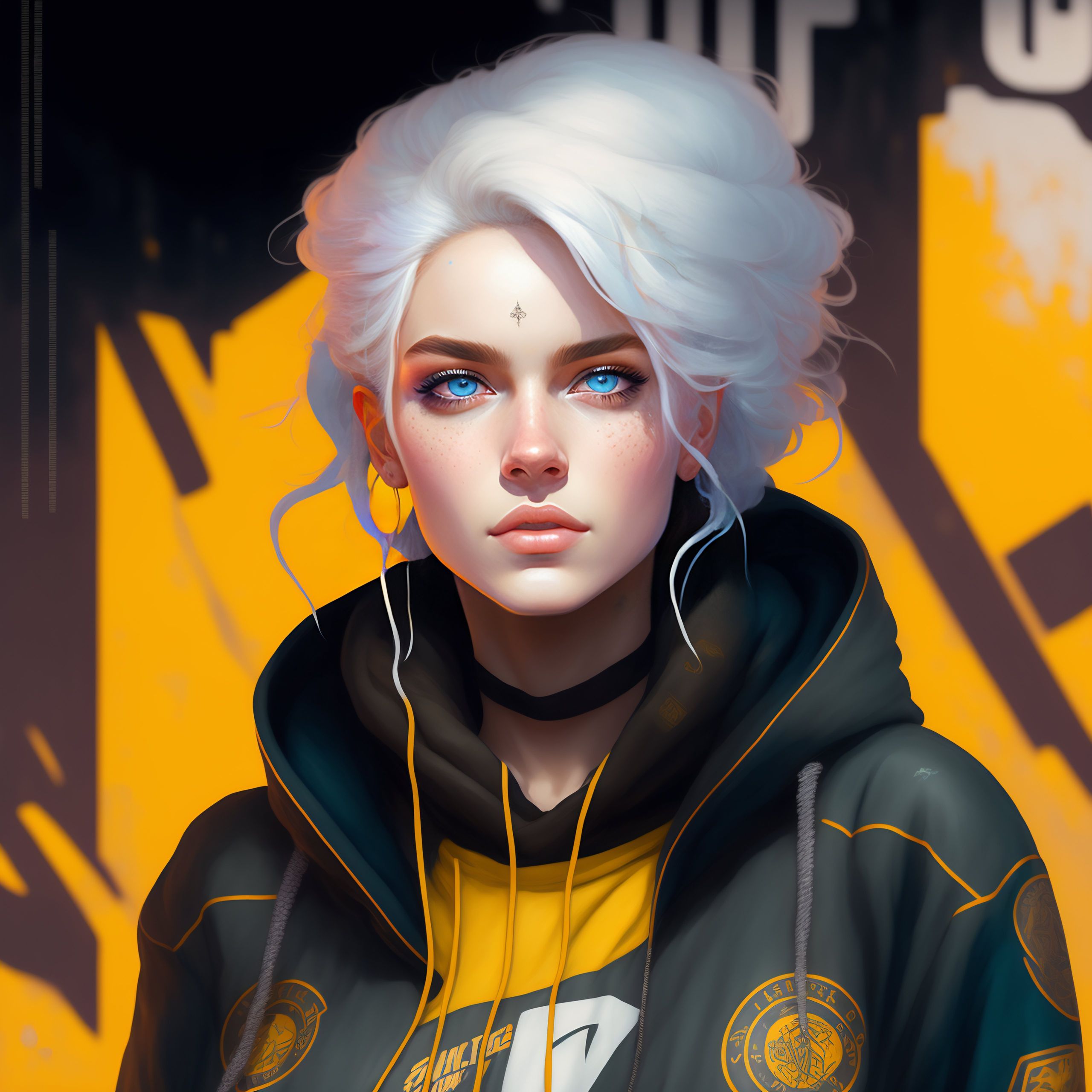 Highly detailed portrait of a sewer punk lady student, blue eyes, tartan hoodie, white hair by gustav klimt, art neuveau, atey ghailan, by greg rutkowski, by greg tocchini, by james gilleard, by joe fenton, by kaethe butcher, gradient yellow, black, brown and pink color scheme, grunge graffiti tag wall background