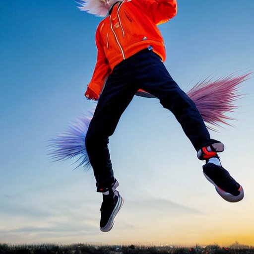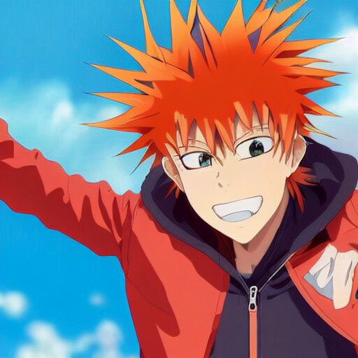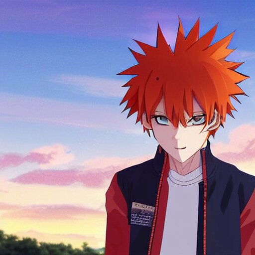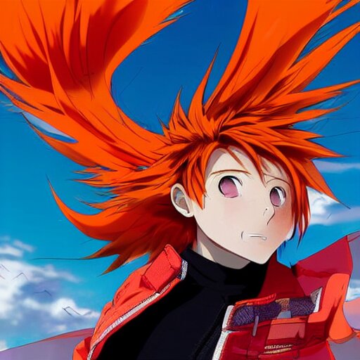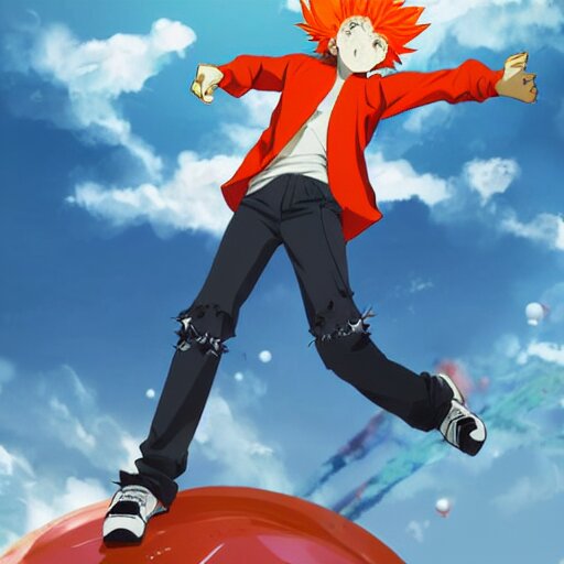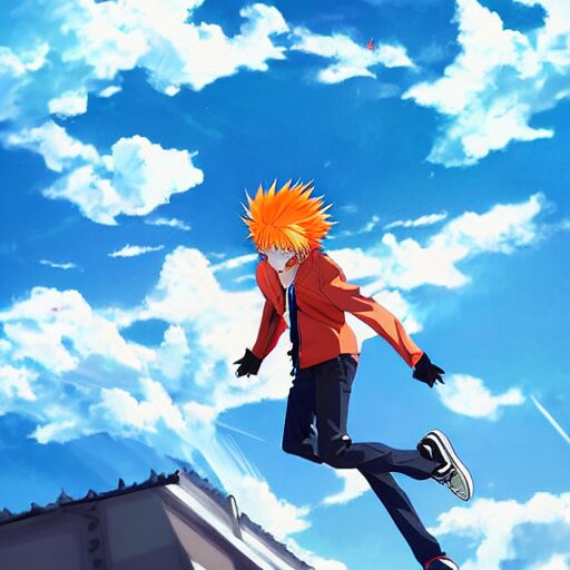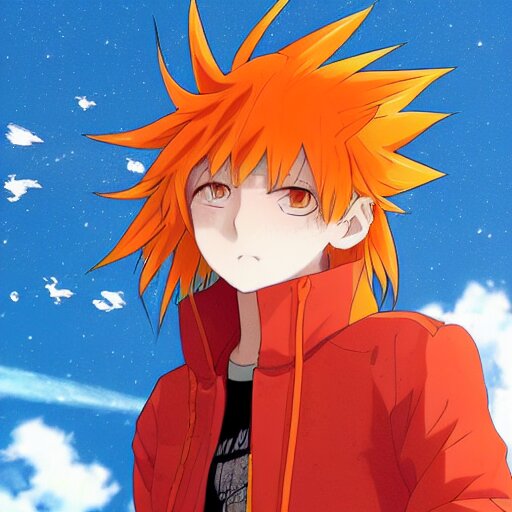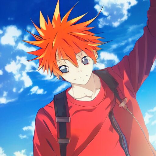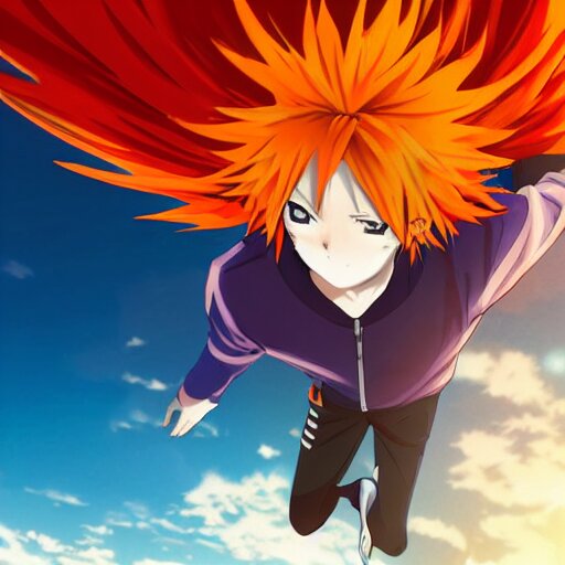 Orange - haired anime boy, 1 7 - year - old anime boy with wild spiky hair, wearing red jacket, flying through sky, ultra - high jump, late evening, blue hour, cirrus clouds, pearly sky, ultra - realistic, sharp details, subsurface scattering, blue sunshine, intricate details, hd anime, 2 0 1 9 anime