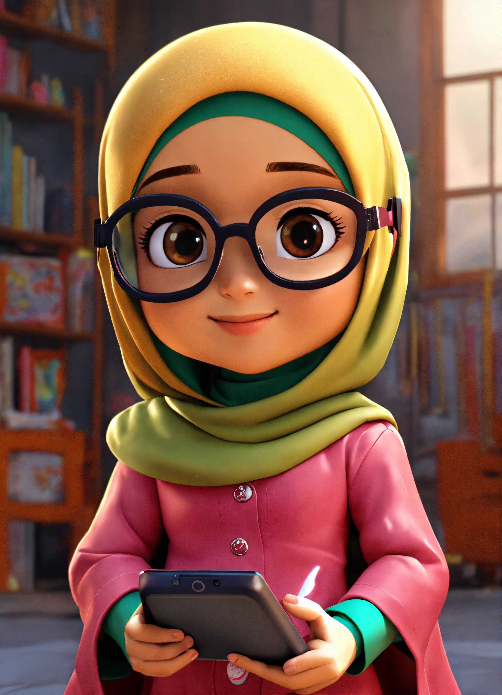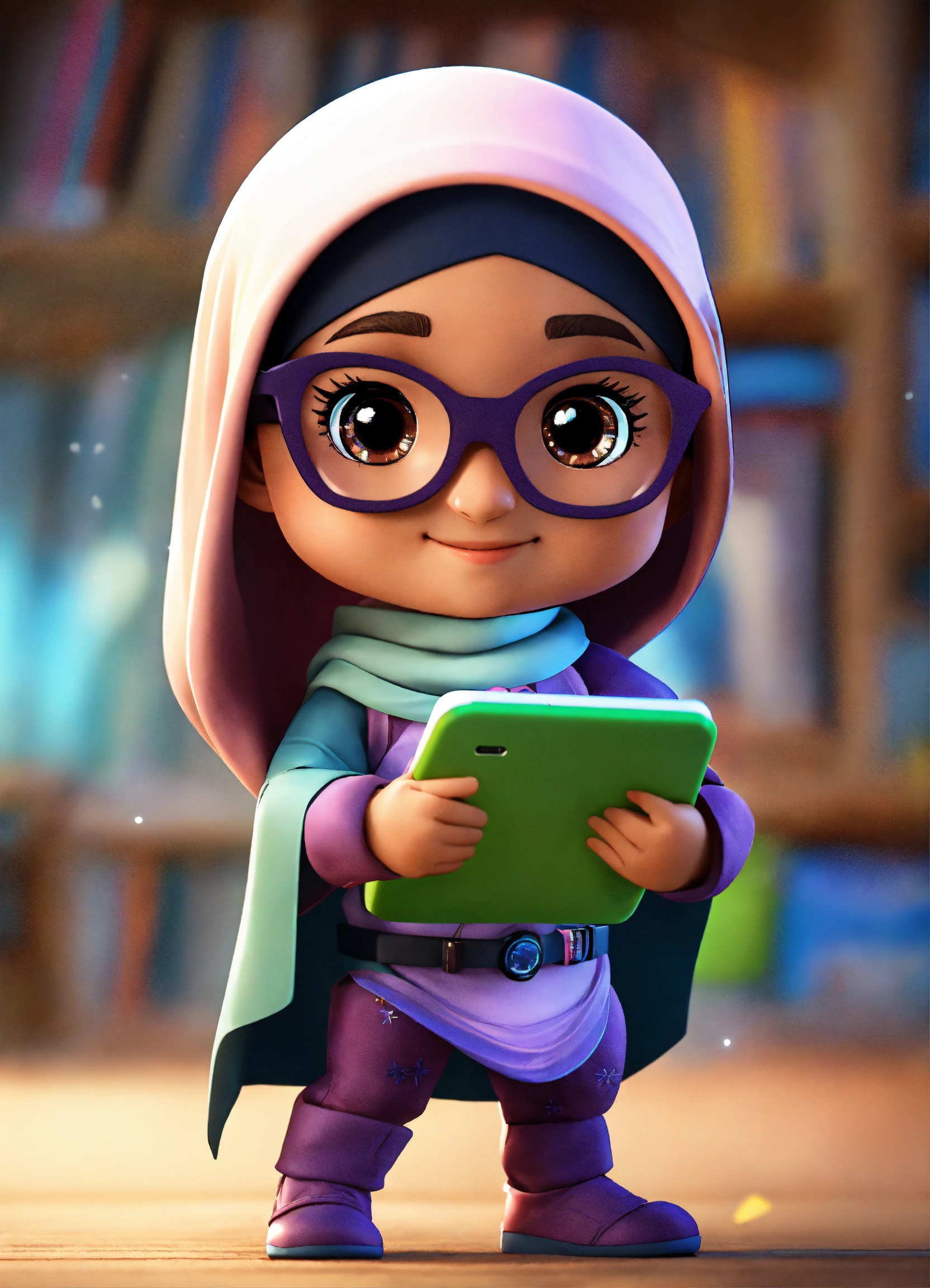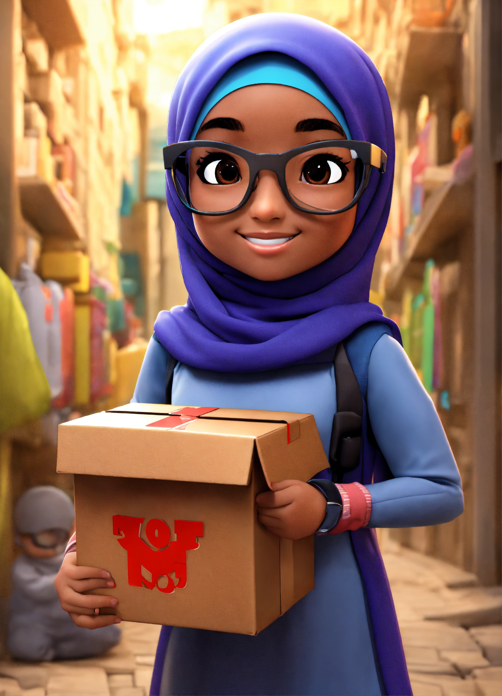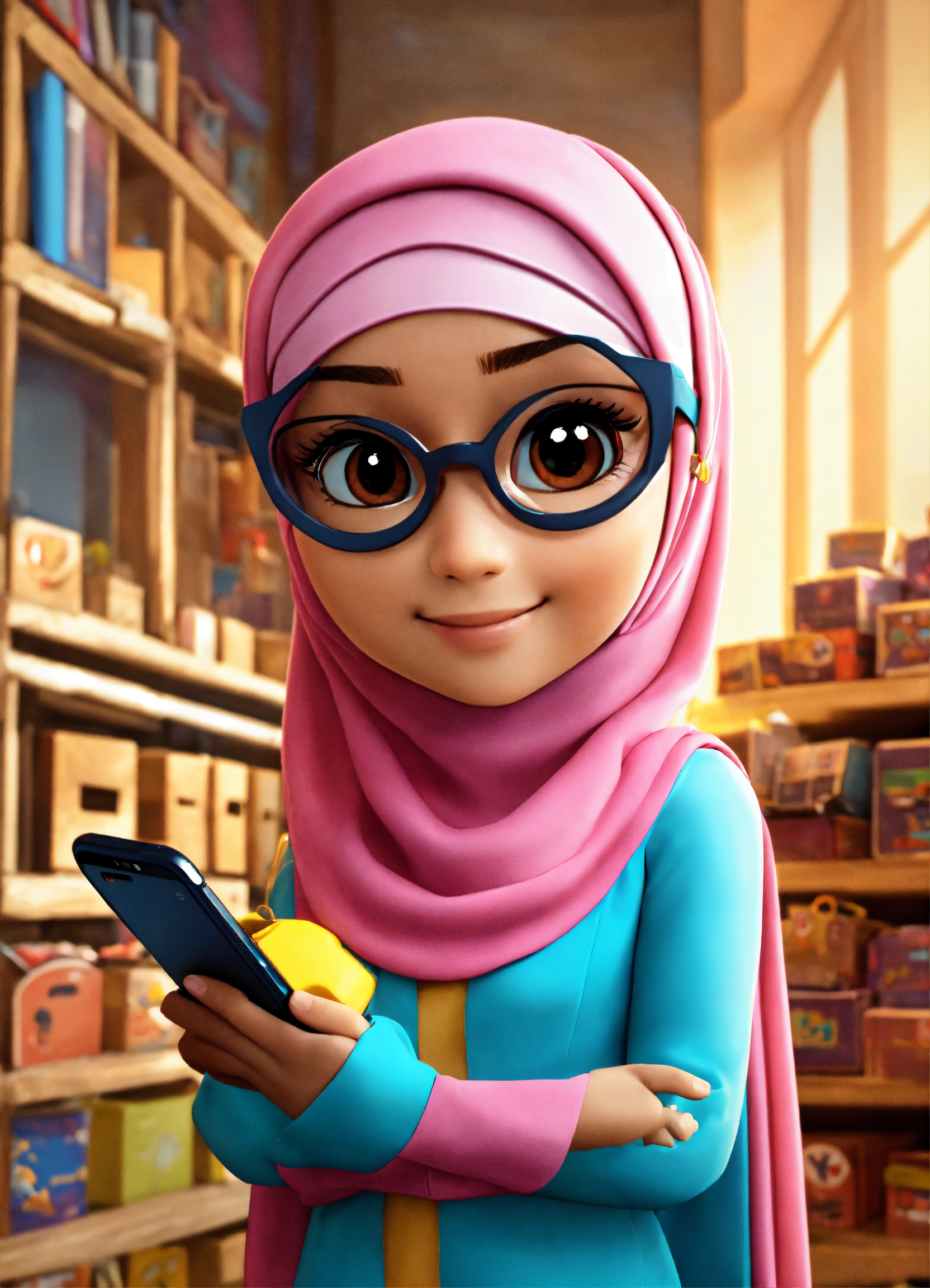 Muslim superhero, little hijab girl, no eyes, using glasses, no eyes, cartoon, 3d, have much boxes, hold handphone, cute smile but strenght