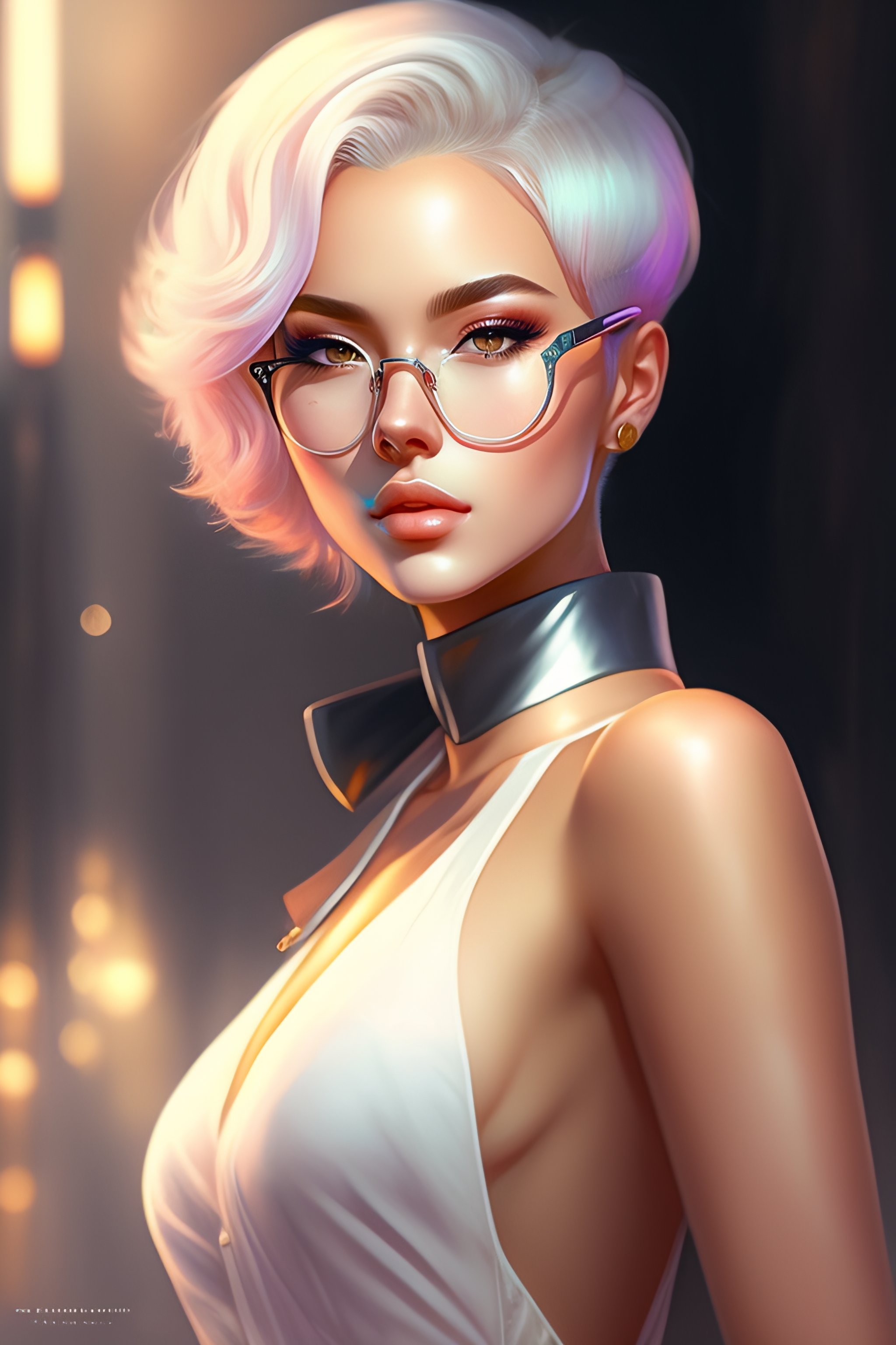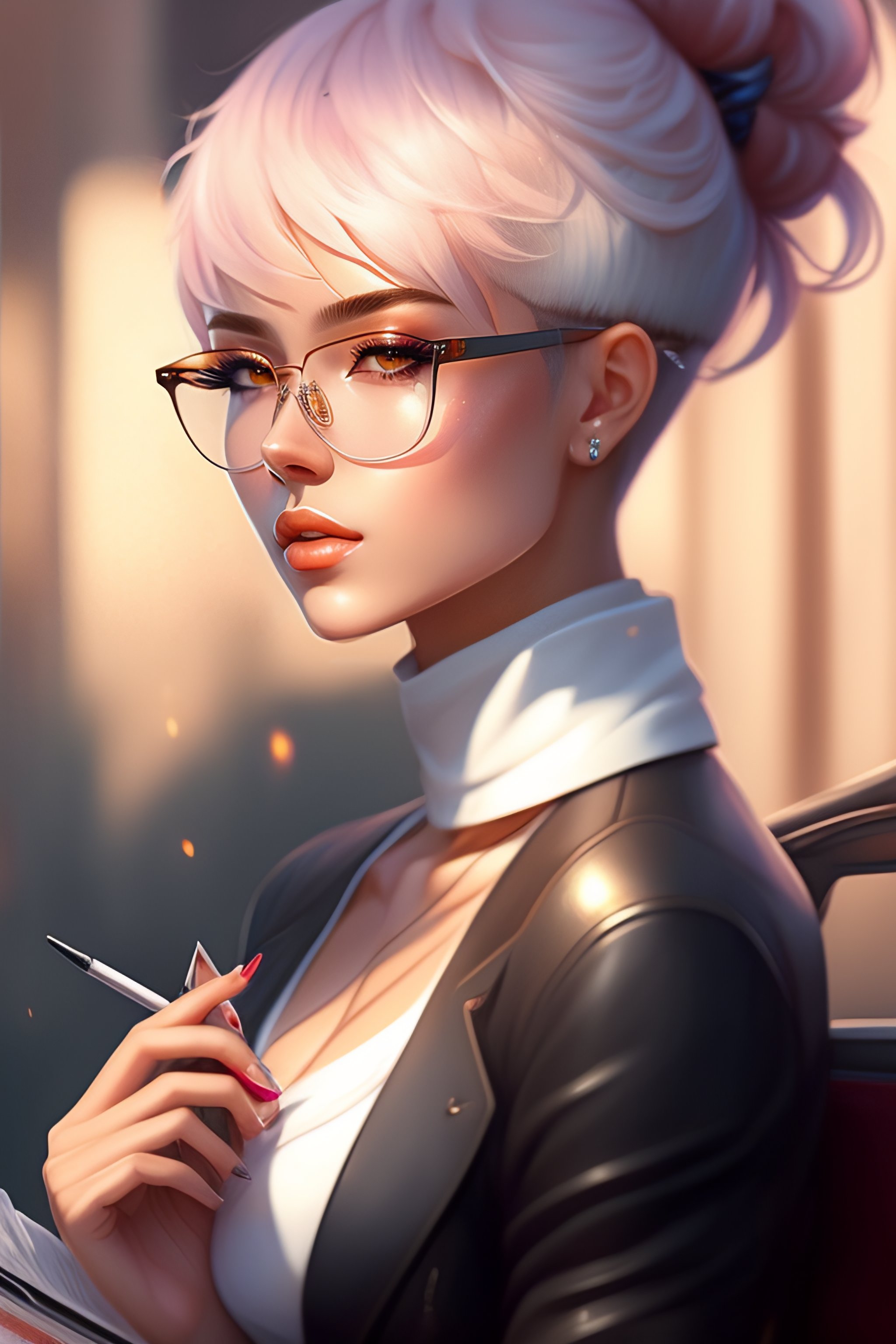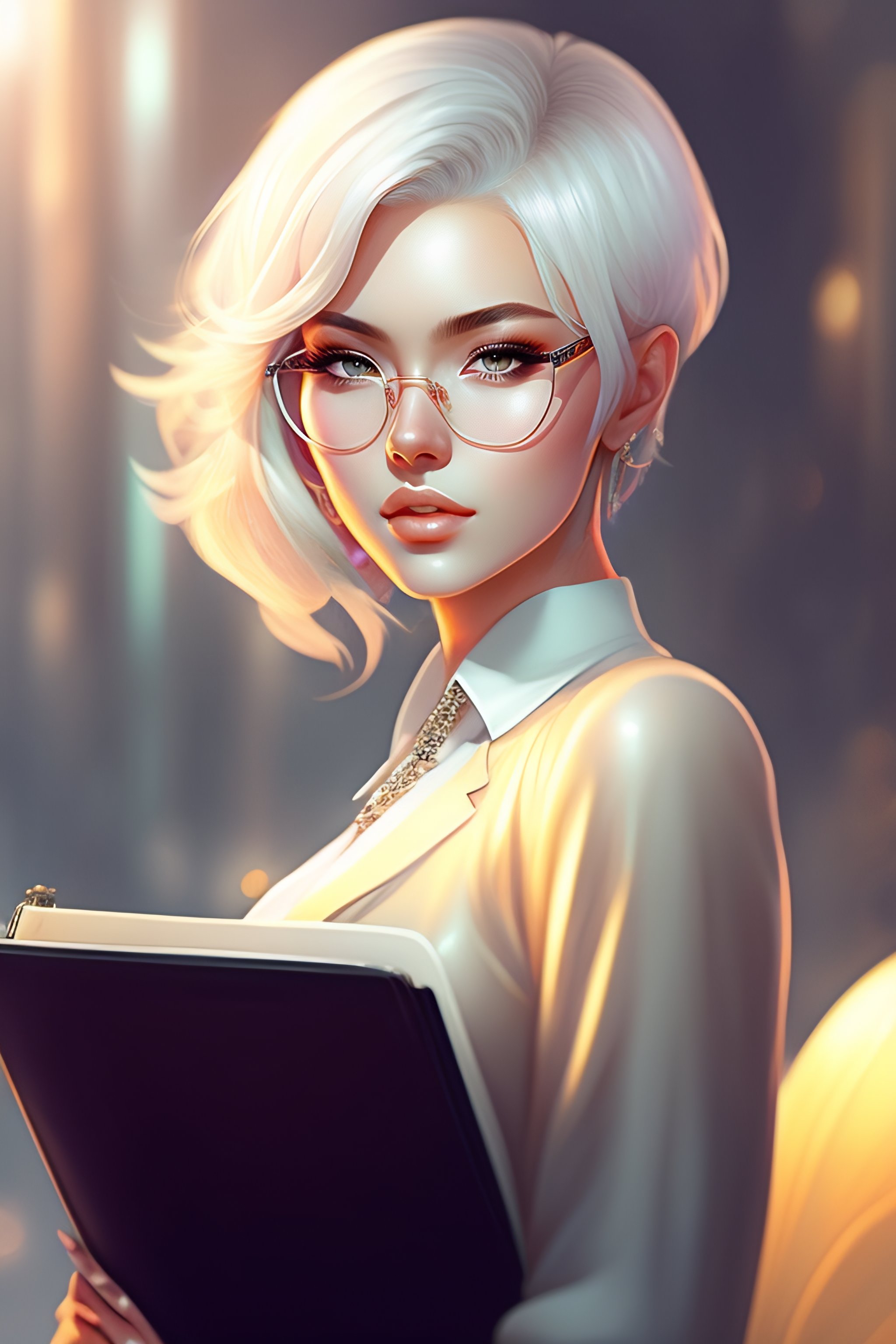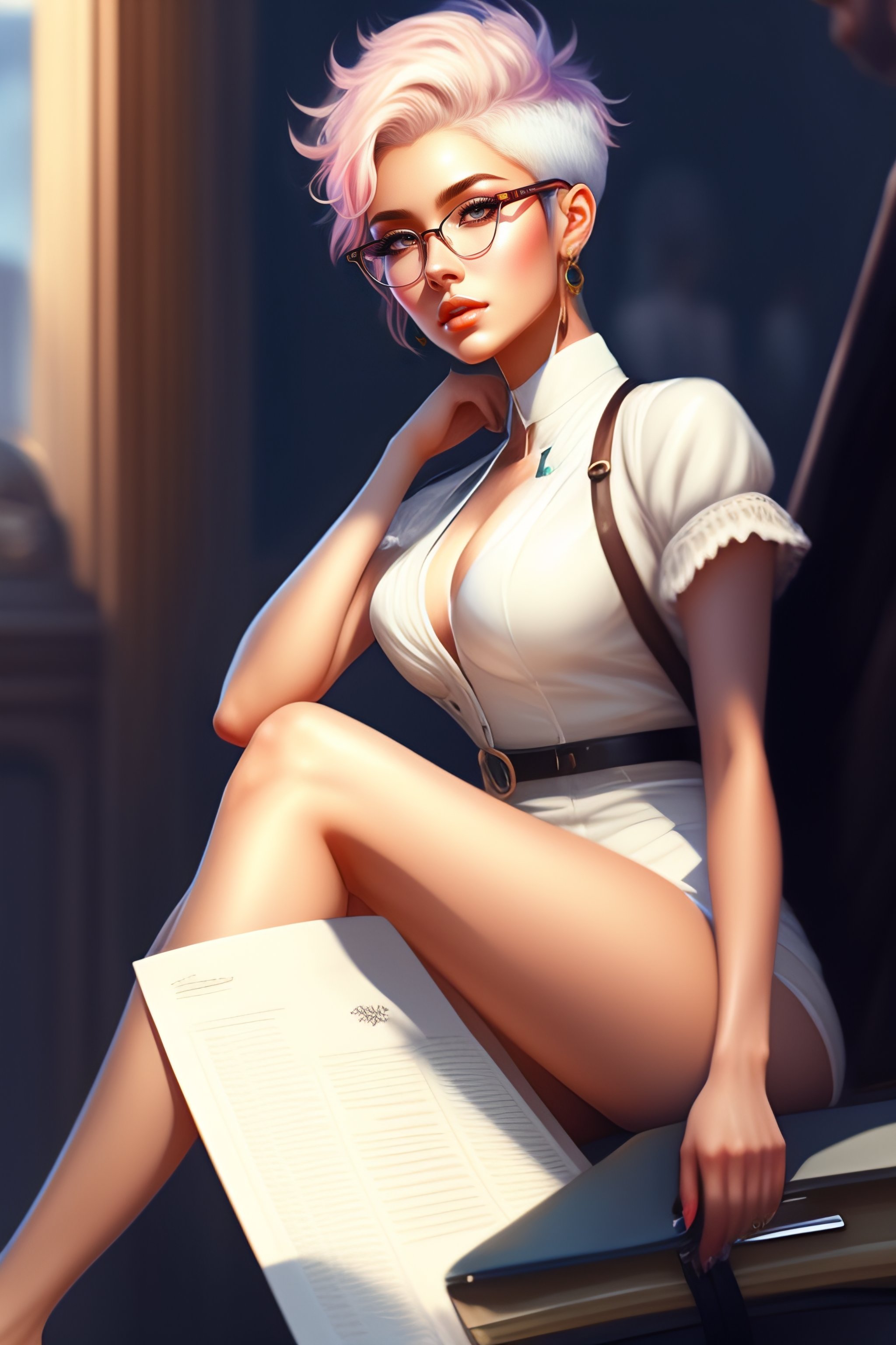 Beautiful hot anime girl with short white hair, hot body, full body, wearing mini skirt and glasses, sitting, holding a clipboard, skin the sample, character portrait, 1 9 6 0 s, long hair, intricate, elegant, highly detailed, digital painting, artstation, concept art, smooth, sharp focus, illustration, art by wlop, charlie bowater and alexandra fomina