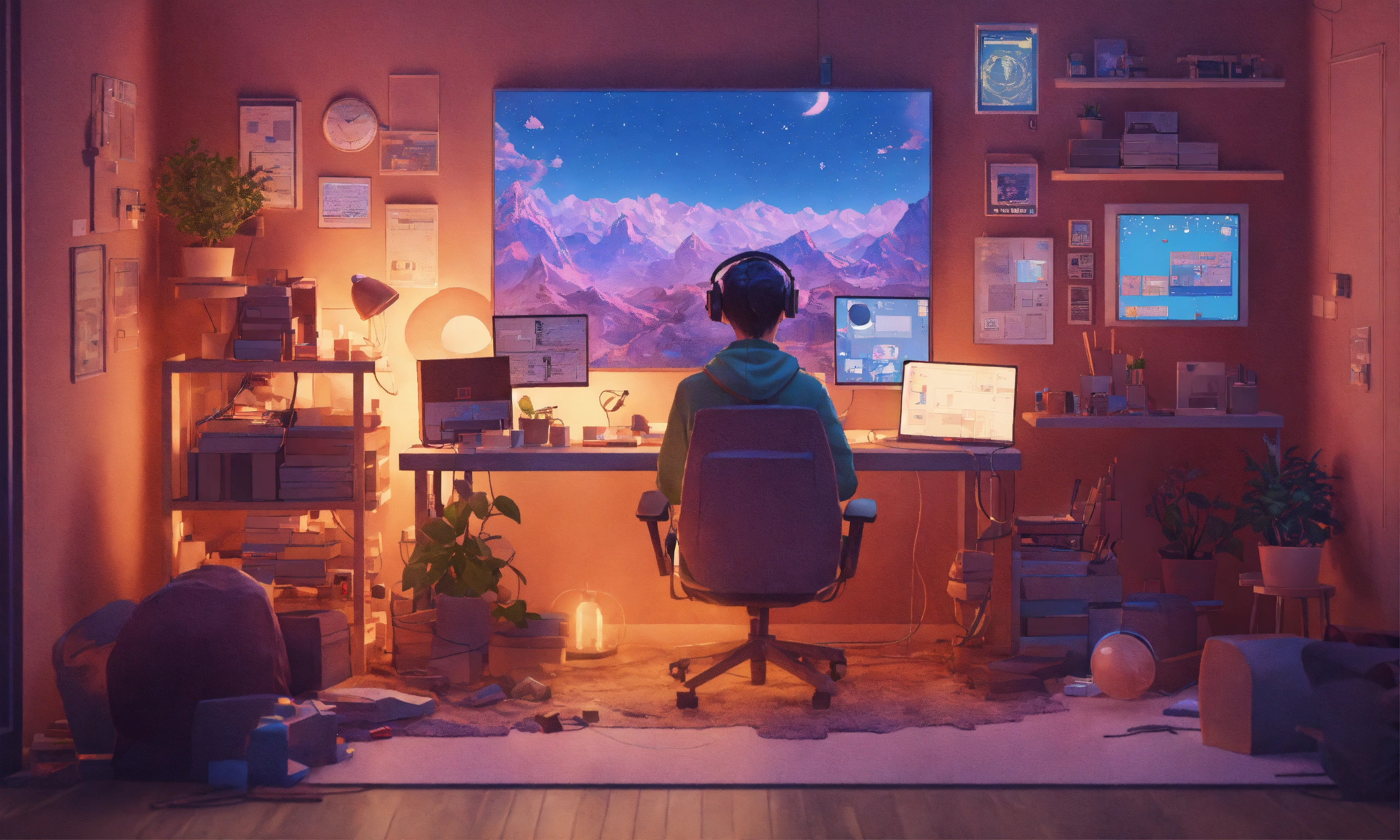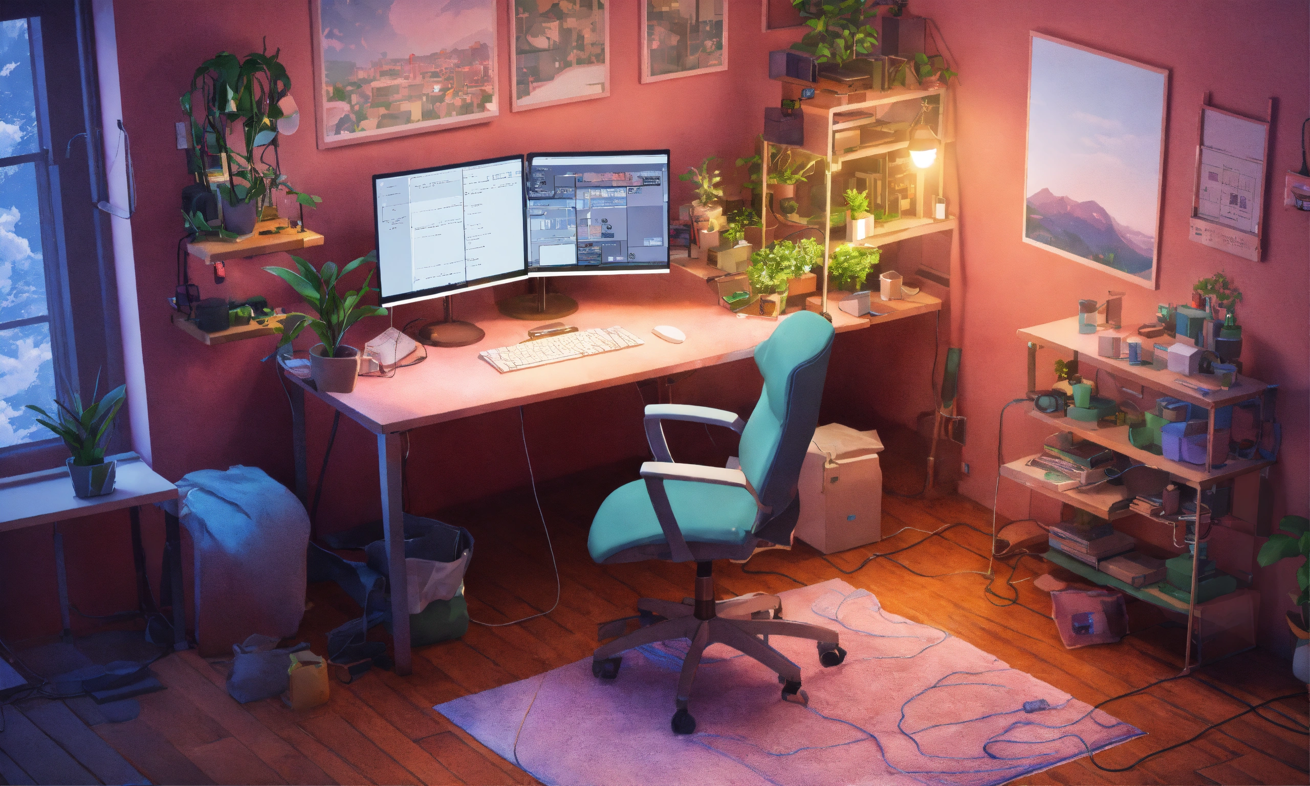 A programmer in front of his computer station, cozy and messy room, lofi-girl, unreal engine render. isometric cube cutout of a messy room with, isometric 3d render, detailed, ideal symmetry, perfect alignment, 8k, muted pastel hues, bloom from screen illuminations