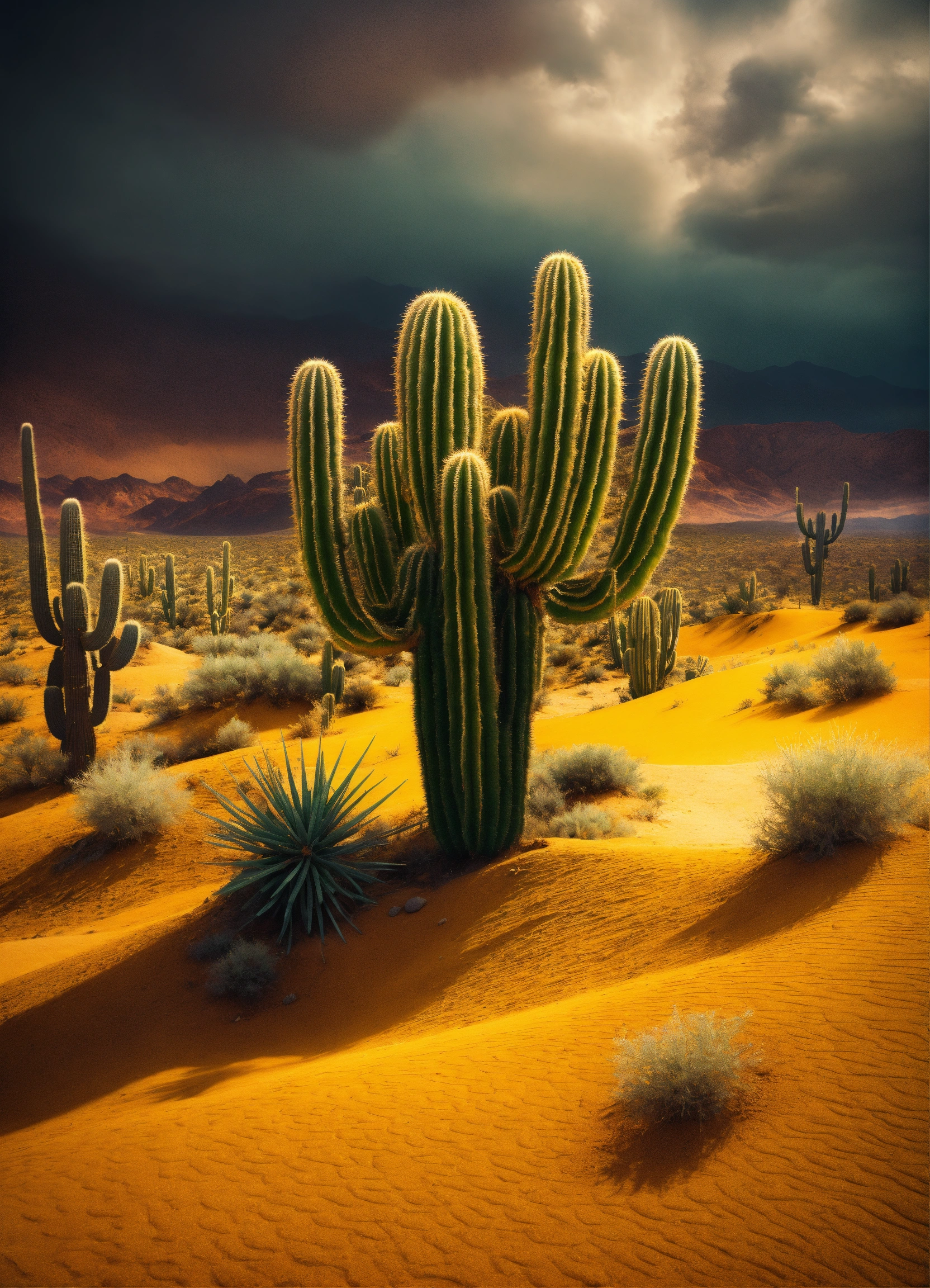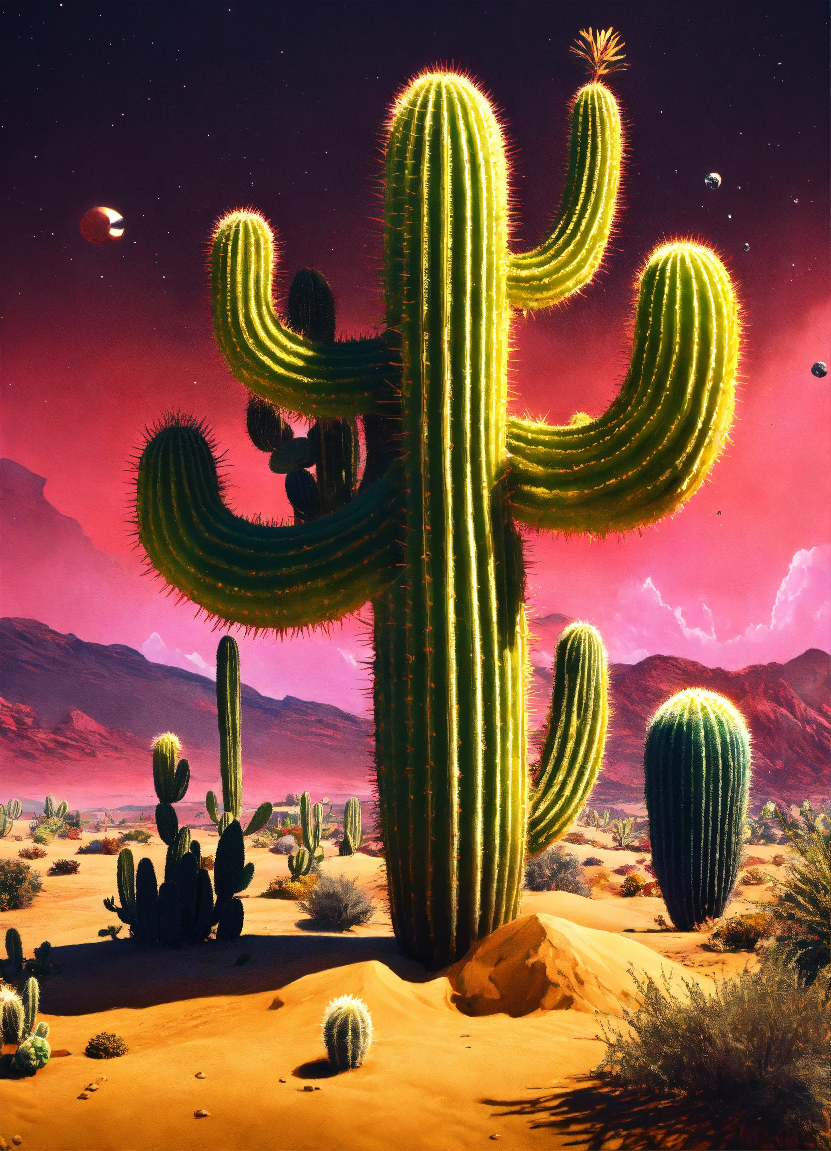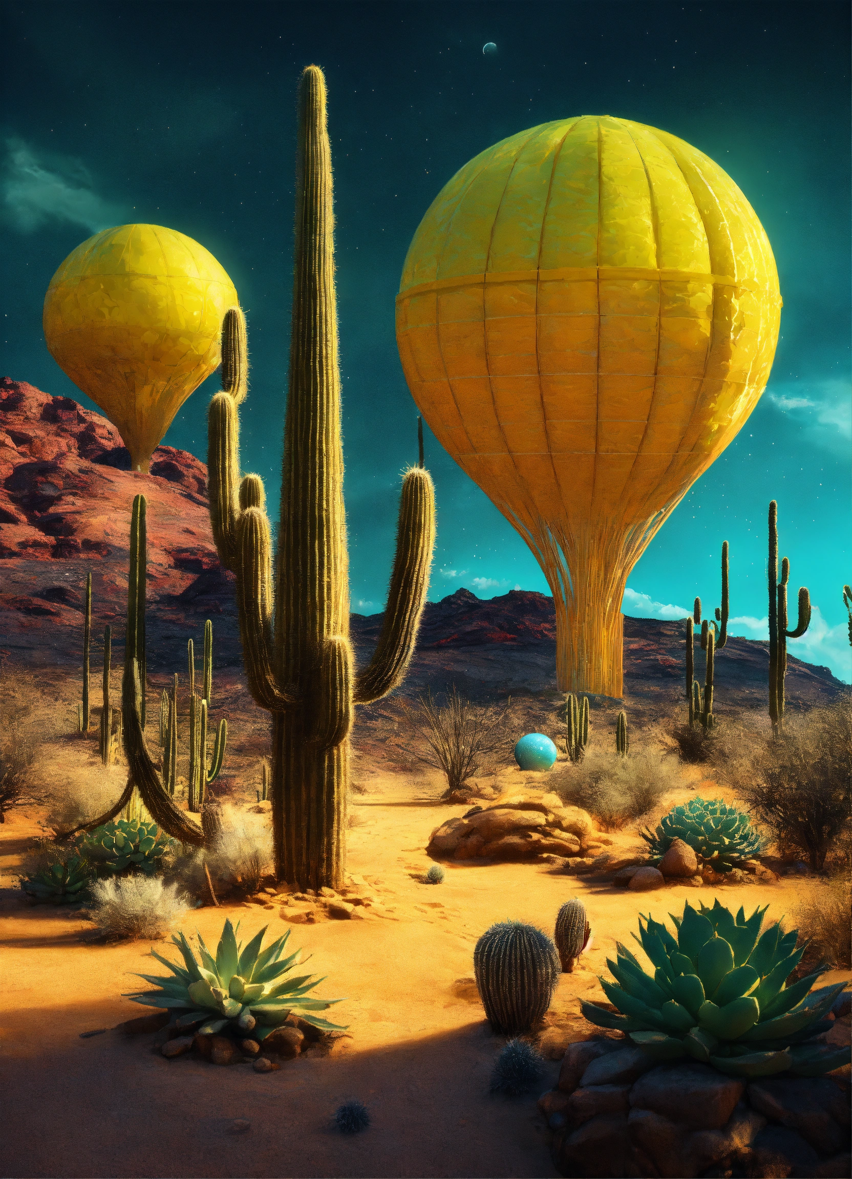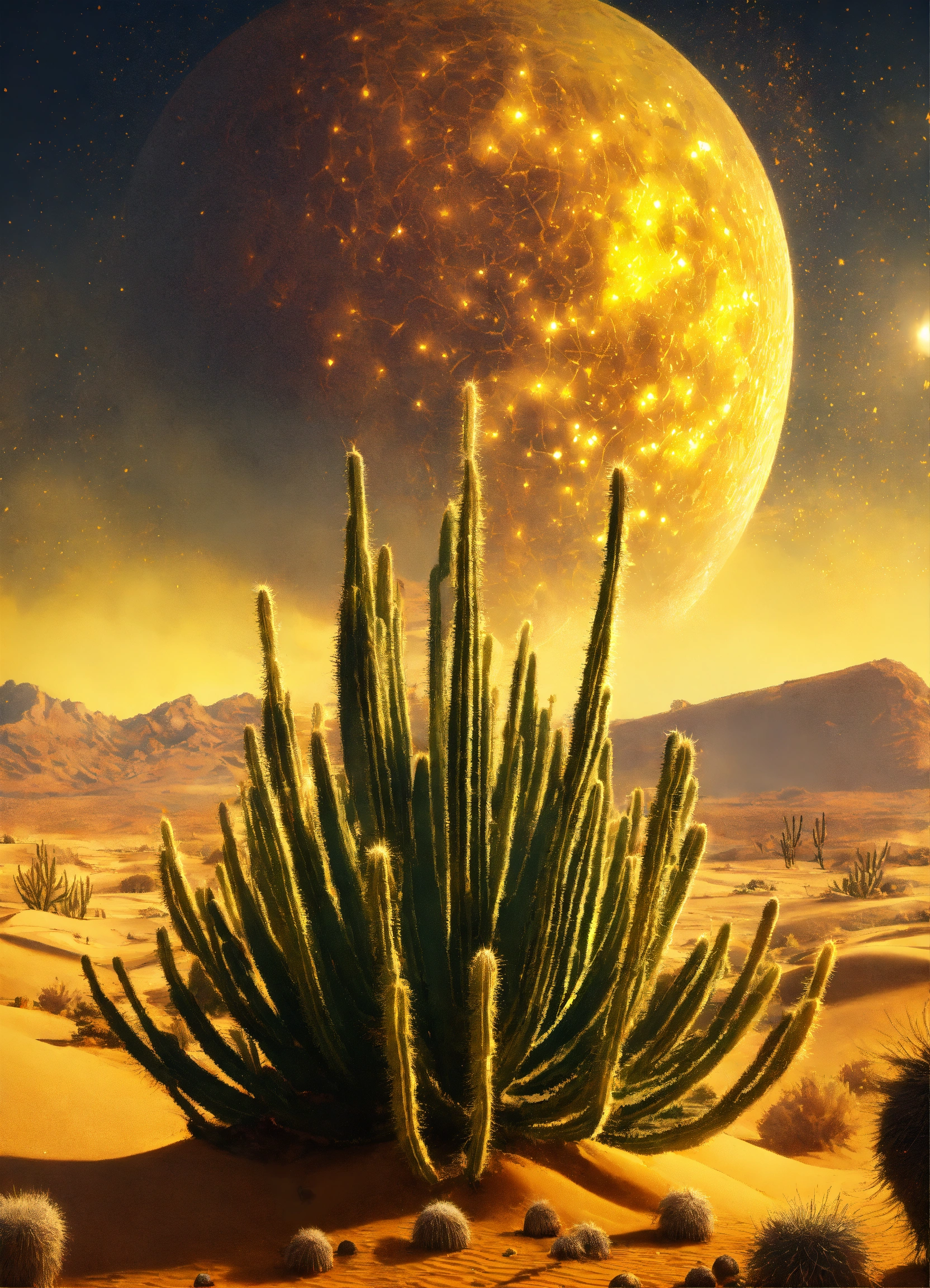 Create a surreal desert with cacti, the plants are shaped like canary_yellow_perlwhite, are partially transparent with tentacles and spines, in the sand laying pearls, backdrop is the storm of cosmic dust and cosmic clouds the heaven is dark colored unreal engine 6 color palette knives painting oel on canvas conzeptart, high qualty, cinema_stil, wide shot