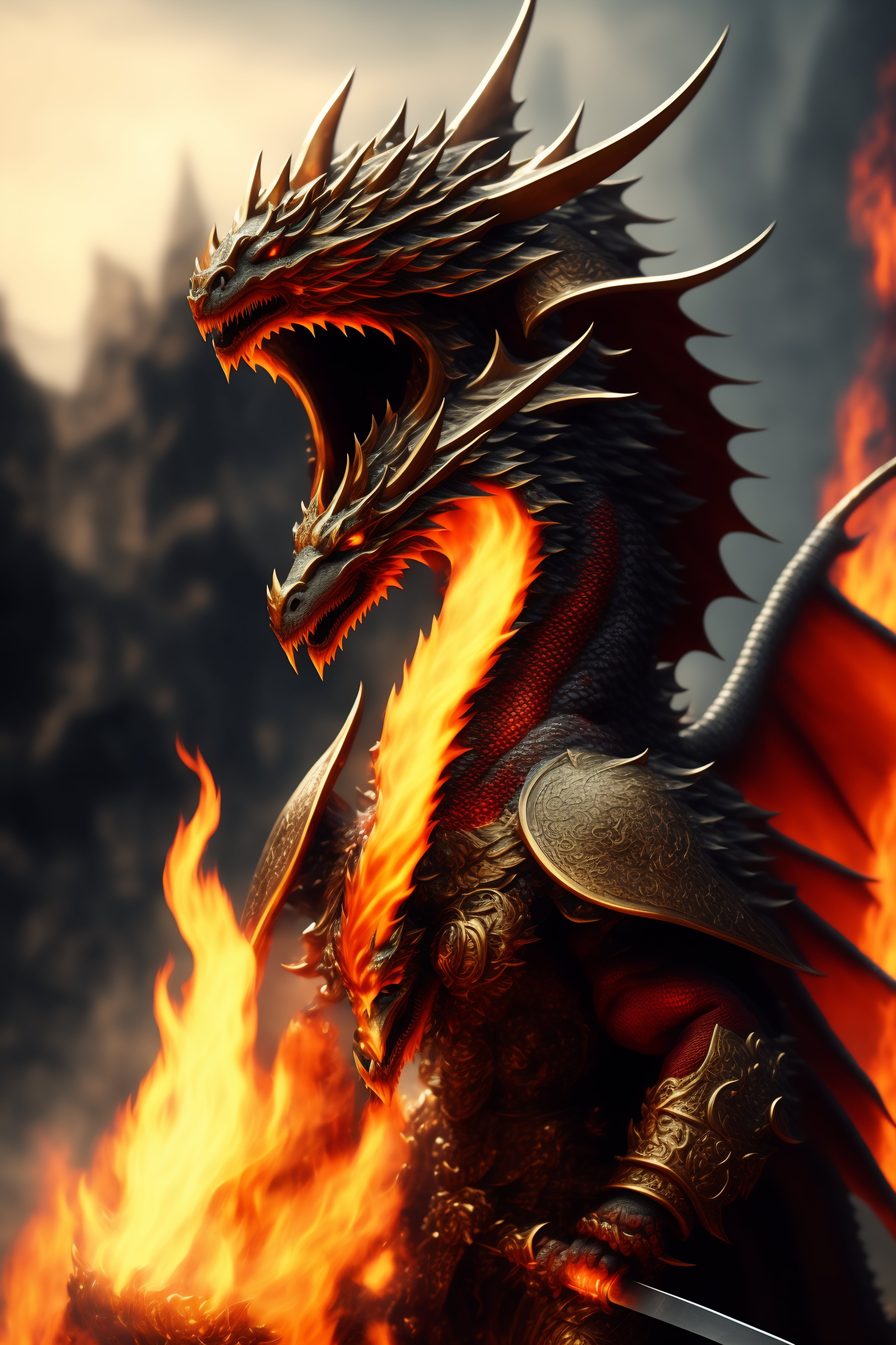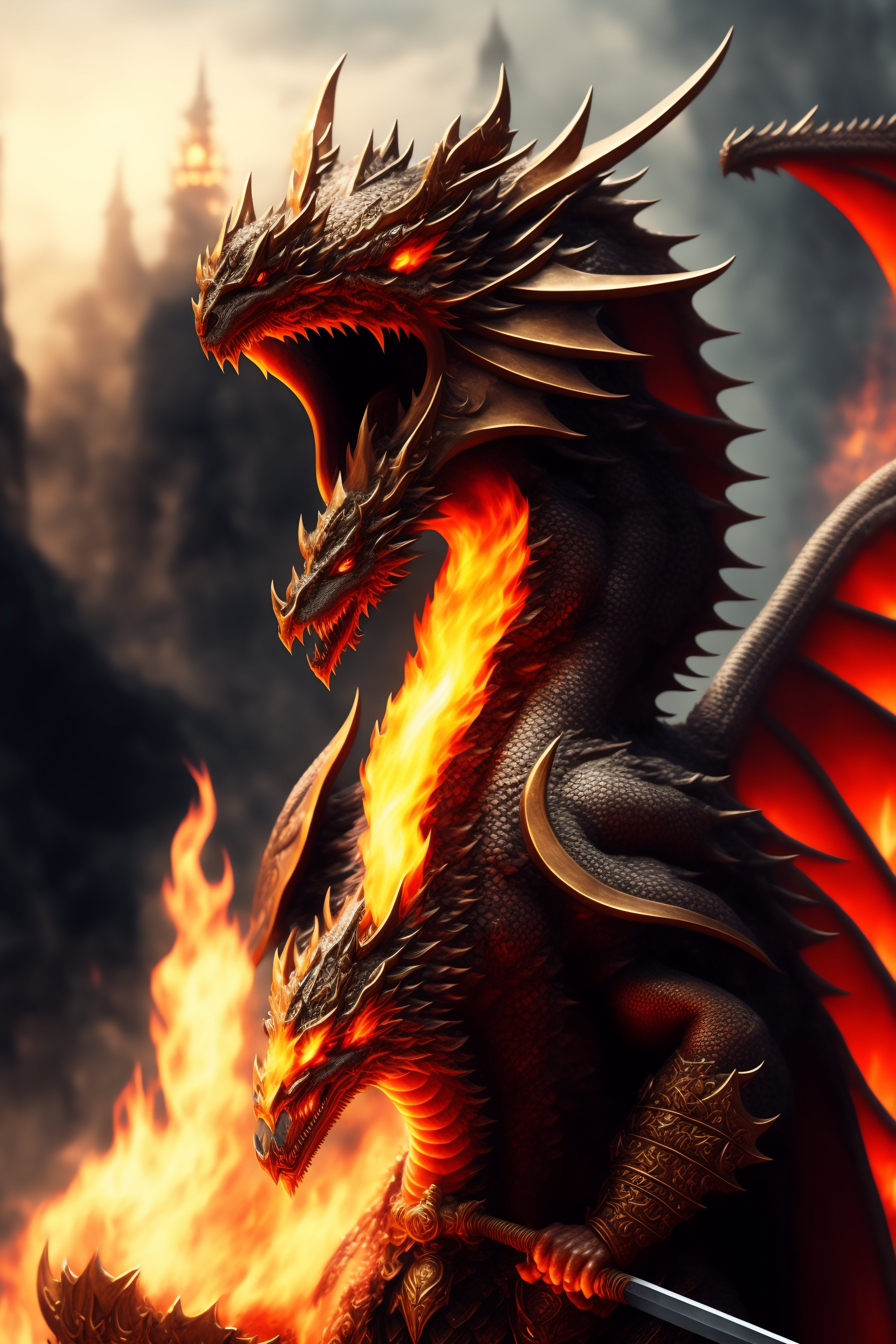 Ancient massive bi-pedal fire dragon wielding two swords ultra-realistic