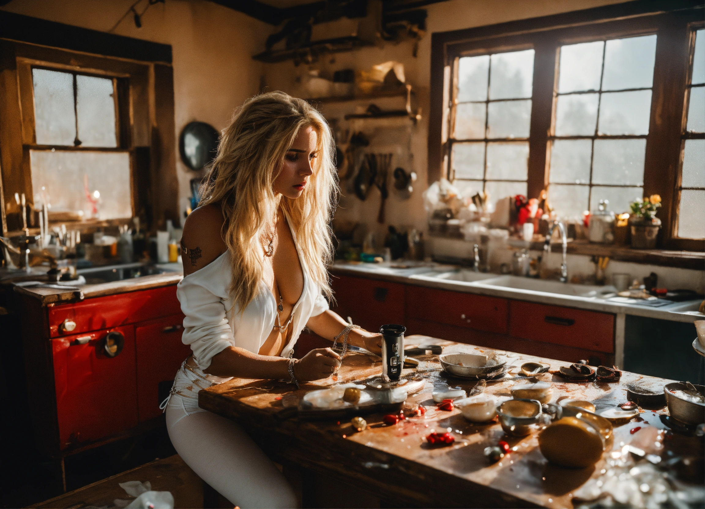 Top down camera angle, kitchen, full body, flying, lots of jewelry, white swimwear, shiny skin, wet messy long hair, bawling, very many straps, harnesses, crying, distressed, many gorgeous young women, handcuffed, red water everywhere, long socks, blonde hair, white woman, tan skin, fitness influencer, highly detailed, dramatic shoot, sharp focus, 4k uhd, cinematic lighting, cut, scratched, messy makeup, desk, white board, long white gloves