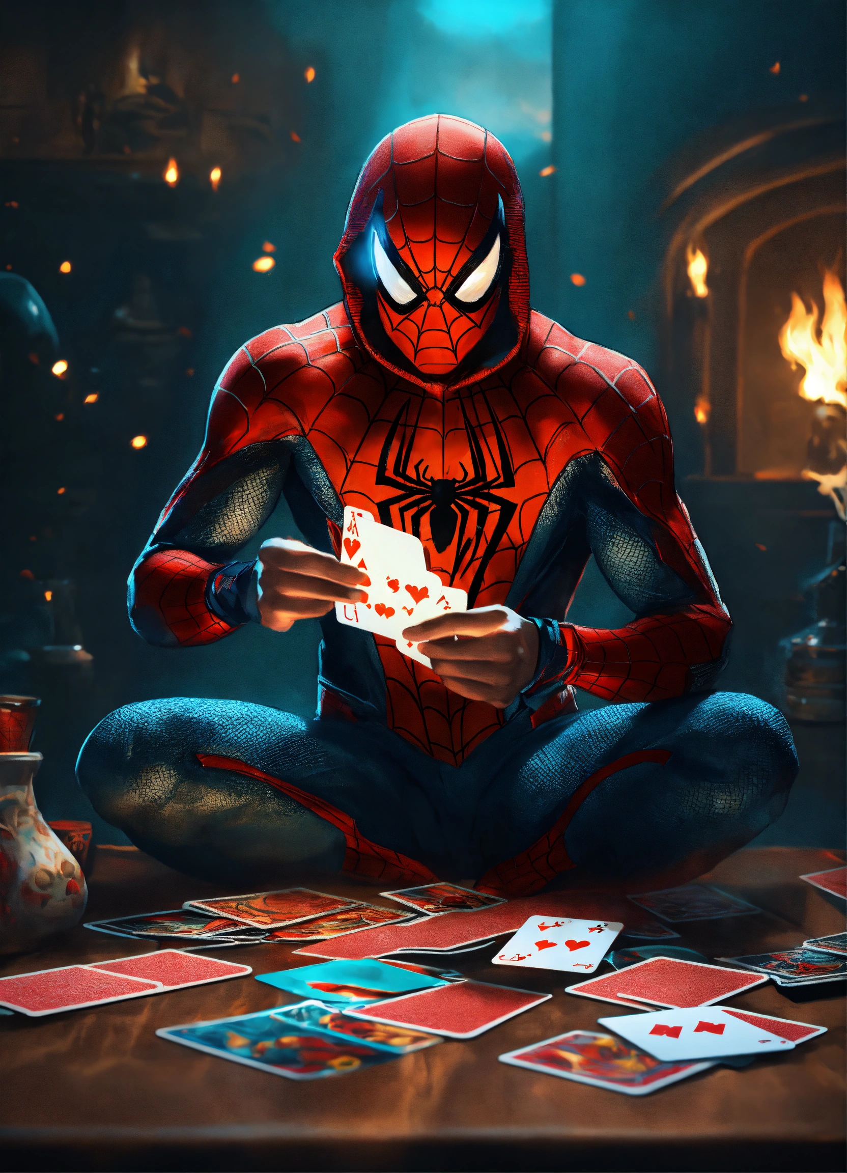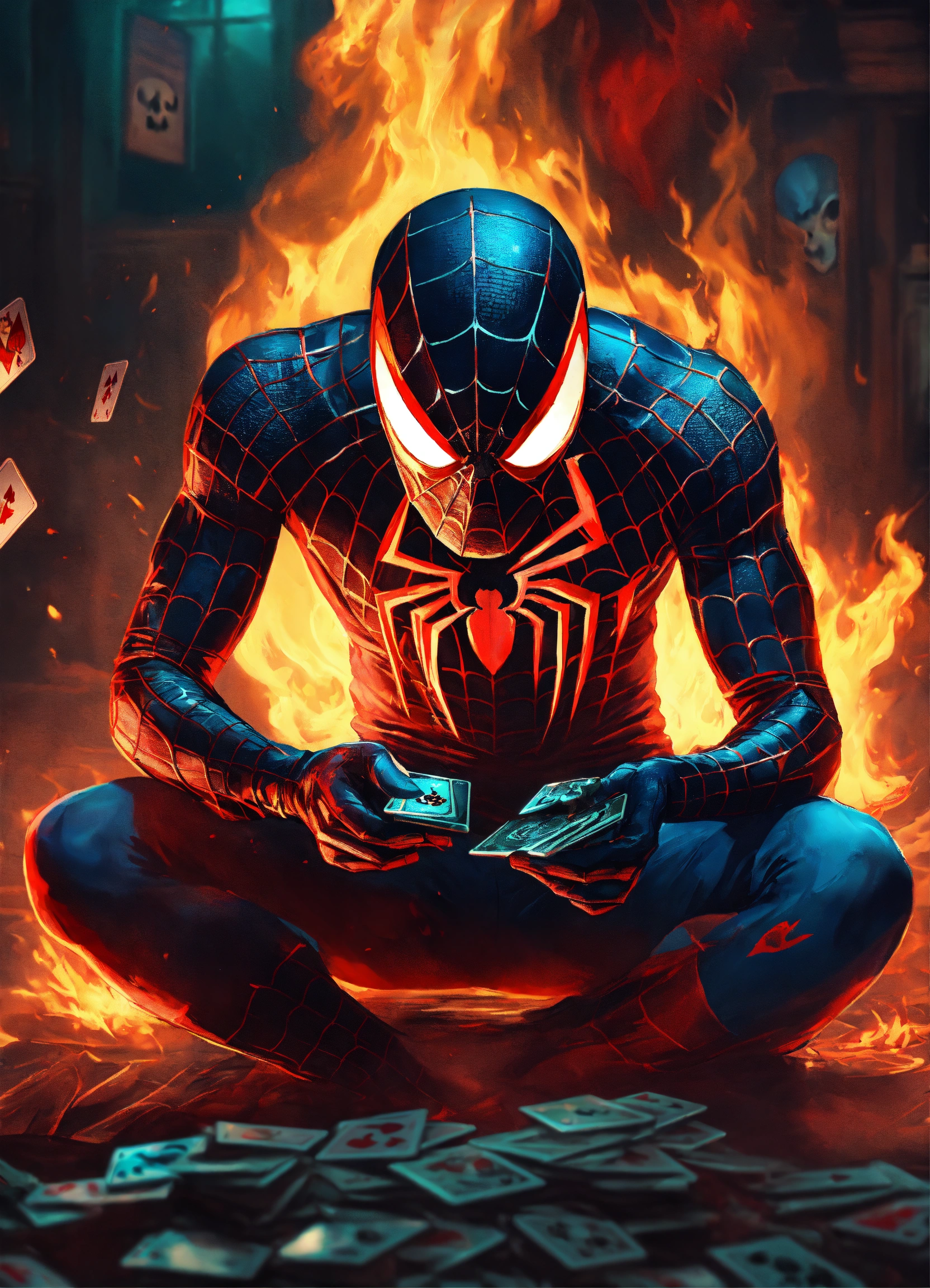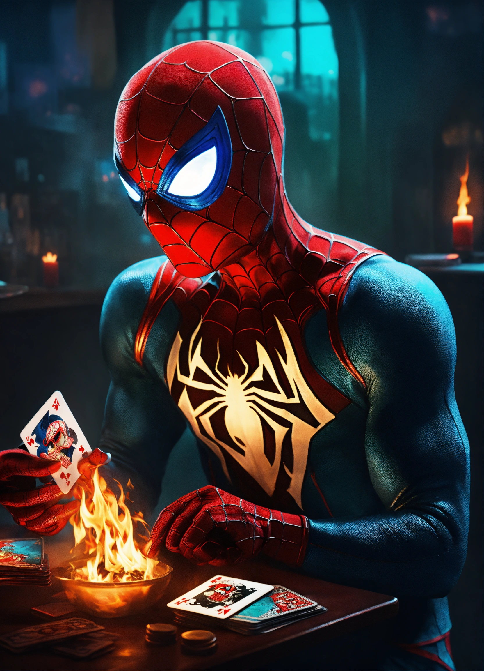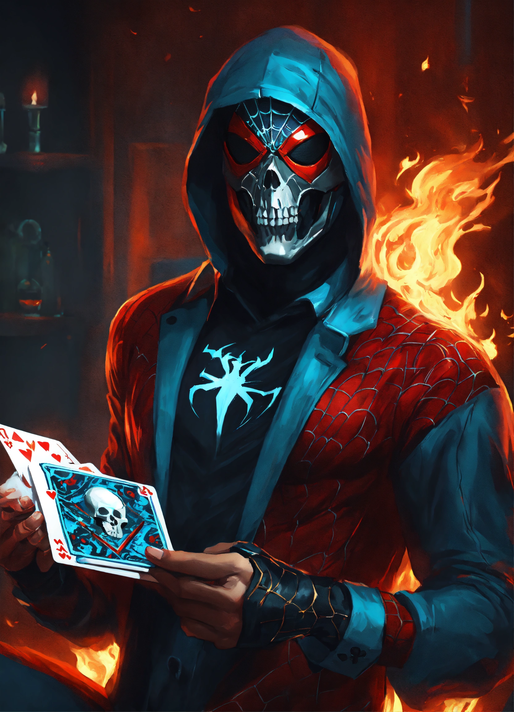 A spiderman with a skull face holding cards with flames in his hands, in the style of dark cyan and red, illustrative realism, gamercore, mysterious backdrops, 32k uhd, ferrania p30, vibrant realism