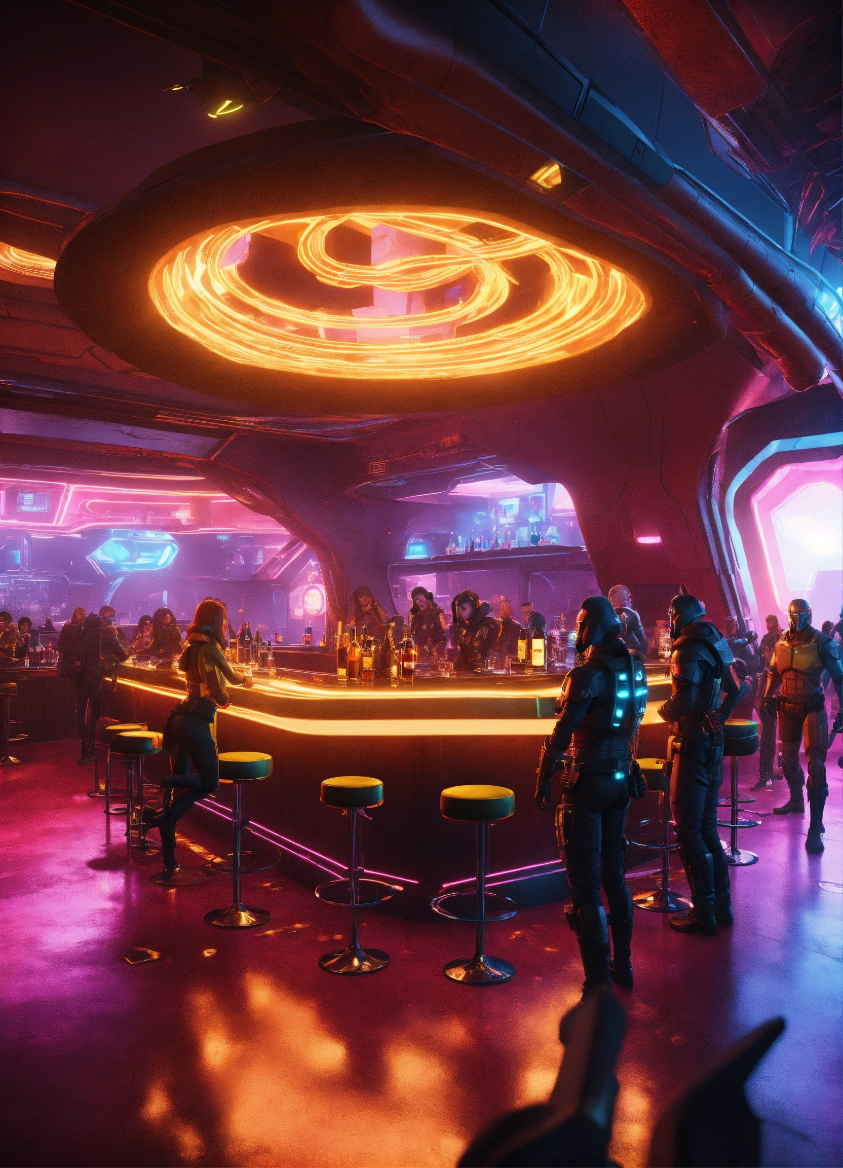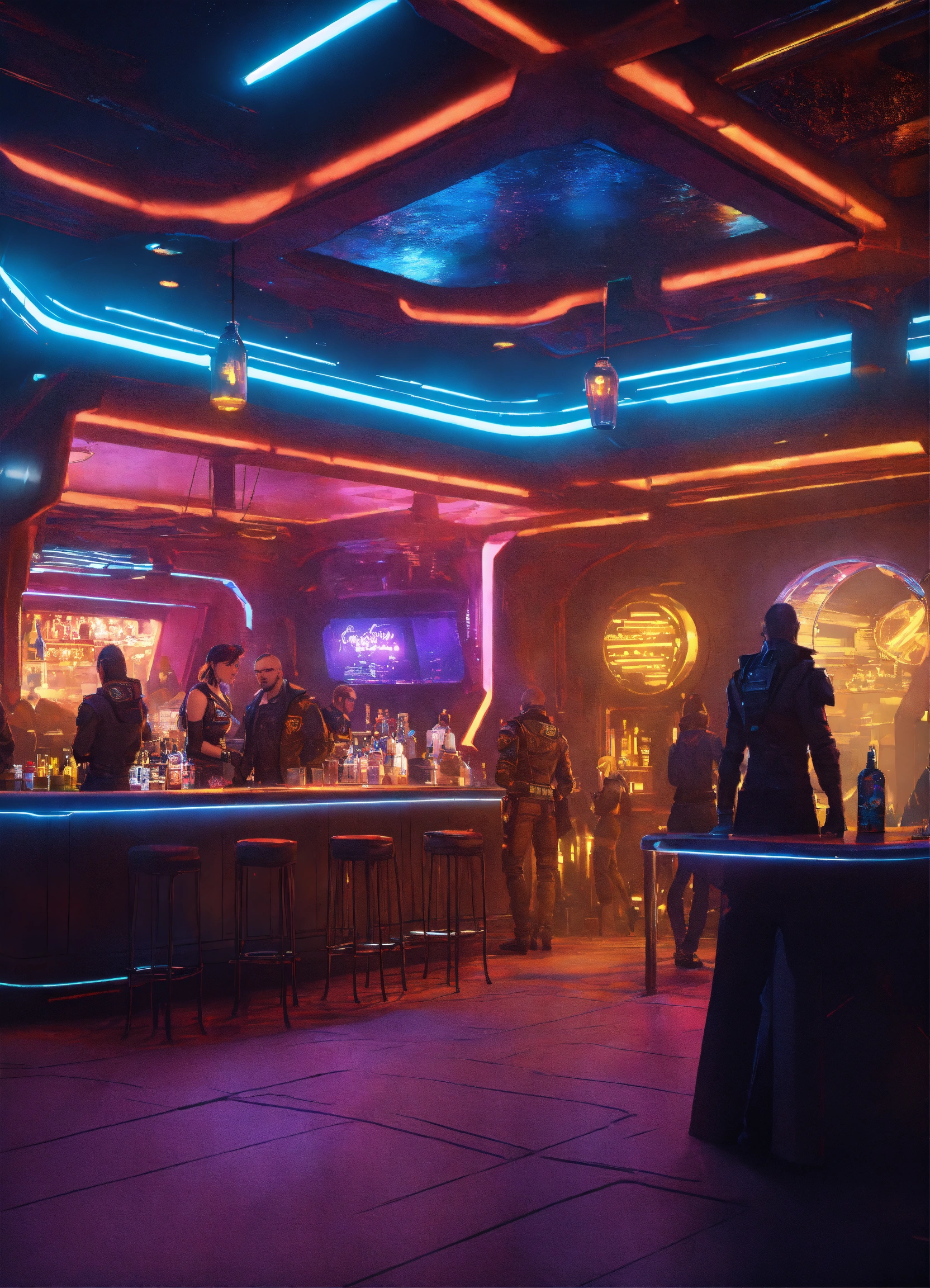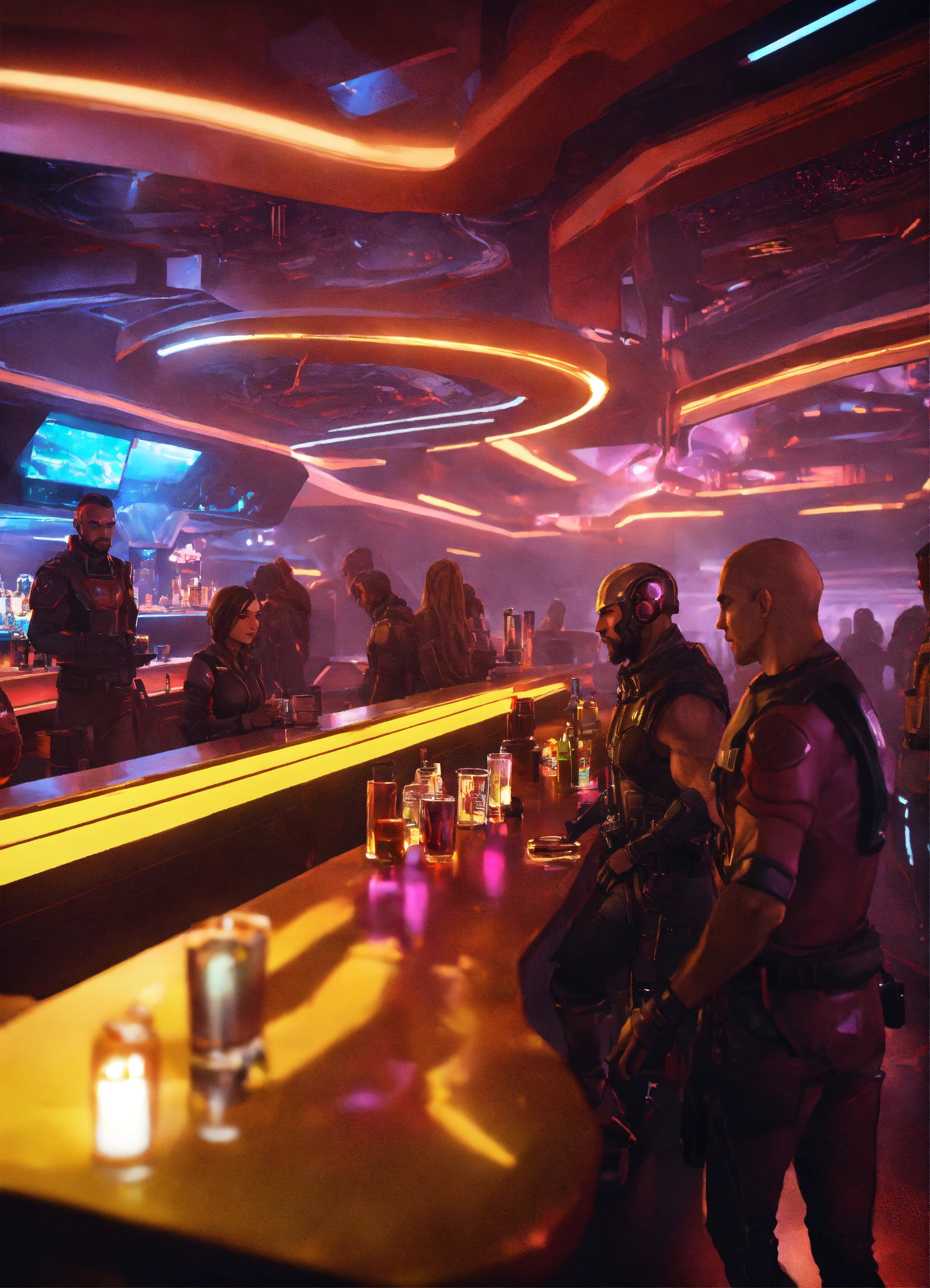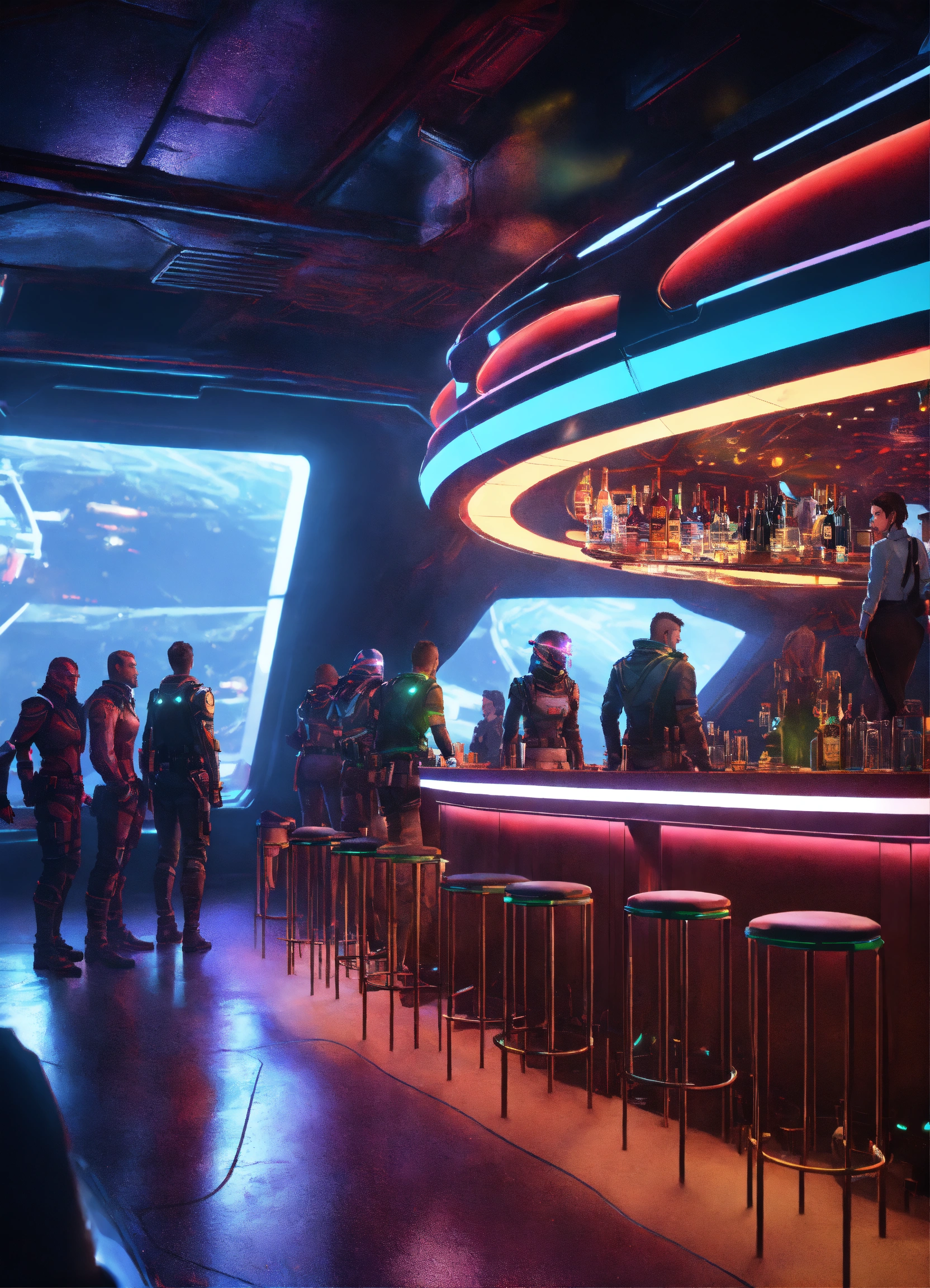 Seedy nightclub on a futuristic space port with rough neck looking people at bar, bounty hunters, mutants, aliens, realistic, 8k, unreal engine