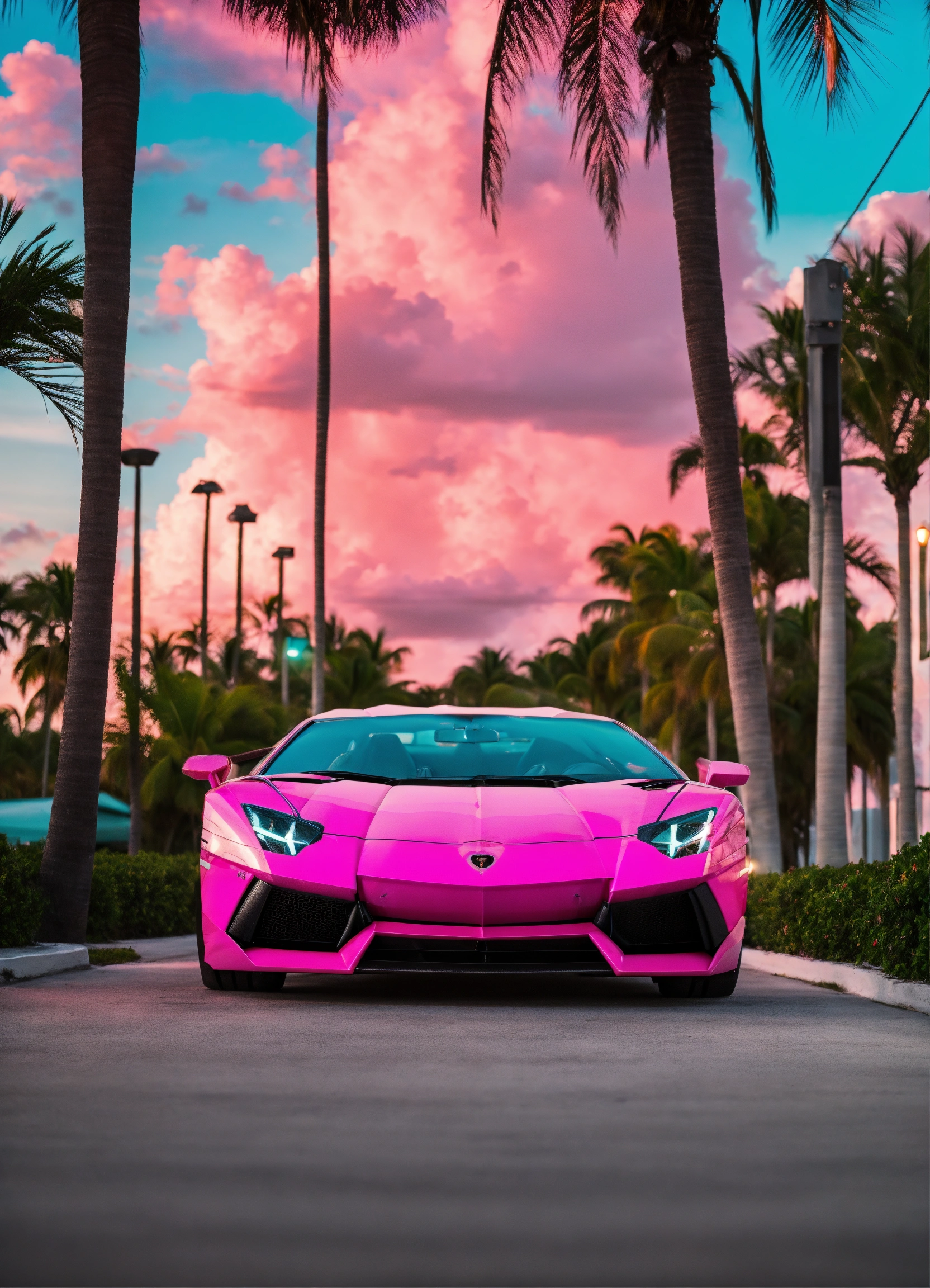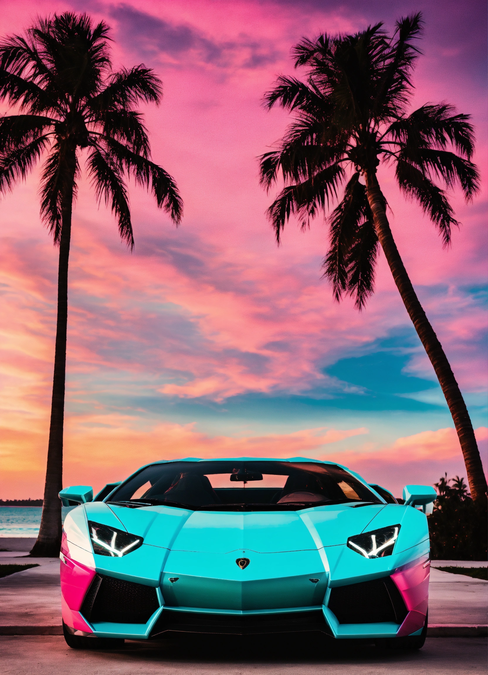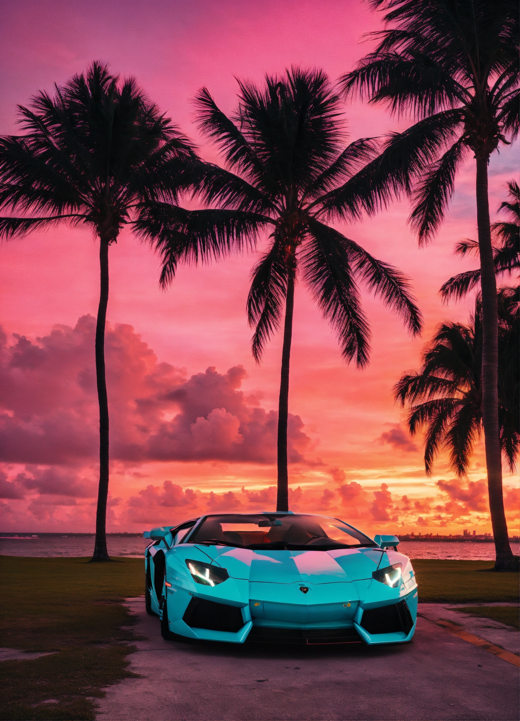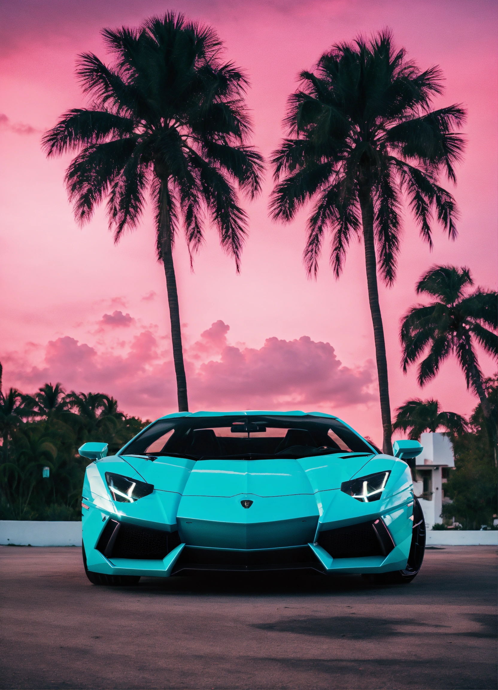 A tiffany blue lamborghini aventador front view in miami pink sky with palms and cloud