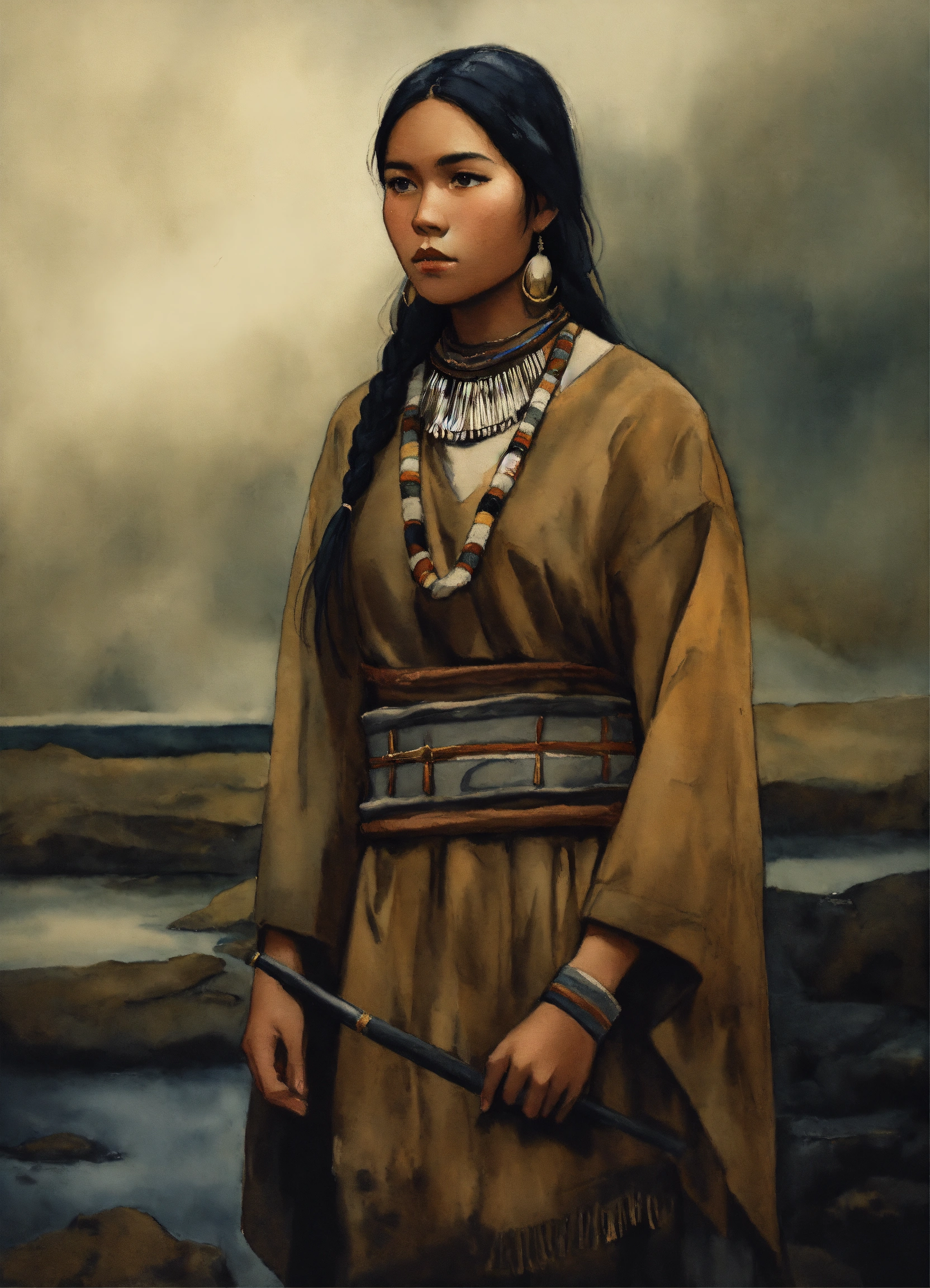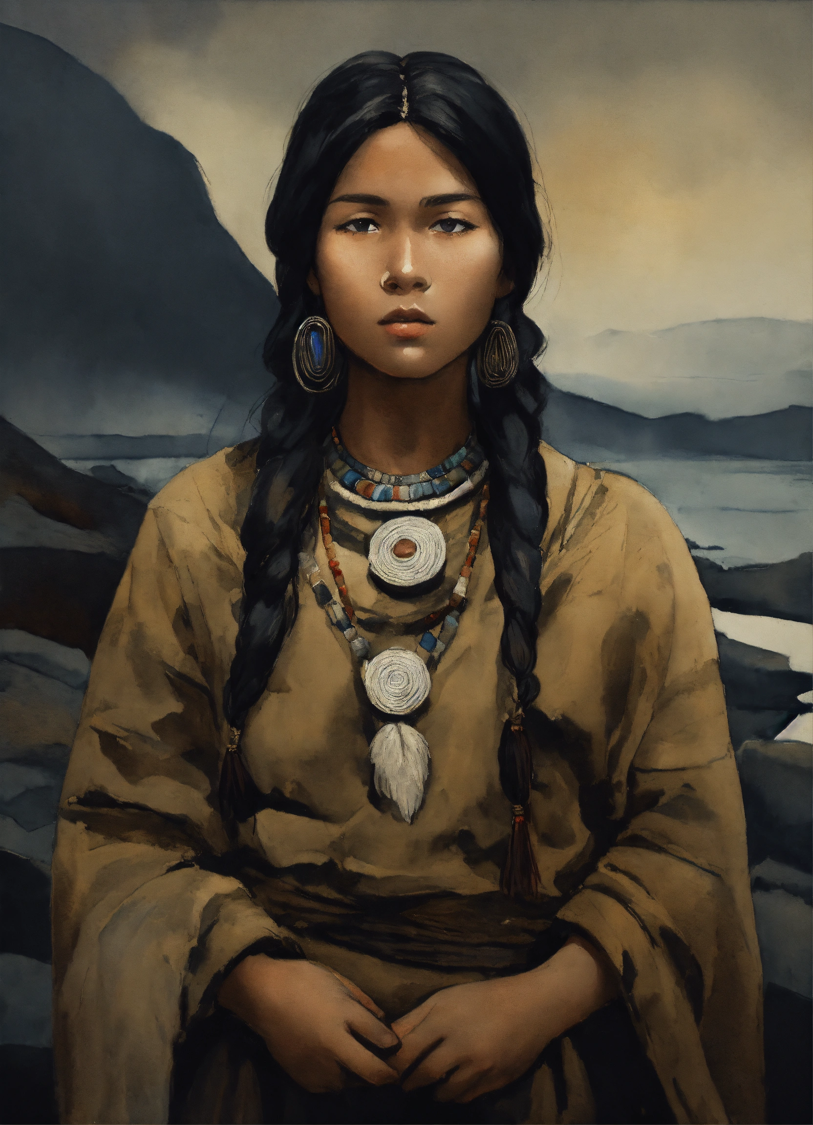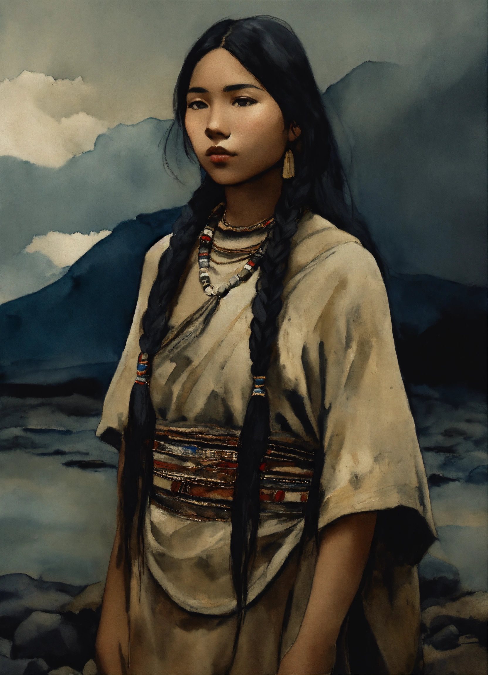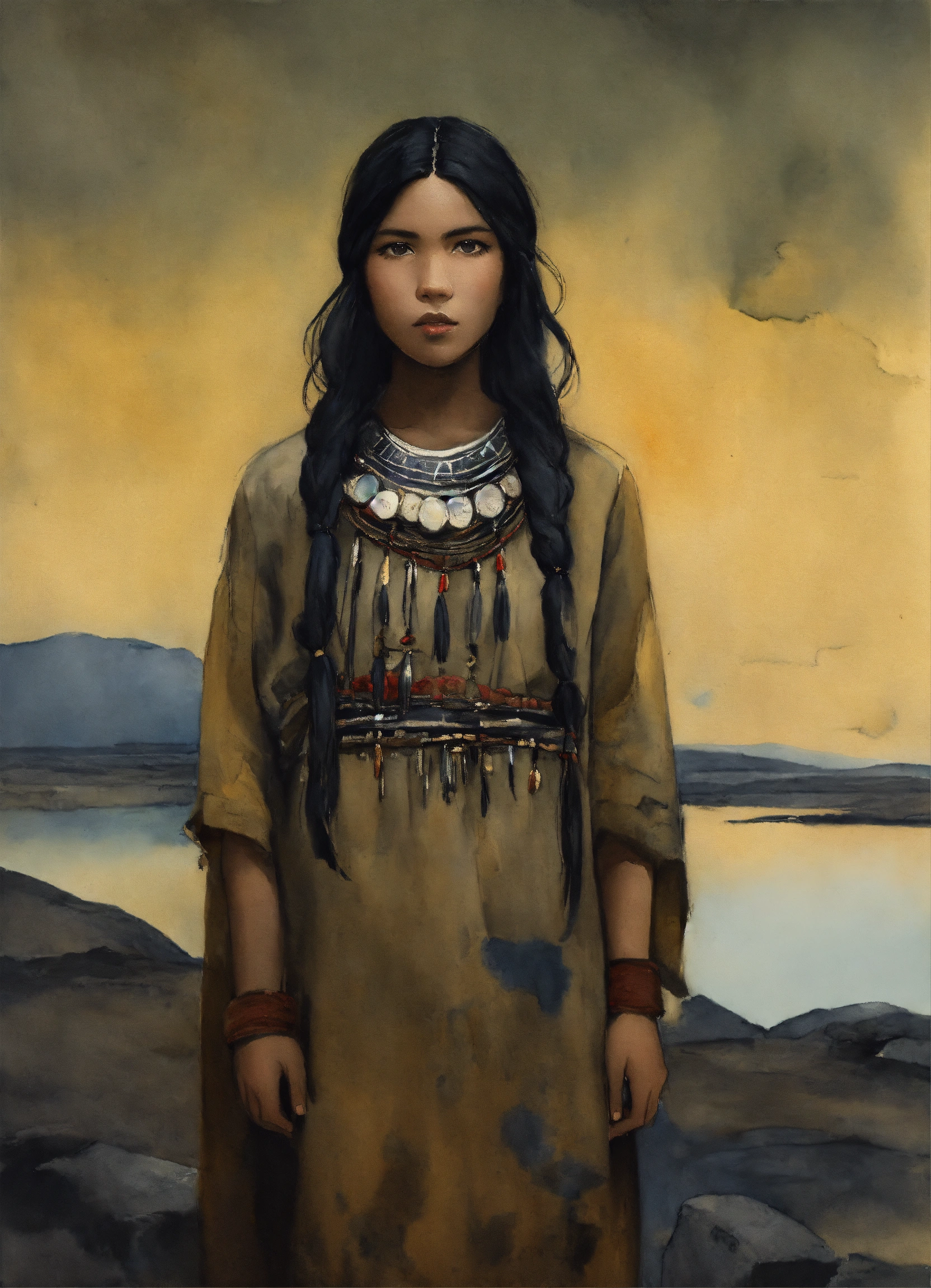 Illustration of a young inuit woman in the style of tom björklund. 18 years old, olive skin, black hair, aboriginal phenotype, paleolithic clothing, paleolithic indigenous adornments, full body. gloomy and depressing atmosphere. dark hues color palette, composition balance, watercolor painting, masterpiece, visual compellingness in the style of tom björklund.