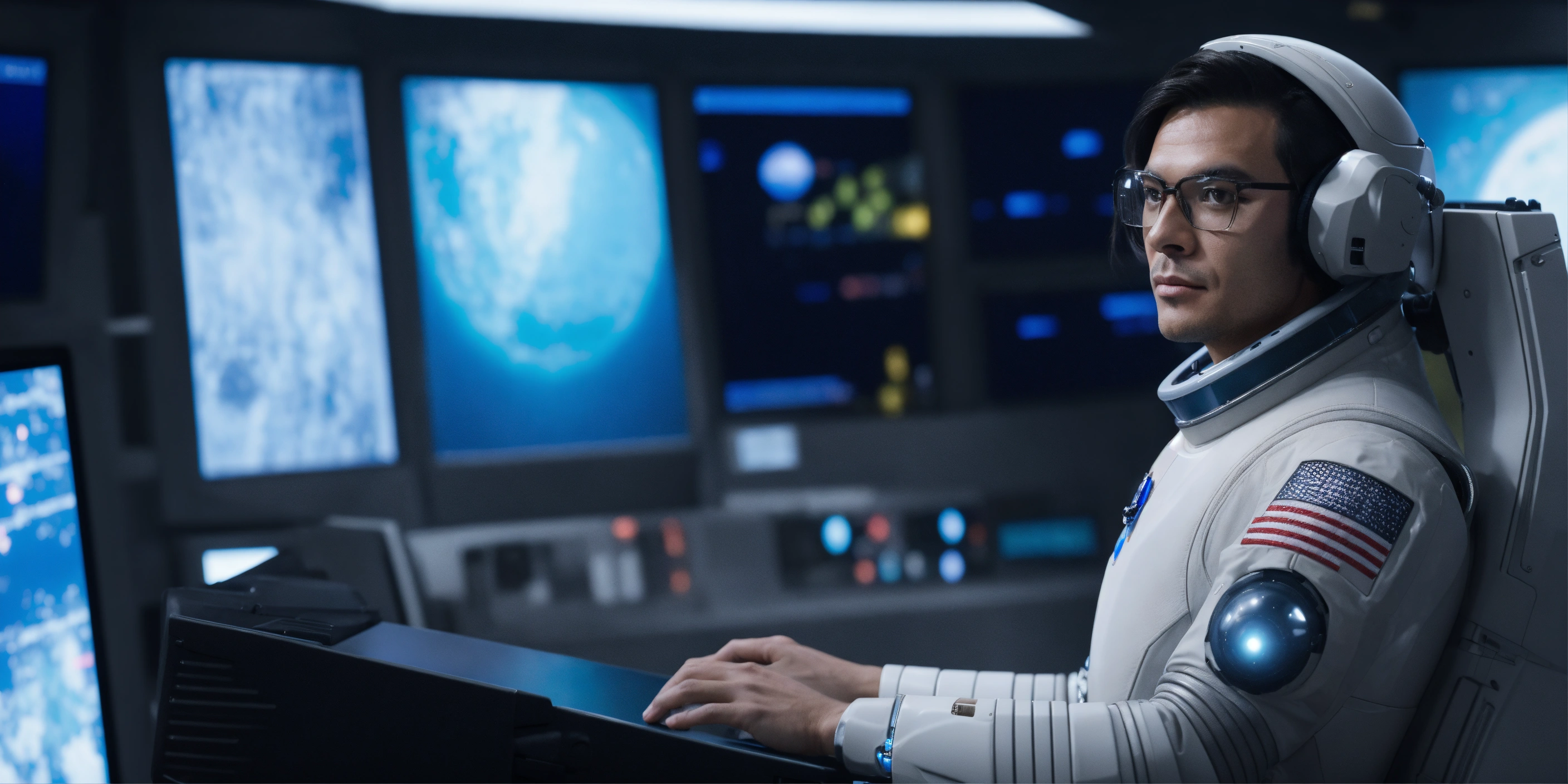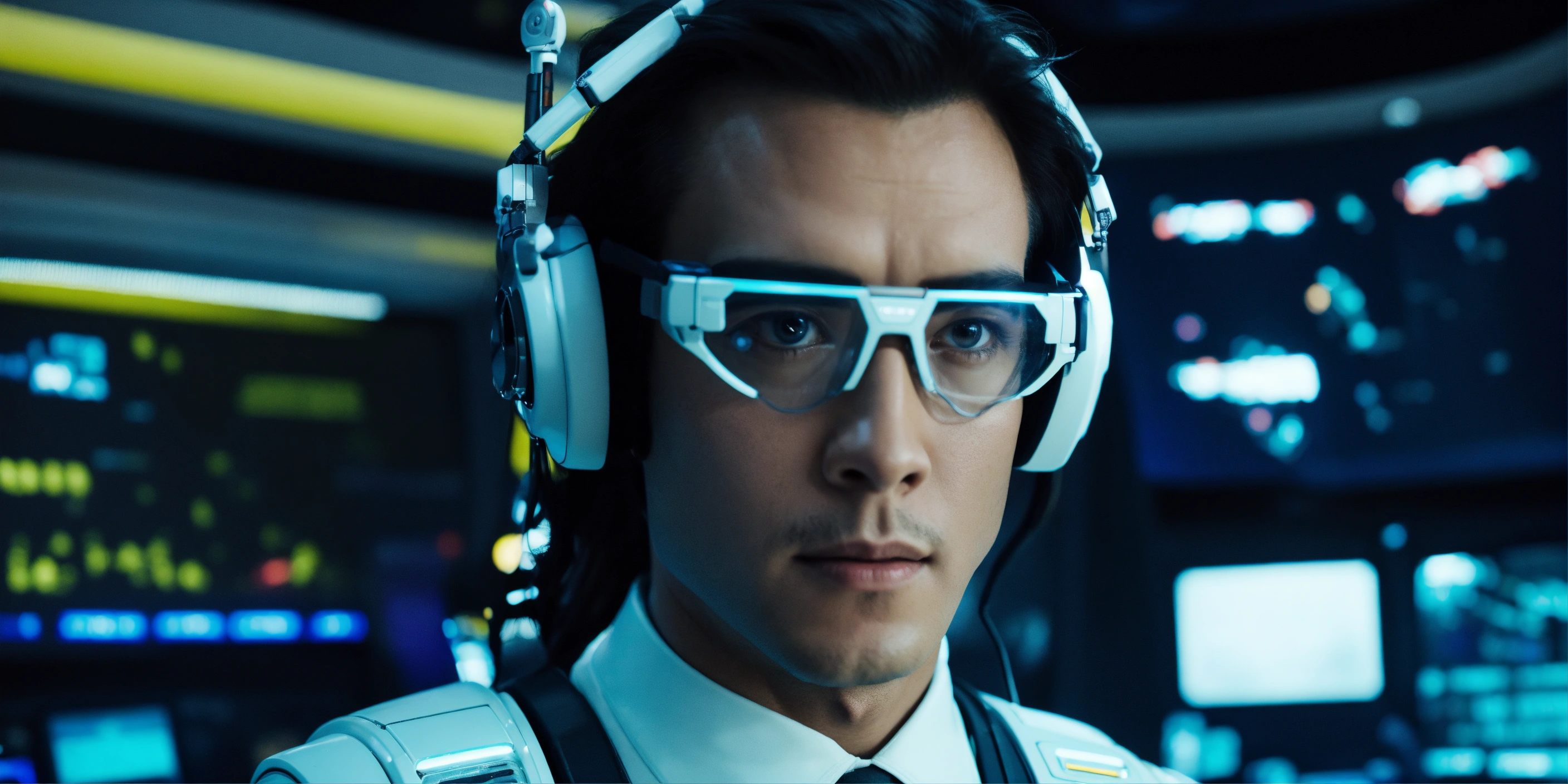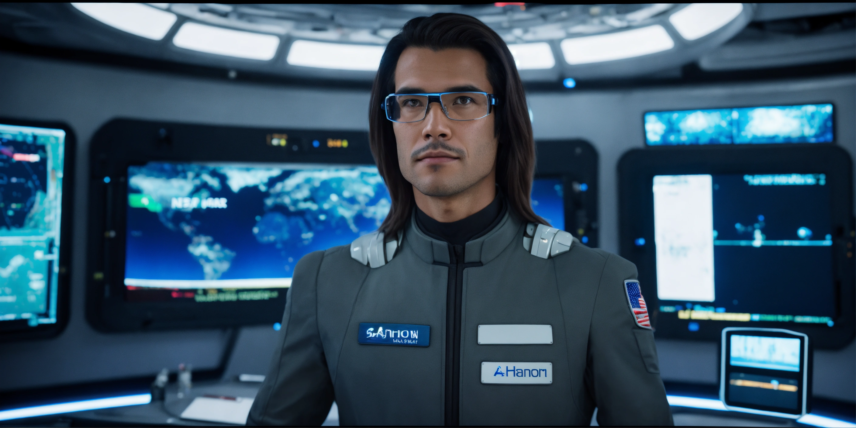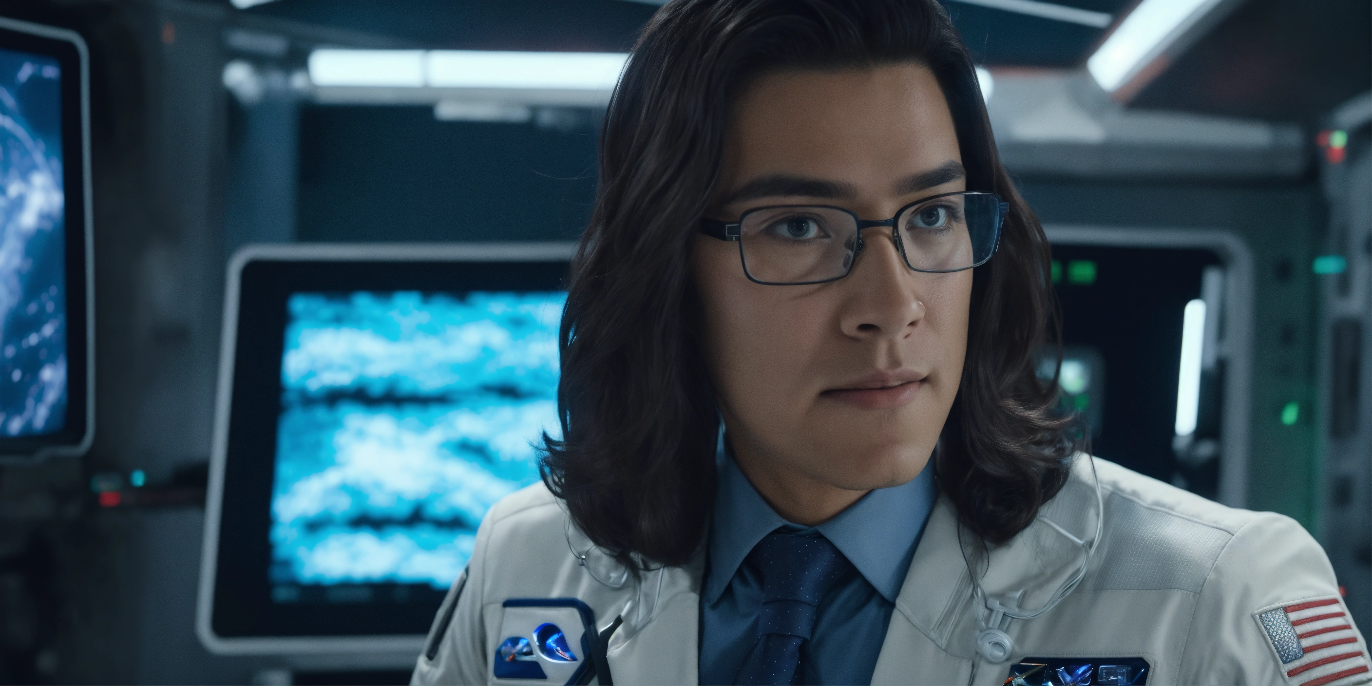 Space news anchor who is half-robot and half-human, with a face that closely resembles that of a typical human, wearing glasses. a professional news anchor working at a space station in the future. he has a unique appearance, long hair. pose look straight to camera angle medium close up