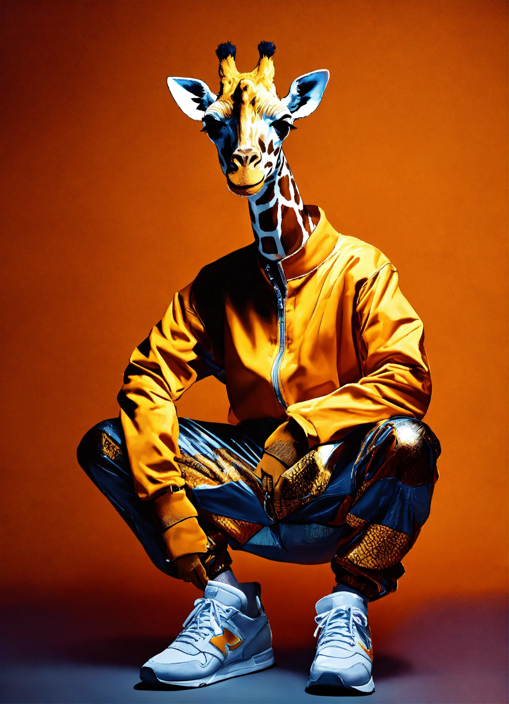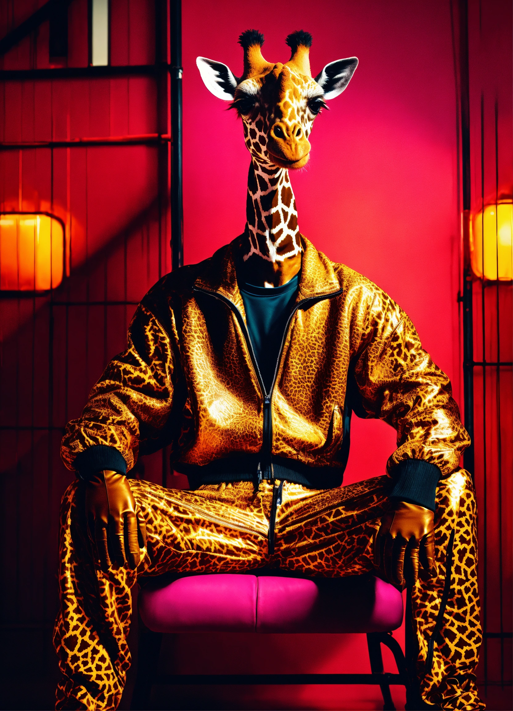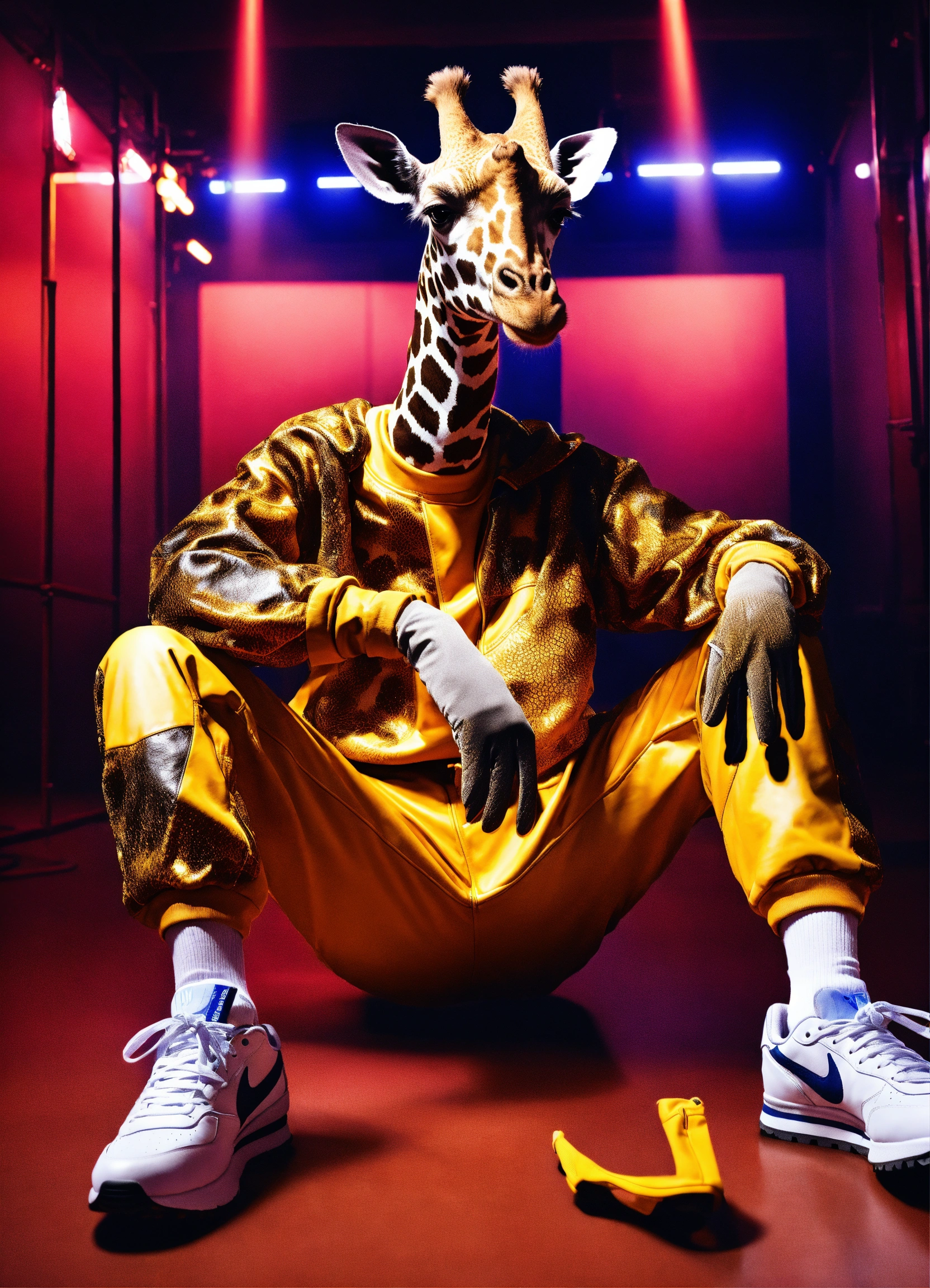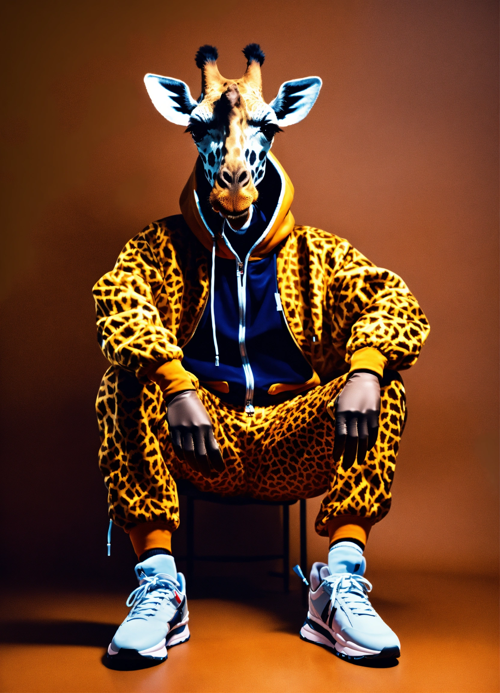 An extremely ultra-realistic photo-realistic giraffe rapper sits in a tracksuit and pants made from his own skin. in sneakers and leather gloves. volumetric lighting, maximalist photo illustration, 8k resolution concept art, intricately detailed, complex, expansive, fantastical.