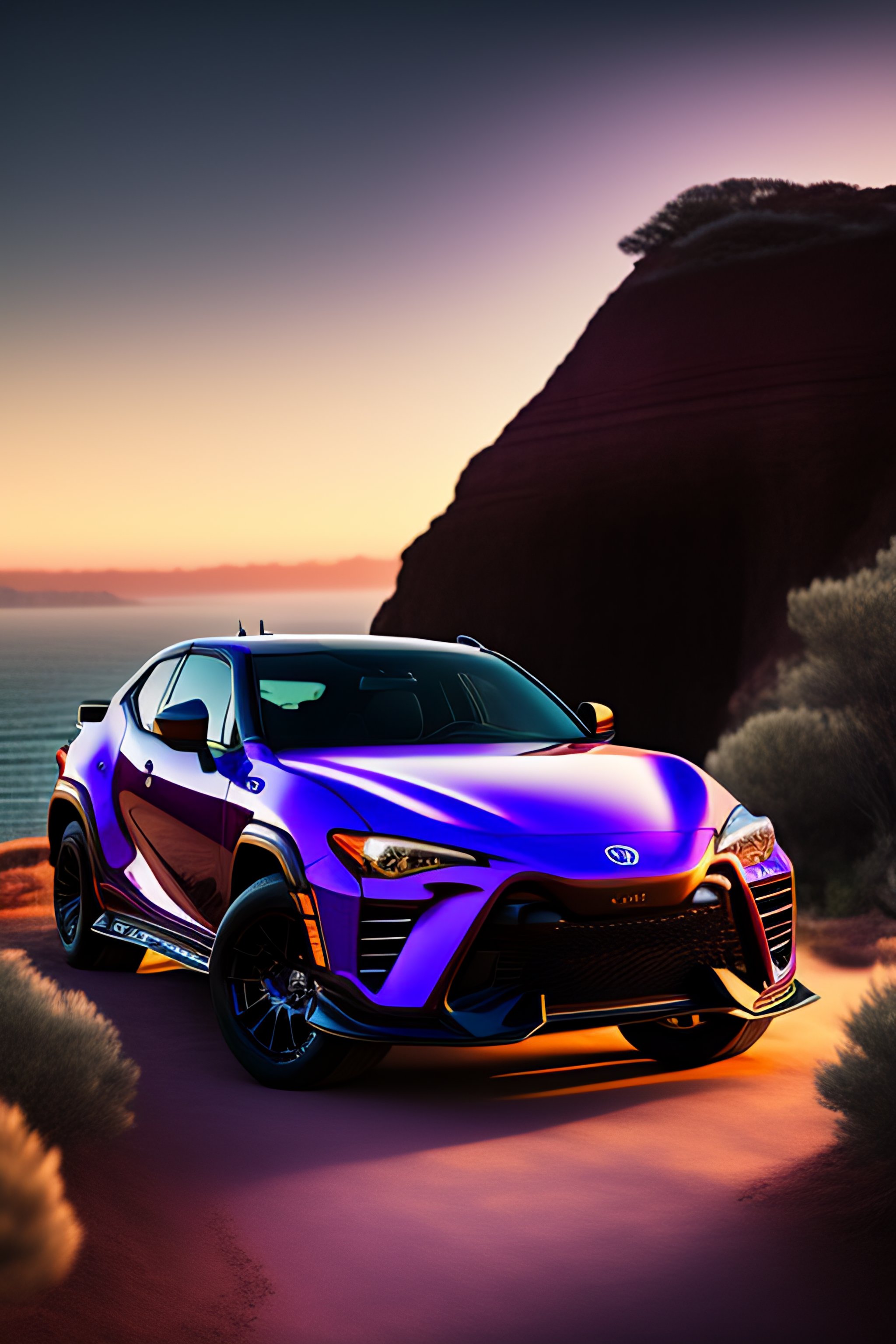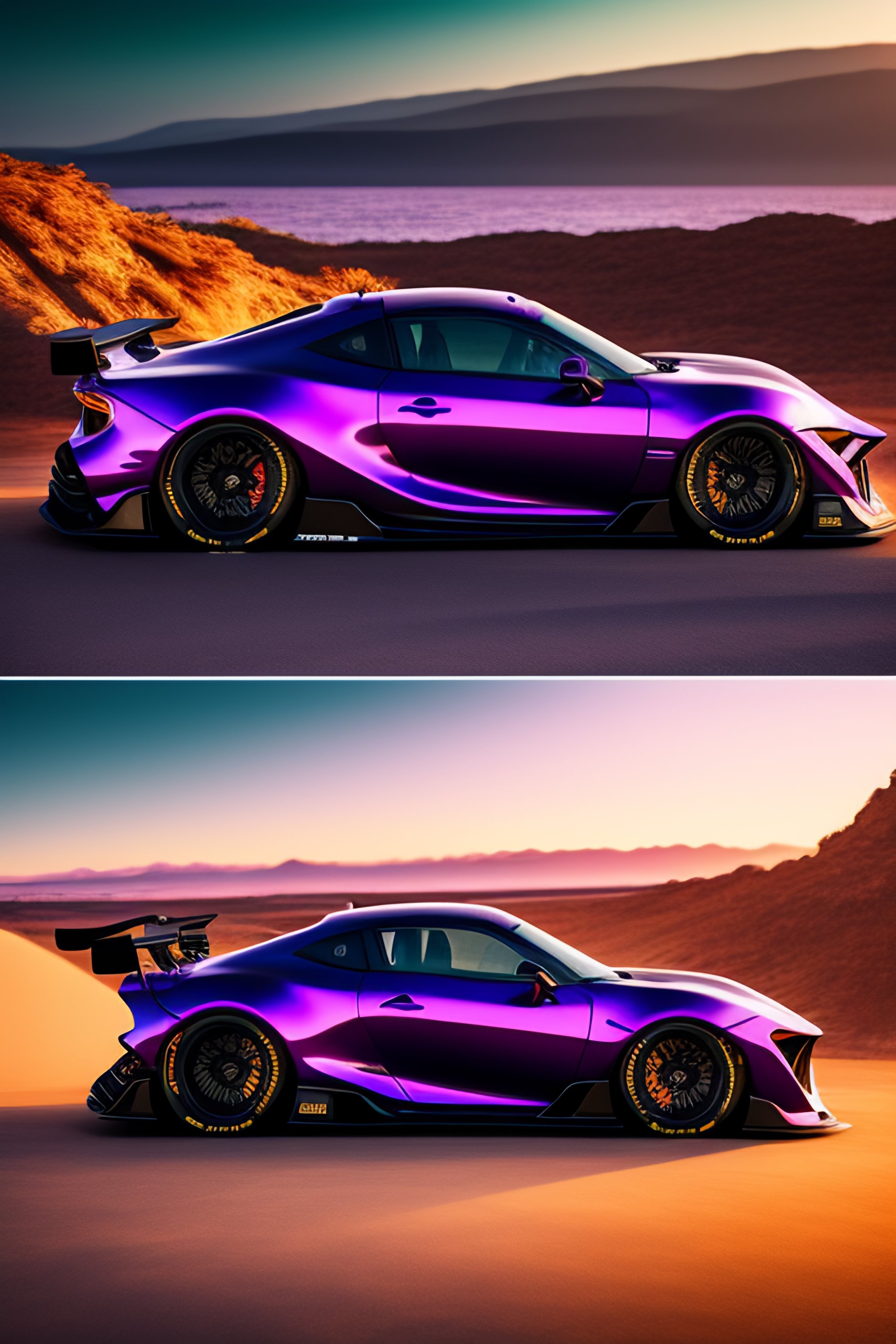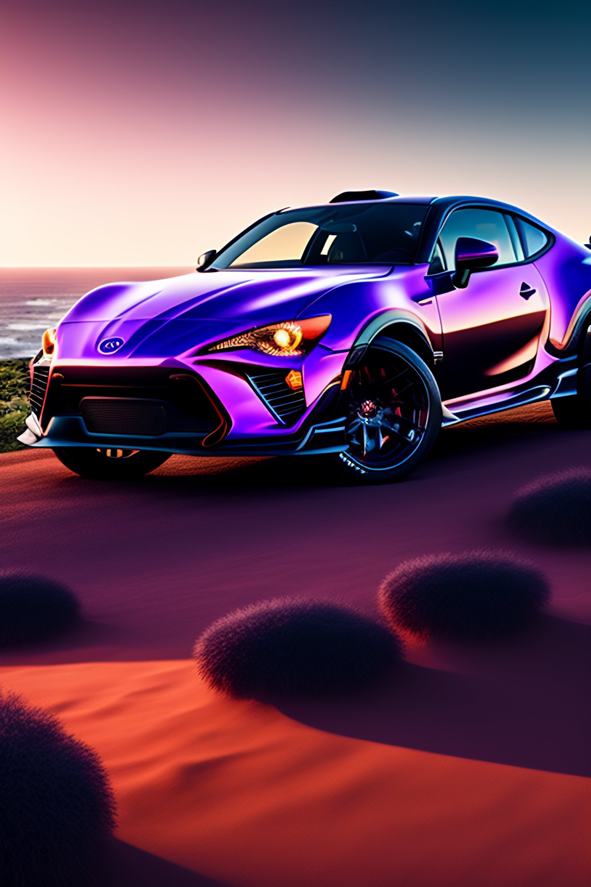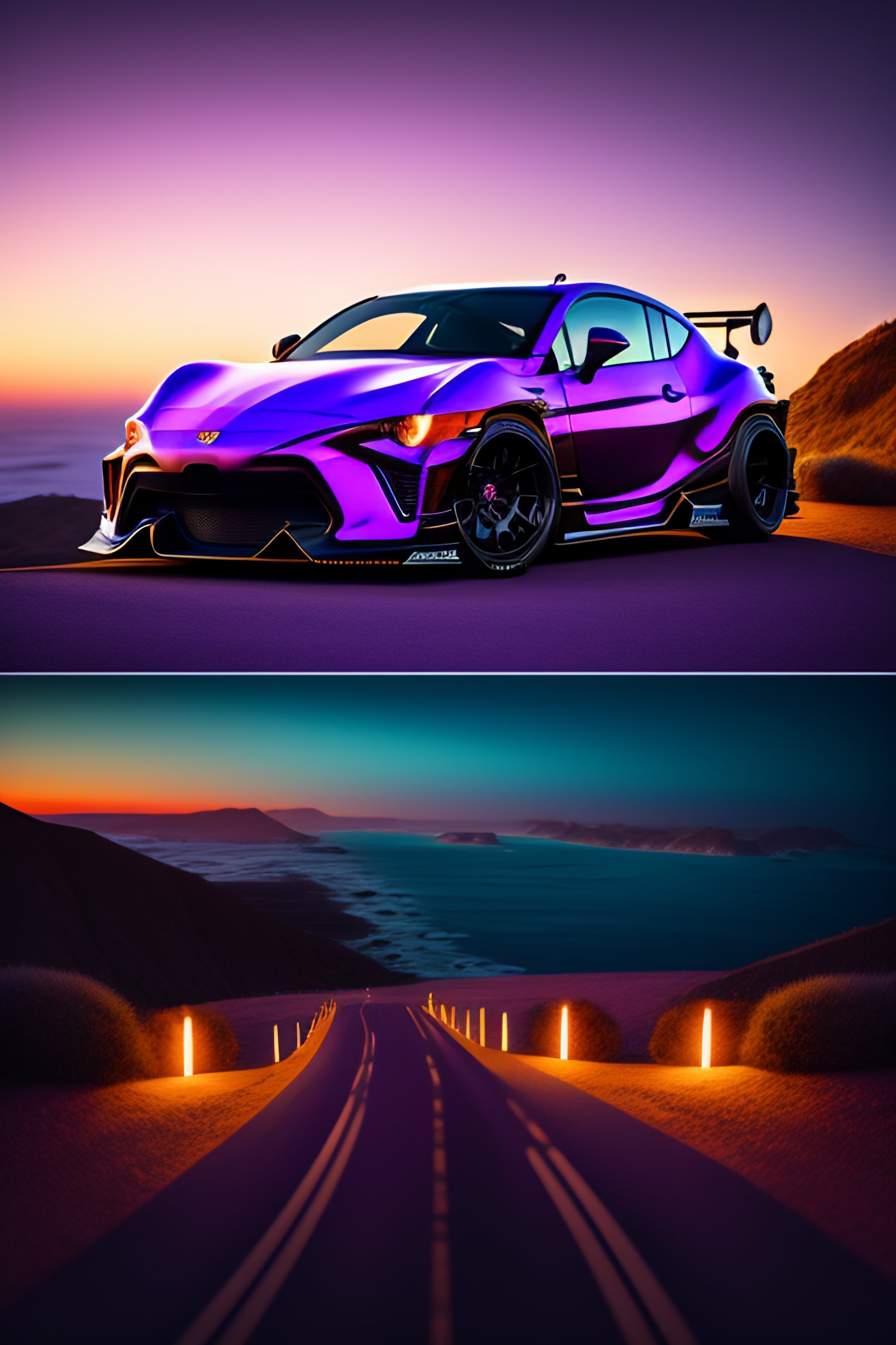 Midnight purple 2 2022 toyota gr86 with a widebody kit on a canyon drive at sunset overlooking the ocean, photorealistic render, 16k, trending on artstation, center focus, rule of thirds, octane render, volumetric lighting