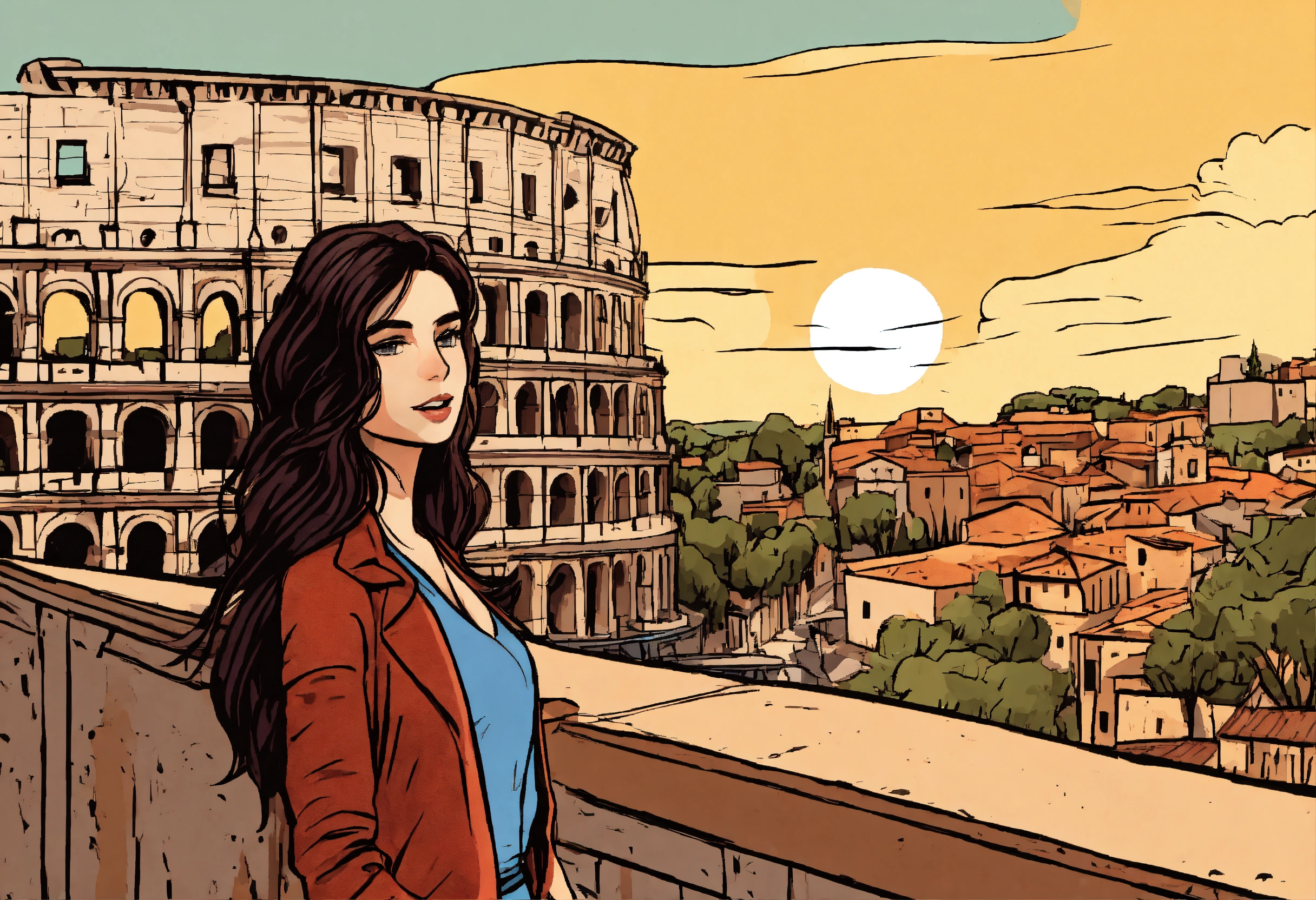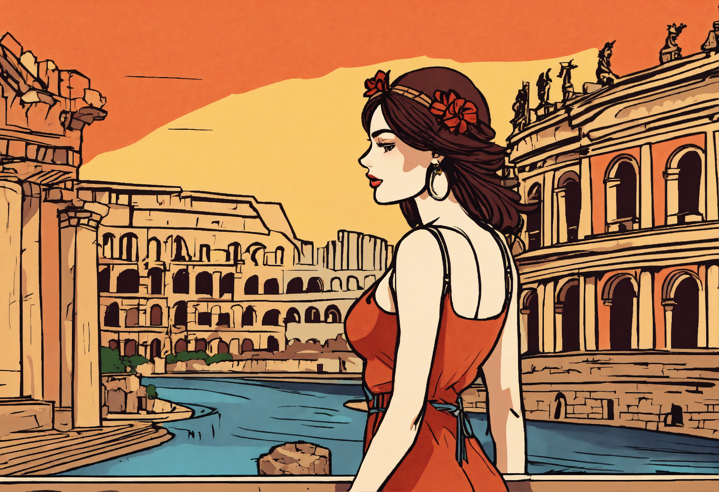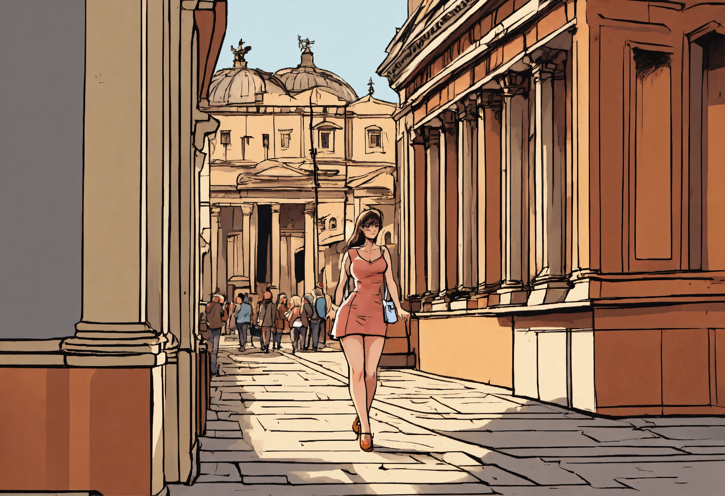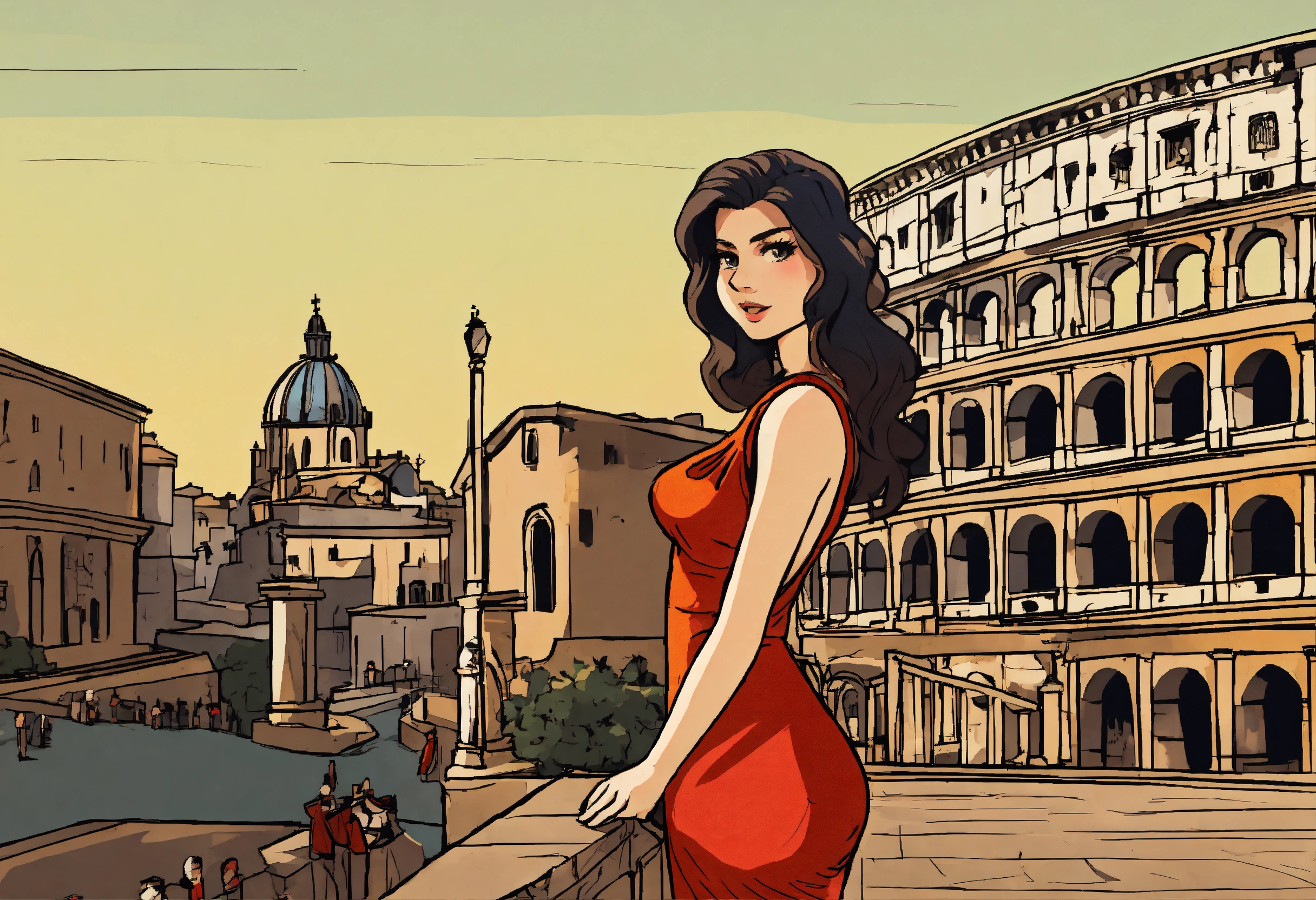 A european comic style hand drawn cartoon of a hot girl standing in rome