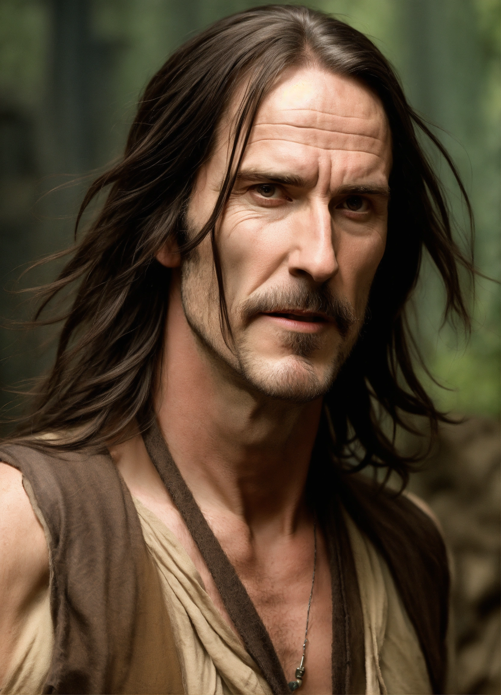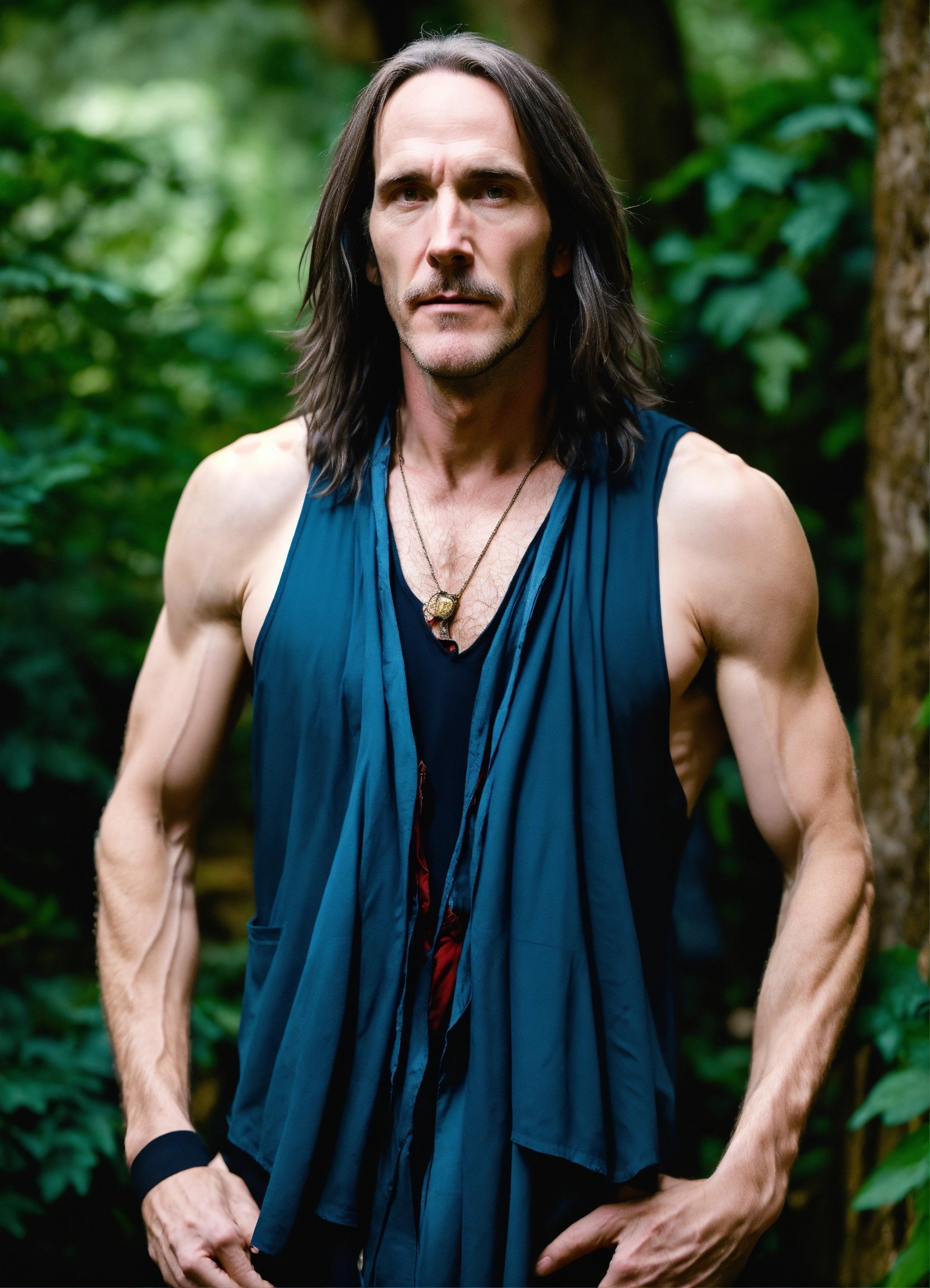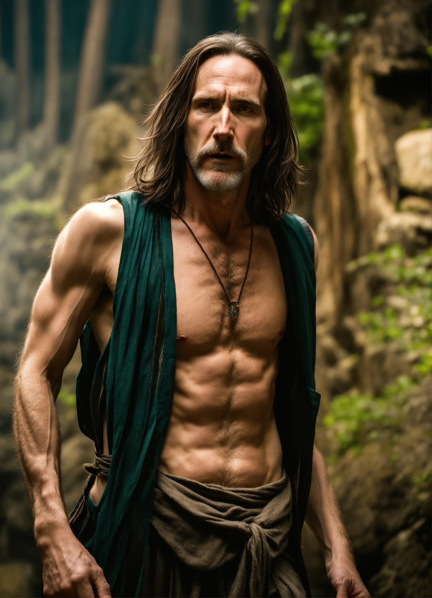 In photographic style matt mercer as a tall long distance runner with long straight graying hair as a hermit madman, matt mercer is older wrinkled now but still lithe elegant gaunt features, thin wiry arms, hairy chest, long sleeveless vest, open shirt, with a very insane look on his face