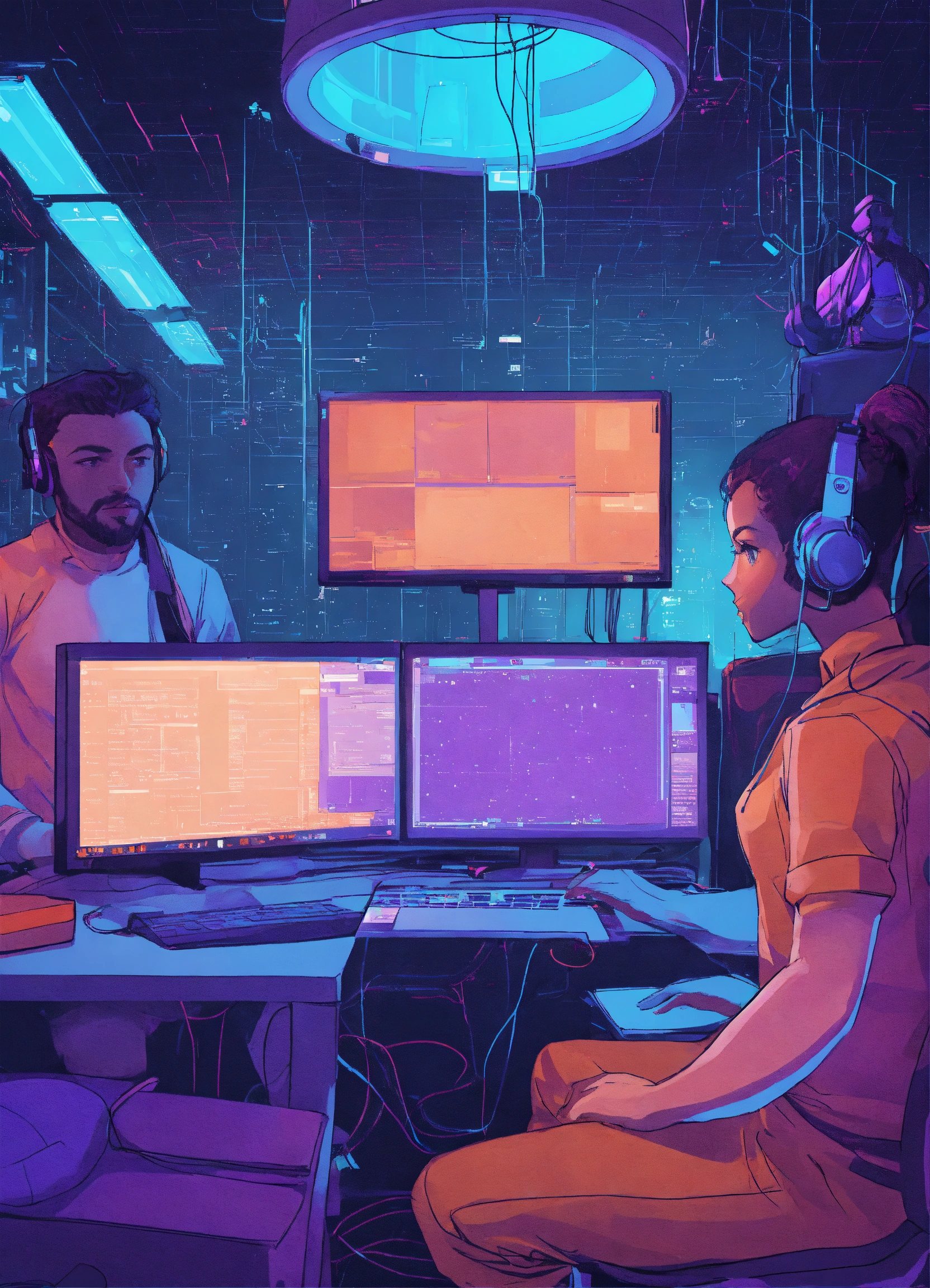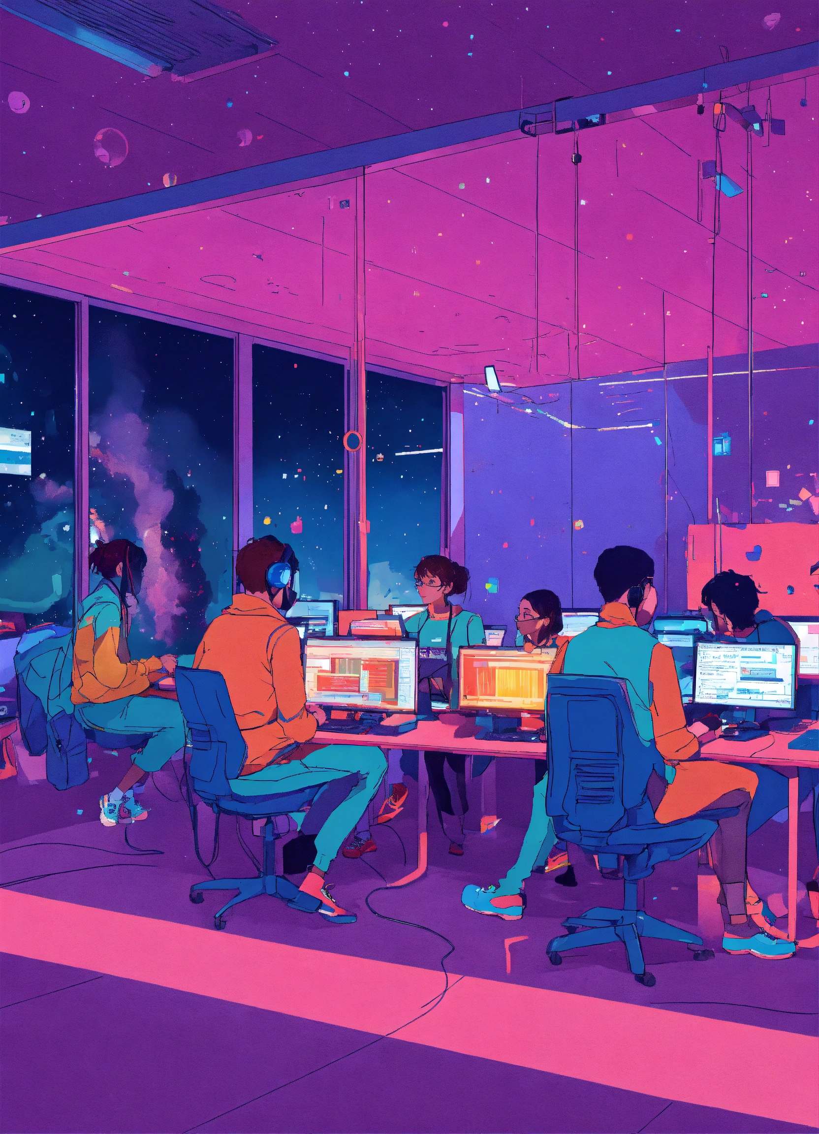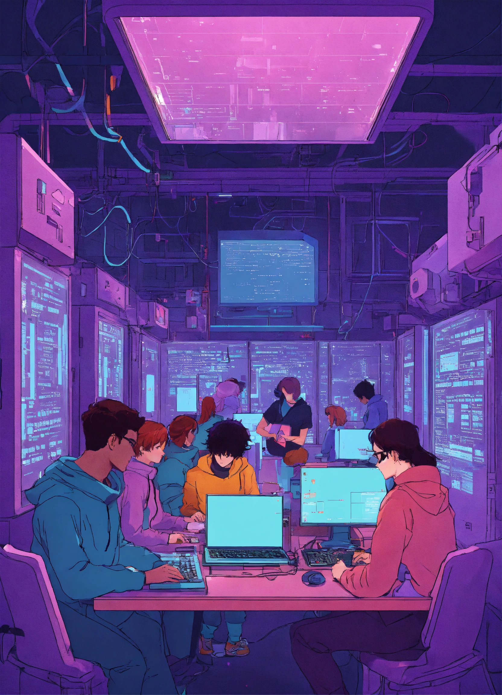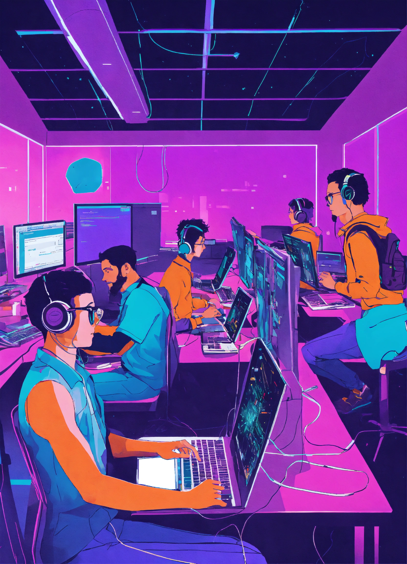 5 personnes entrain de coder sur des ordinateurs dans un espace violet et bleu