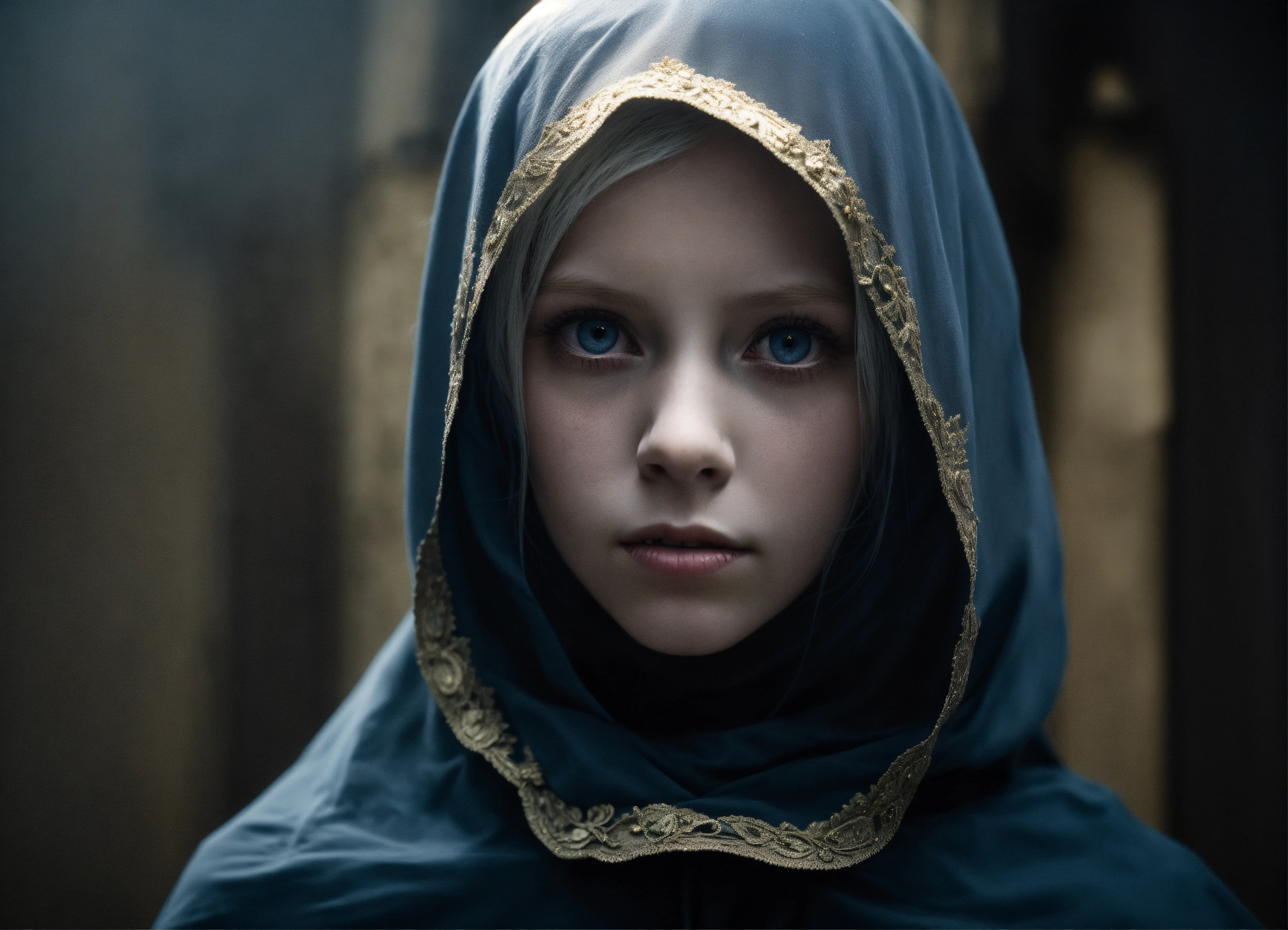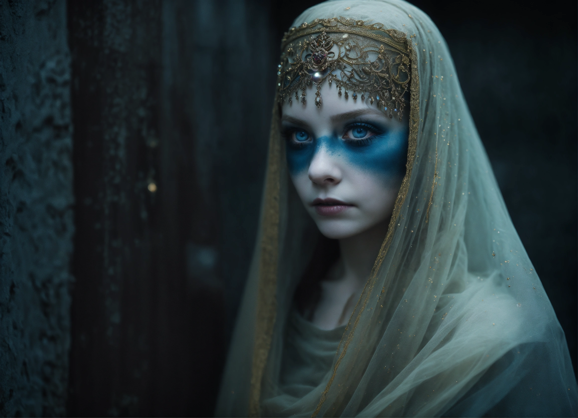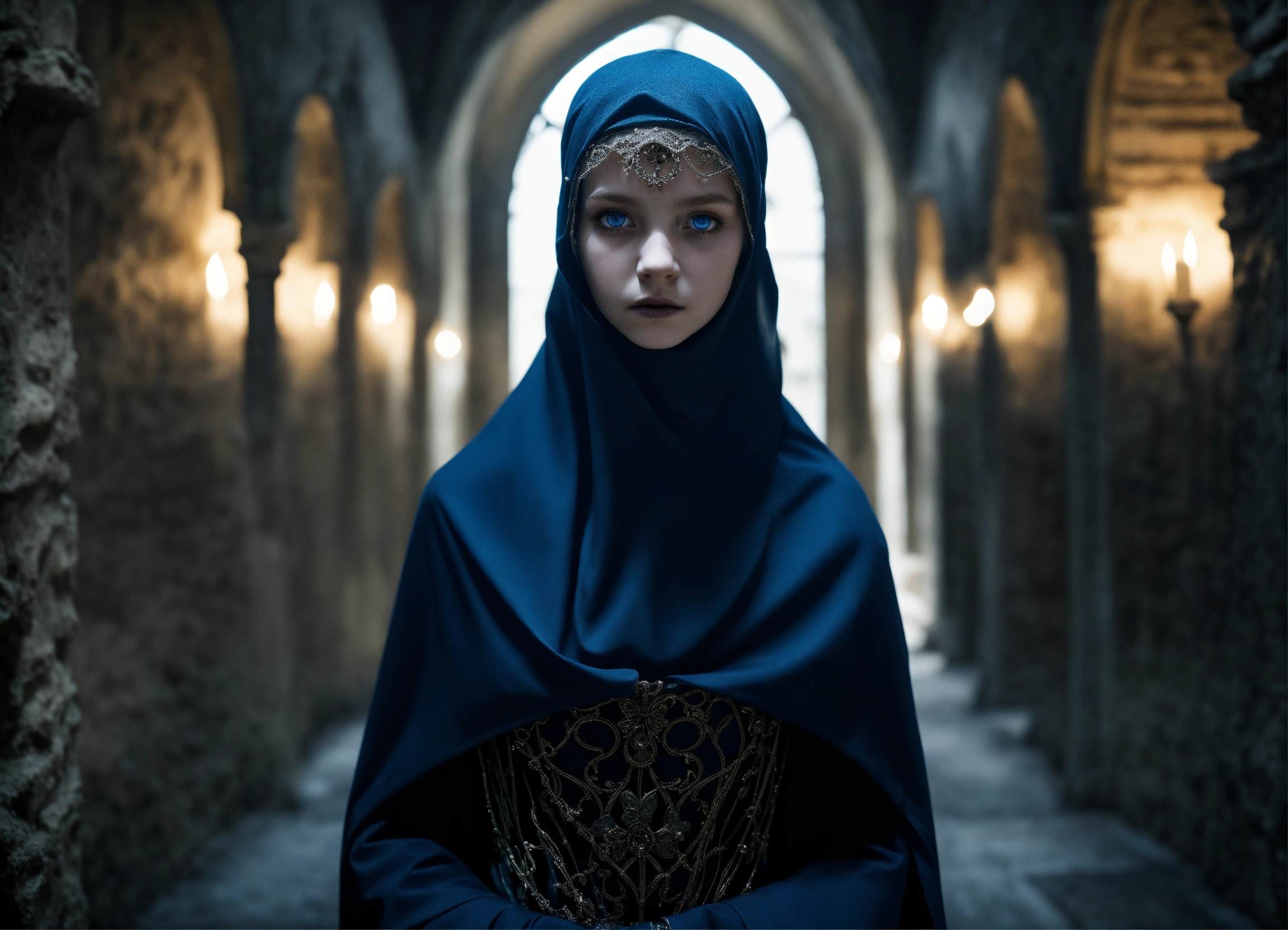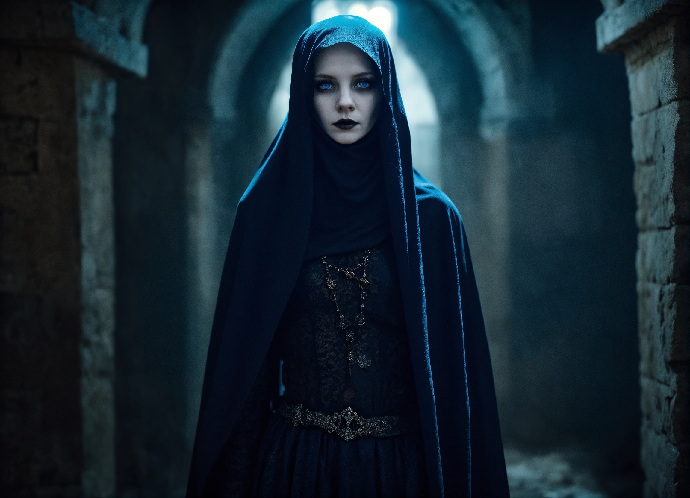 Body portrait of a very childish deadly pale extremely slim twelve year old female child, she is a goth necromancer with waist long silverwhite hair, niqab, face veil, extremely flat belly, extremely skinny, extremely slim body, emaciated body, completely emaciated, extremly narrow face, alabaster skin, pale as a corpse, glowing blue eyes, slim face, innocent looking, in a gloomy crypt, lasziv, kindlich, unschuldig, childlike, graceful, wispy, glowing blue eyes, ghostly, dead, evil, demonic, undead, darkness, grotesque, mysterious, dark, cold ambient lighting, extremely detailed, fantasy, medieval setting