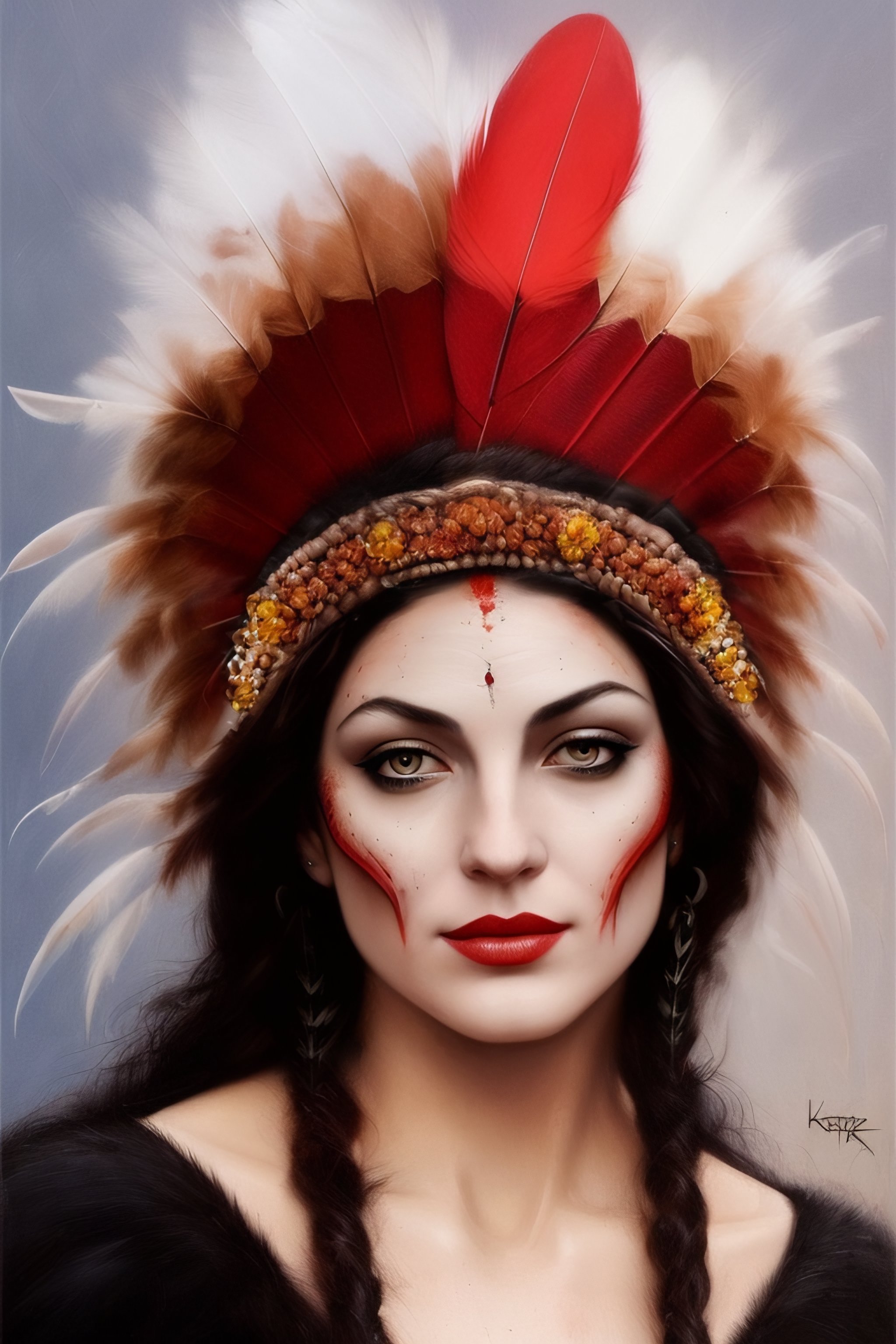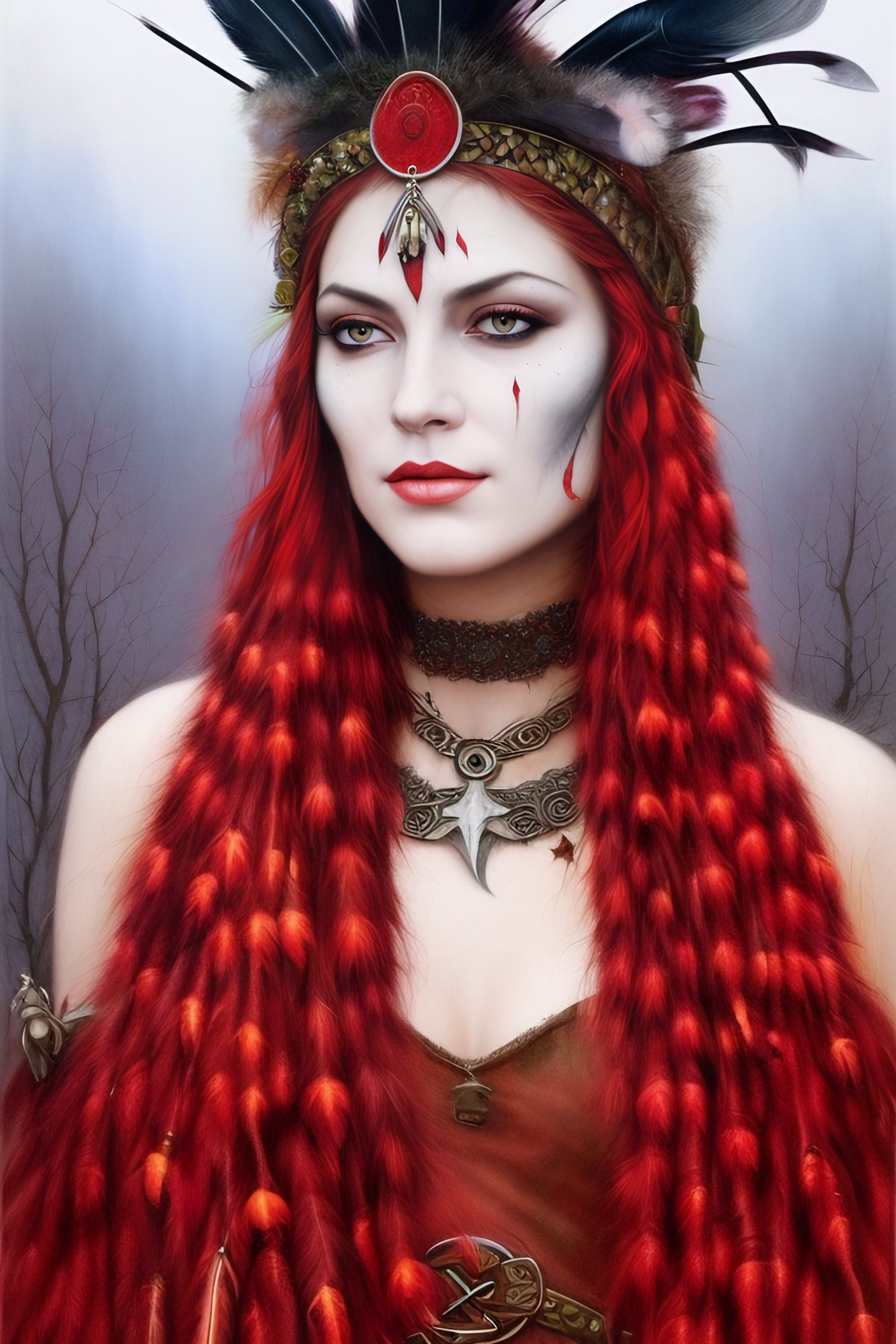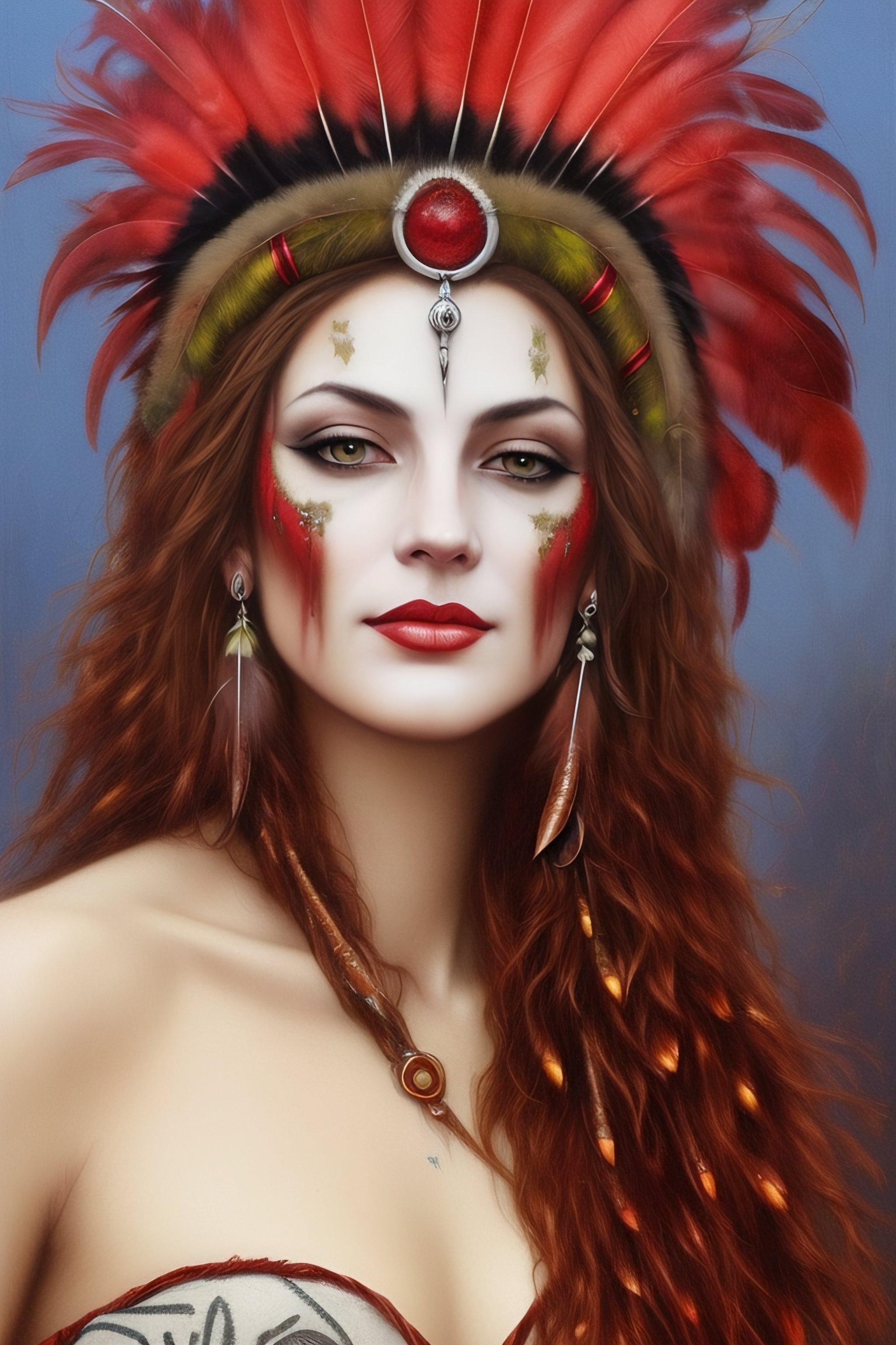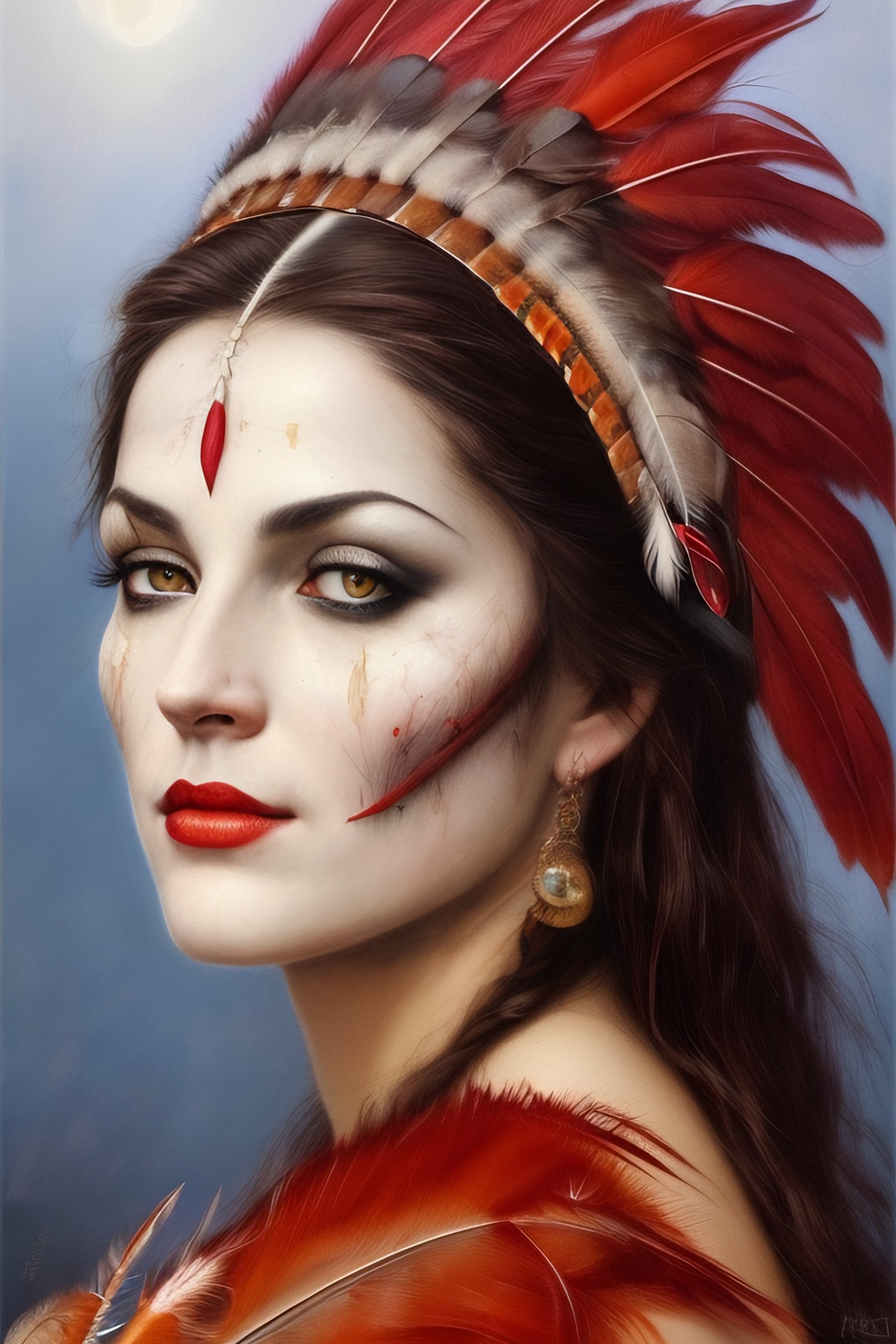 A female pagan witch with feather headdress and red paint smearred face by karol bak and vargas, photorealistic detailed eyes, autumm, fantasy, highly detailed, digital painting, 4 k, hdr, concept art, smooth, sharp focus, illustration, art by artgerm