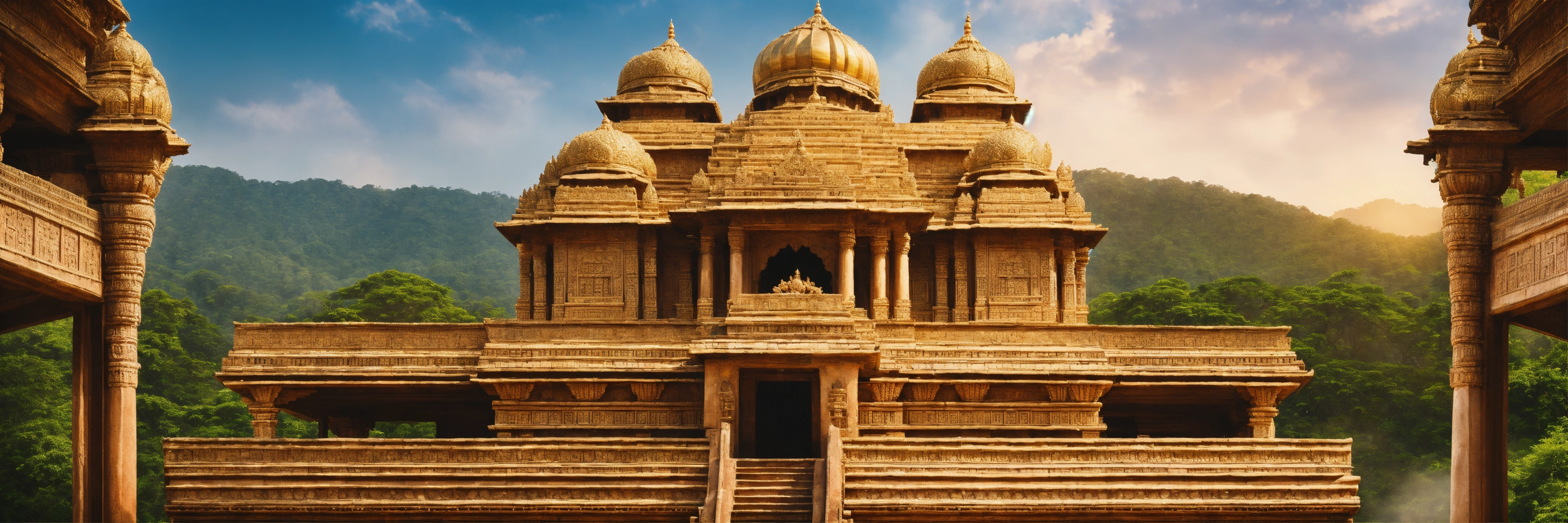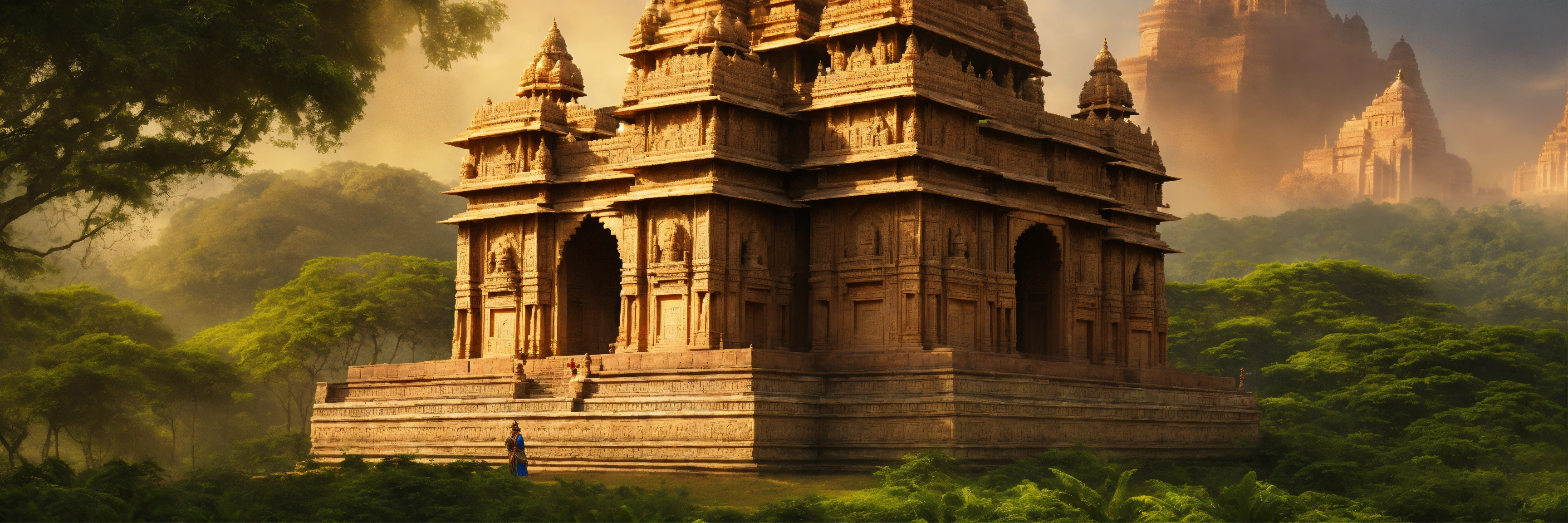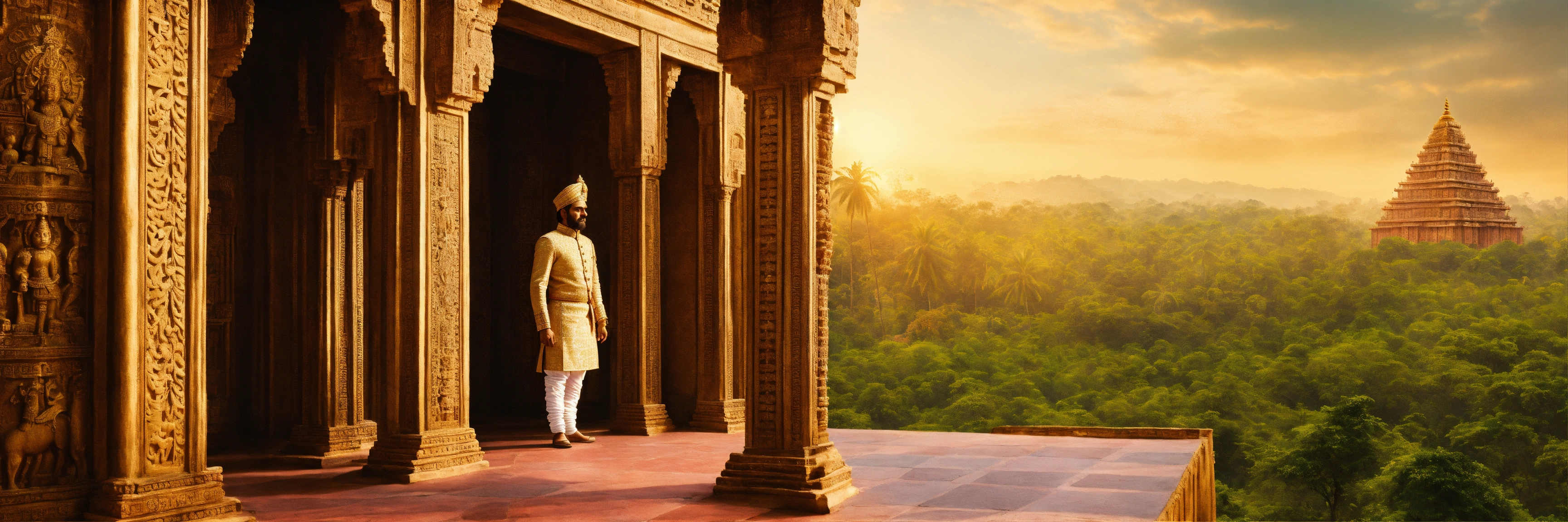 A majestic indian king stands tall in front of a grand temple, surrounded by lush green forests. the intricate carvings on the temple walls depict the rich history and culture of the land, while the king's regal attire and commanding presence exude power and authority, detailed, 16k, focused, extreme details, super resolution, cinematic, masterpiece.