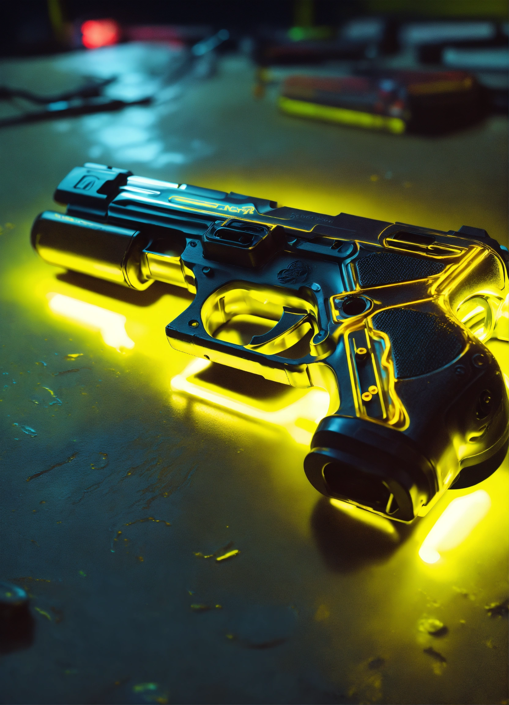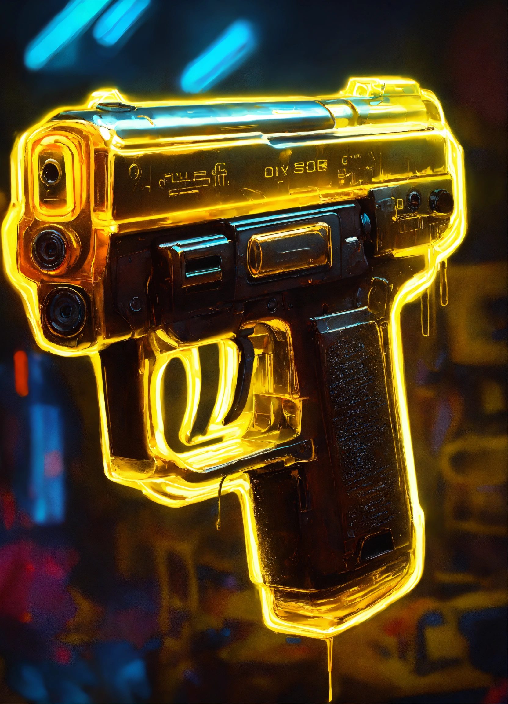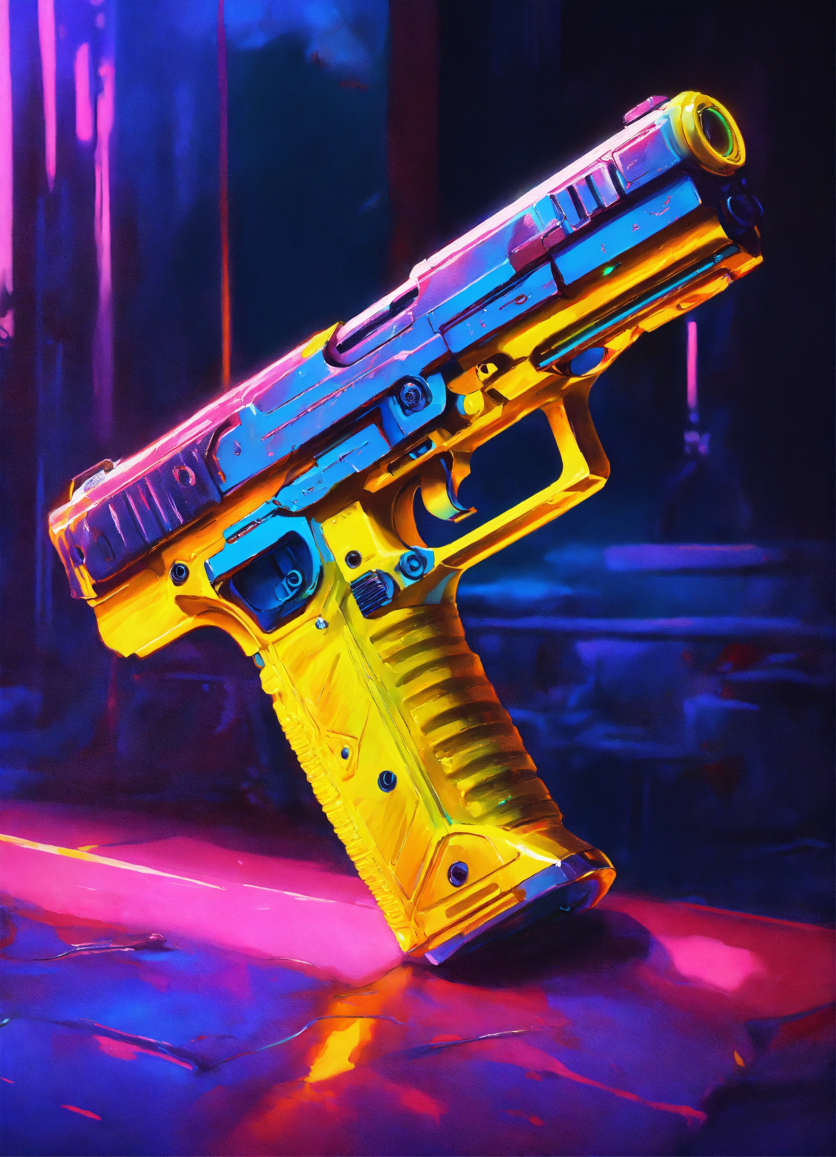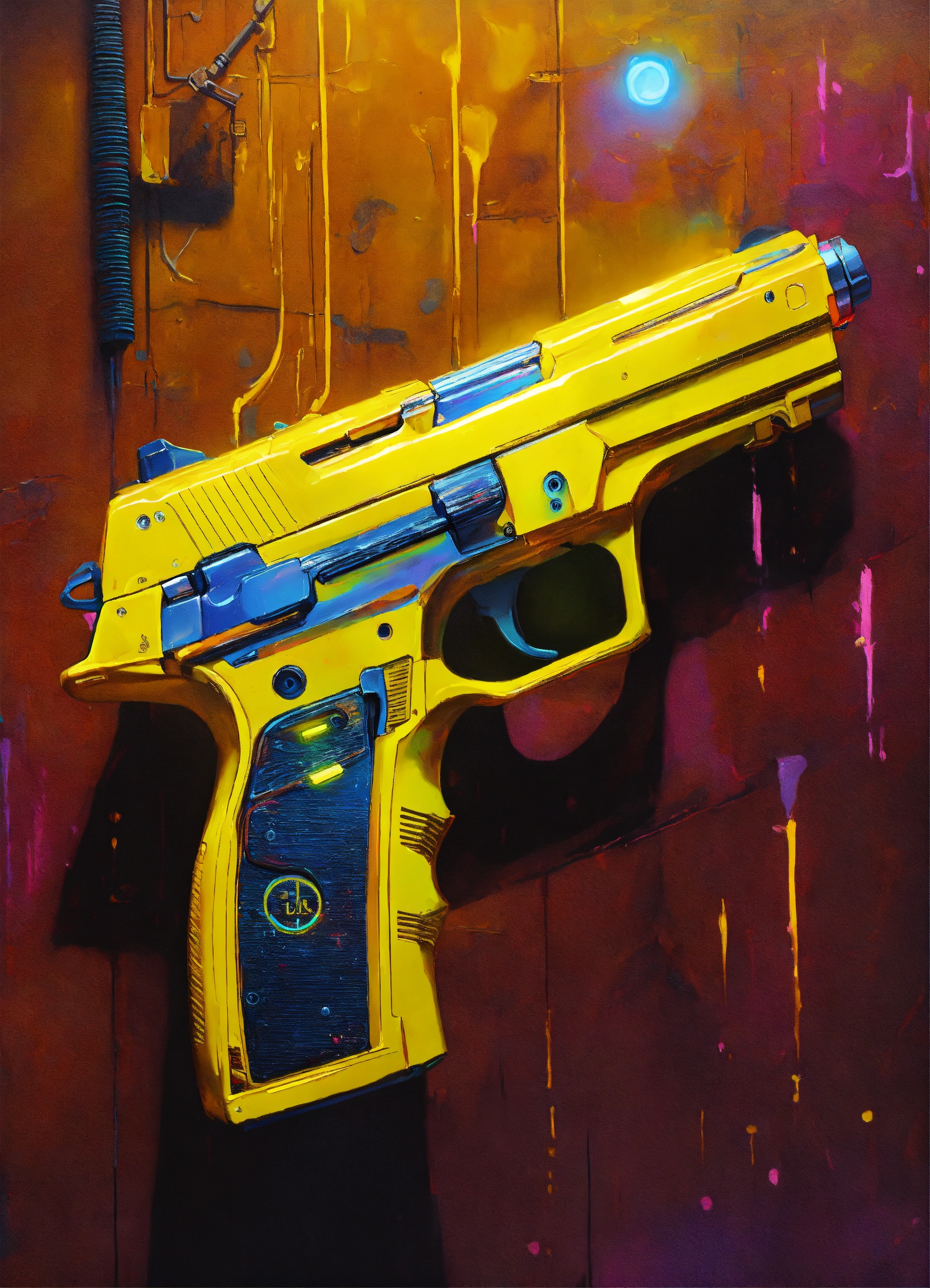 Neon slightly glowing yellow cyberpunk handgun hyper realistic oil painting style