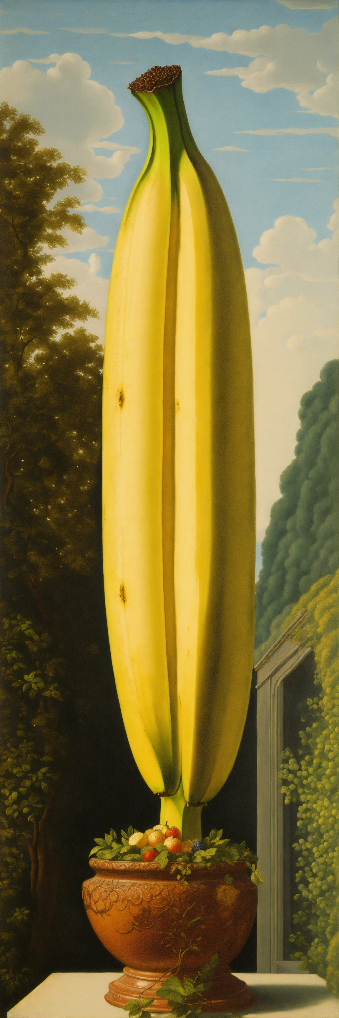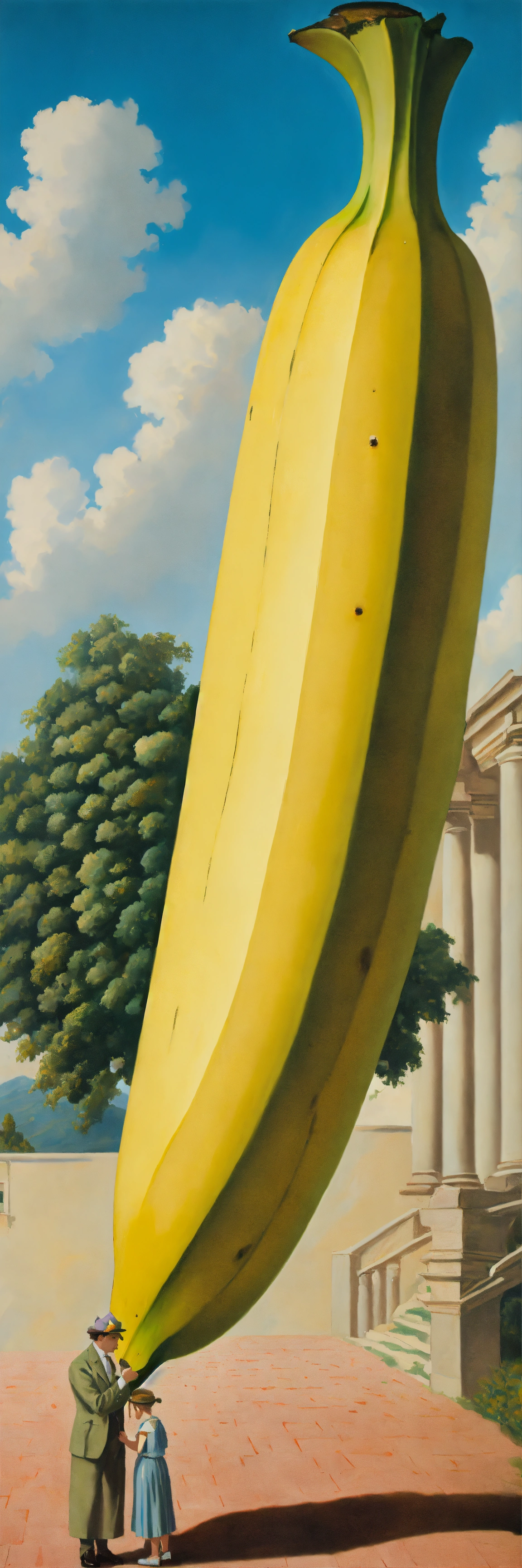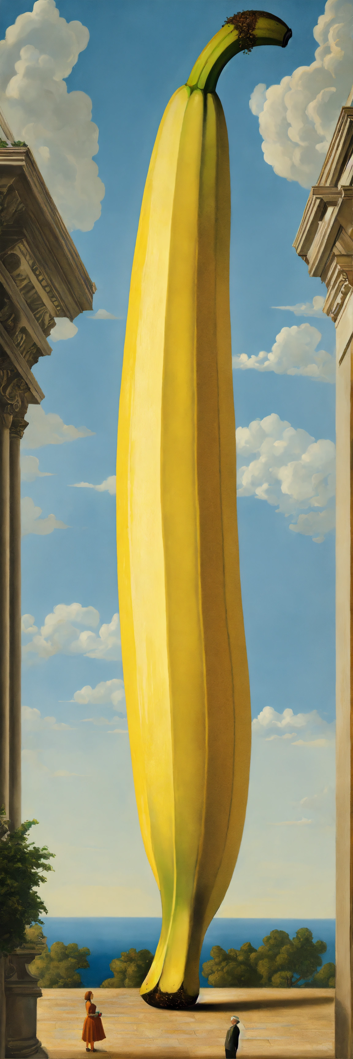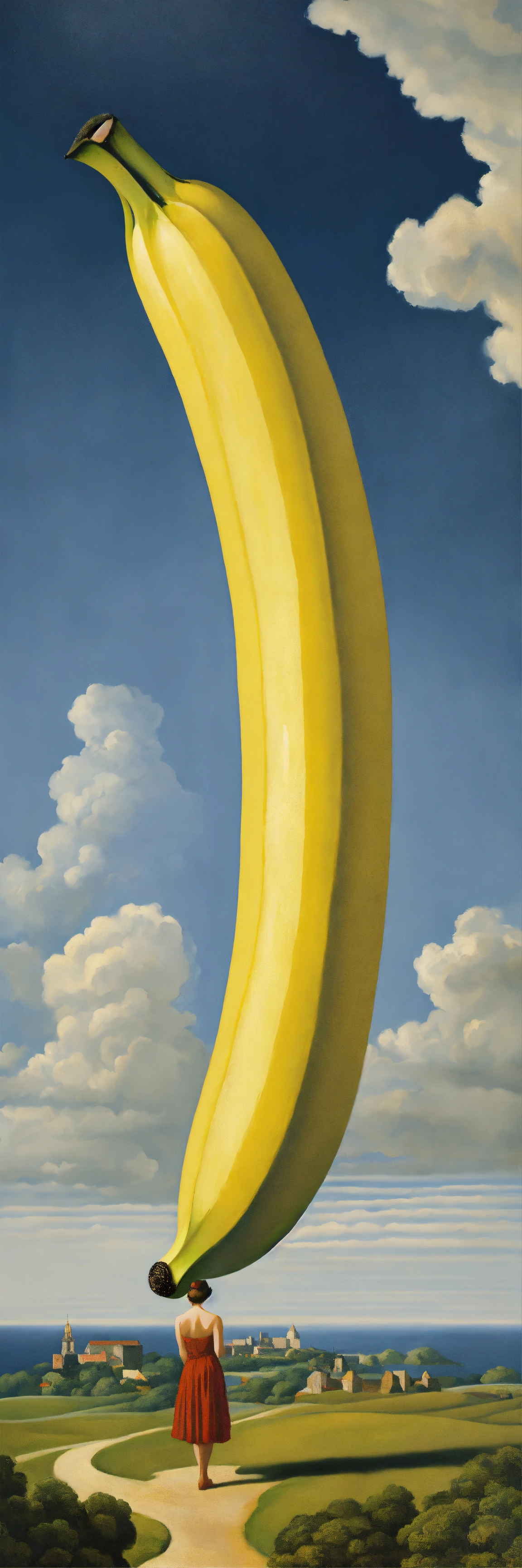 "a huge banana in a hand of aphrodite in the form of consciousness" by rene magritte, surrealistic high-resolution painting, 64k resolution