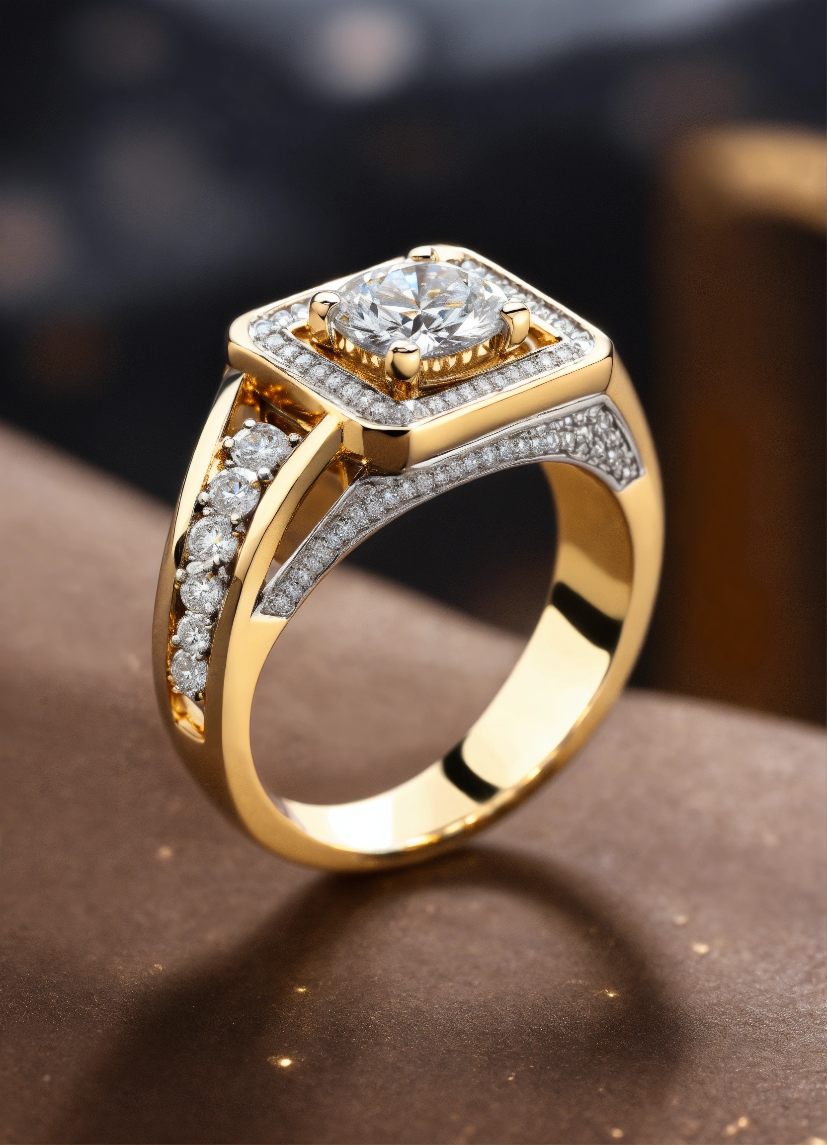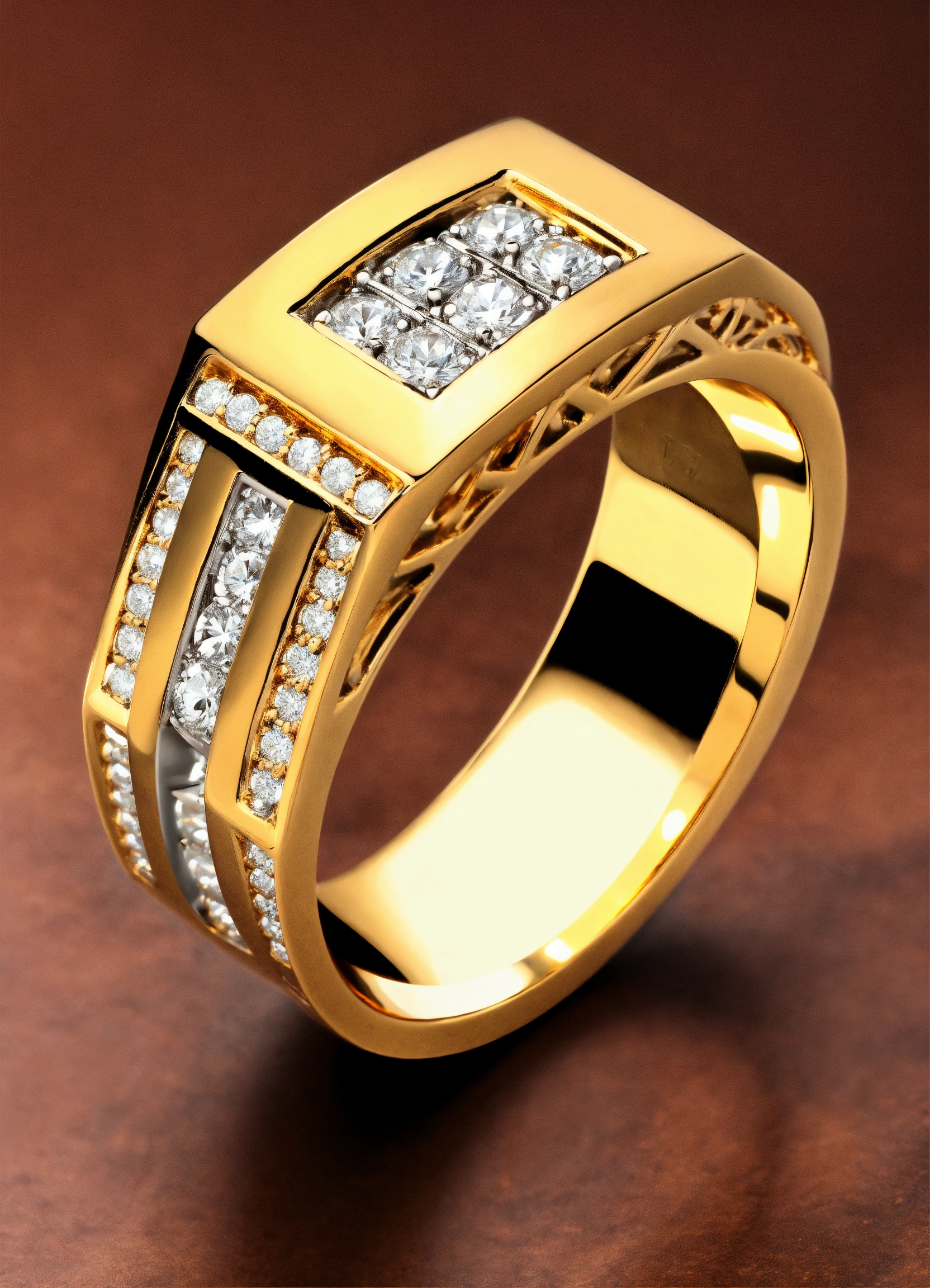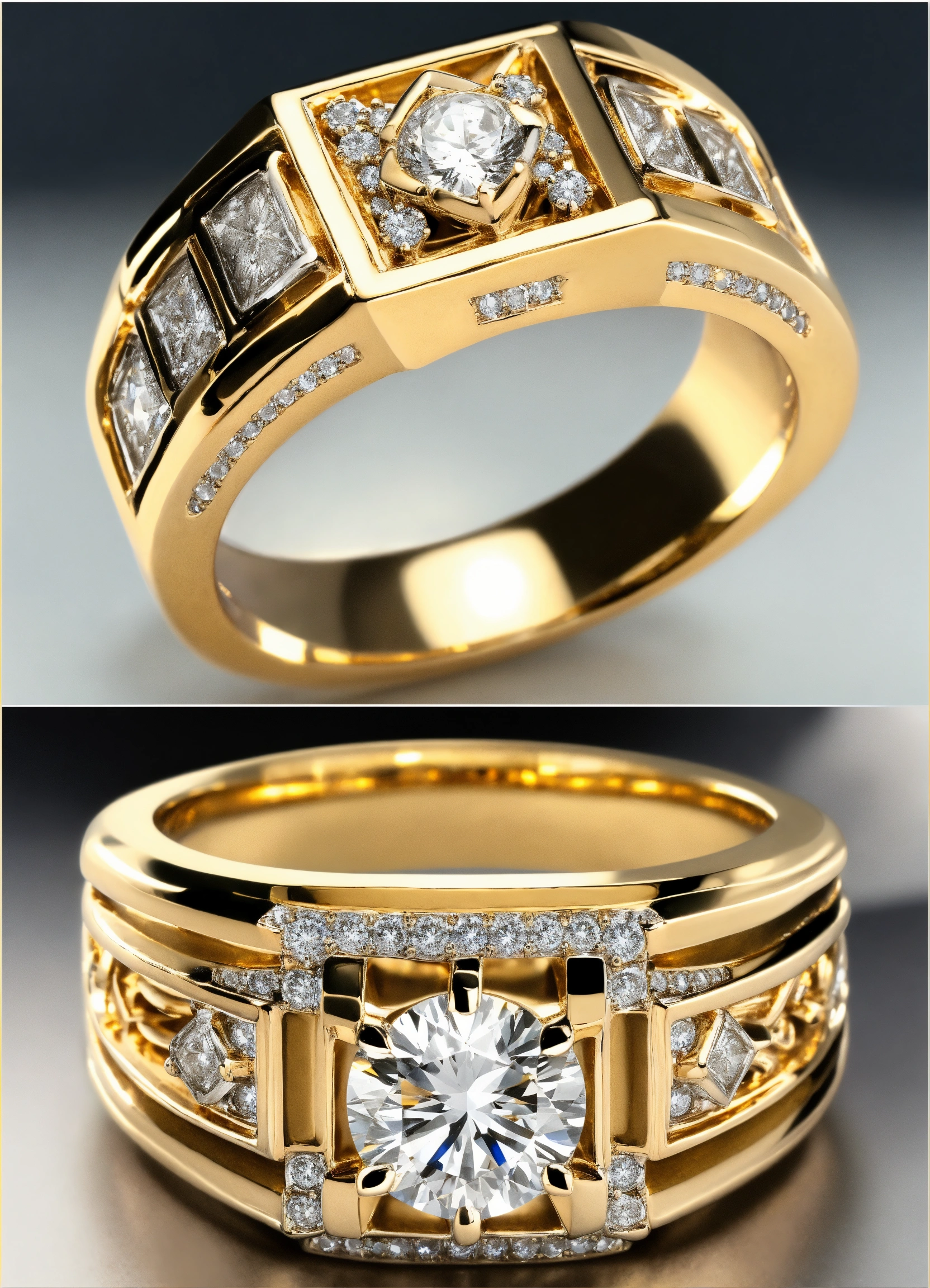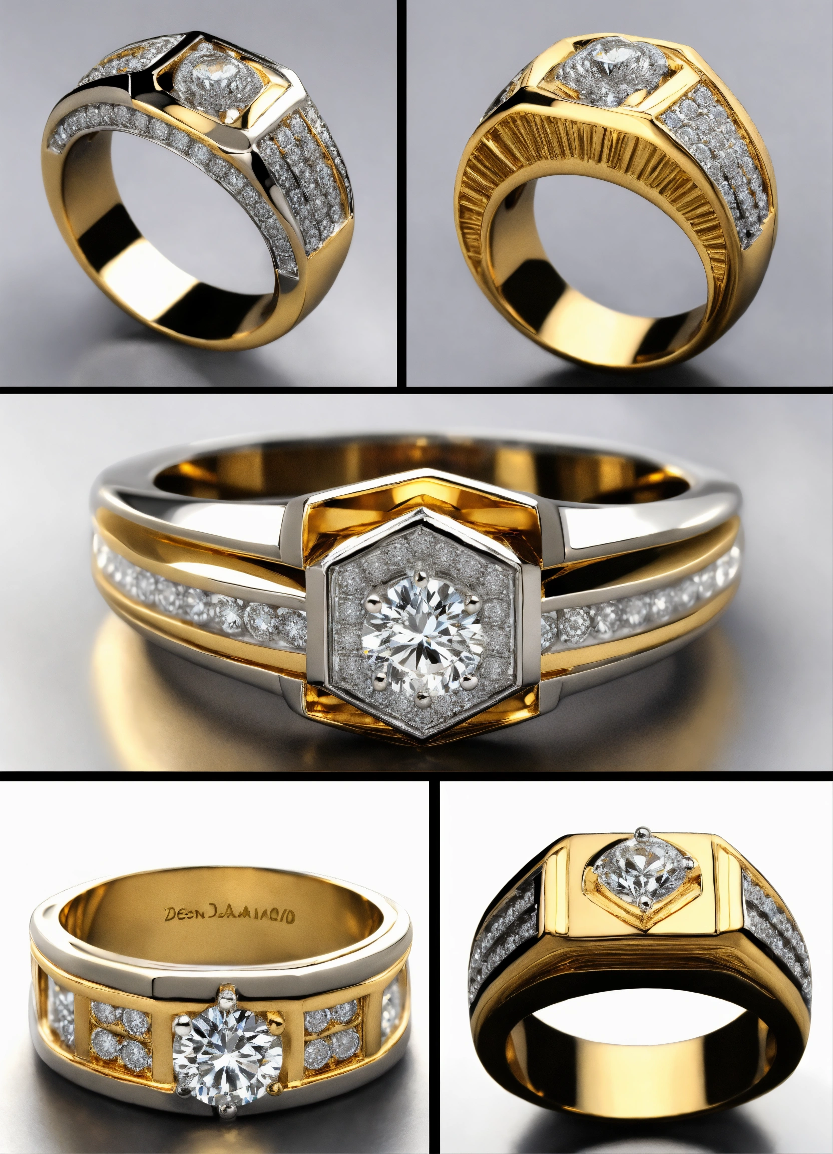 Jewellery design, vintage style, create diamond gold ring with matte finish in prong setting, modern men's ring with white gold diamonds, default-theme, --product-view --ultra-quality
