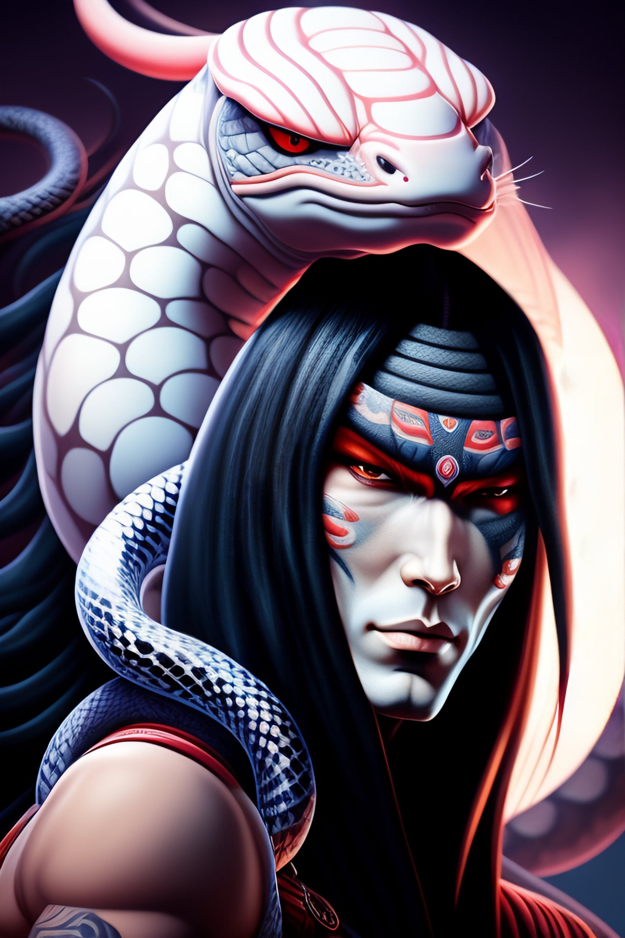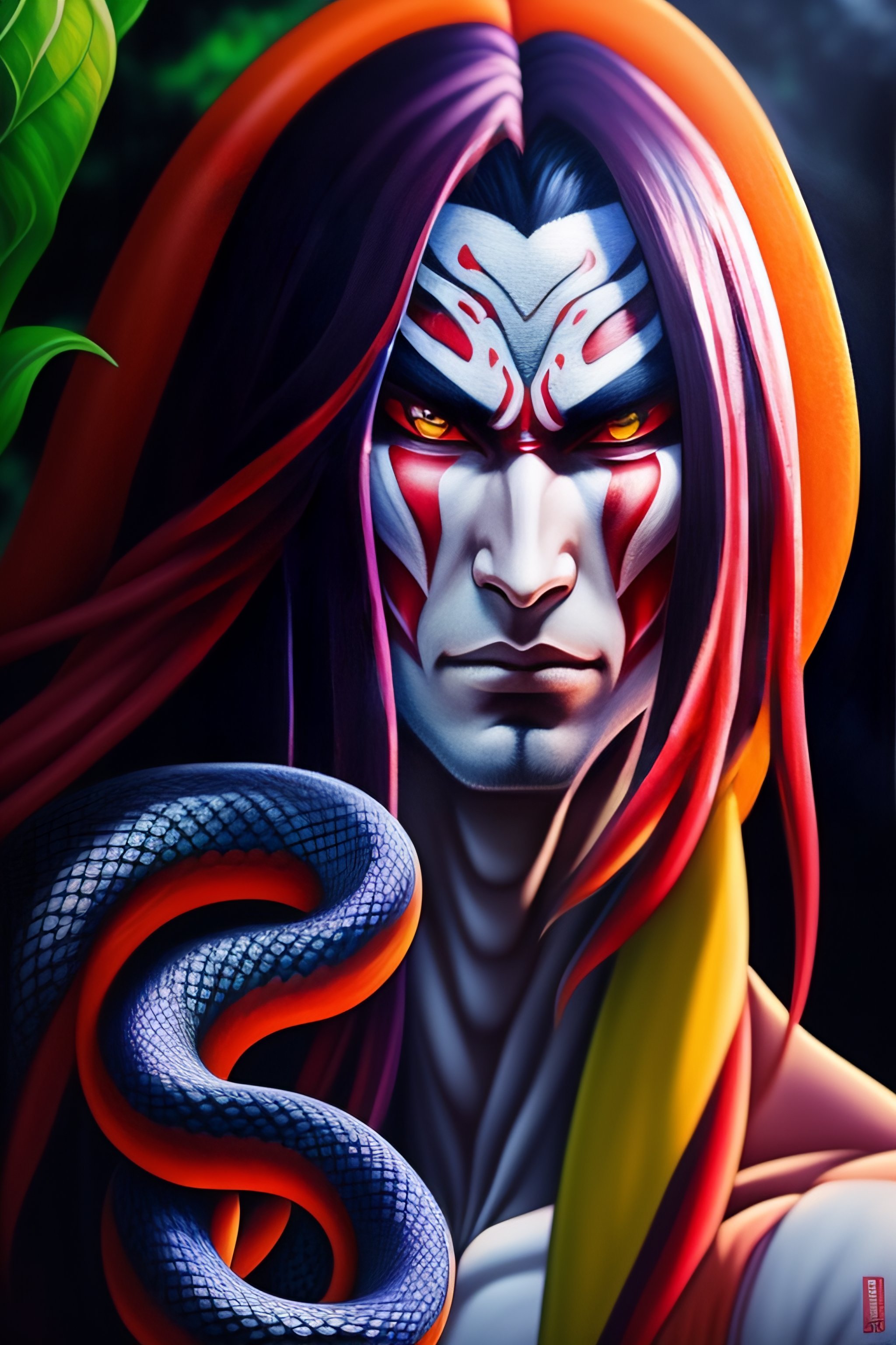 Detailed paint of orochimaru with giant snake, full body, highly detailed paiting by naojo takeuchi, masashi kishimoto, artgerm, 8k, royal paiting