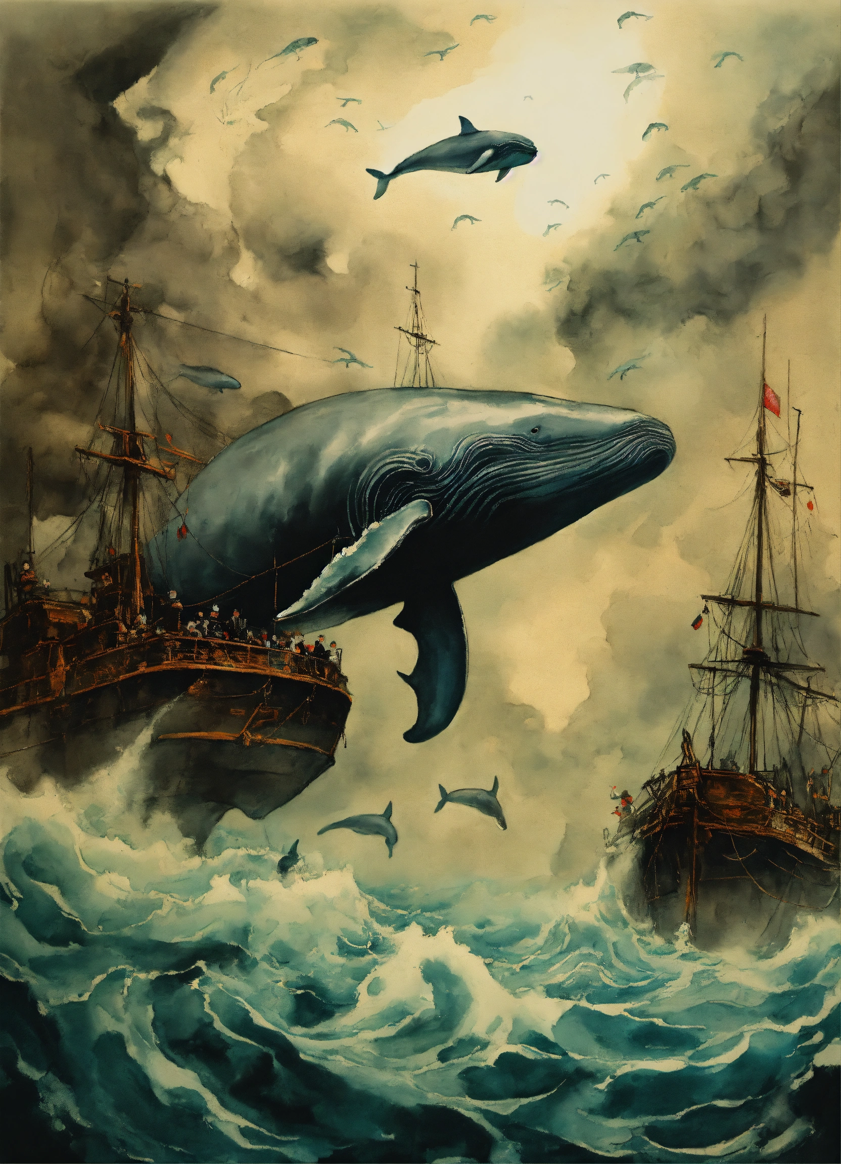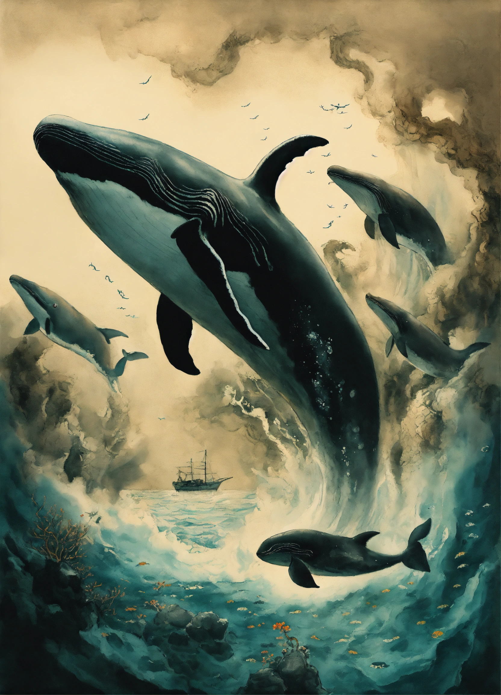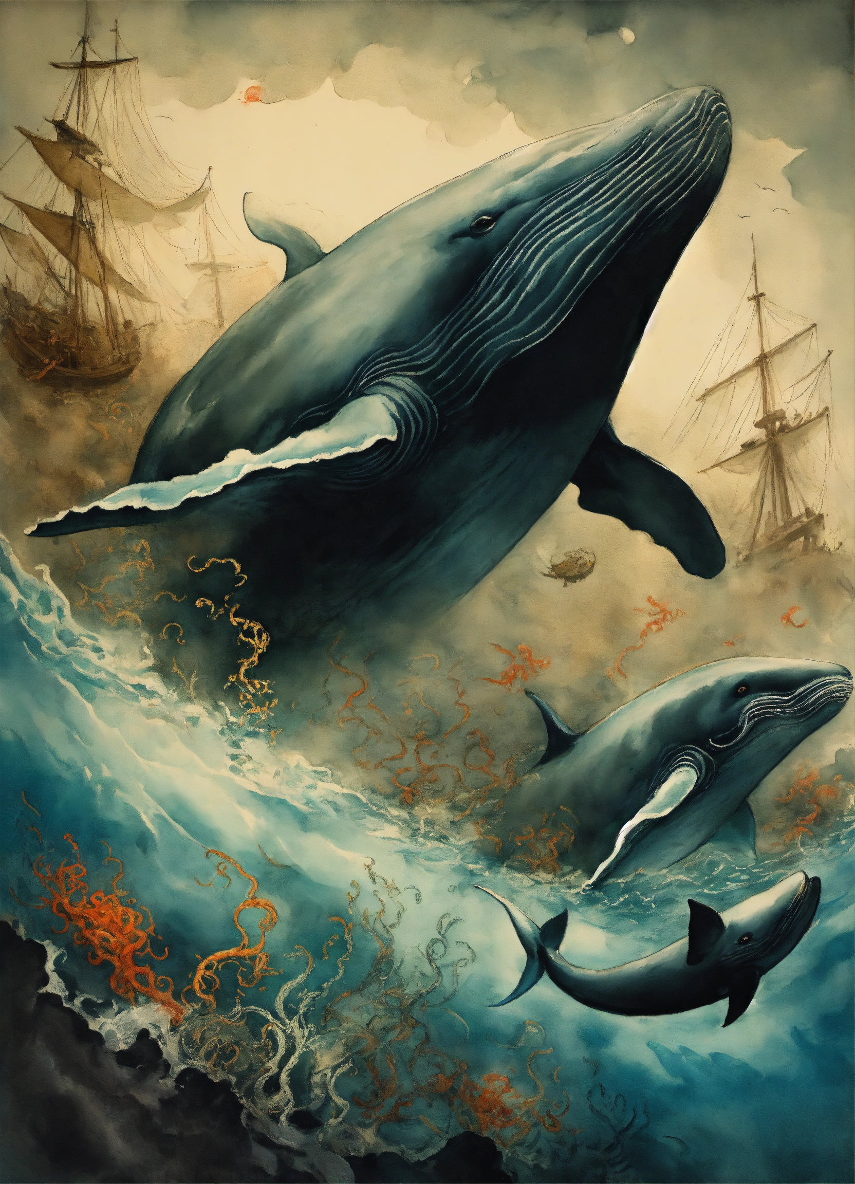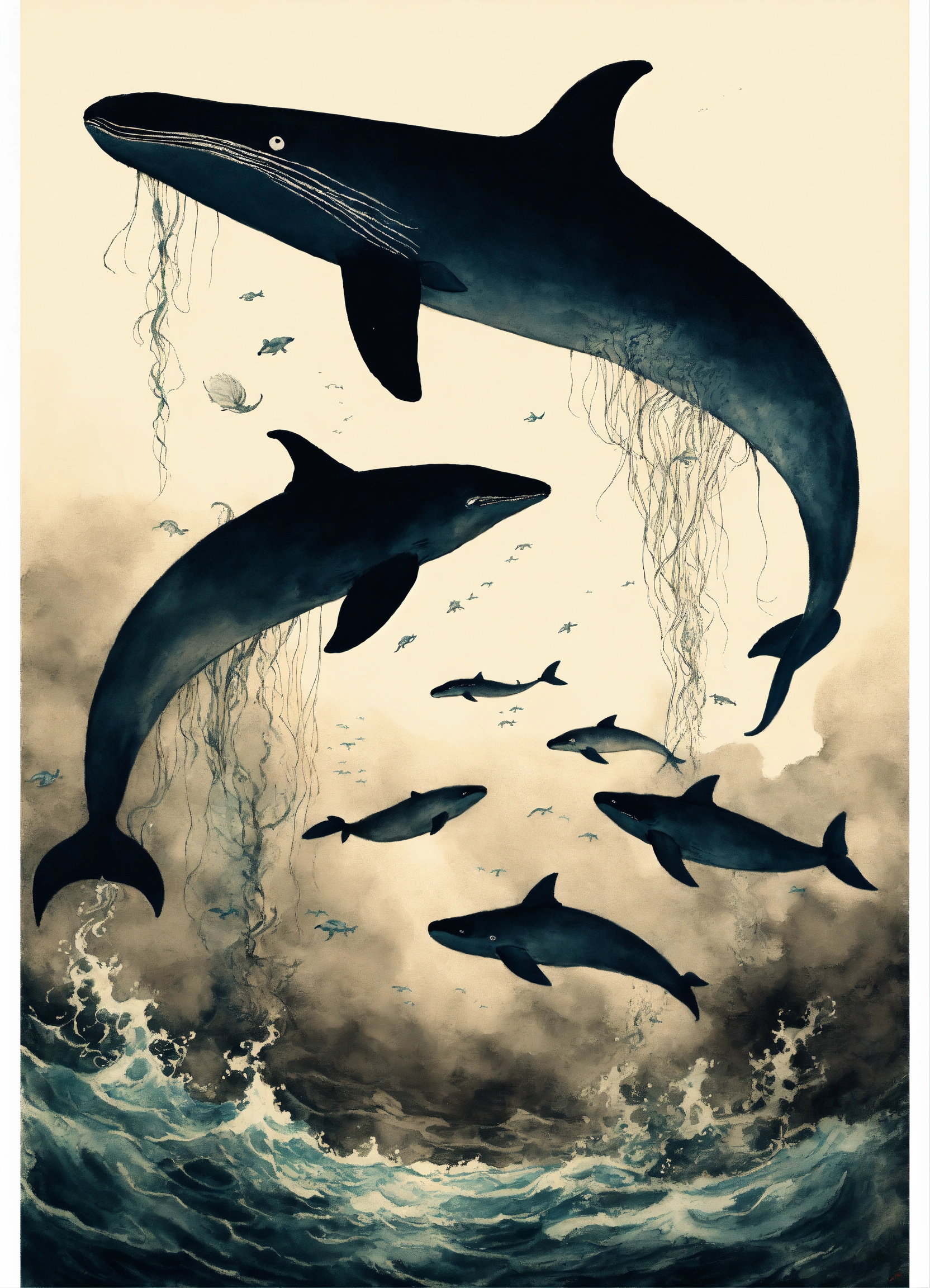 A group of whales swimming away from menacing tentacles, underwater, deep sea, ink painting, poster art, sumi-e, modern european ink painting, by tai xiangzhou, by gustave doré, masterpiece, infinity, asbtract, rorschach