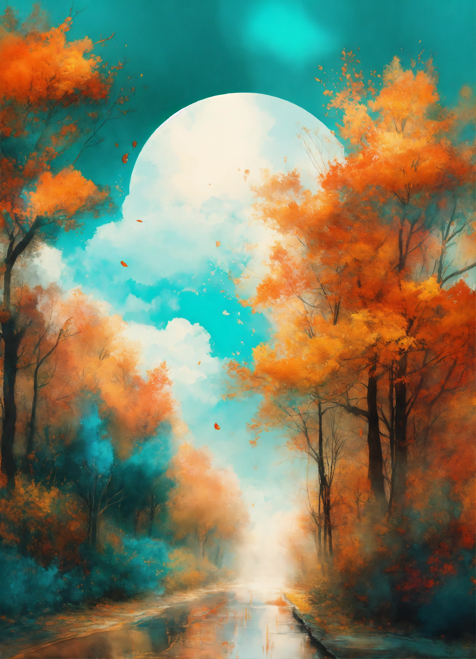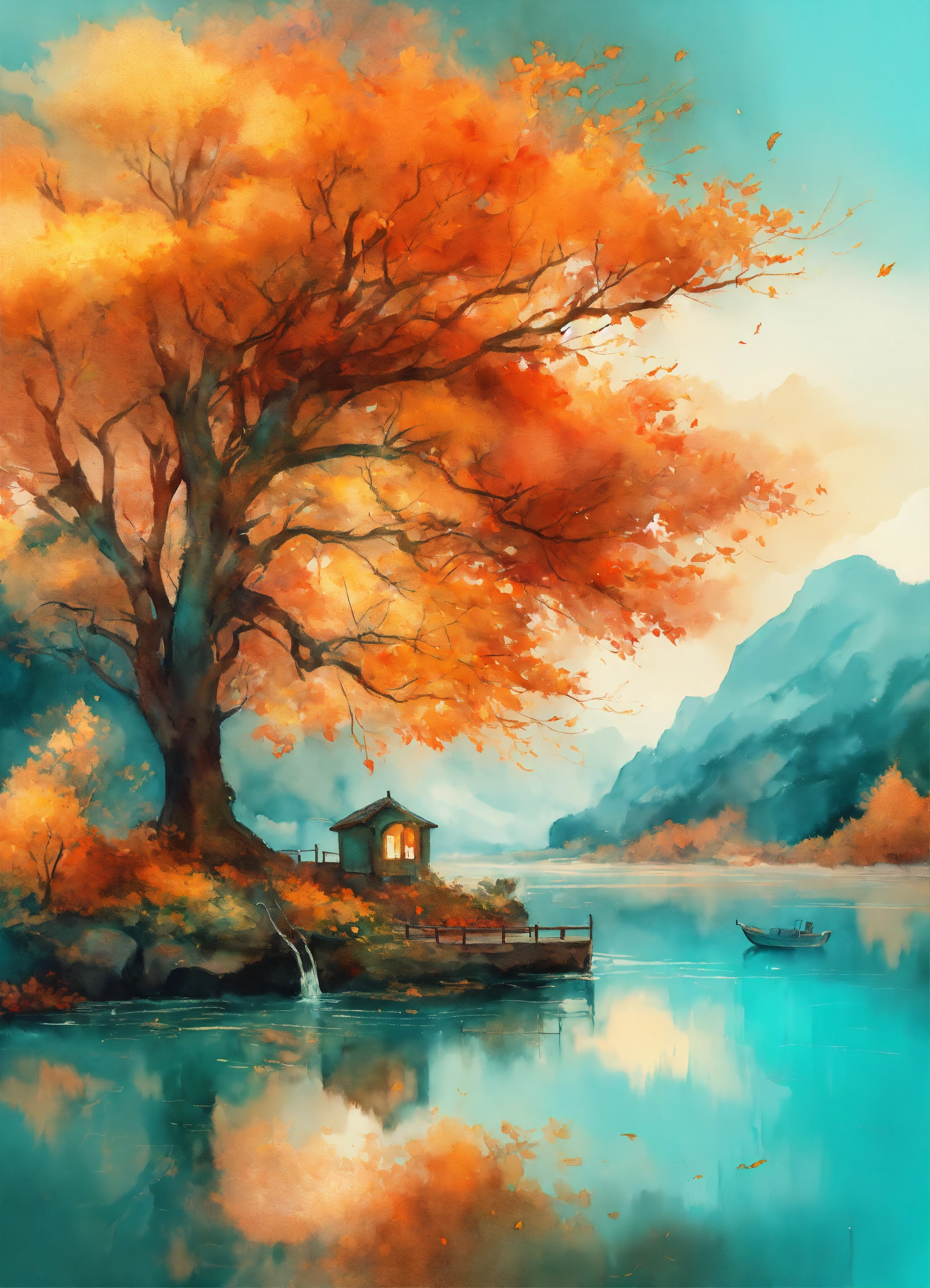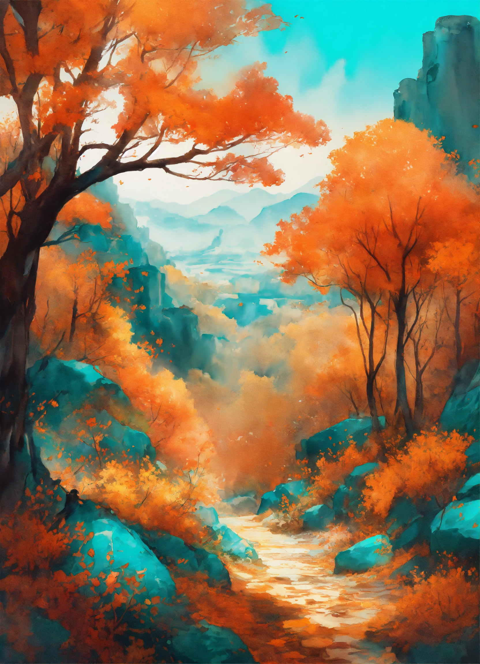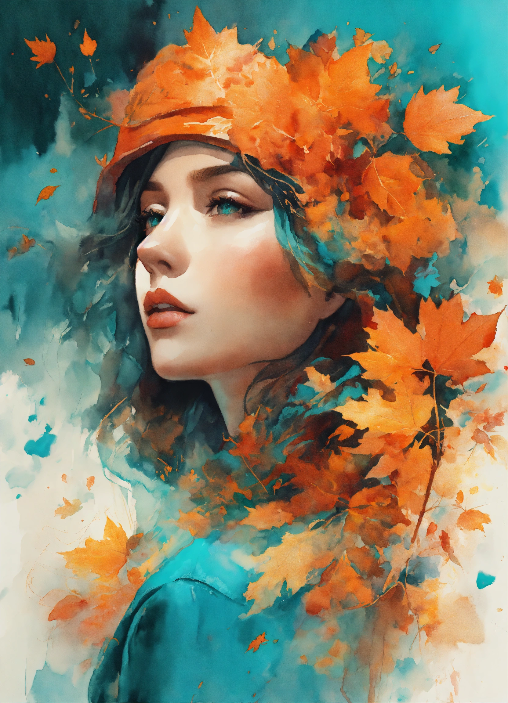 A visual journey that elegantly portrays the autumn season, vibrant turquoise & bright orange hues, watercolor illustration style, abstract painting, white background, epic cinematic brilliant stunning intricate meticulously detailed dramatic atmospheric maximalist digital matte painting