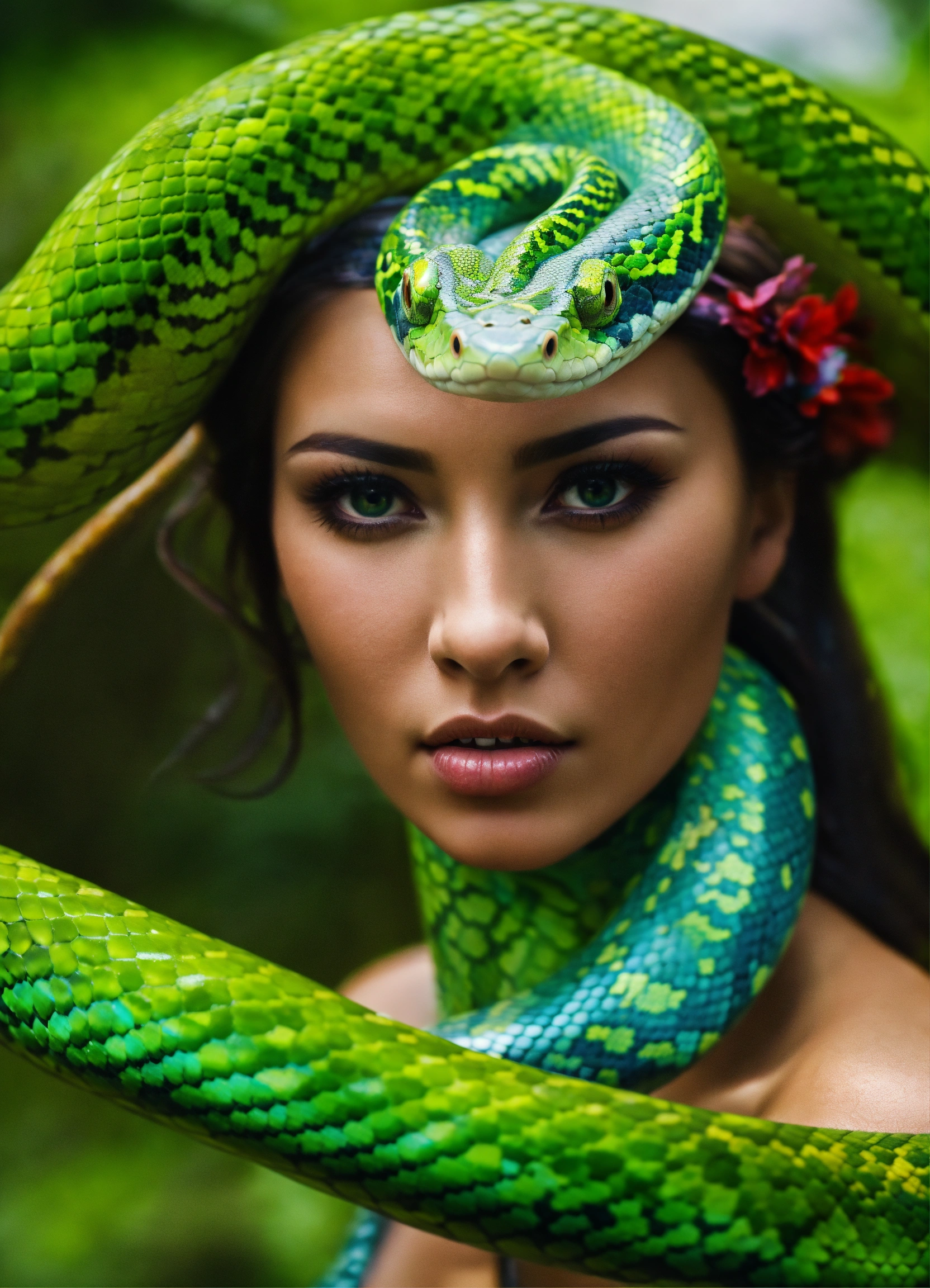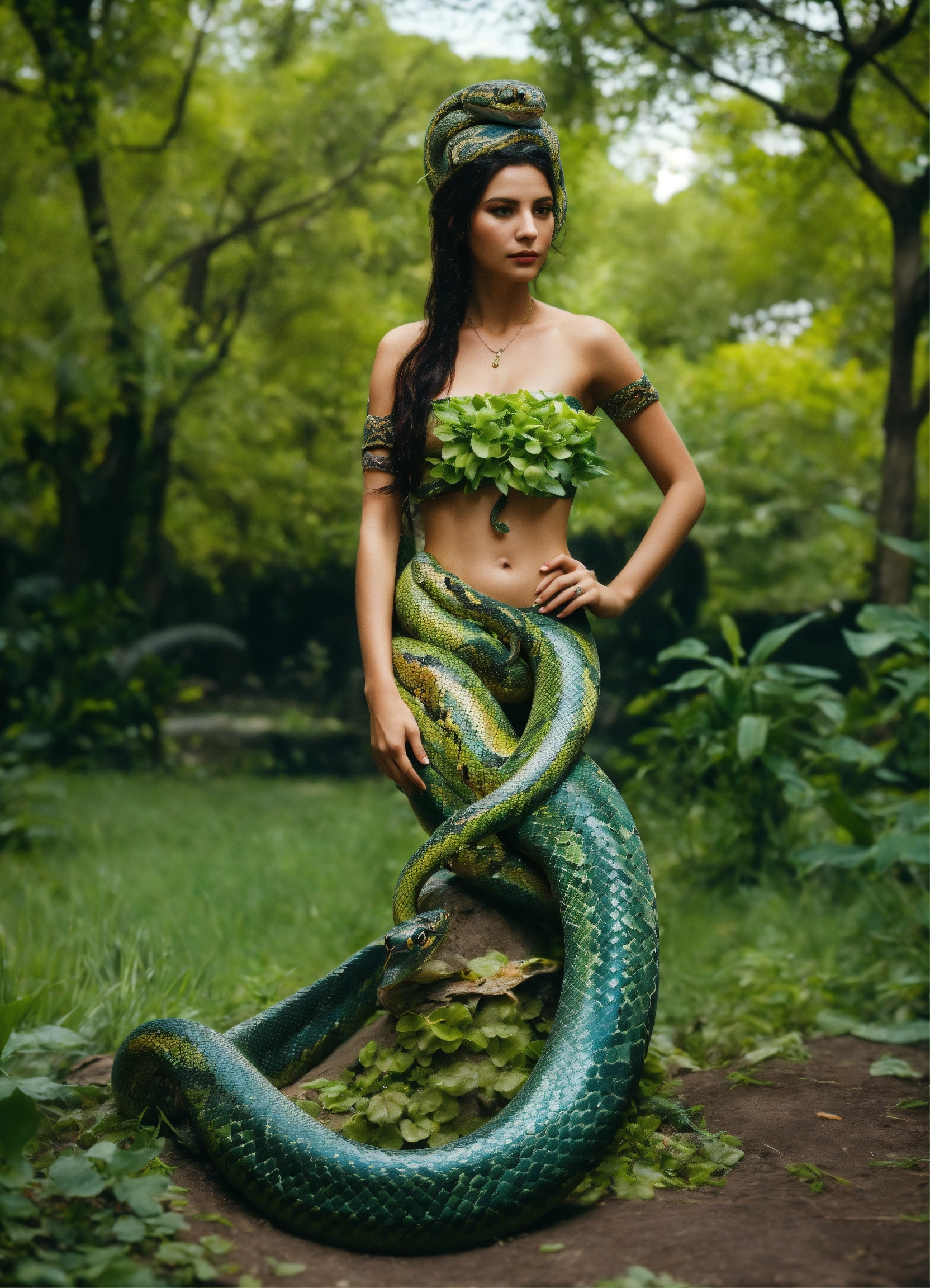 Detailed 4k photo full body portrait of a snakemaid slithering on park looking at the camera. a snakemaid is like a mermaid, but instead of half fish, she is half snake. from the waist down she is a snake. flowing veil around her.