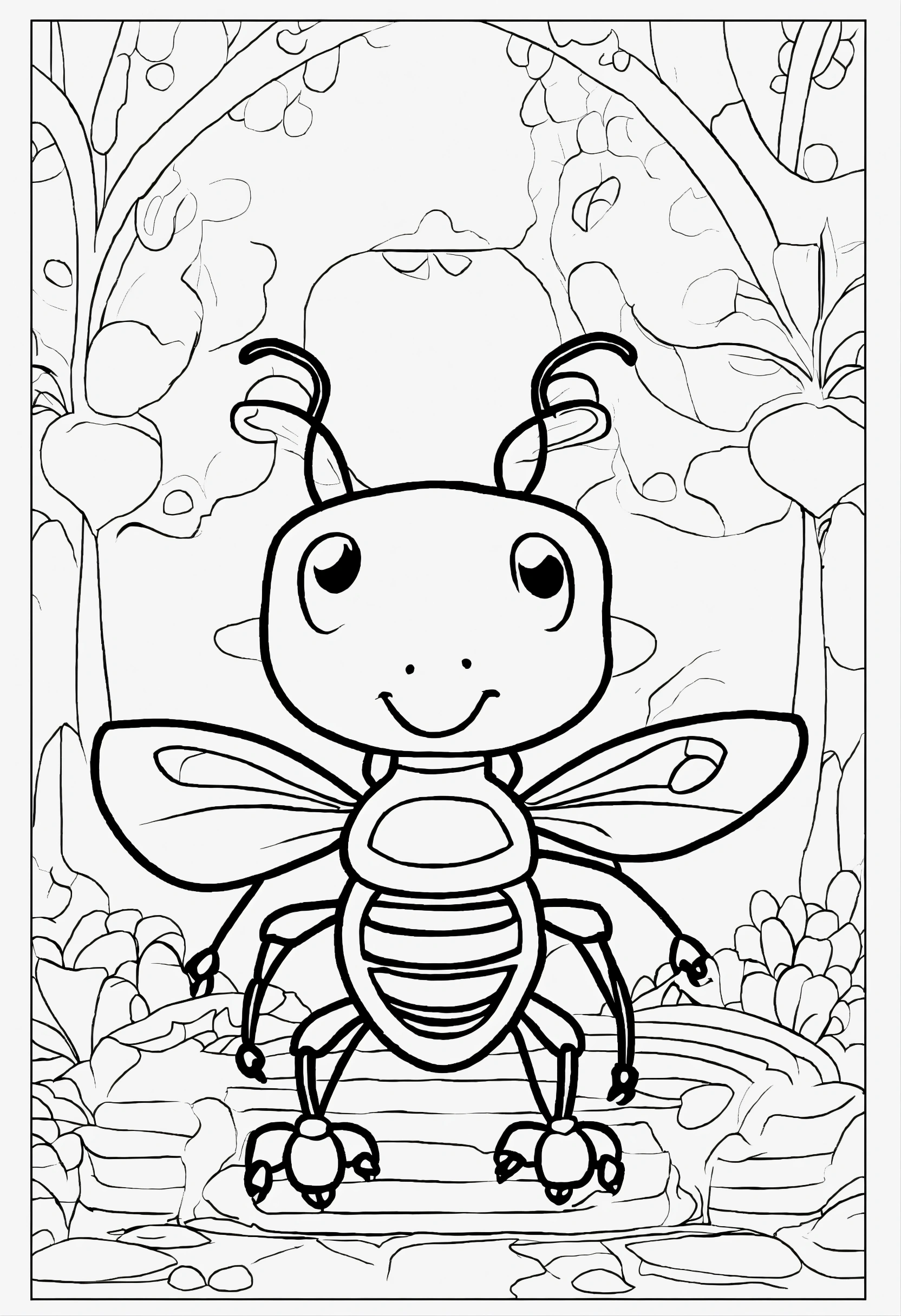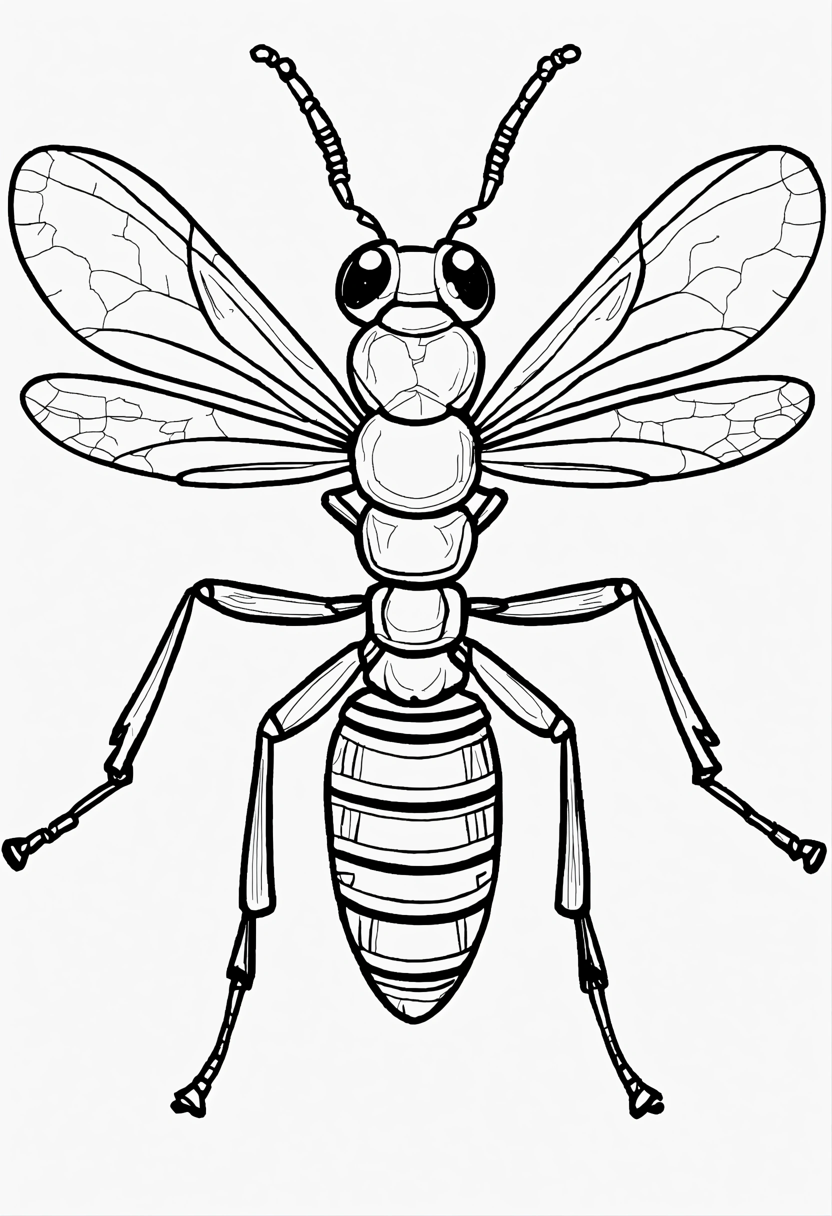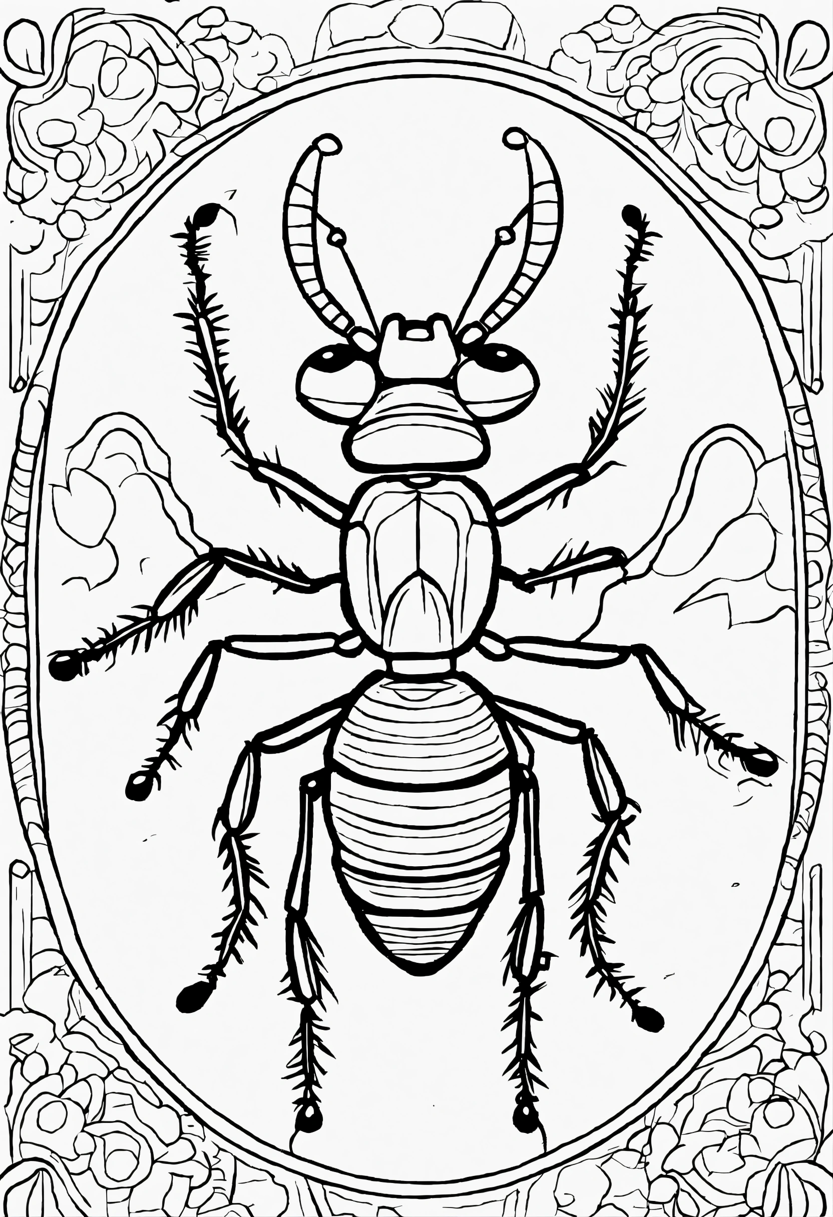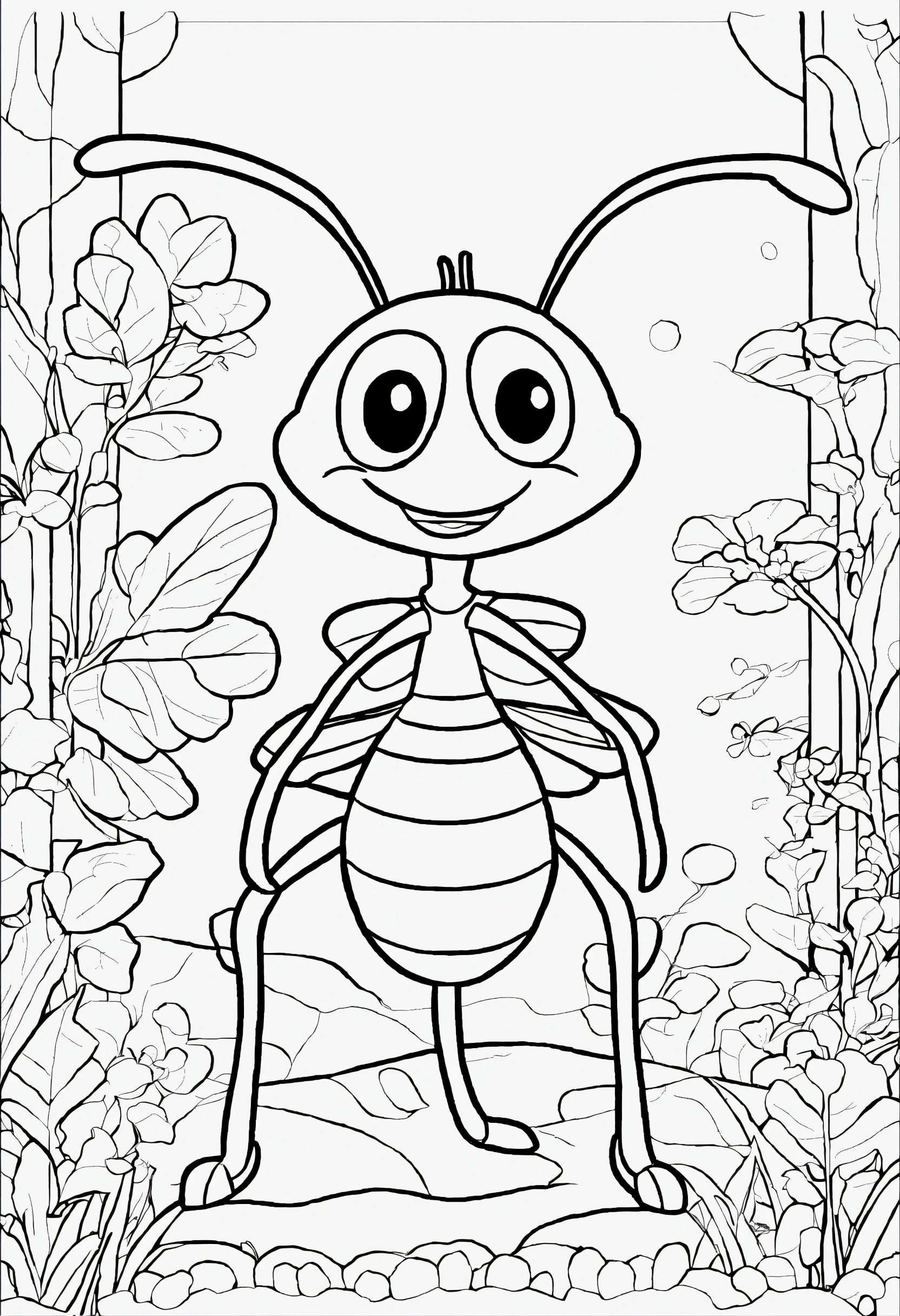 Coloring book for toddlers, simple lines drawings, no lines inside of the drawing, ant, cartoon, full body, outline of the drawing in bold line, symmetrical, white background., no background image.
