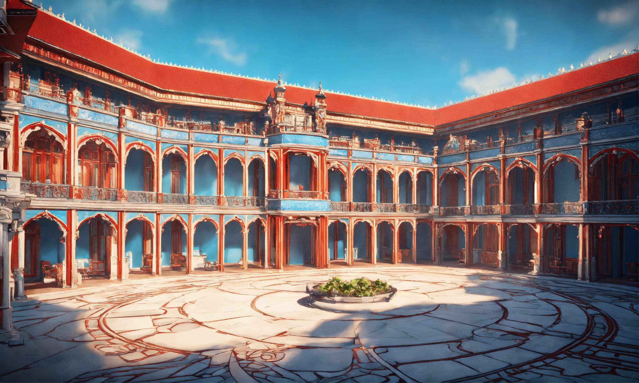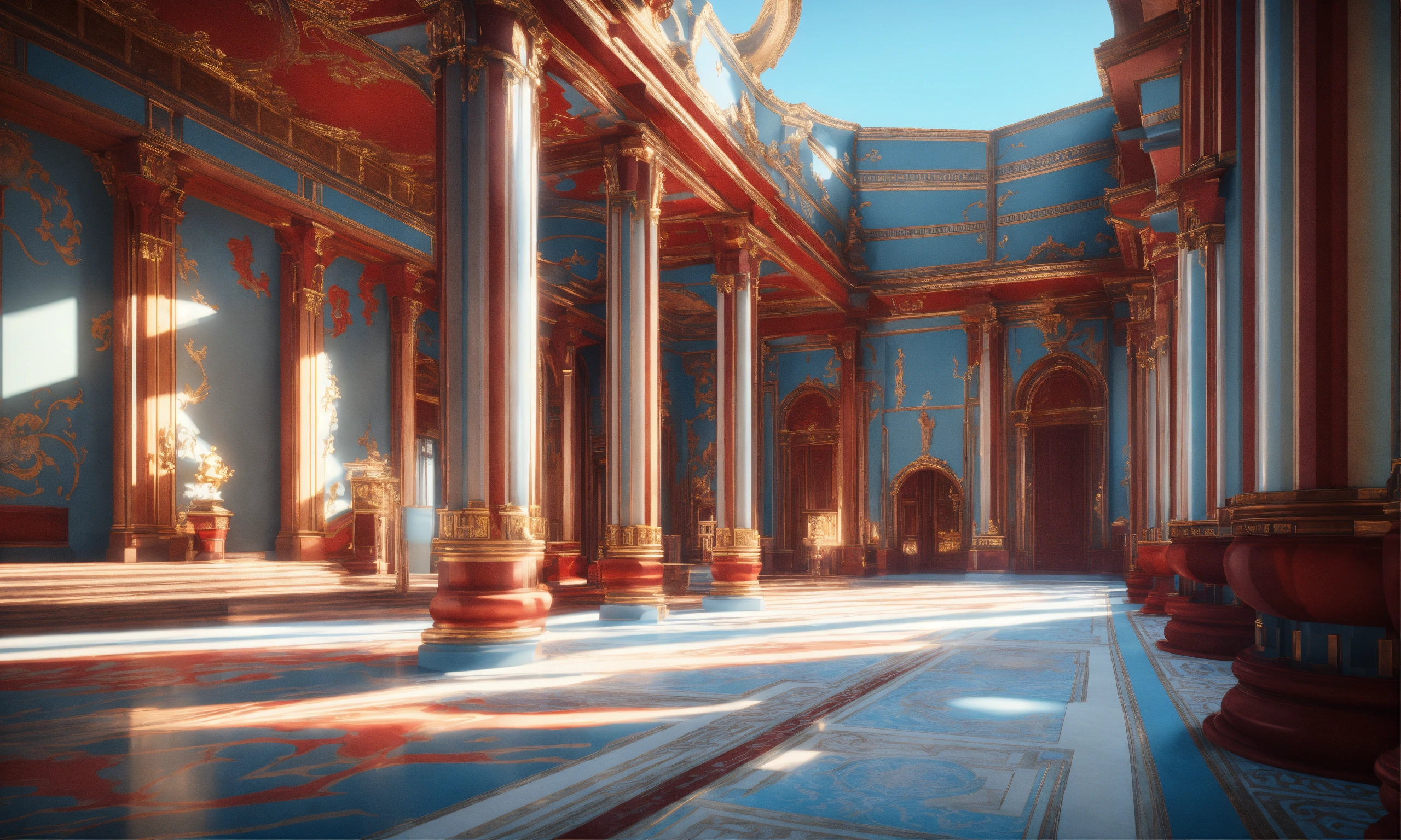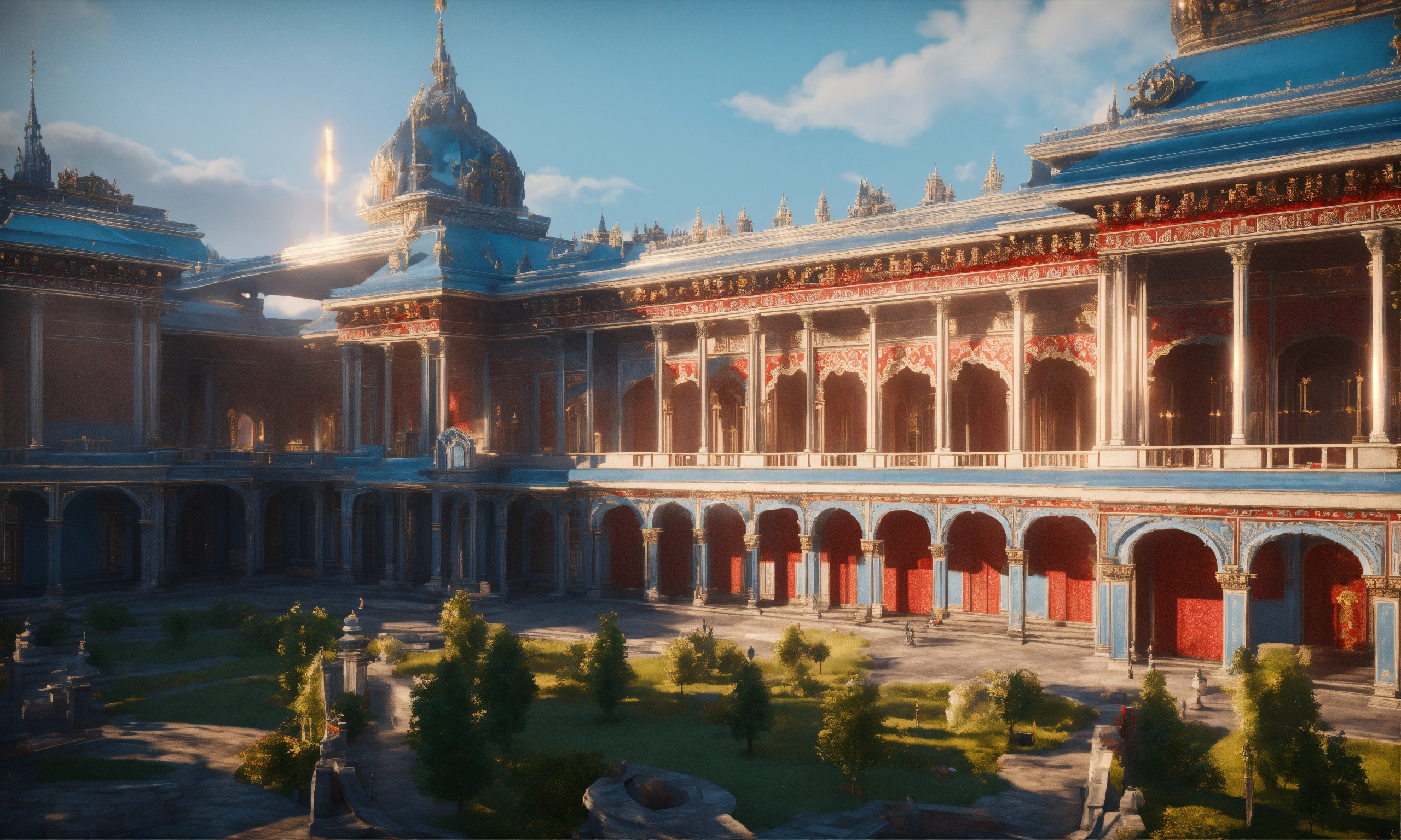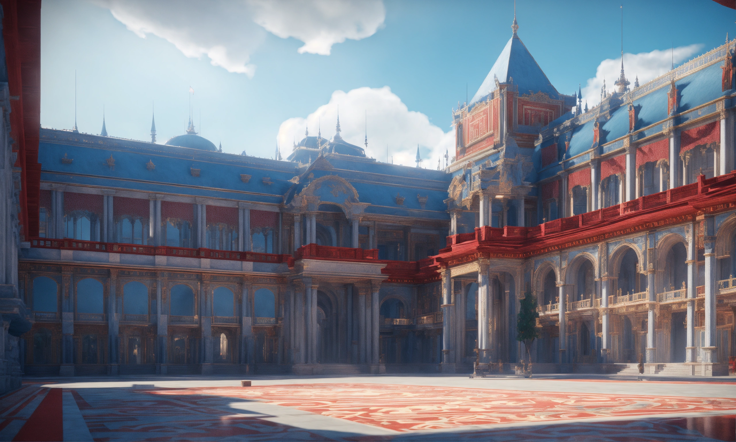 Full image of a massive palace with light blue and red designs, british architecture, unreal engine, 8d