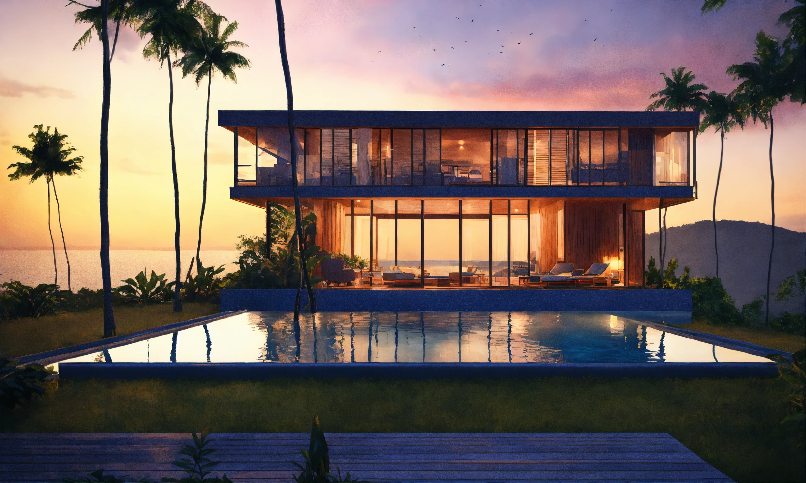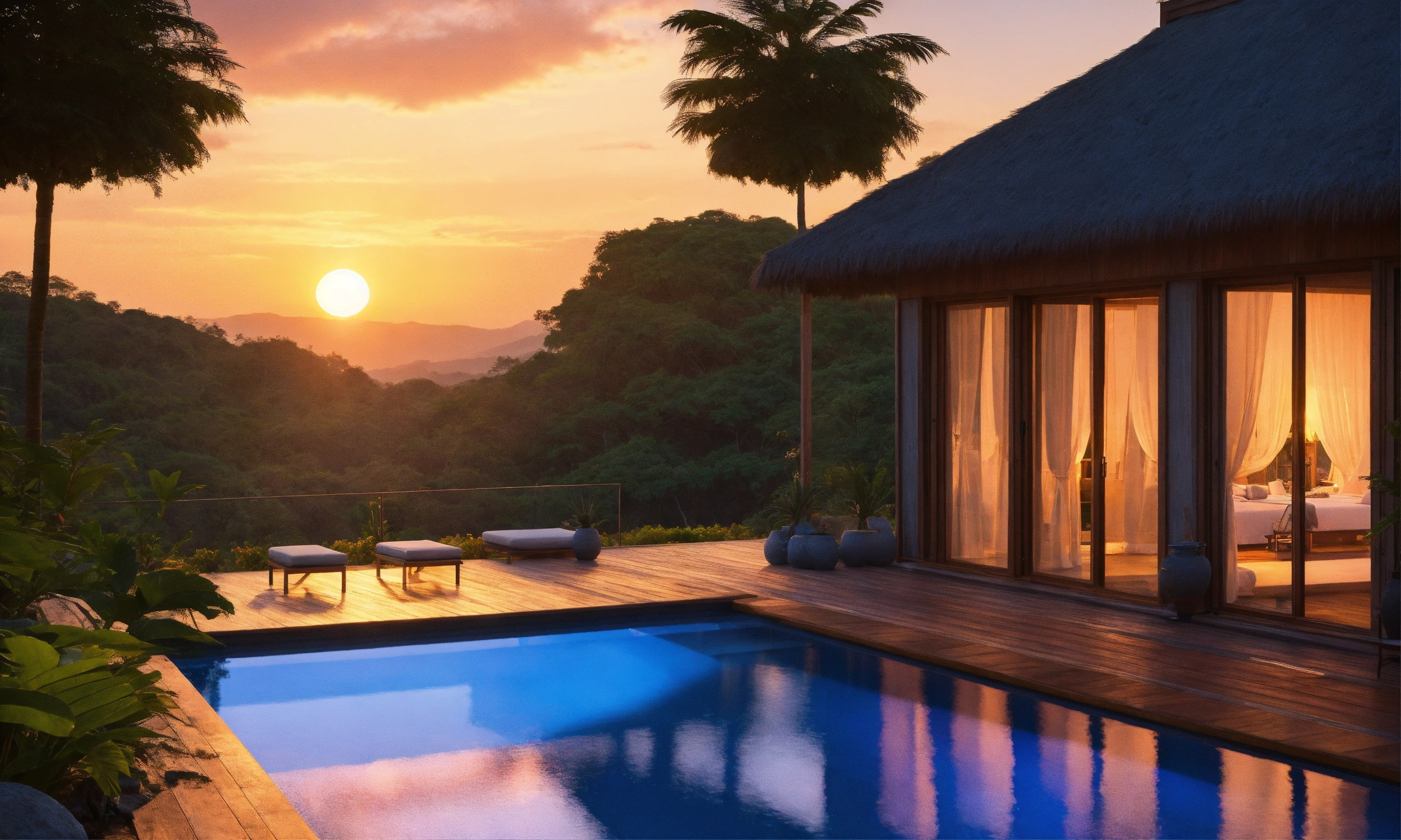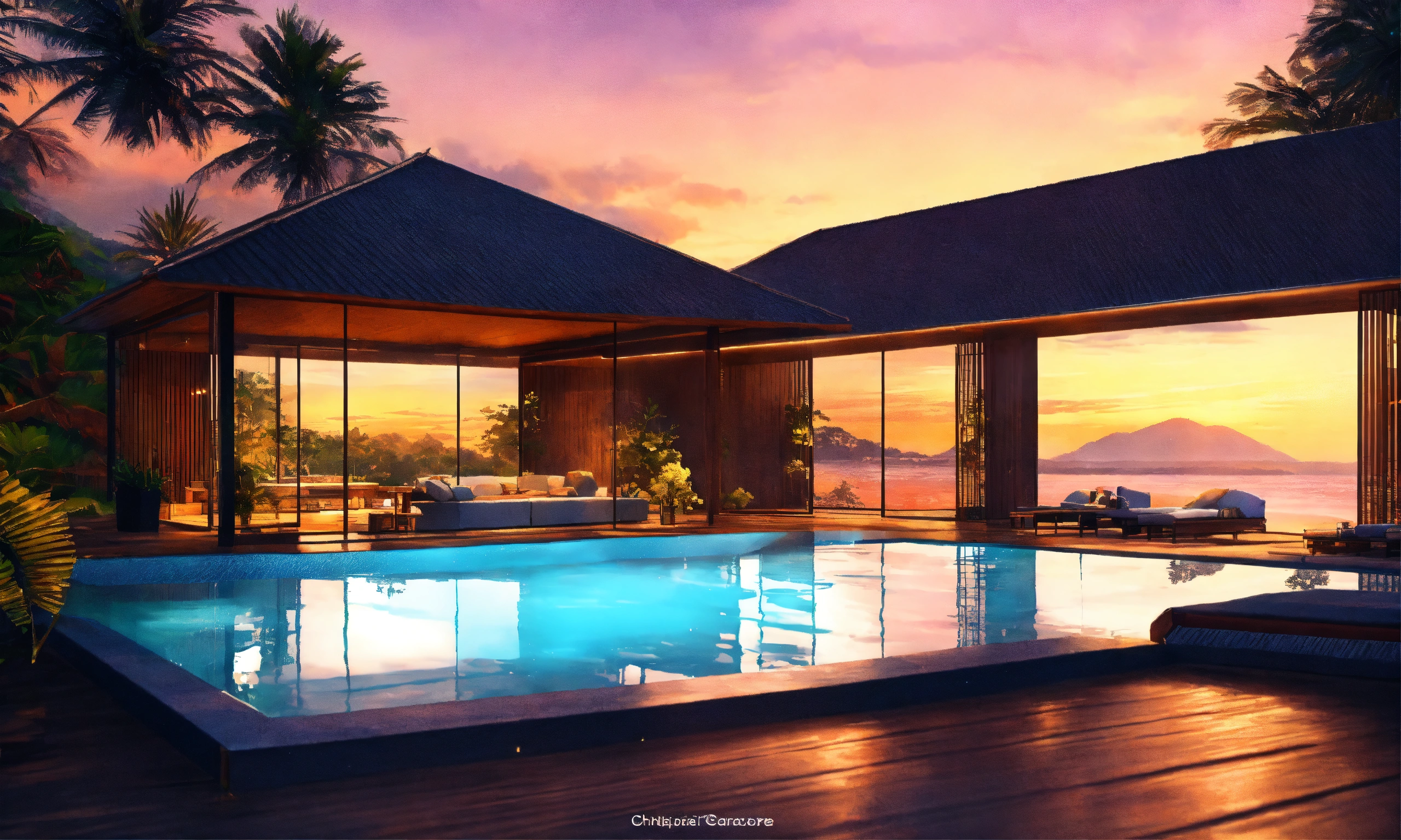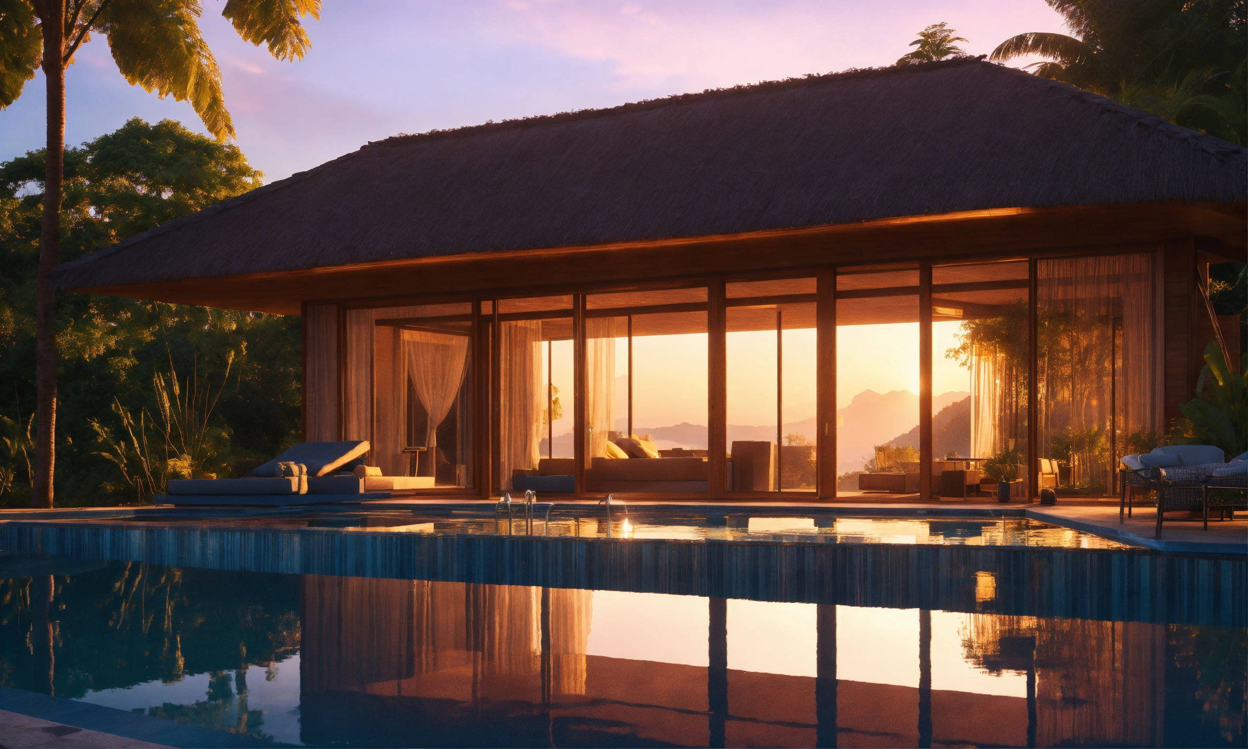 Villa overlooking a swimming pool at sunset, in the style of christopher balaskas, mirror rooms, tropical landscapes, cabincore, 8k, sophisticated woodblock, grandiose architecture --ar 169gemütliche und elegante atmosphäre schafft. aufgenommen mit einer professionellen kamera. --ar 169
