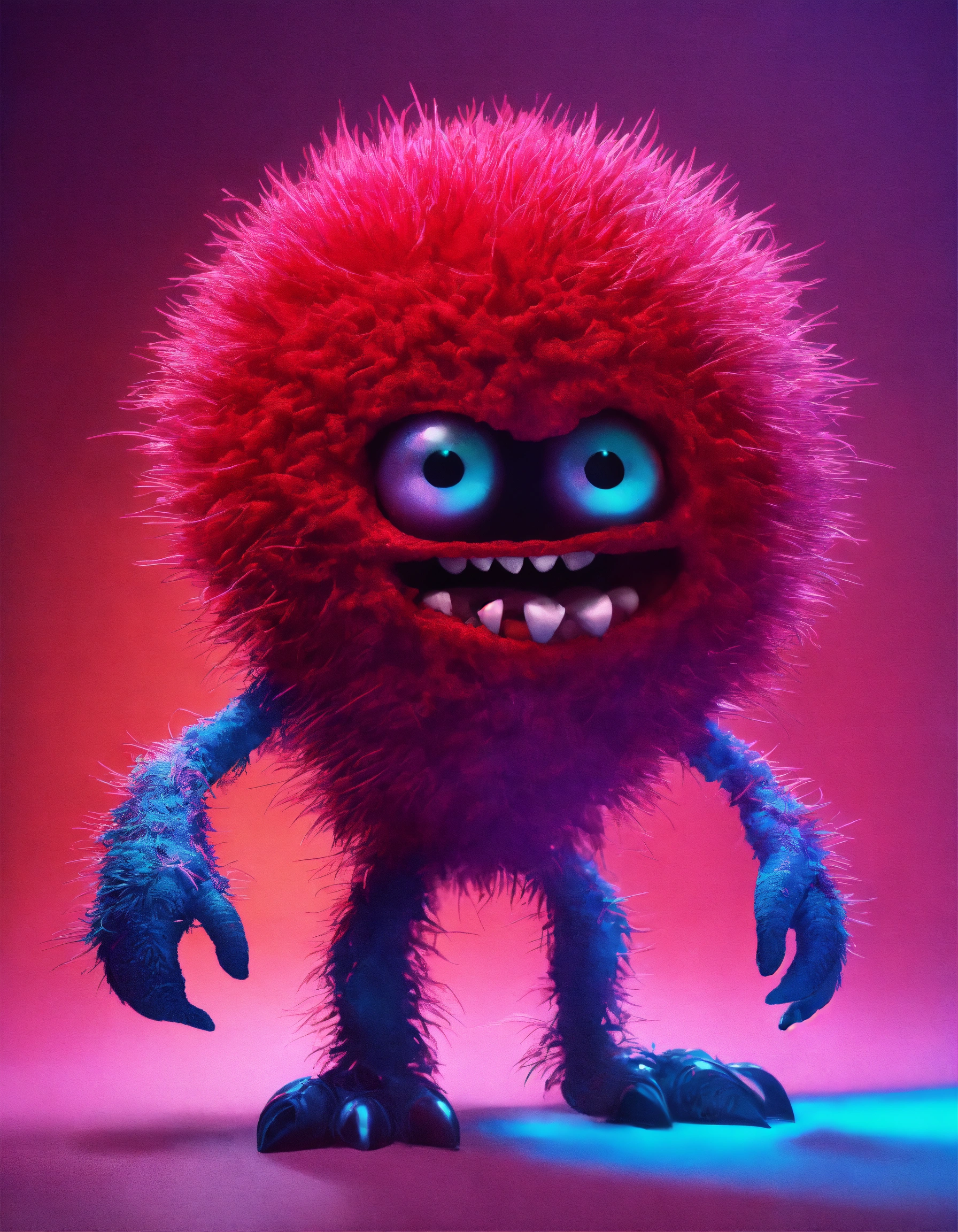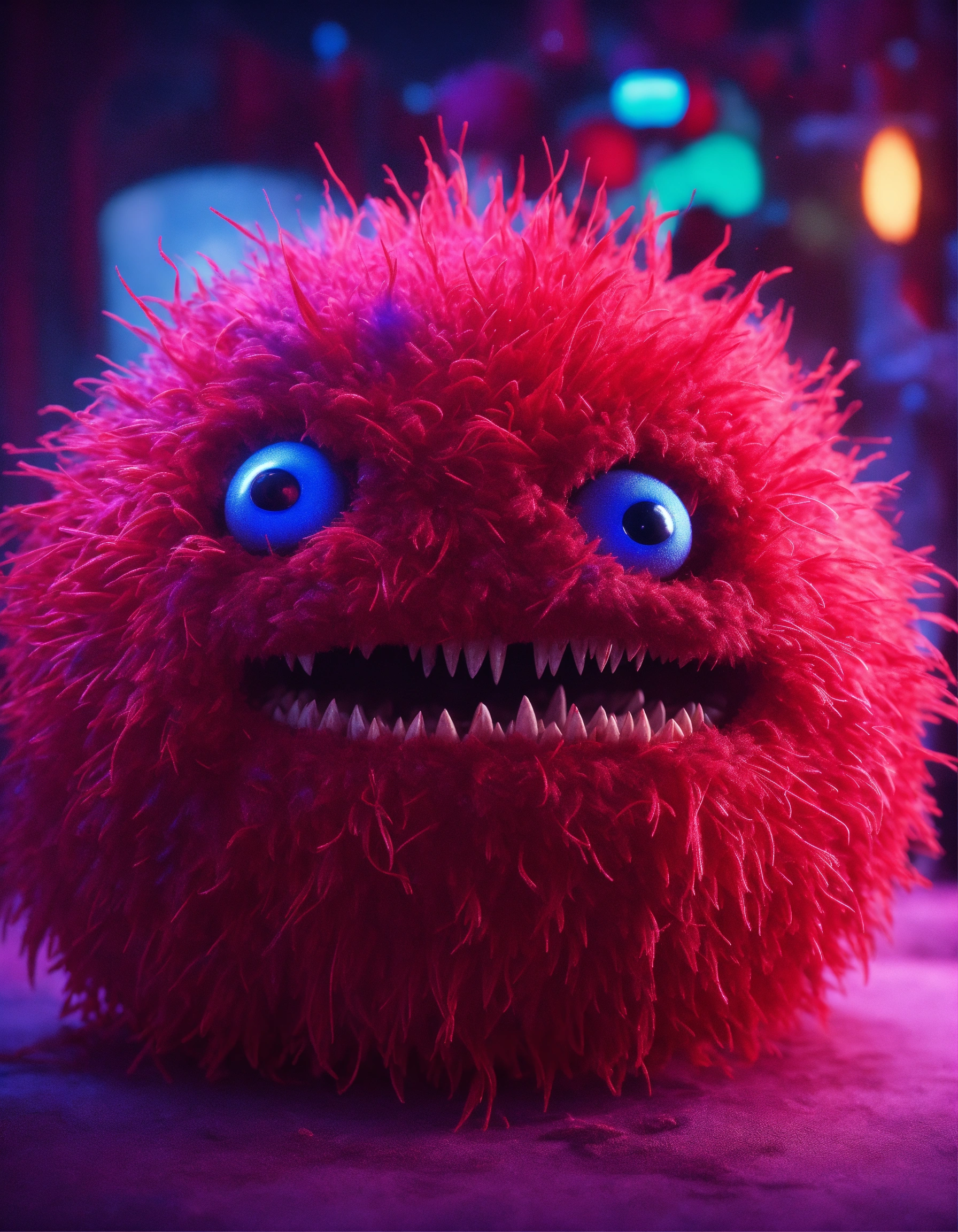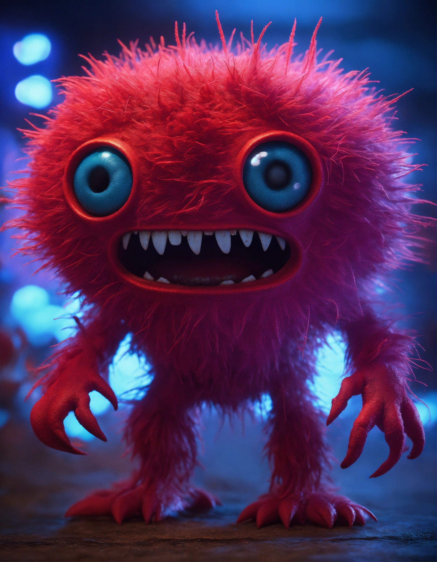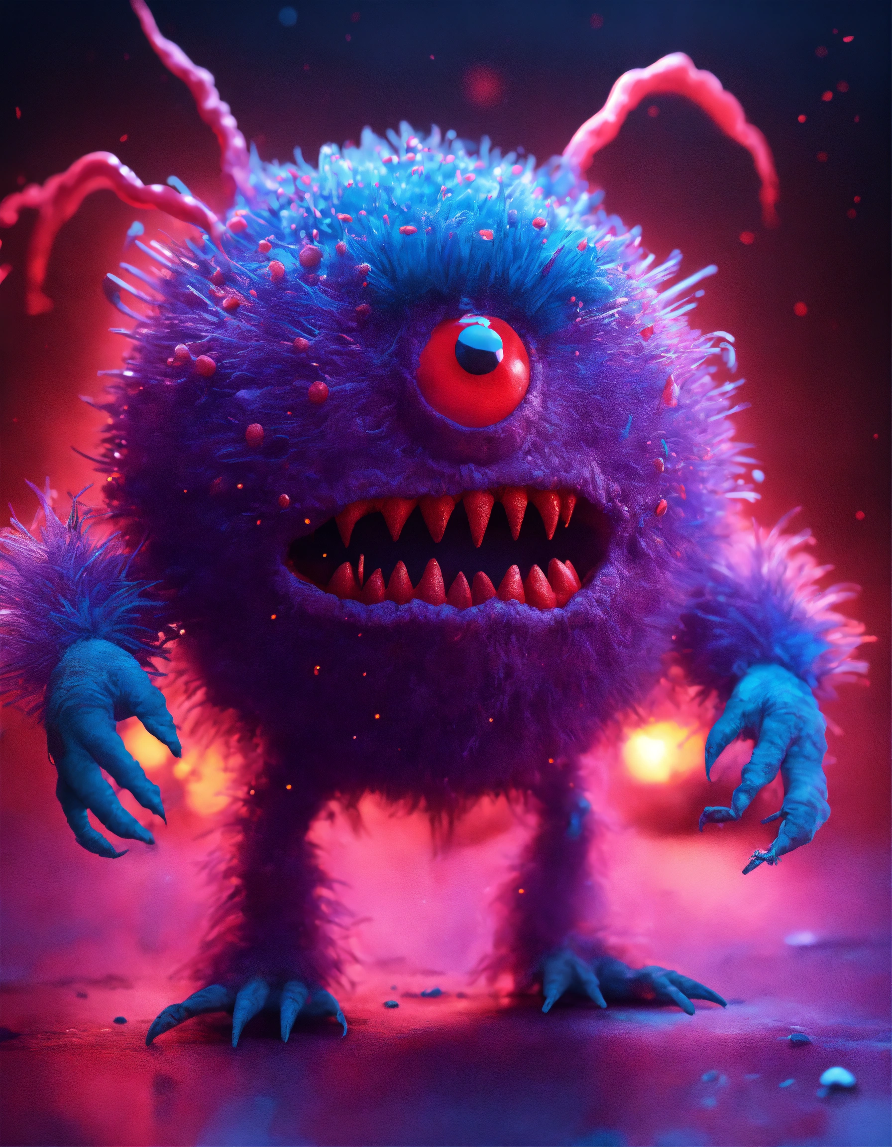 Cgi! scary looking red germ monster character, highly detailed, scary, gremlin, tribbles, abstract shape body, stop motion! purple and blue lighting!