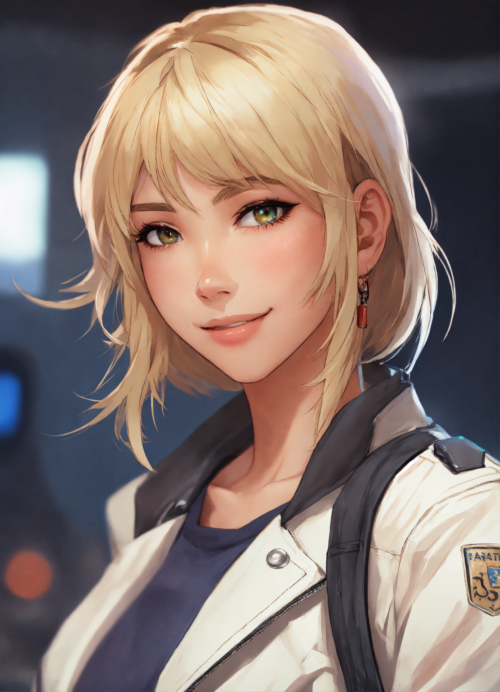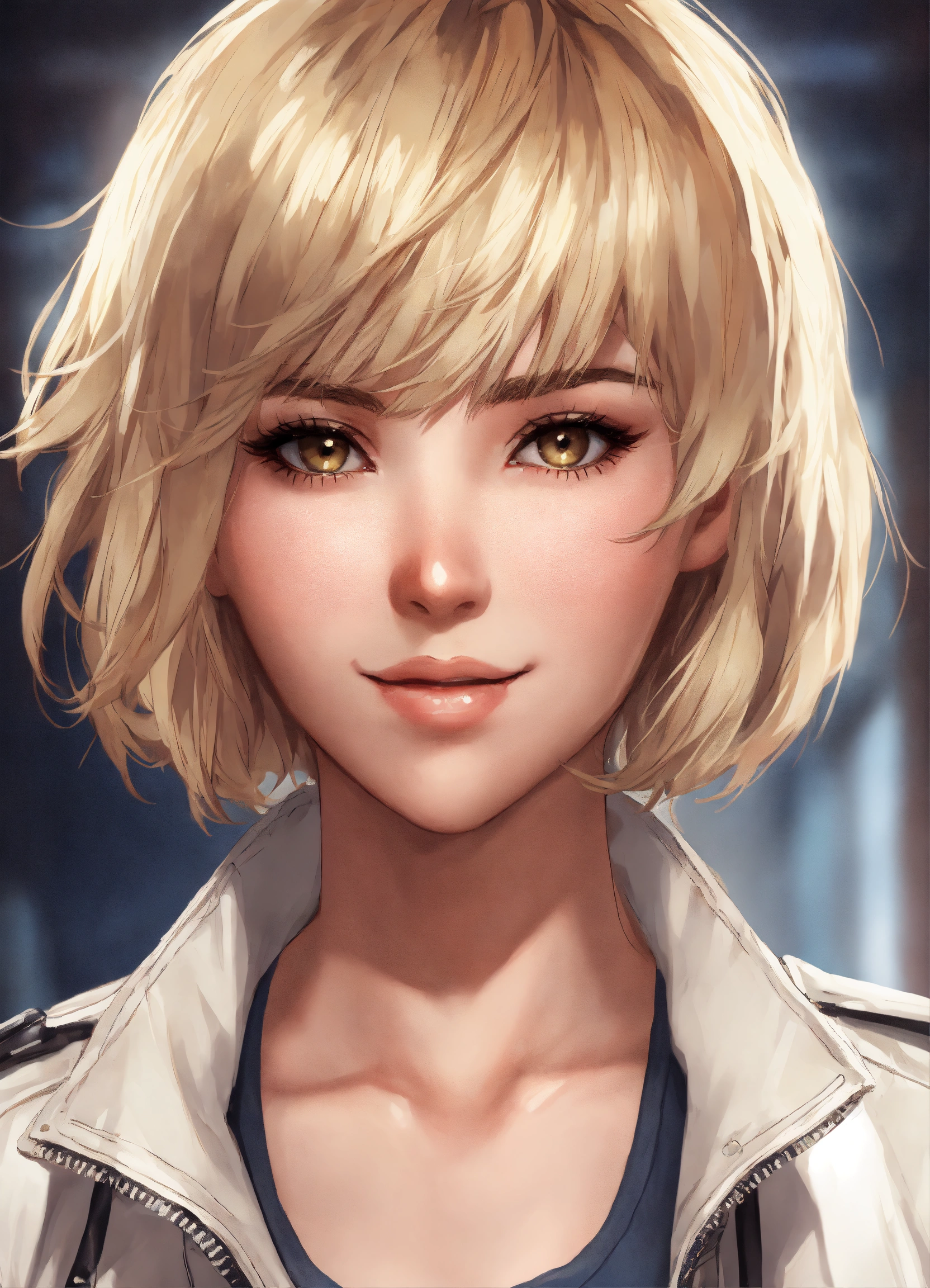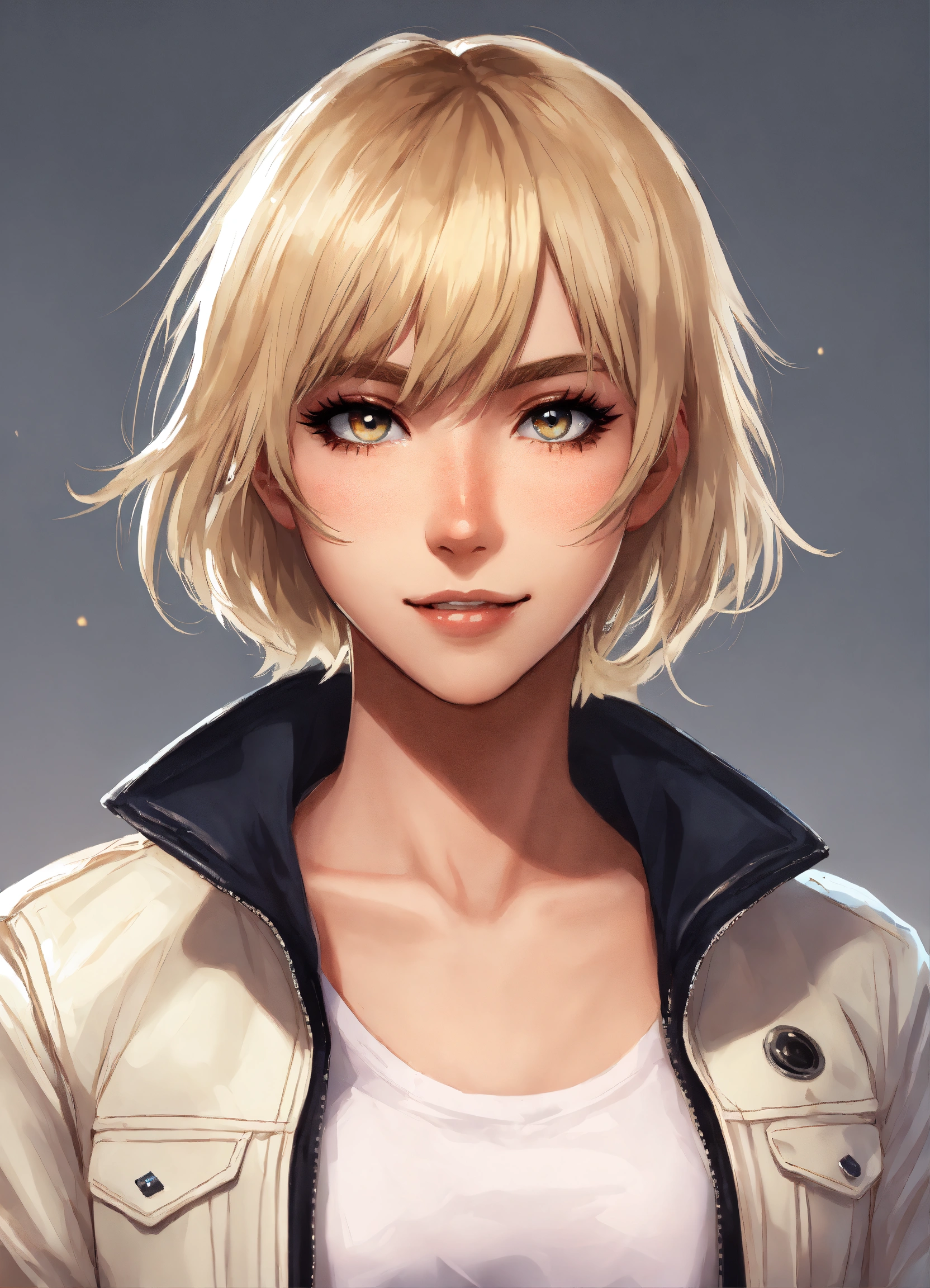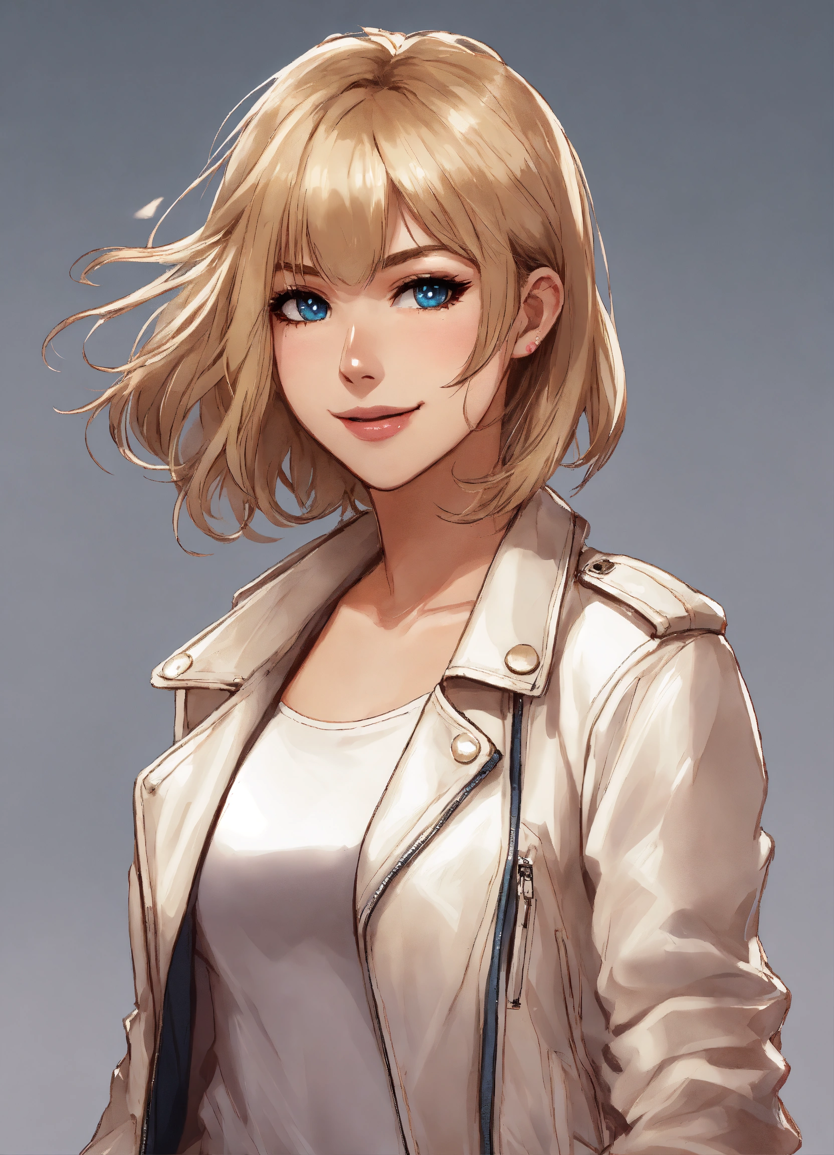 Short height white female, short dirty blonde hair with bangs, beautiful eyes, rosy cheeks, eyeliner, white leather jacket, anime, mugshot, sly smile