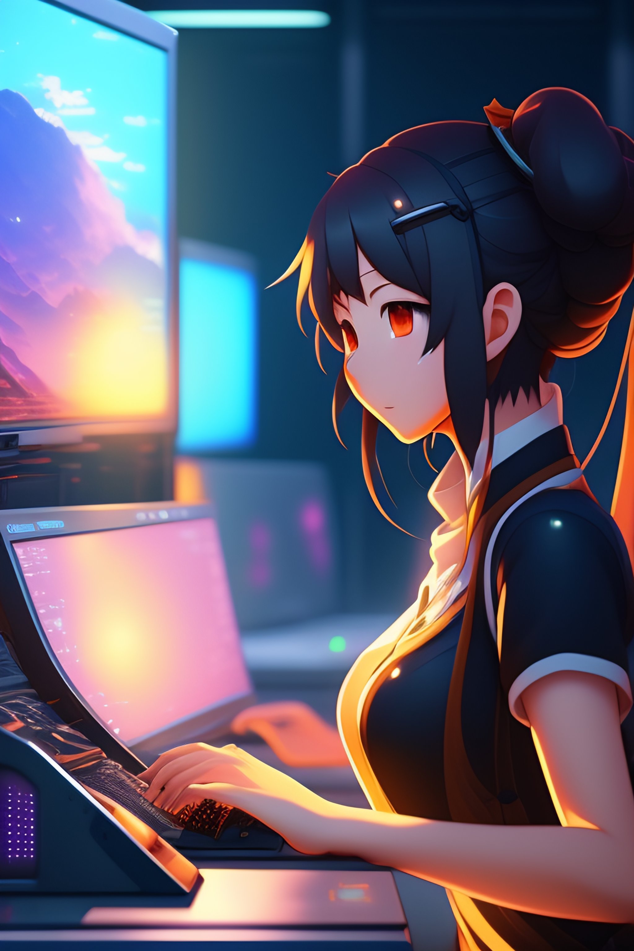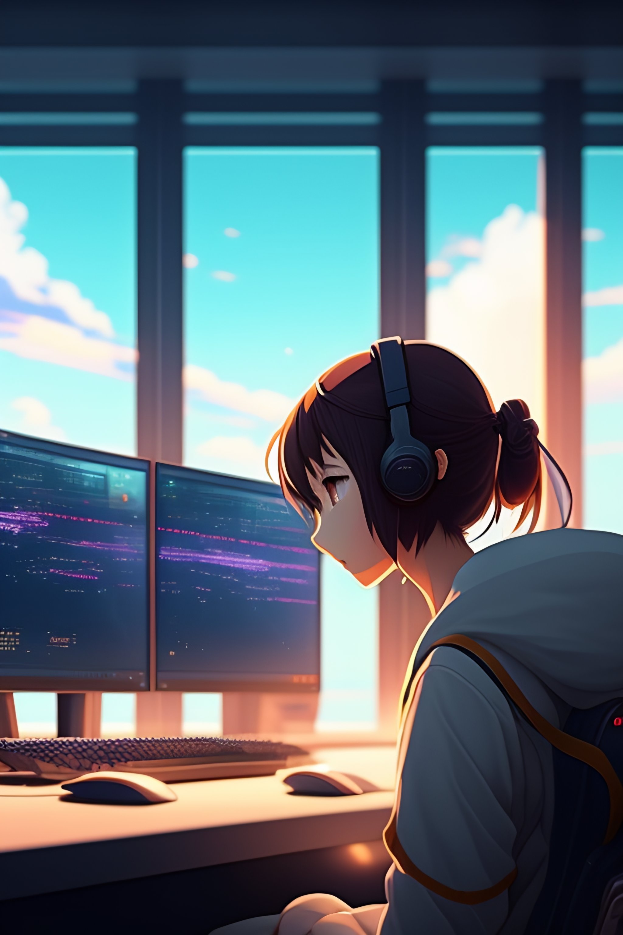 Create a high resolution artwork of anime girl is programming at a computer in a room full of gadgets, web developer, by makoto shinkai and ghibli studio, outlined silhouettes, dramatic lighting, highly detailed, incredible quality, trending on artstation, masterpiece, 8k
