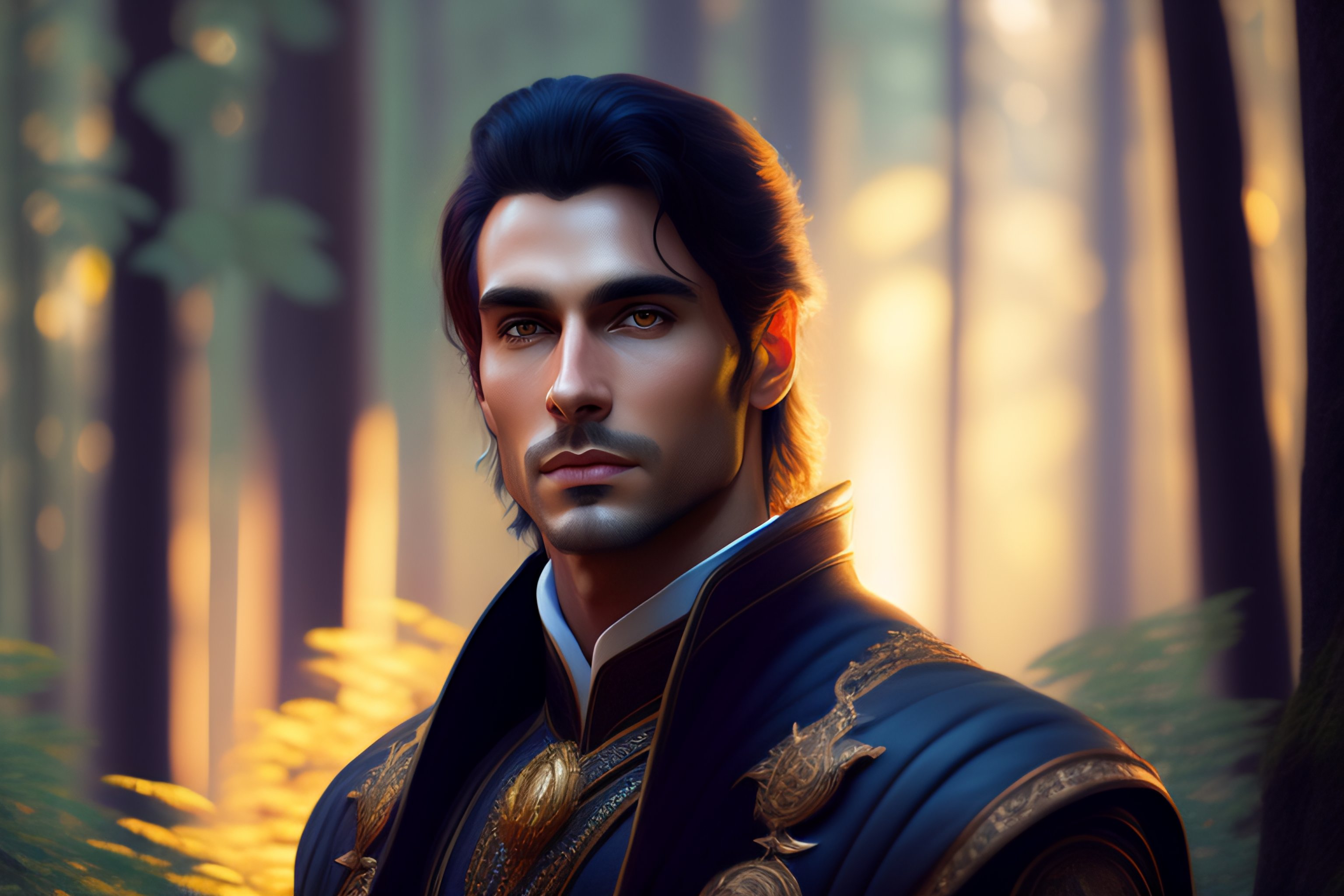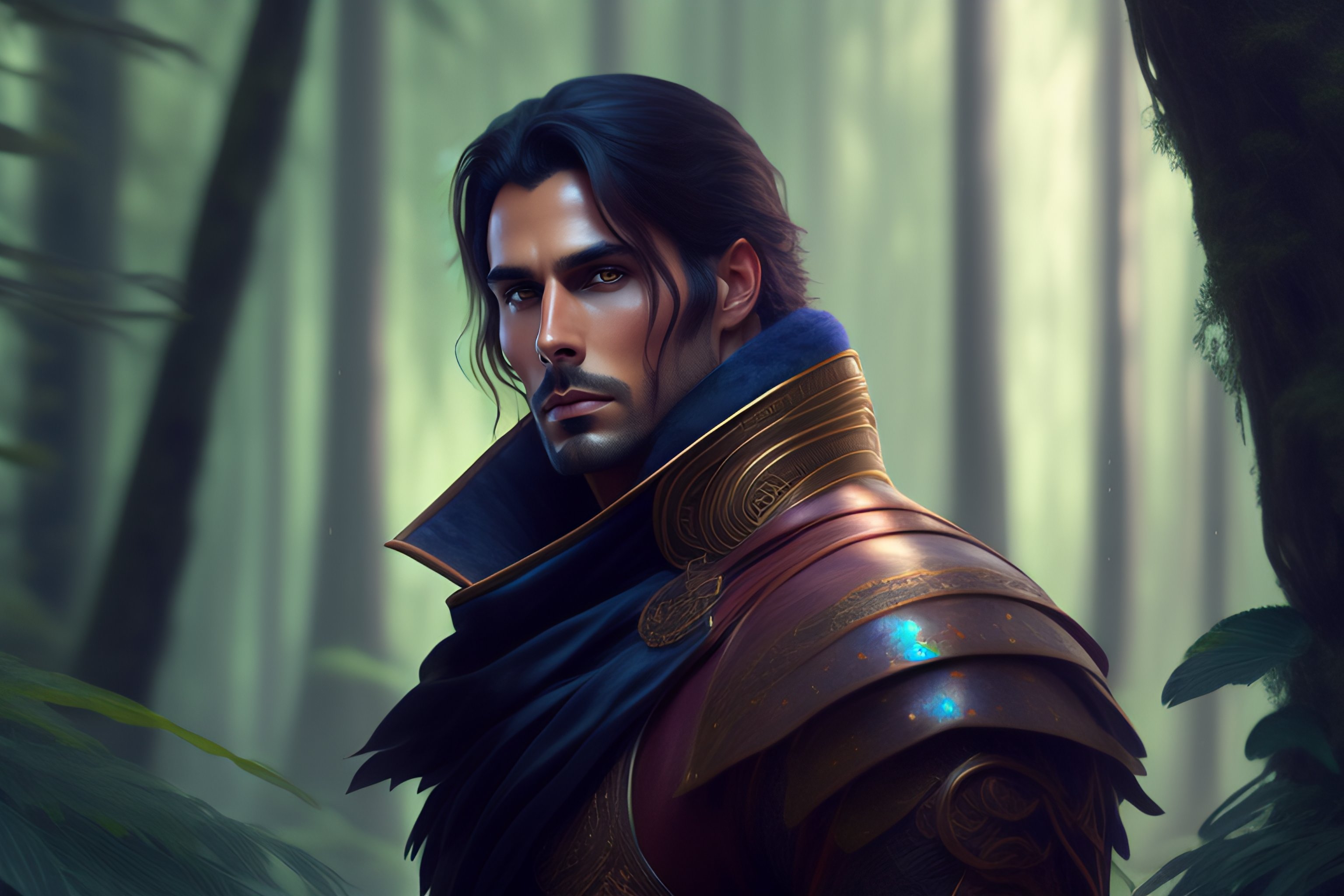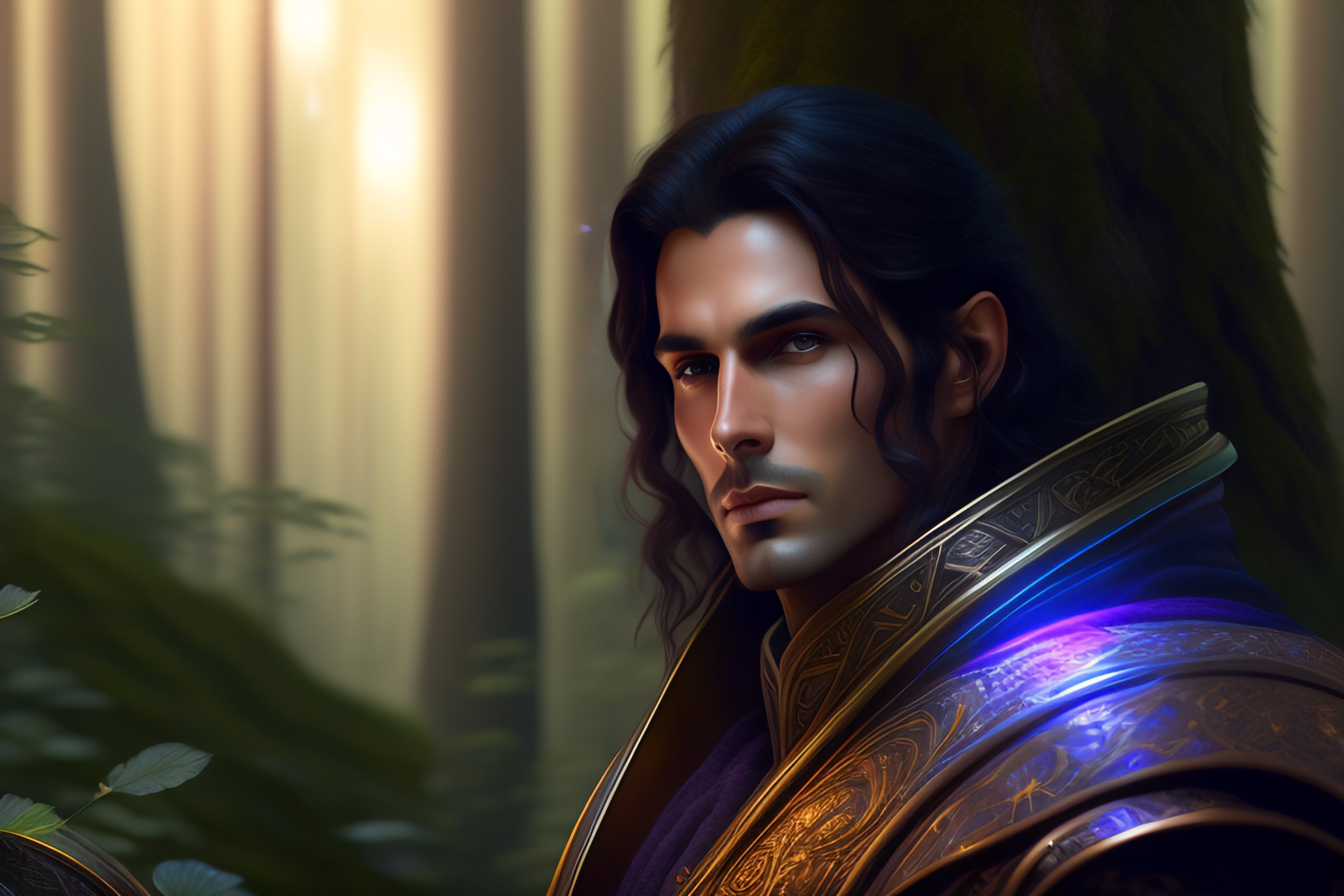 Full length shot of handsome dark haired male standing in alien colorful forest, highly detailed, digital painting, deviantart, artstation, concept art, matte, sharp focus, photo realistic, detailed face, realistic pale skin, greg rutkowski and alphonse mucha