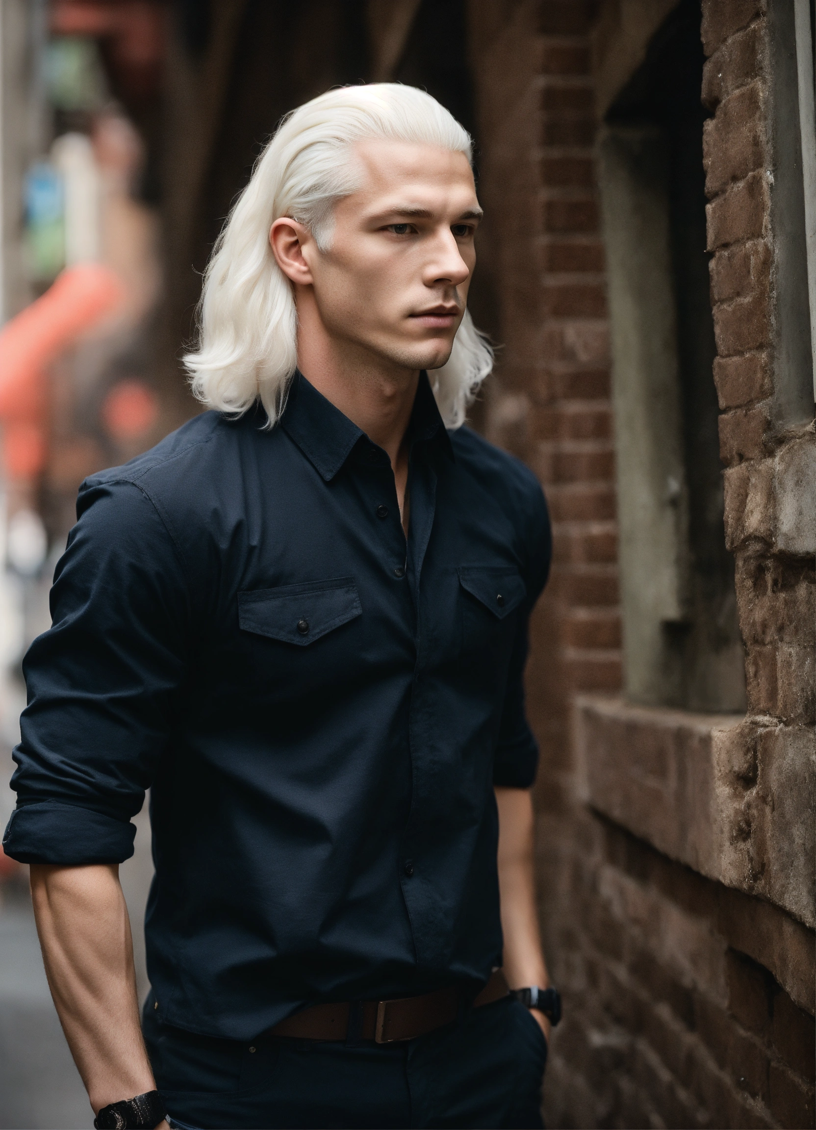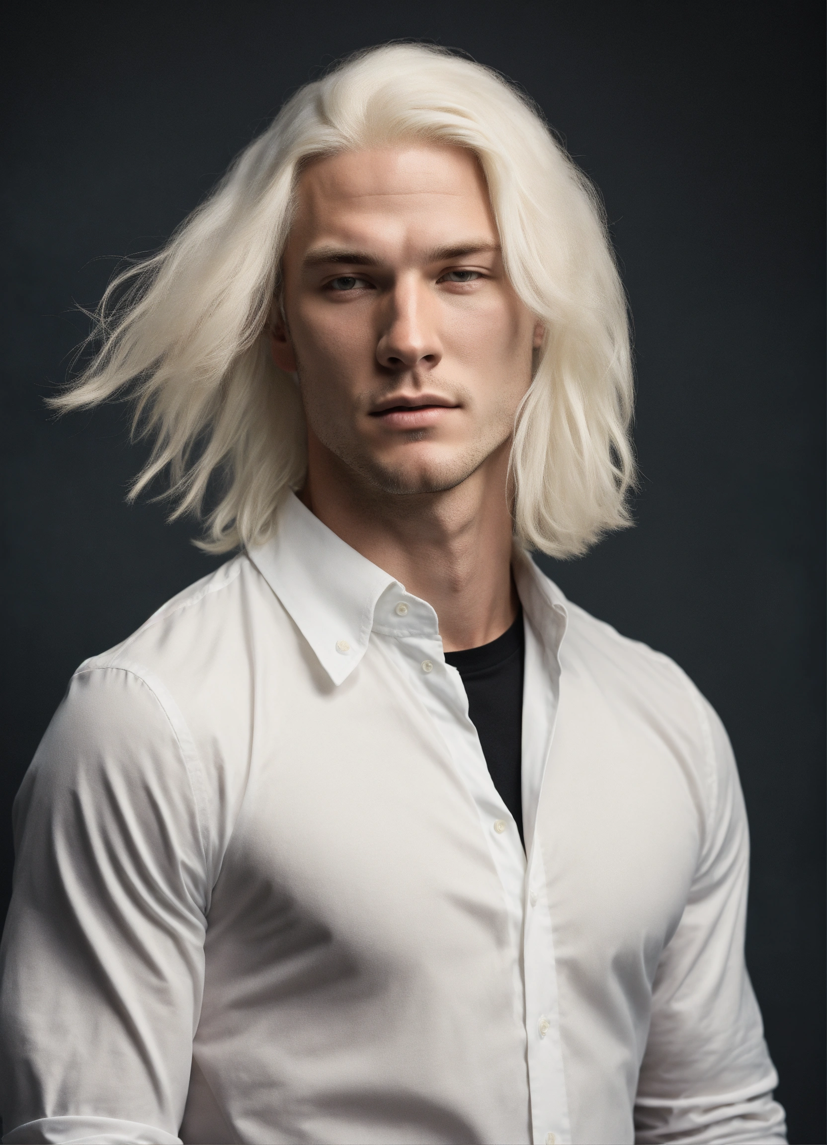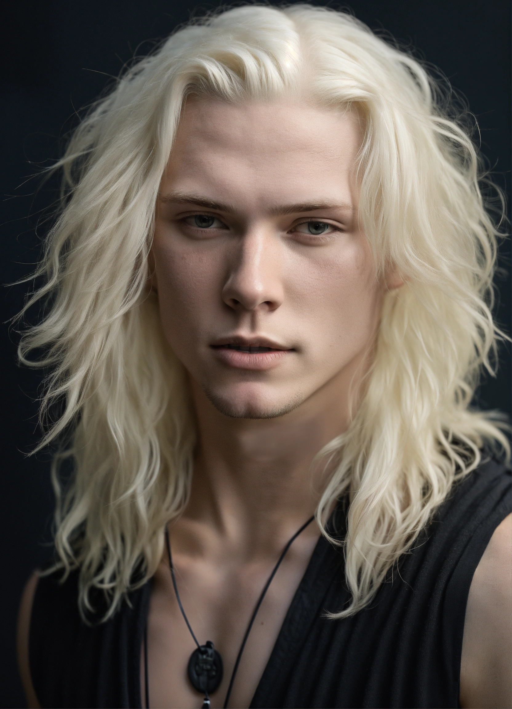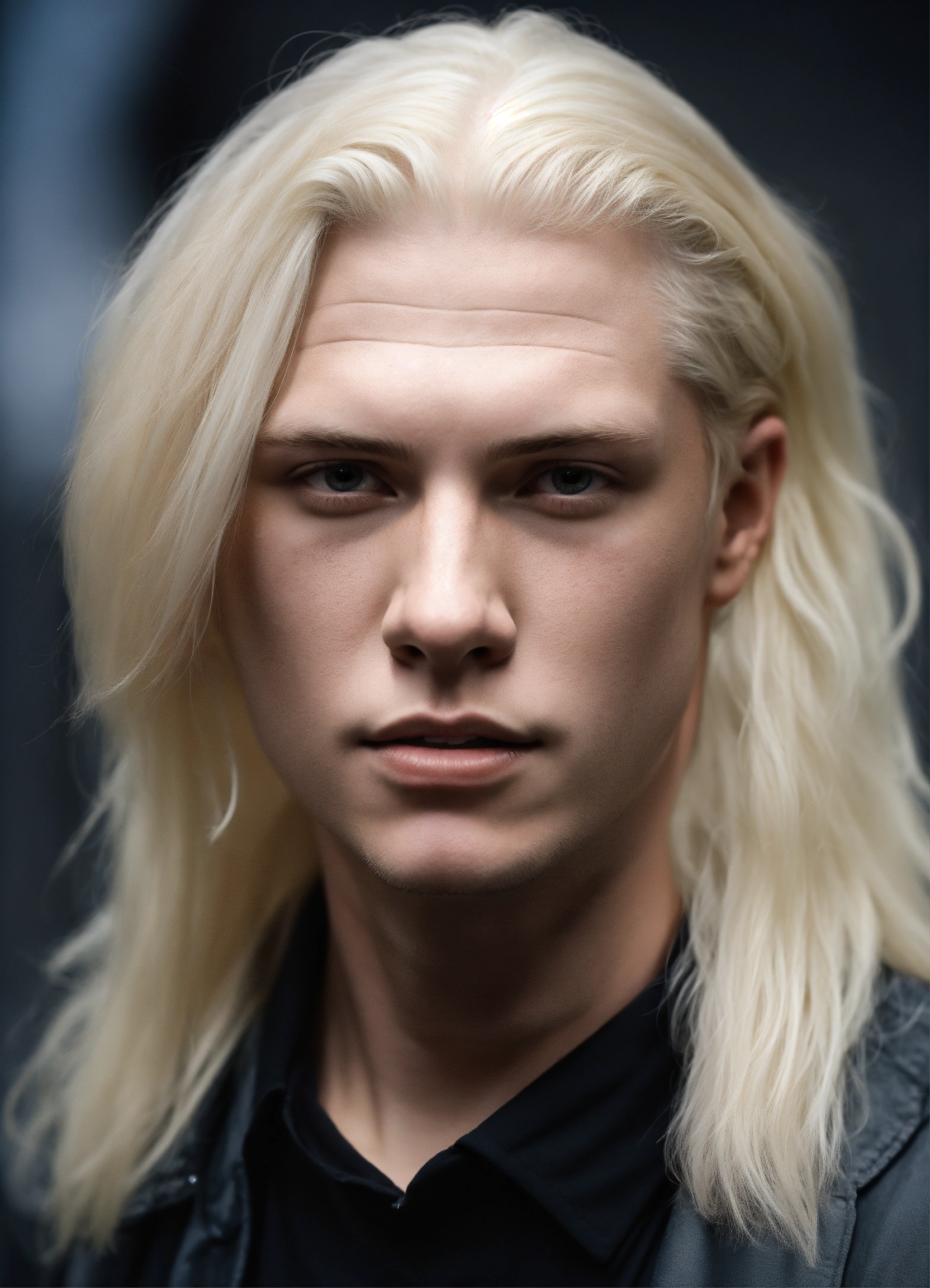 Gorgeous albino mid-adult male with white shoulder-length hair, and an athletic build. dressed in all-black