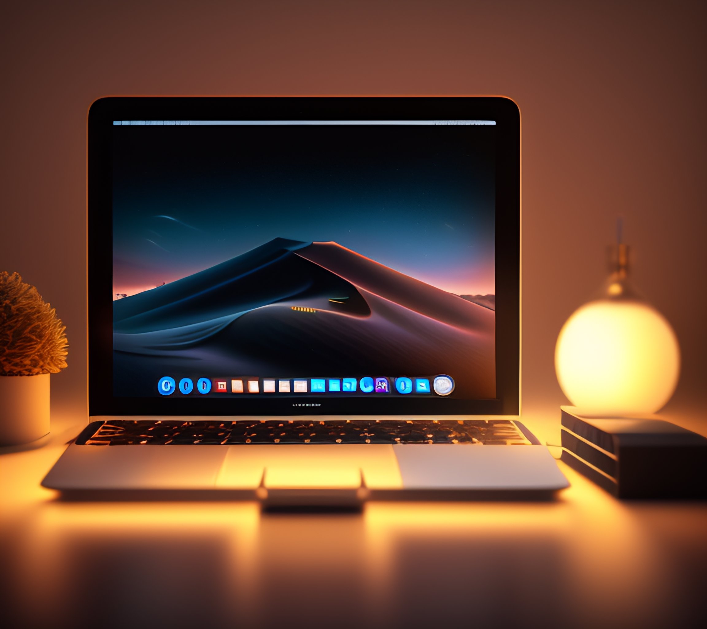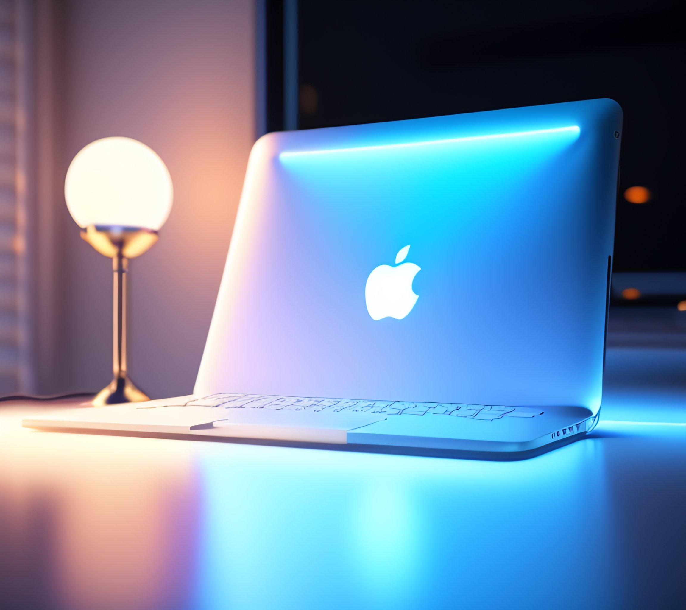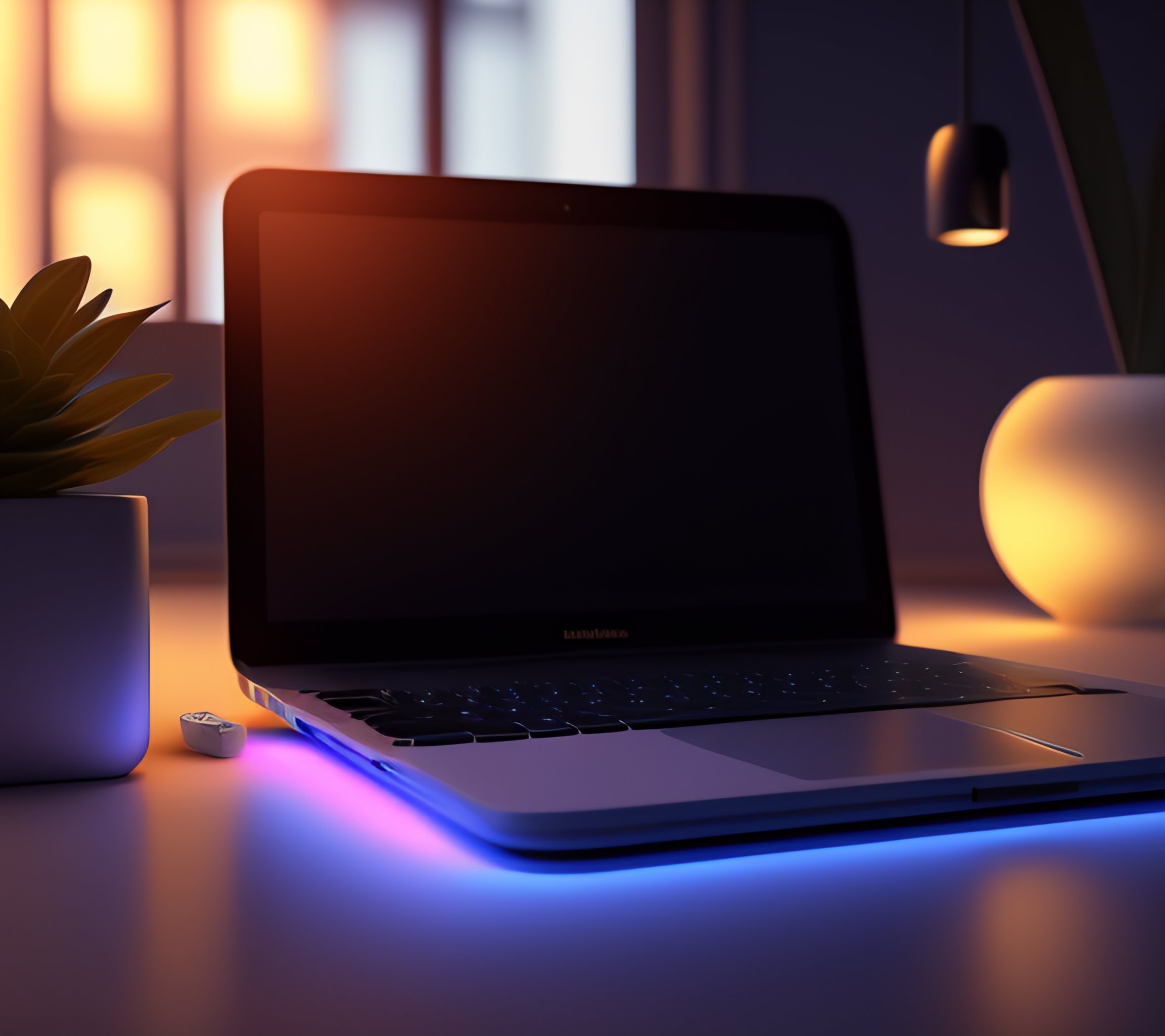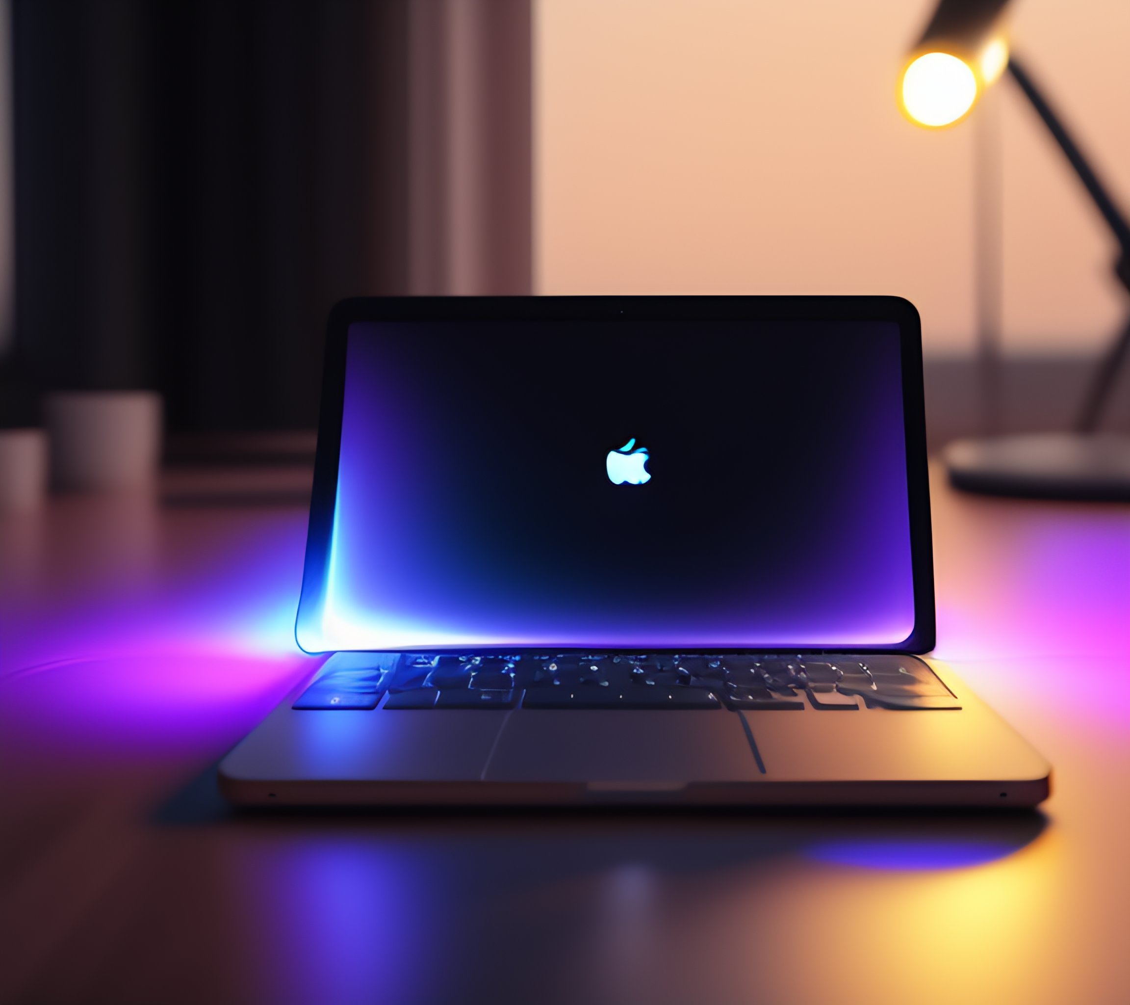 Macbook with lights, ipad with lights, iphone with lights, concept art, octane render, 8k, blender, cinema 4d, raytracing, volumetric lights, path traced, cyberpunk
