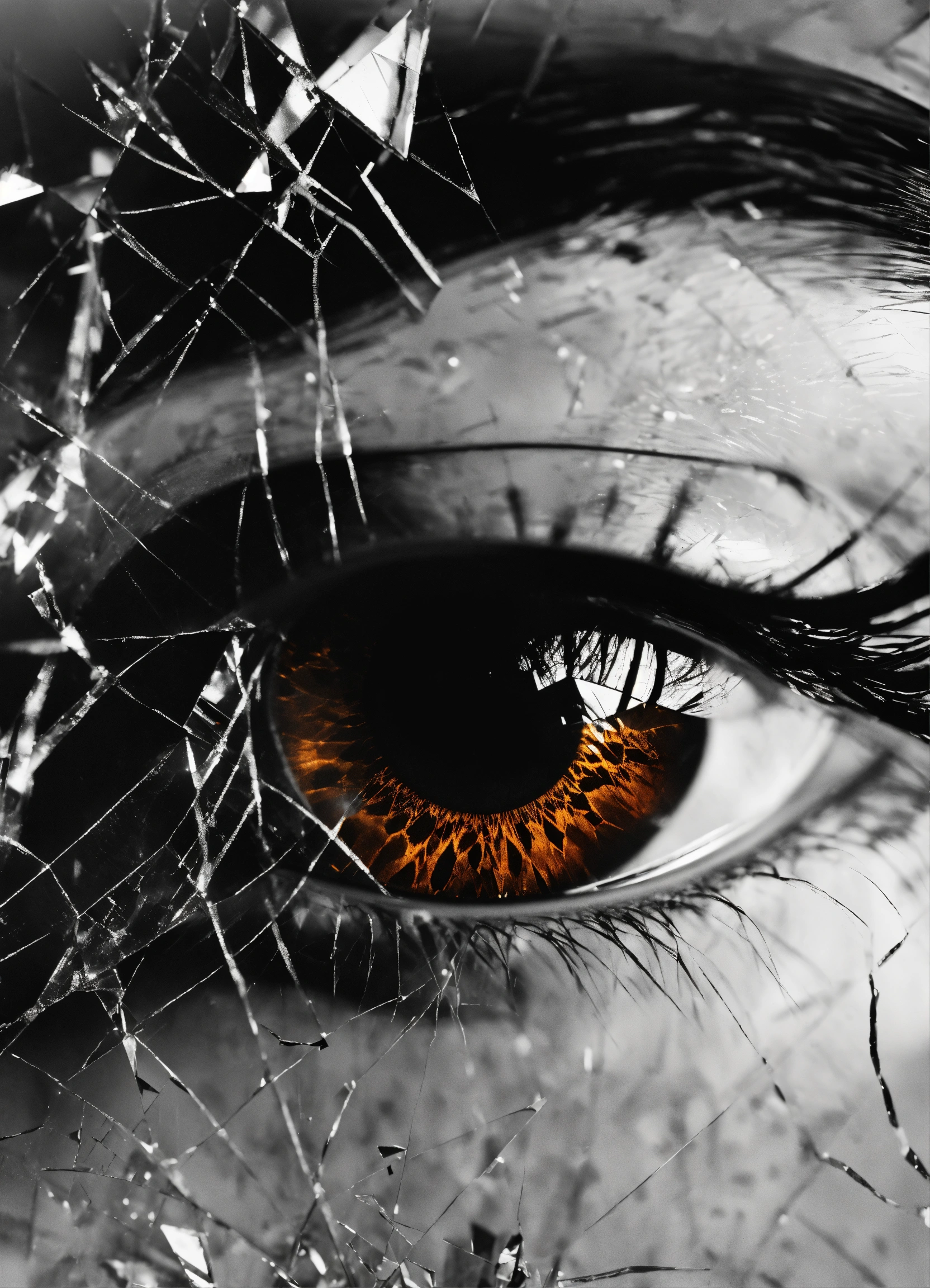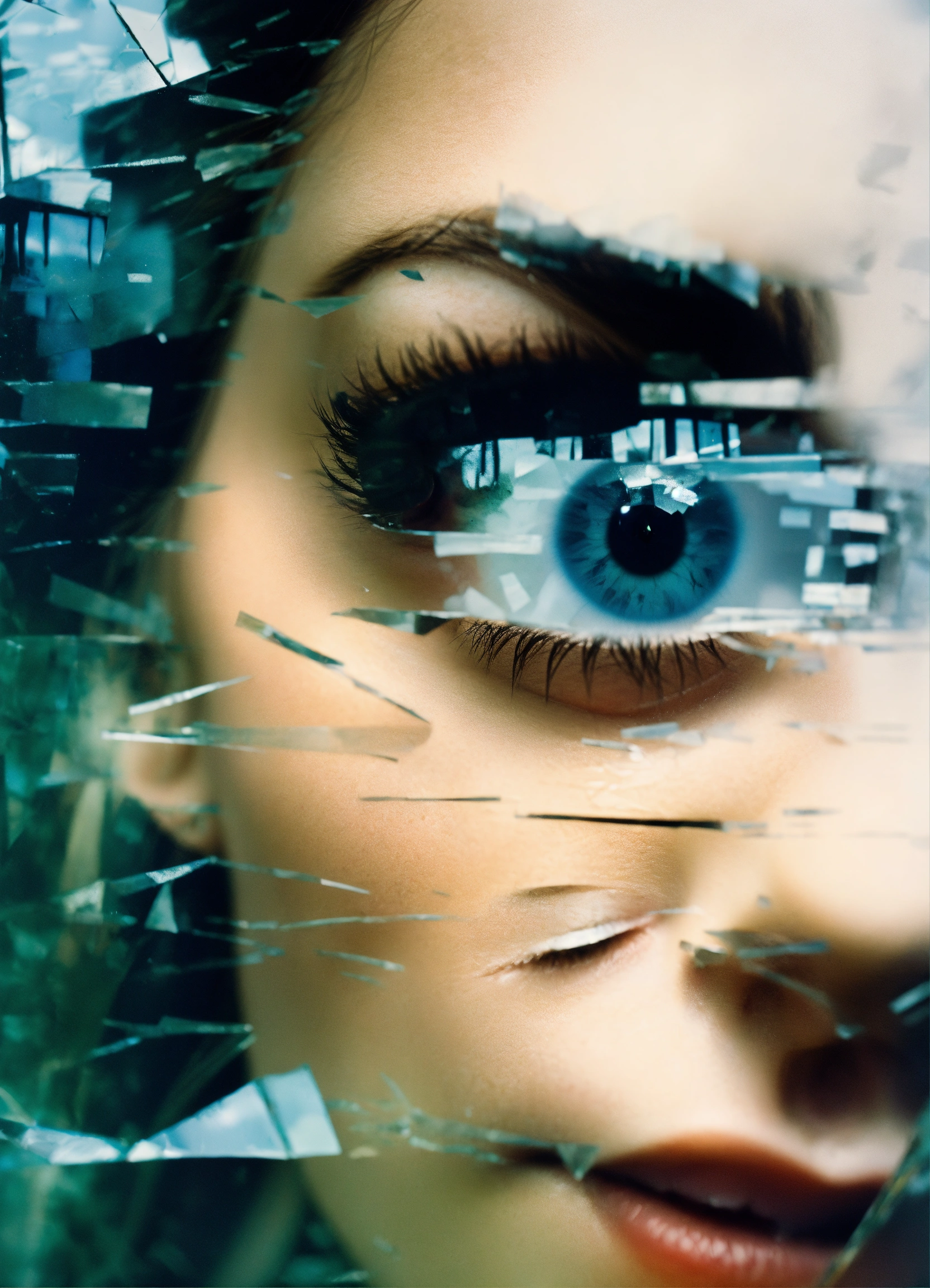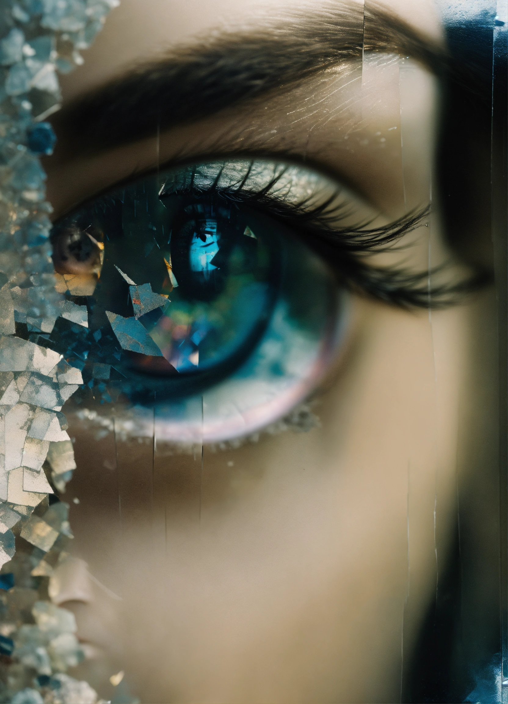 Double exposure photo, featuring eye, shattered mirror effect, broken mirror, sharp mirror edges, ephemeral shadows, motion - infused mystique, in the style of haunting allure, robert frank.
