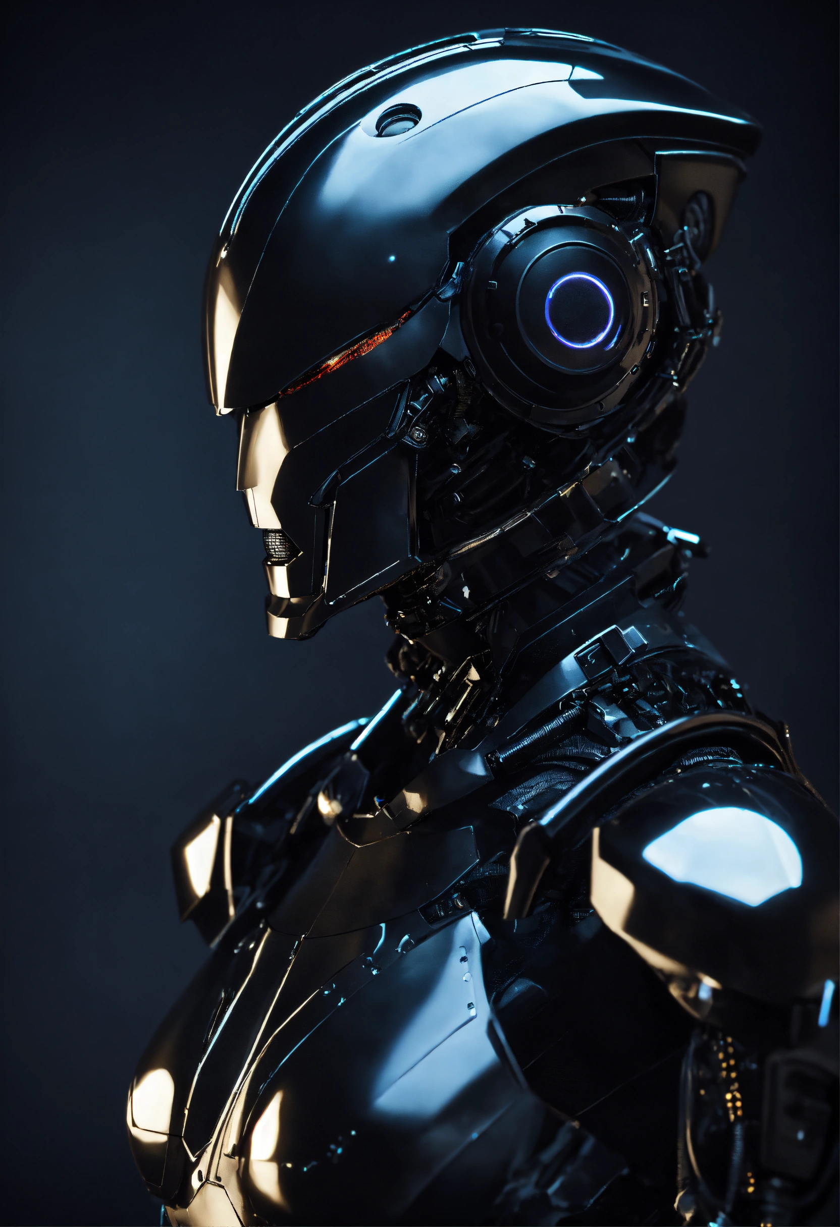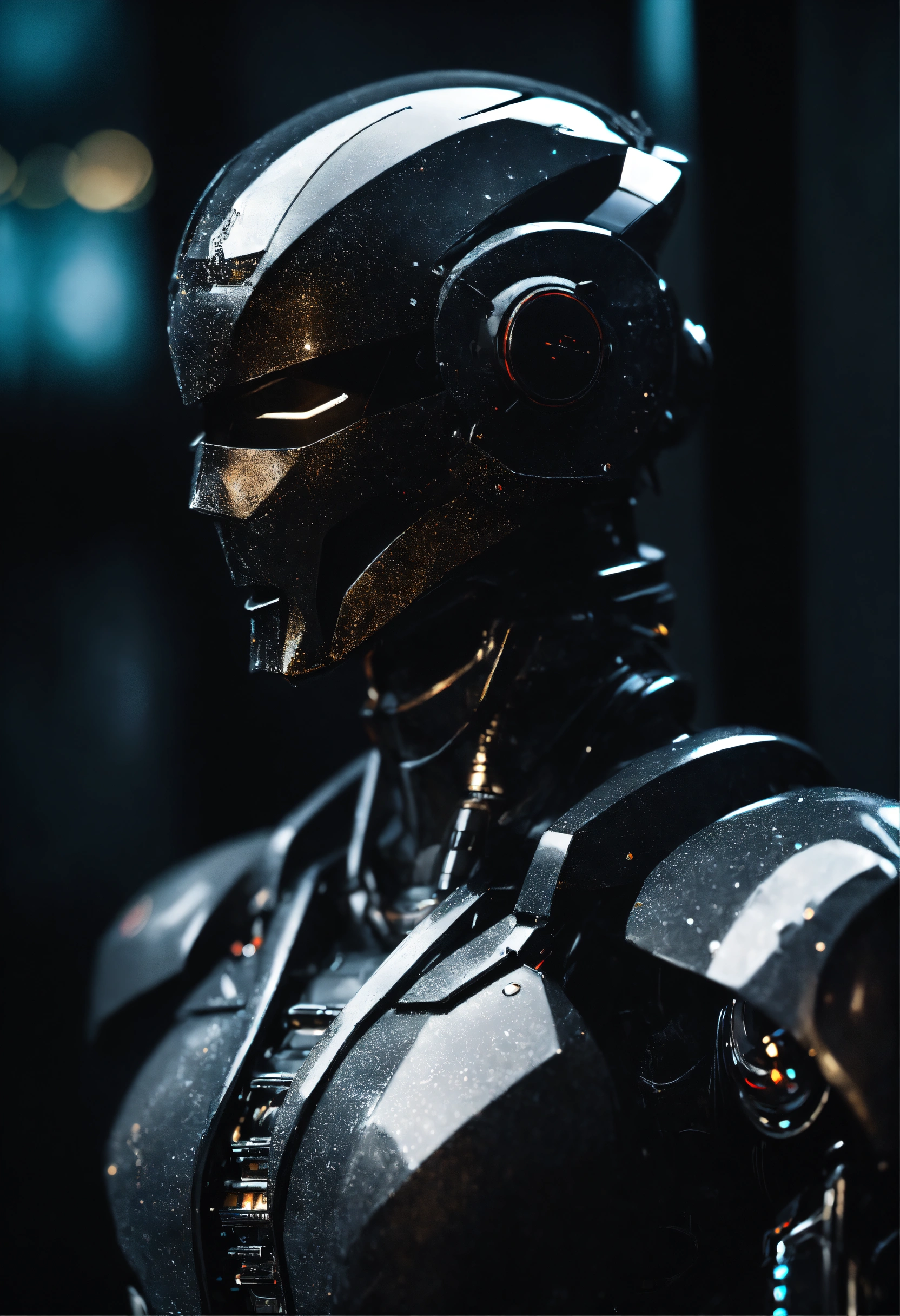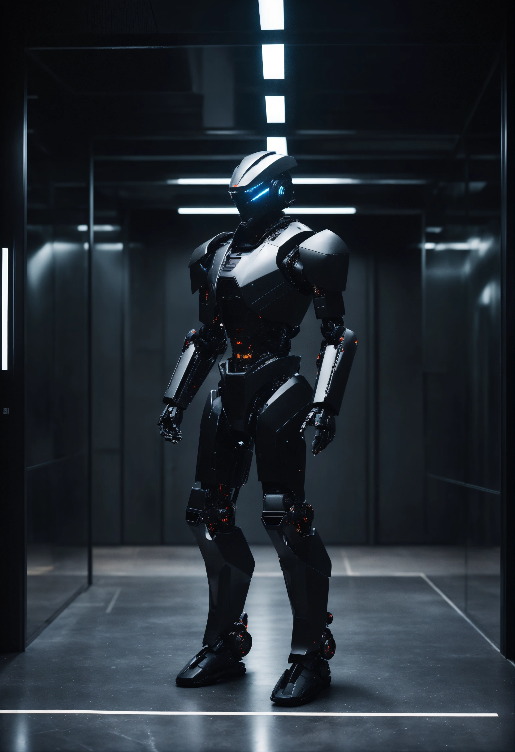 An ultrarealistic photograph of a minimalist futuristic robotic armor, made of black mate metal and polymer, full crystal hull, for a fit man, imposing, modern minimalism, elegant, dystopia, mysterious, godlike, scary, in a dark room, 8k
