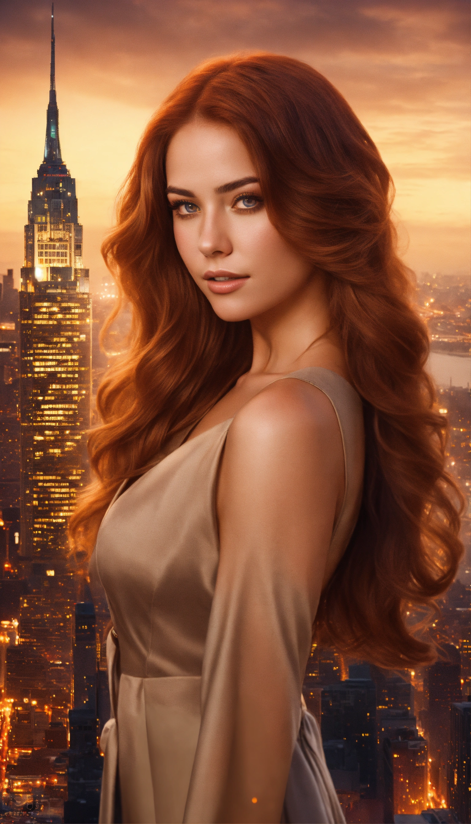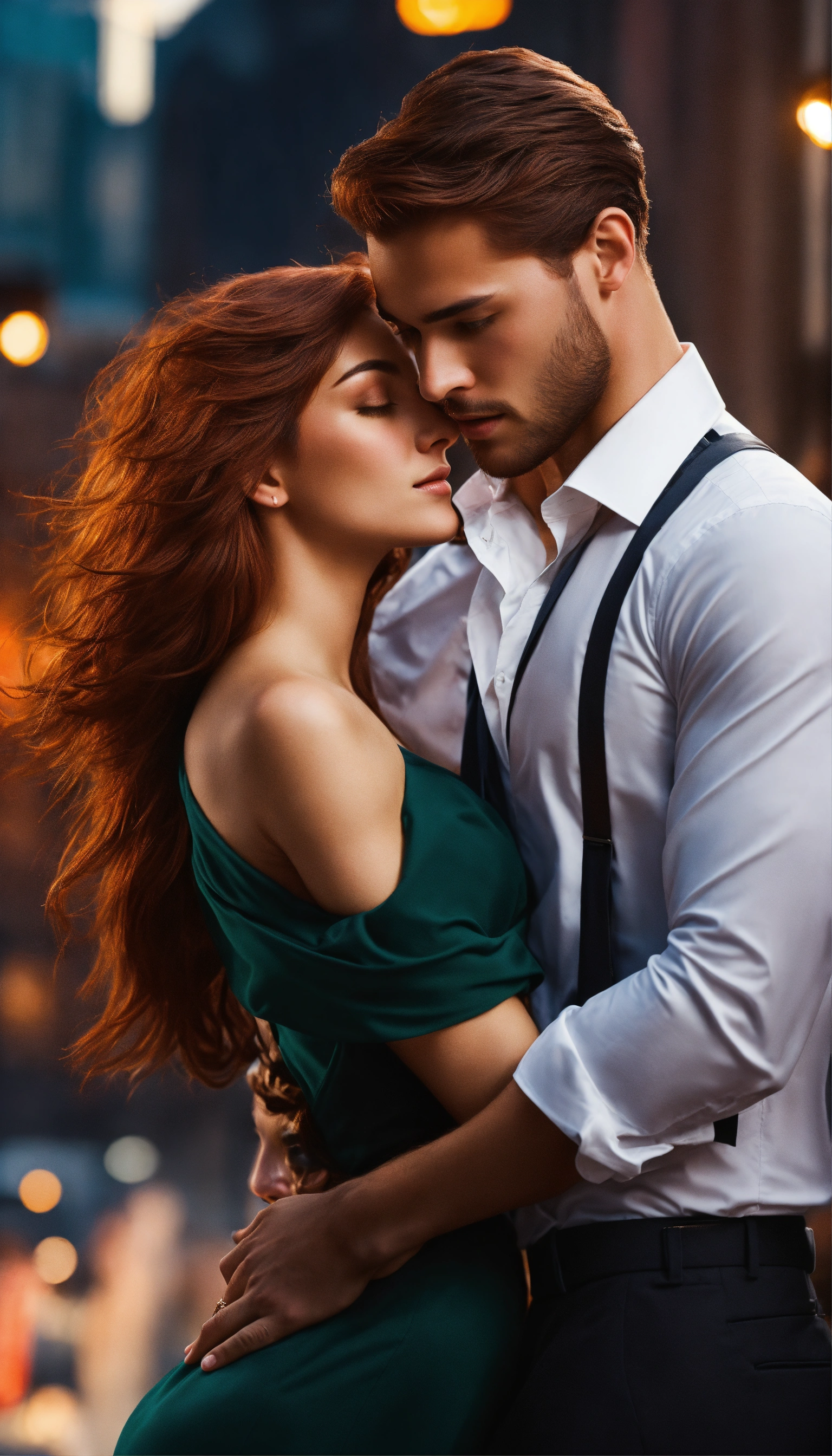 Photograph of a beautiful woman with wavy auburn hair surrounded by three handsome billionaire businessmen brothers, romantic city background, romance cover, romantic embrace, rendered eyes